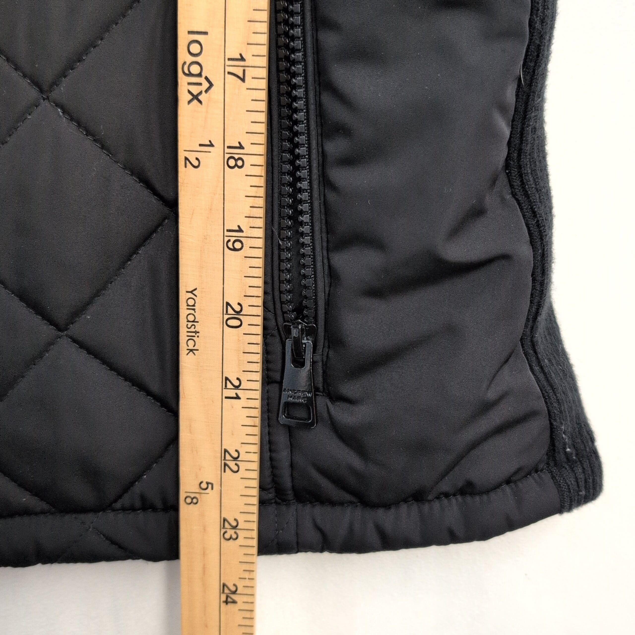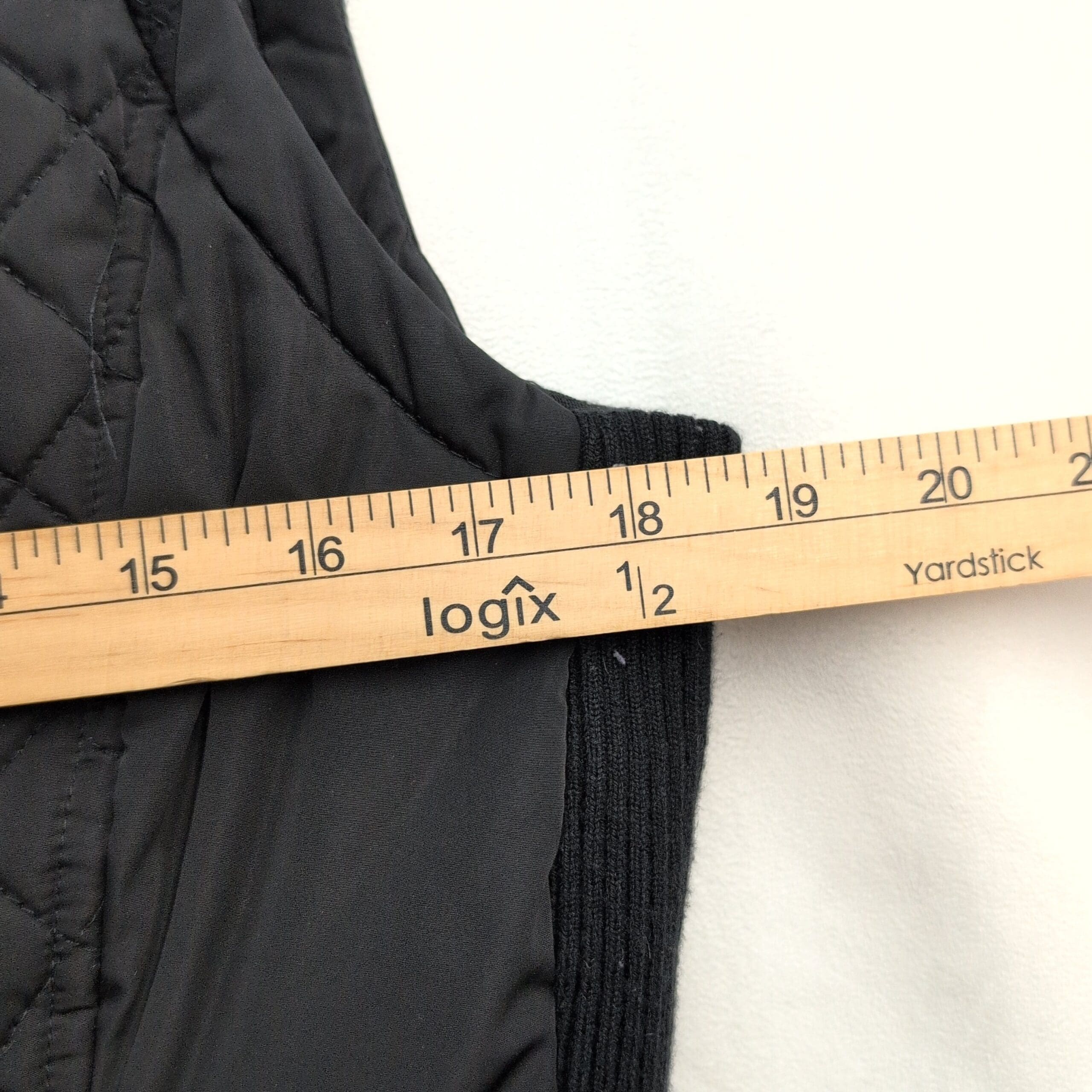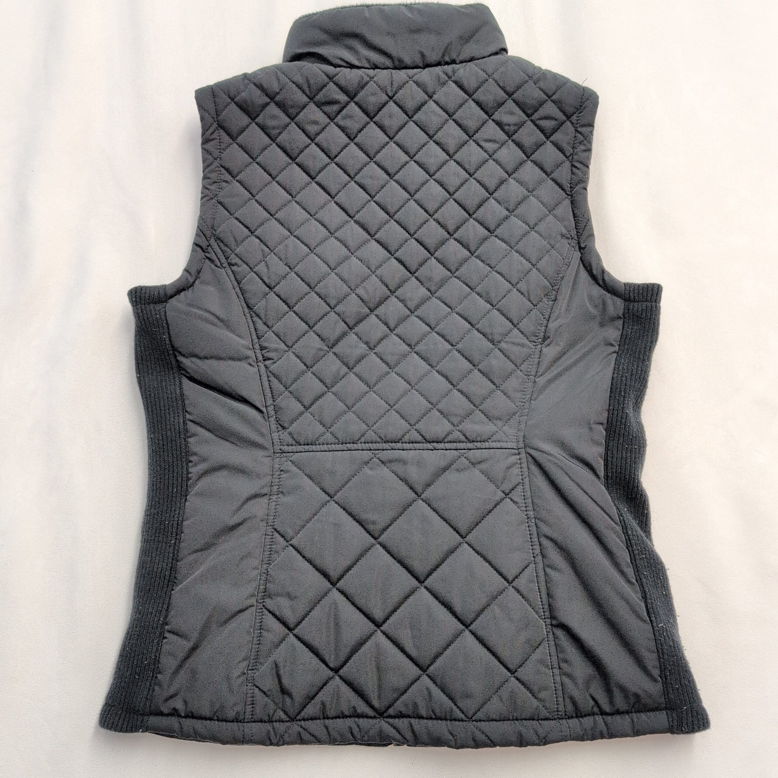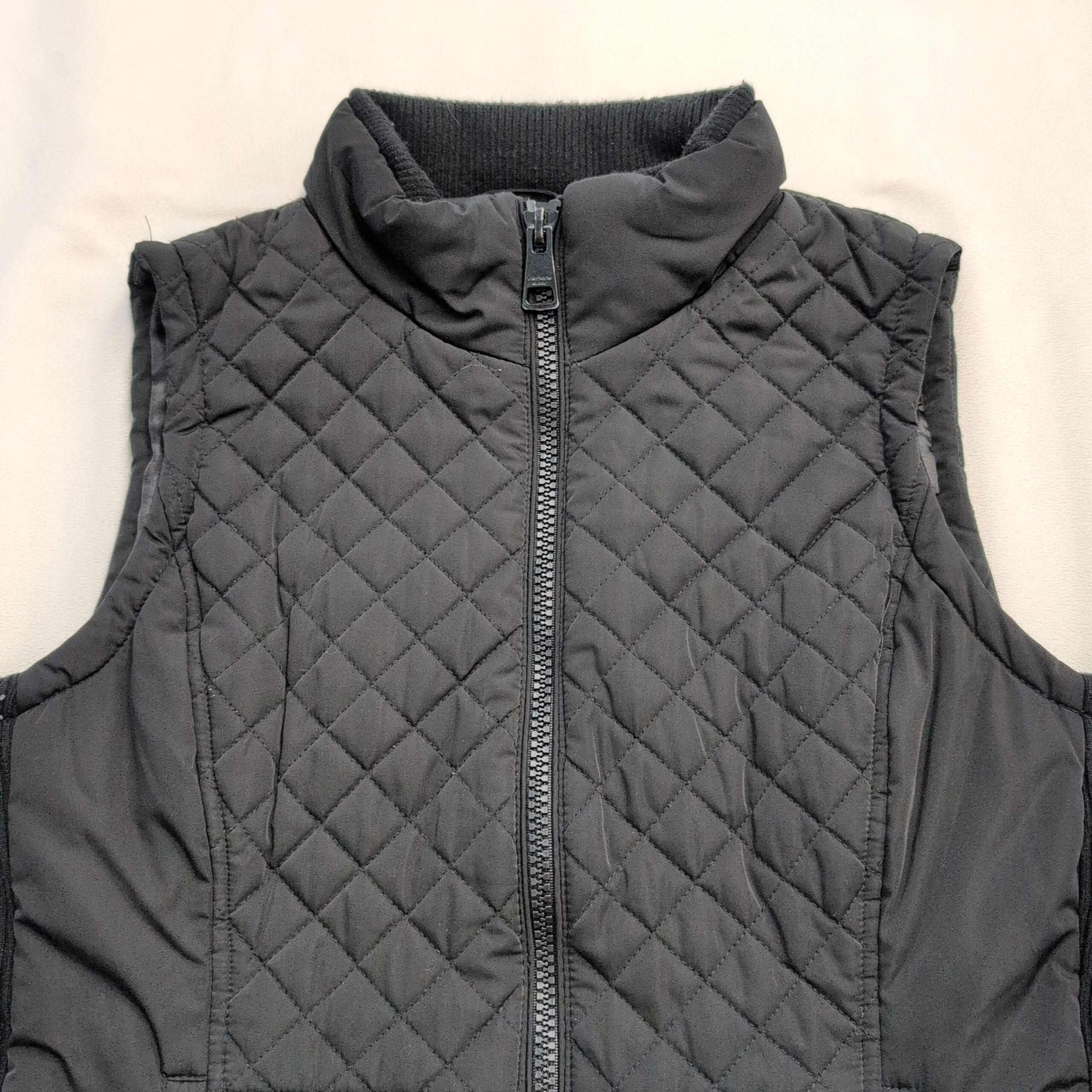 Black quilted Andrew Marc women’s vest in size S. Diamond-quilted front with lightweight insulation, full-length center zip, stand-up collar, knit side panels for a contoured fit, and two zippered front pockets. Versatile layering piece for fall/spring or travel. Excellent used condition — clean and free of major rips, tears, or stains; typical light wear consistent with previous use. Fabric content not listed; please review photos for details.