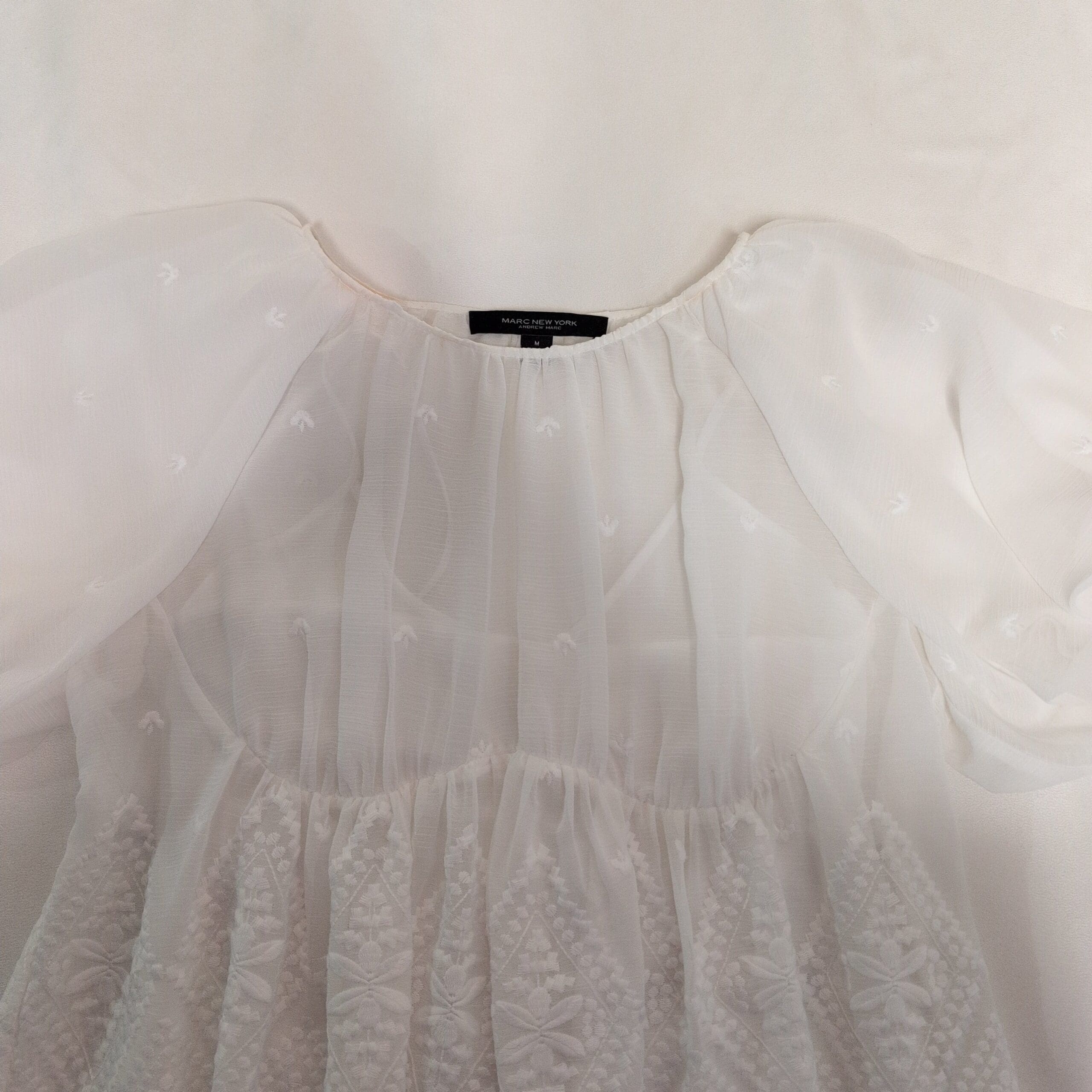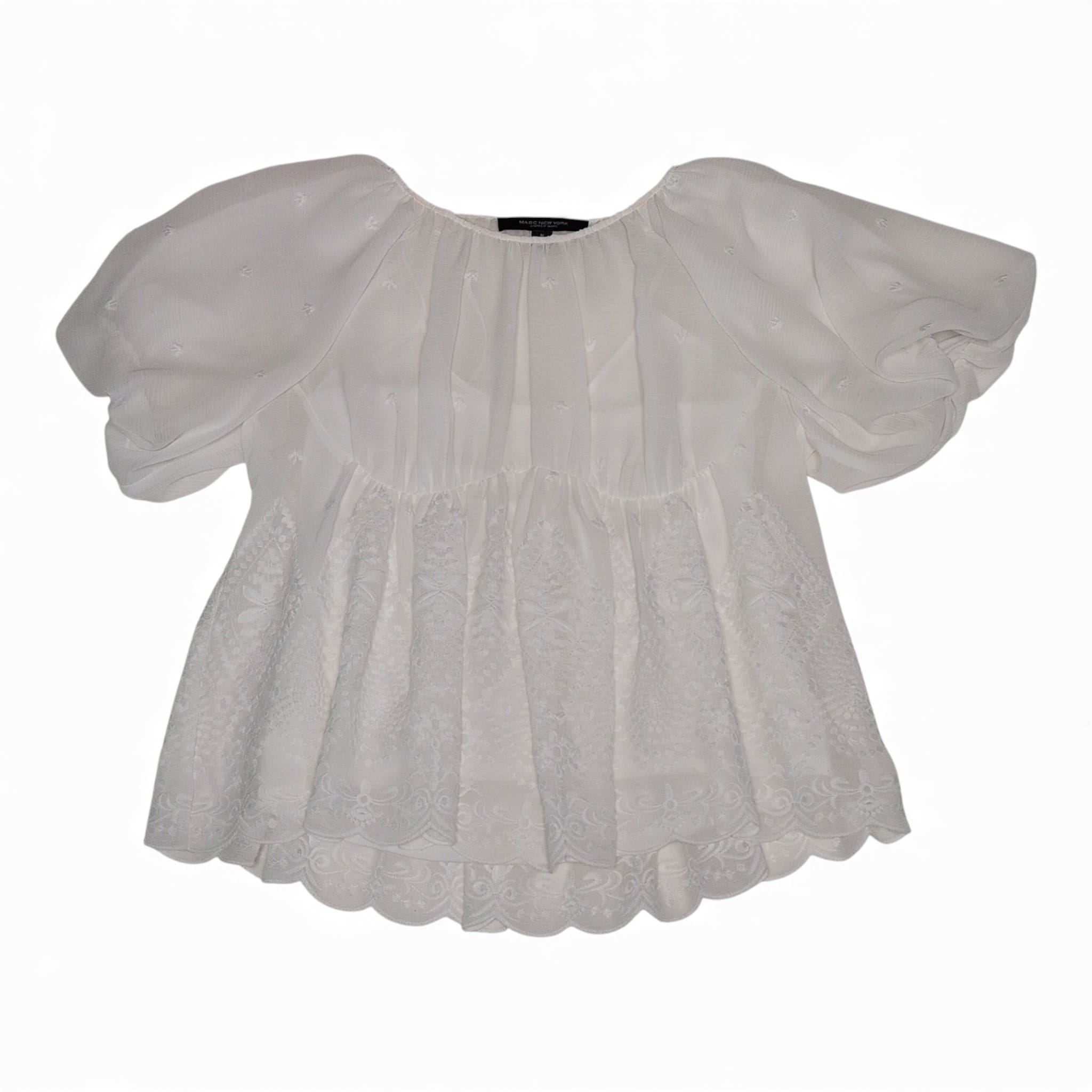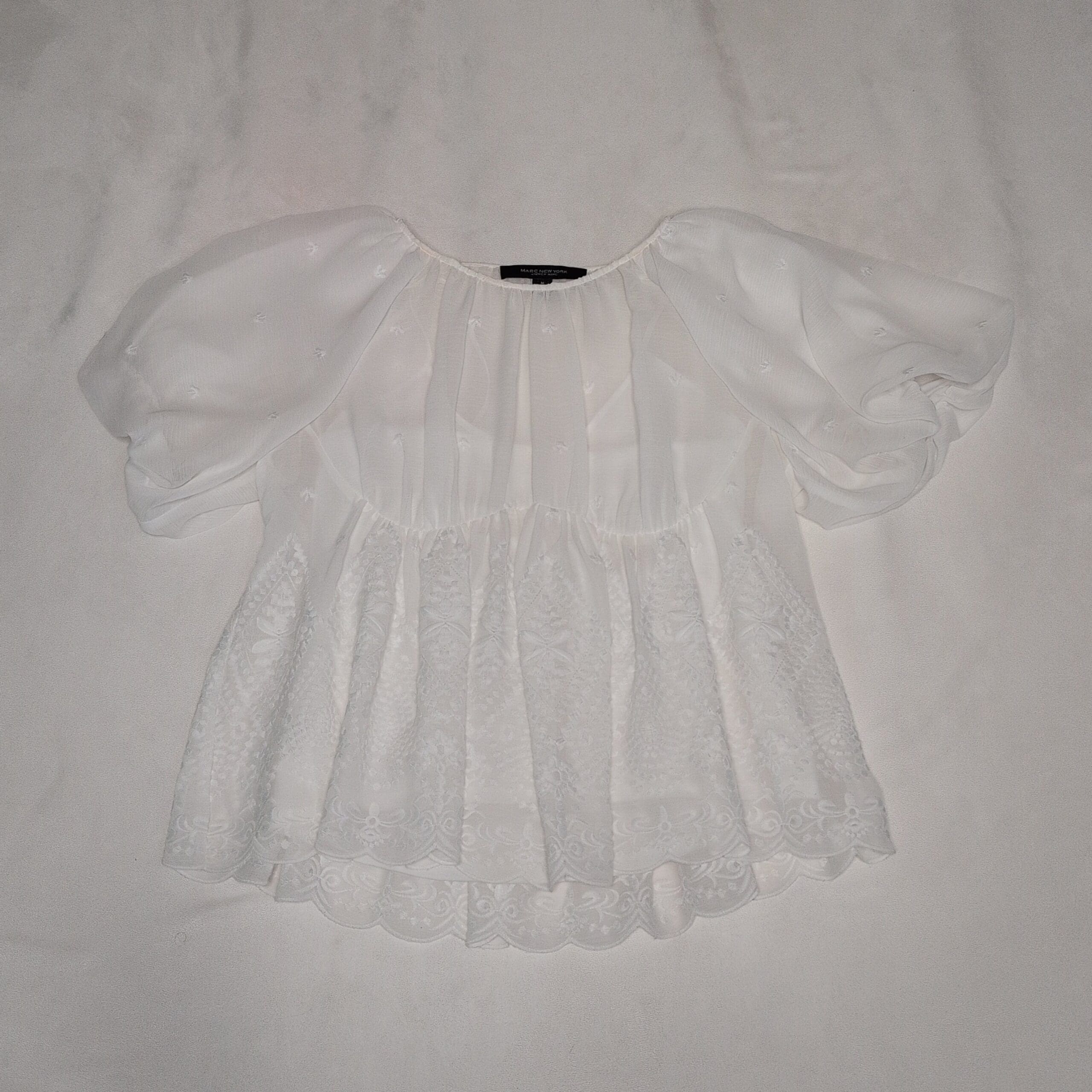 Andrew Marc women’s white embroidered blouse, size M. Romantic, lightweight silhouette with puff sleeves, gathered round neckline, and a scalloped peplum hem featuring delicate embroidered motifs. Semi-sheer textured fabric on the sleeves and upper bodice for a soft, airy look. Versatile piece that dresses up with tailored pants or pairs beautifully with jeans for an elevated casual outfit. True to size M.