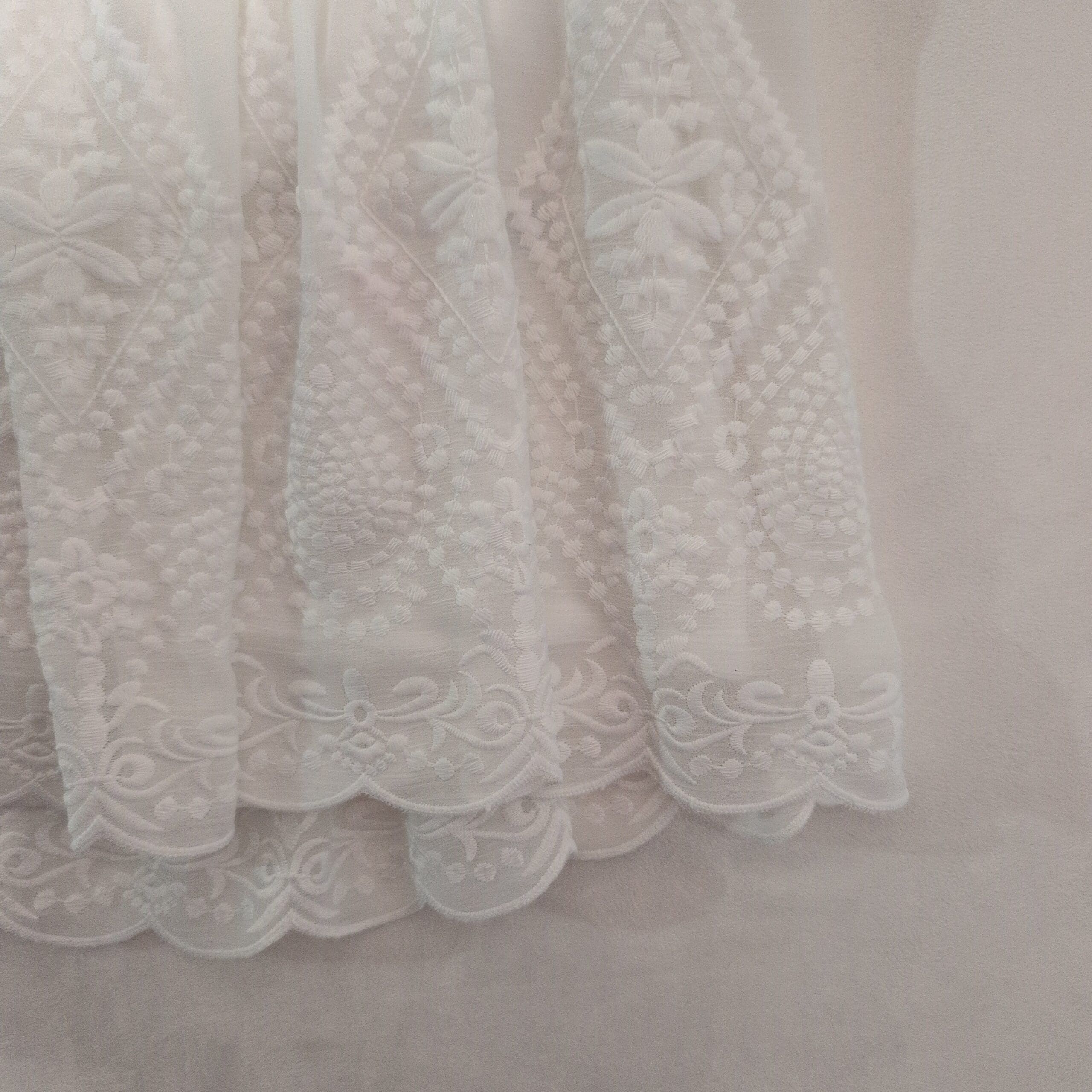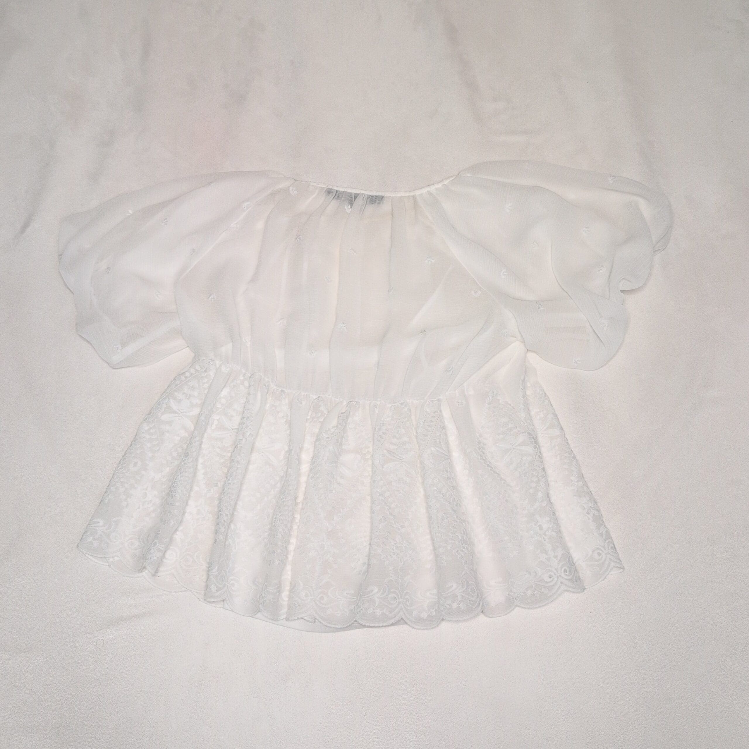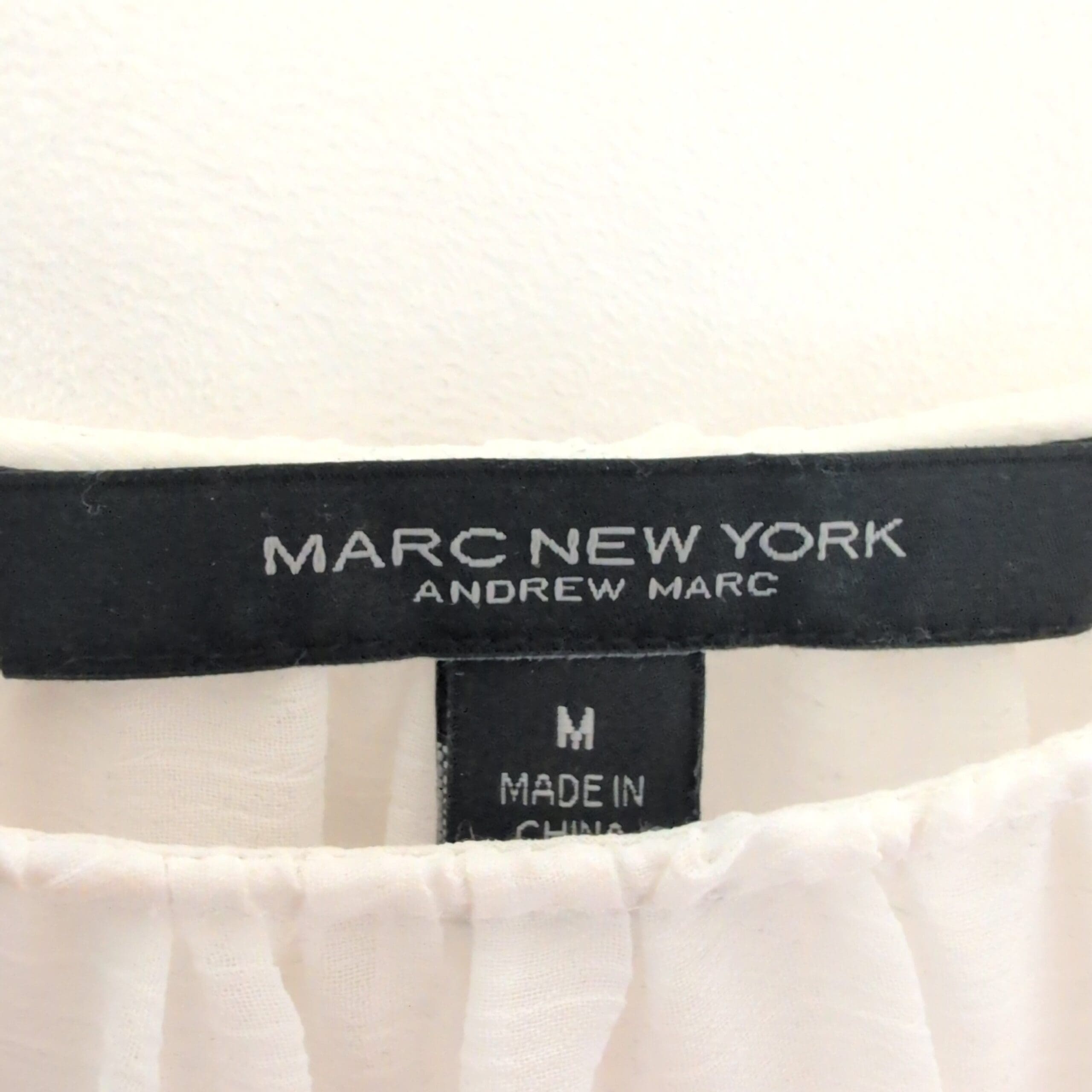 Andrew Marc women’s white embroidered blouse, size M. Romantic, lightweight silhouette with puff sleeves, gathered round neckline, and a scalloped peplum hem featuring delicate embroidered motifs. Semi-sheer textured fabric on the sleeves and upper bodice for a soft, airy look. Versatile piece that dresses up with tailored pants or pairs beautifully with jeans for an elevated casual outfit. True to size M.