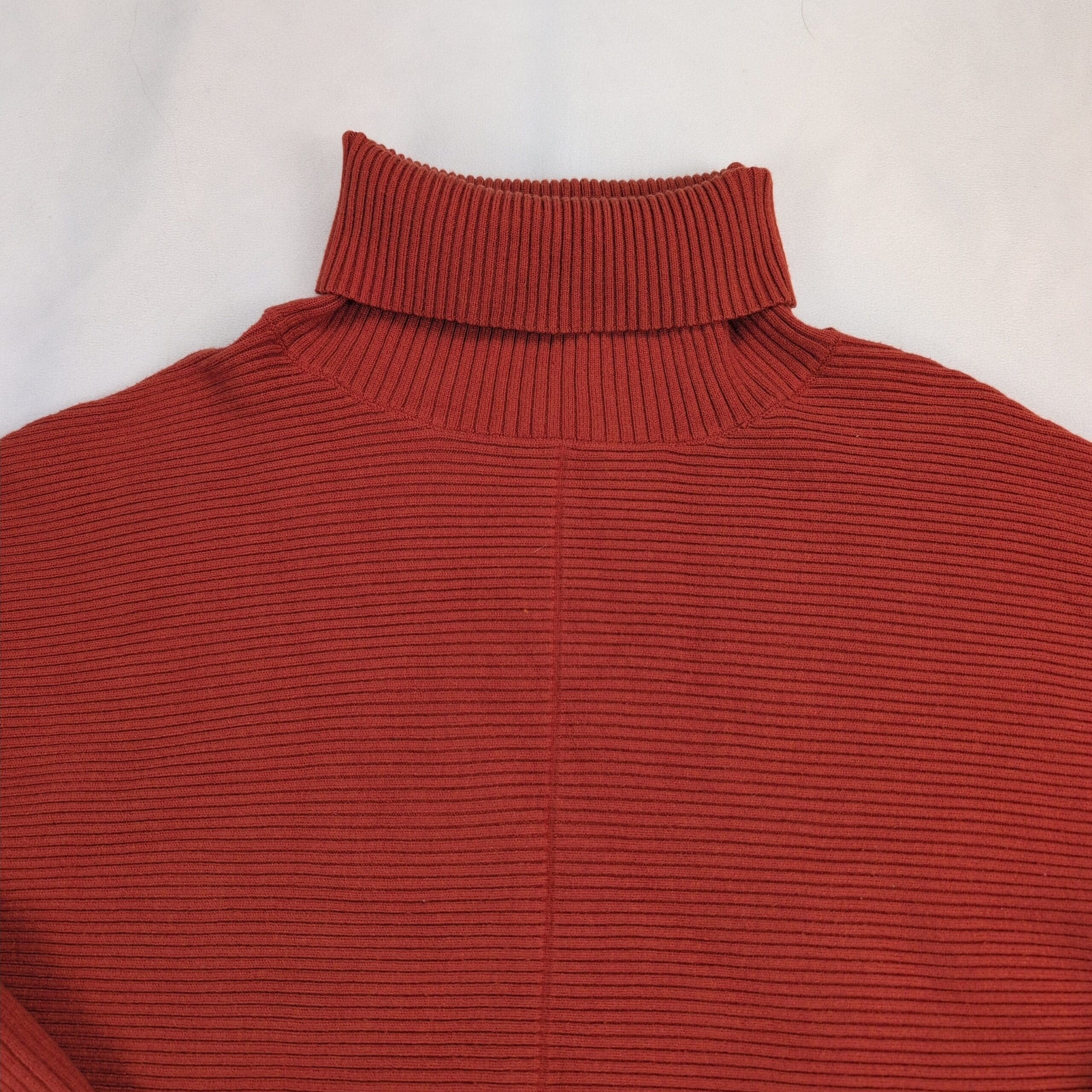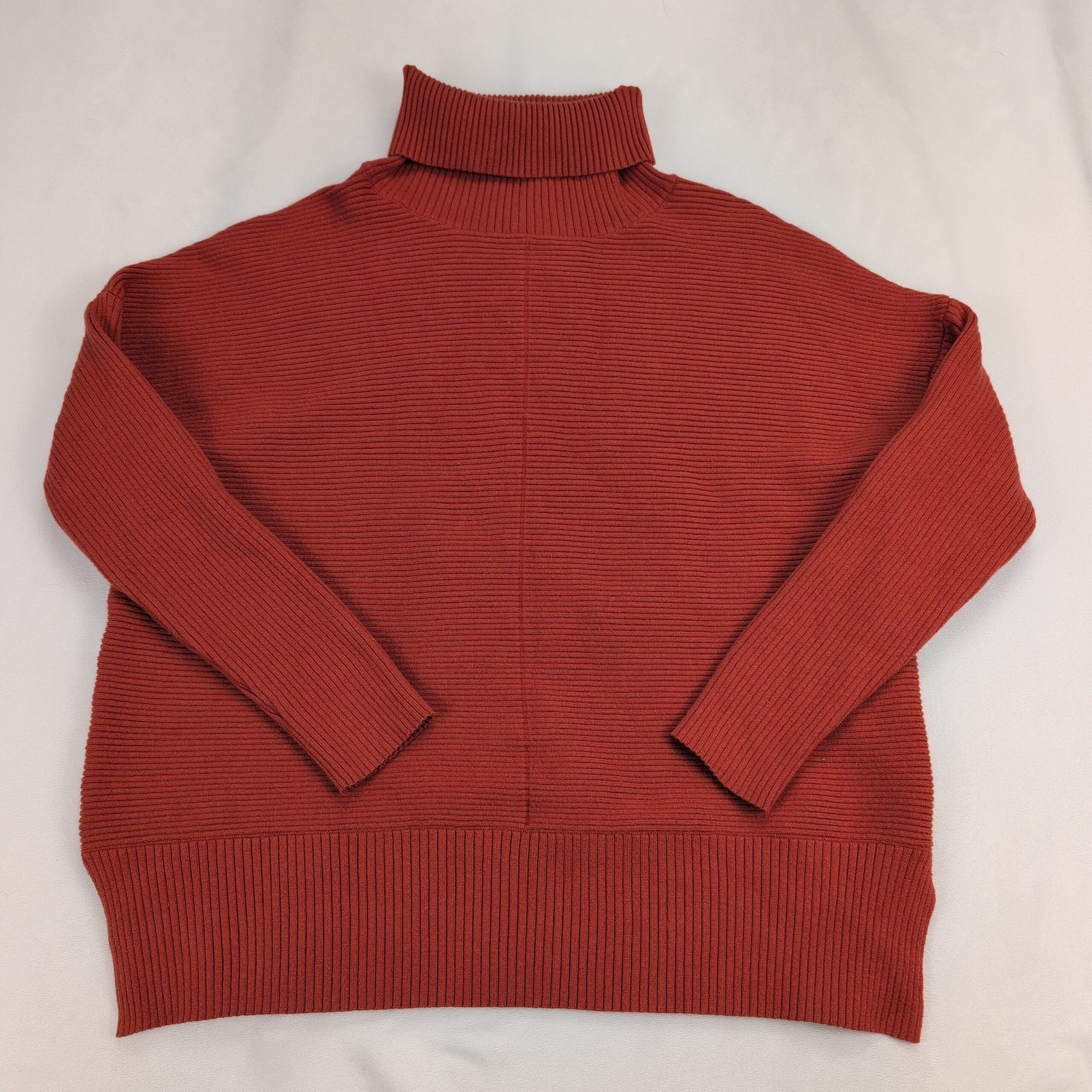 Anrabess women’s ribbed turtleneck sweater in a warm rust/brick red. Size L (standard) with a relaxed, boxy silhouette and drop shoulders for an easy, cozy fit. Features a tall folded turtleneck, horizontal rib texture and a wide ribbed hem that creates a modern layered look. Soft knit construction perfect for fall and winter layering.