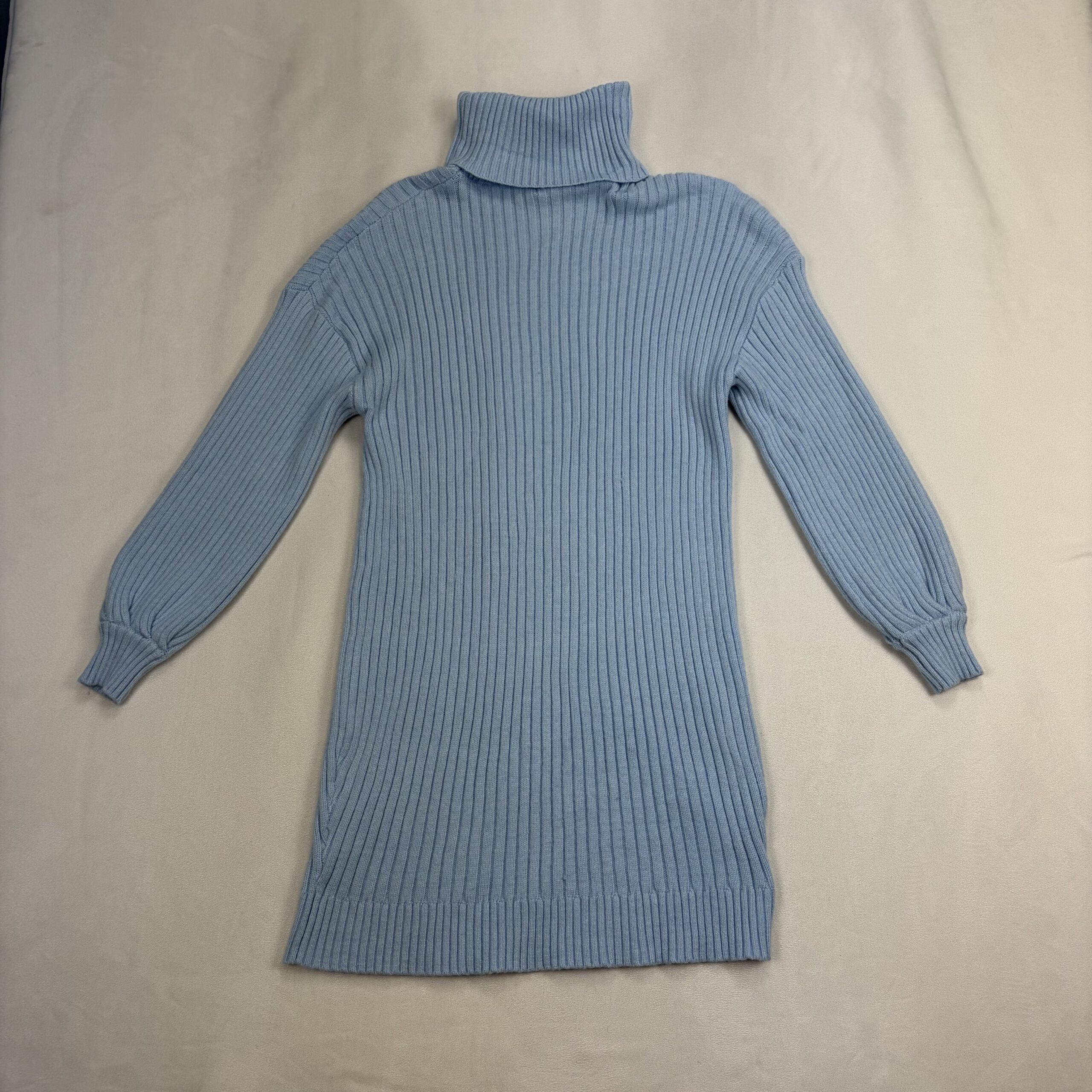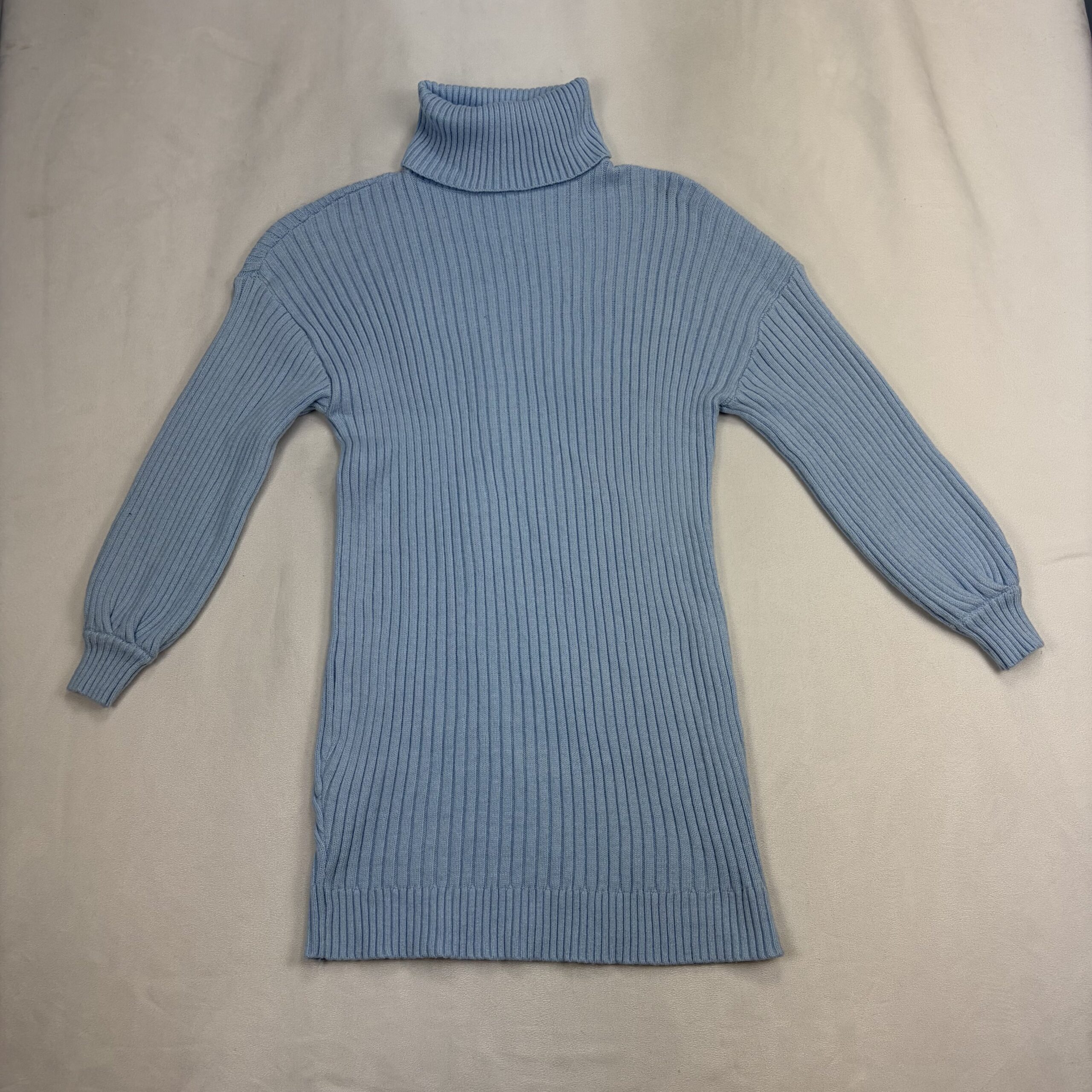 Style: Ribbed knit turtleneck sweater dress with long sleeves and cuffed wrists. Soft, medium-weight knit in a vertical rib pattern for a flattering, streamlined look. Classic turtleneck and straight silhouette — versatile for layering with boots or tights.