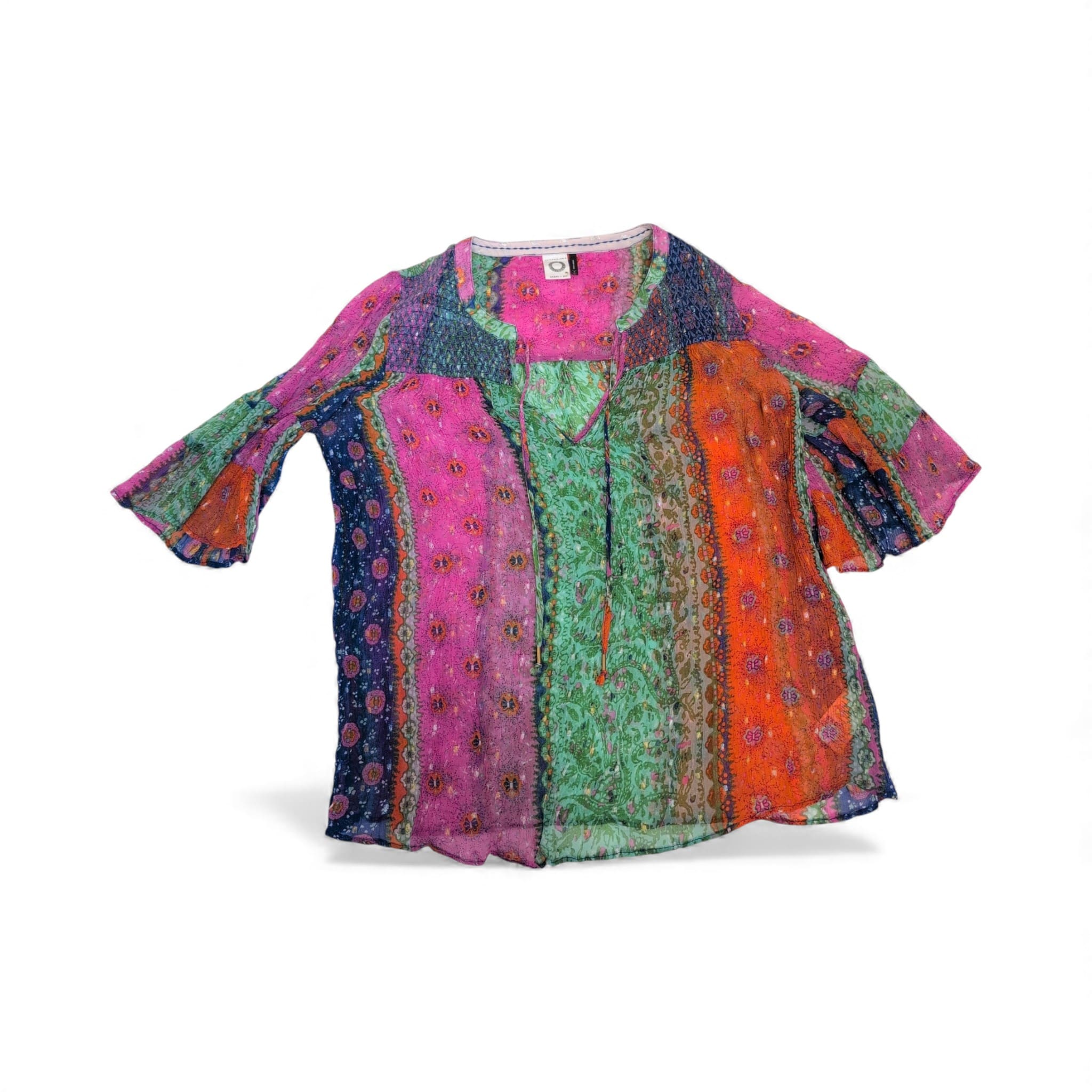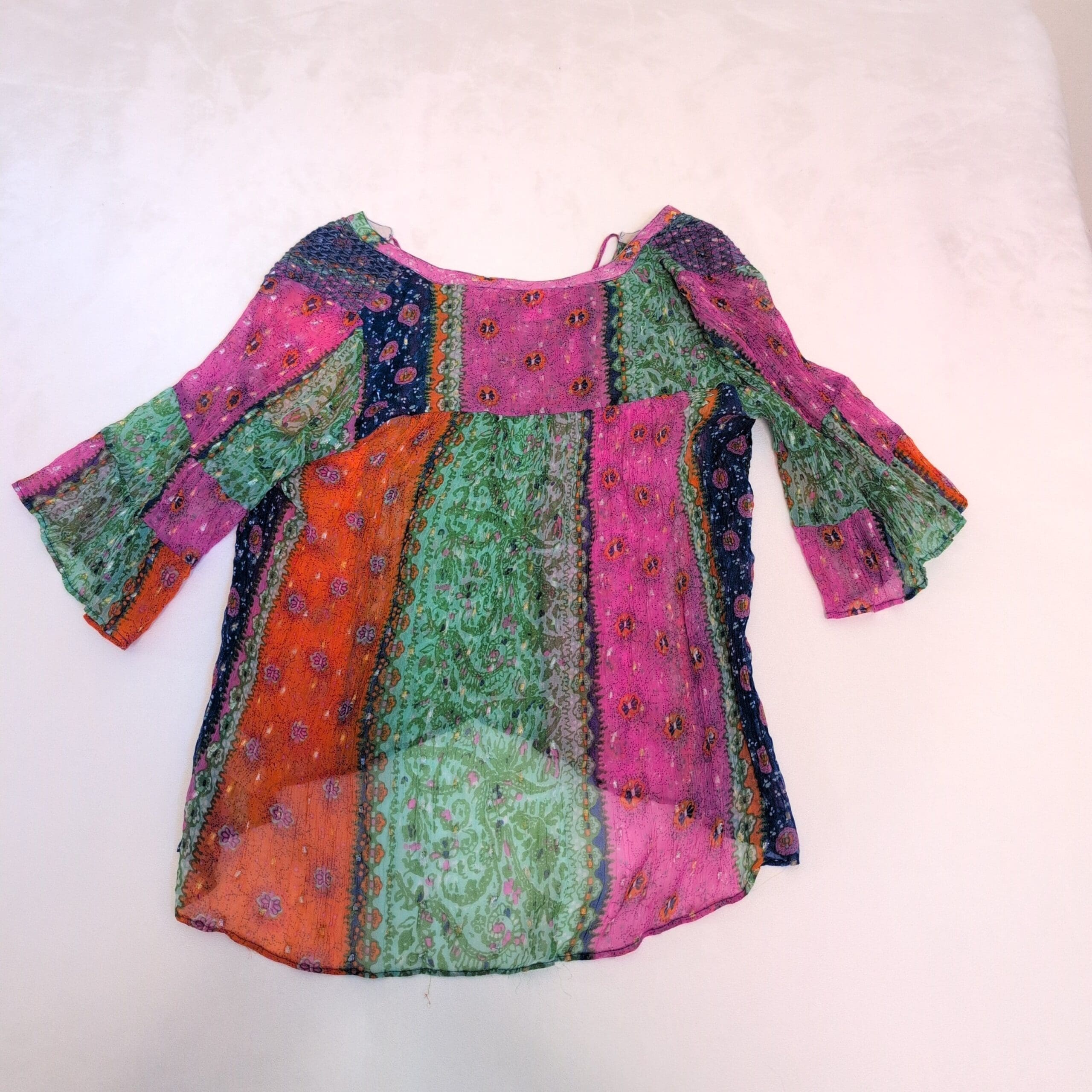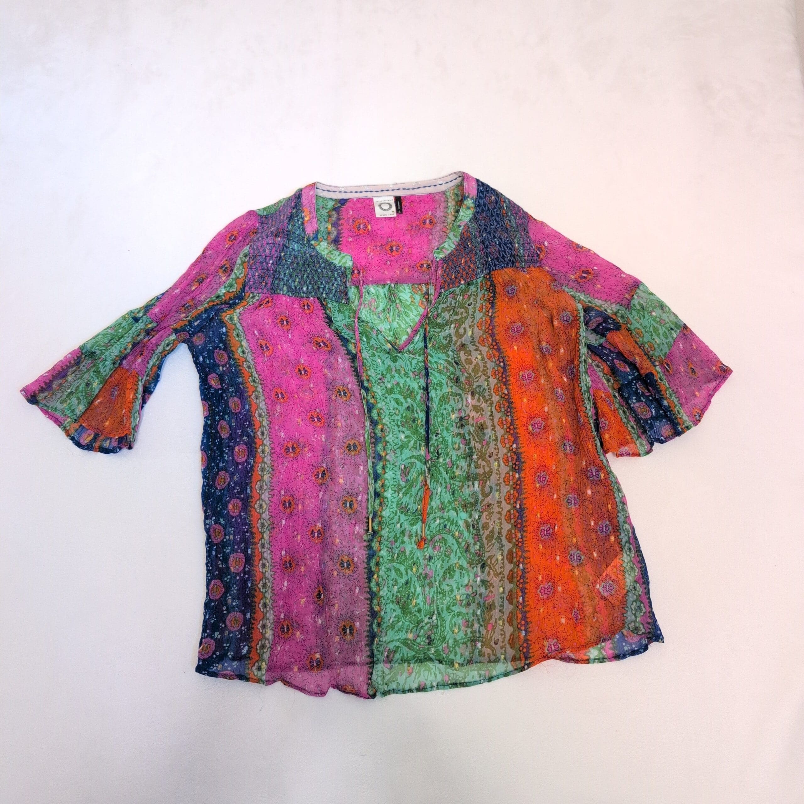 Vibrant Anthropologie women’s blouse in a boho patchwork print featuring green center panels with pink, orange and navy accents. Lightweight, semi-sheer fabric with a rounded split neckline and tie, short flared sleeves, and a relaxed, flowy silhouette — ideal for layering or warm-weather styling. Size M (standard). Please review photos for color and condition details.