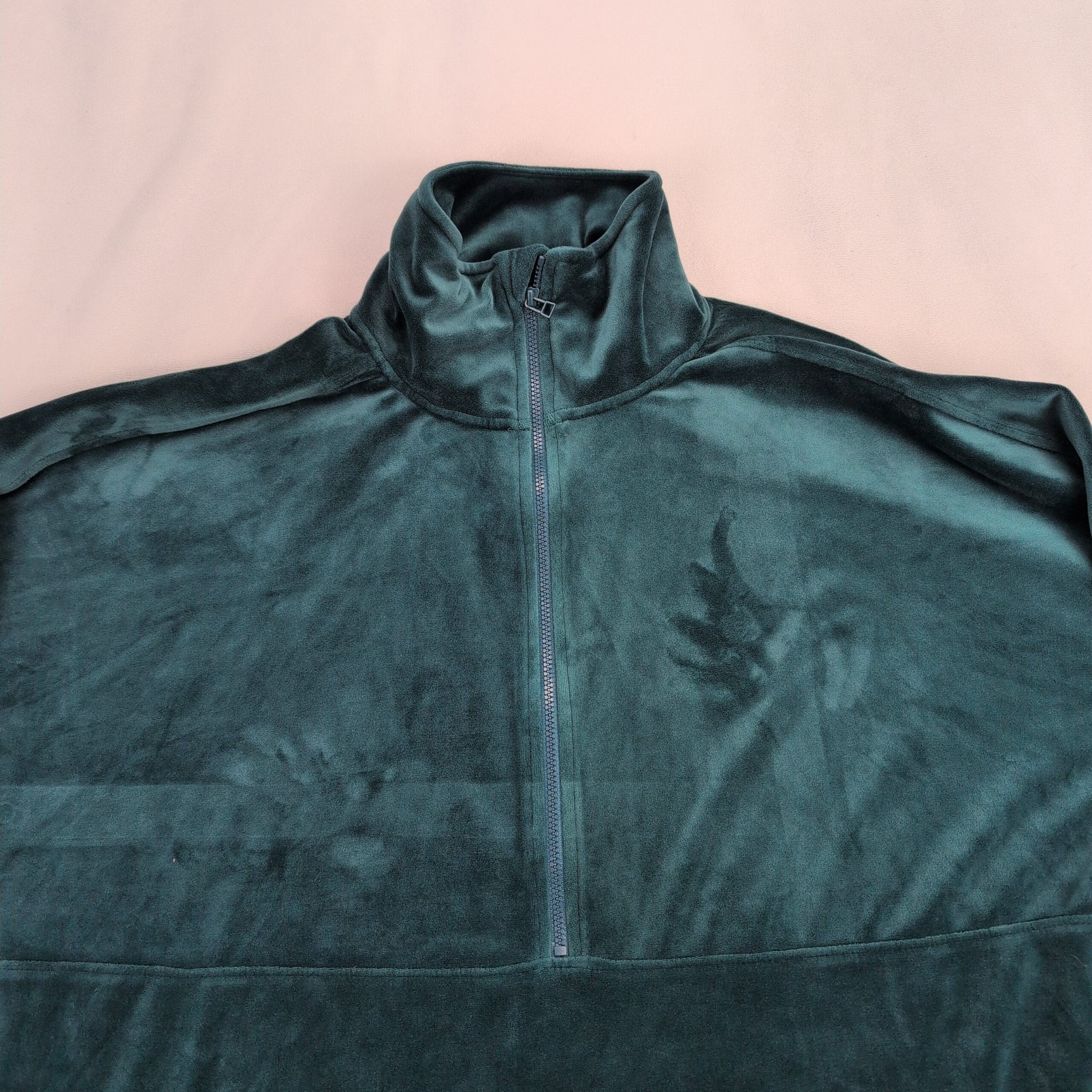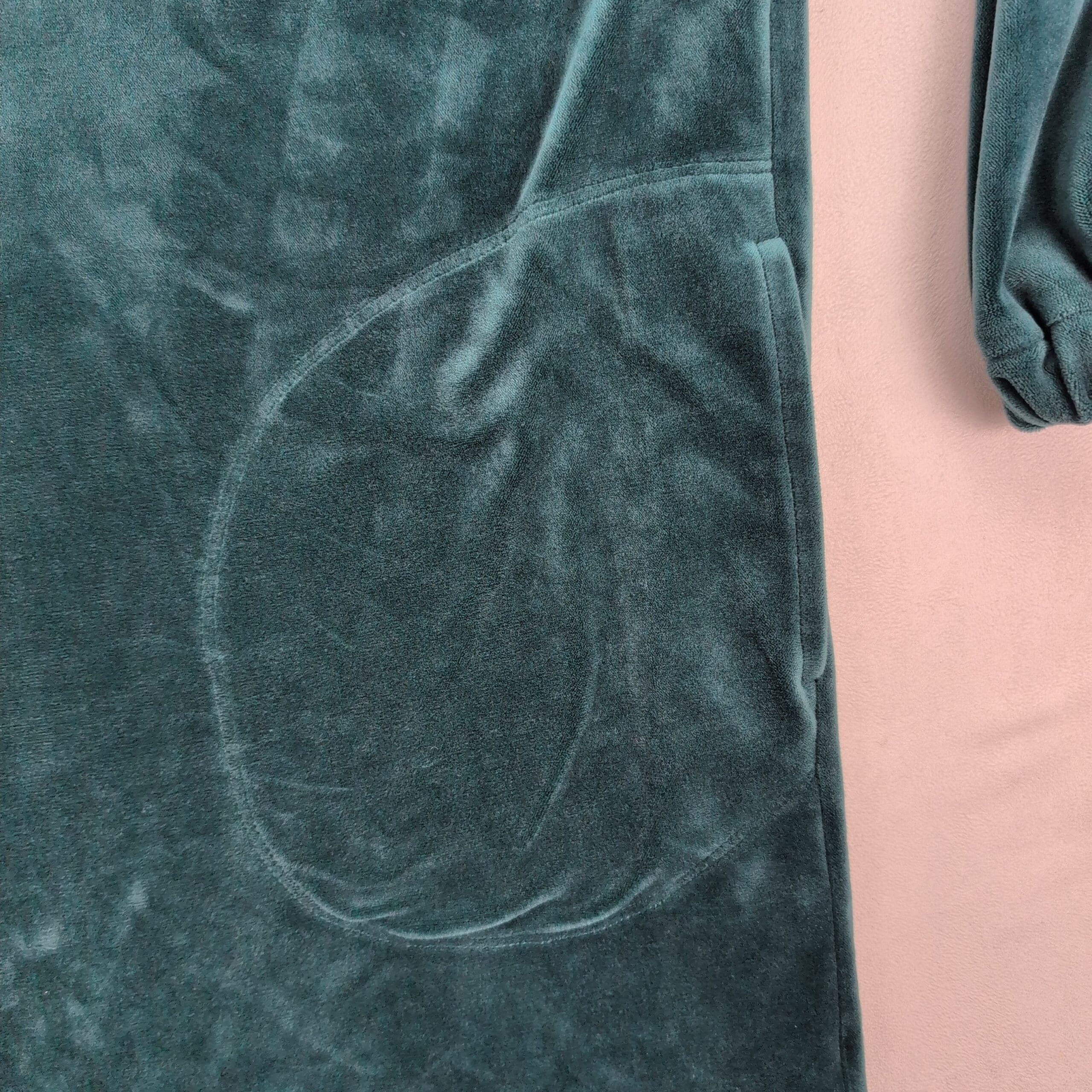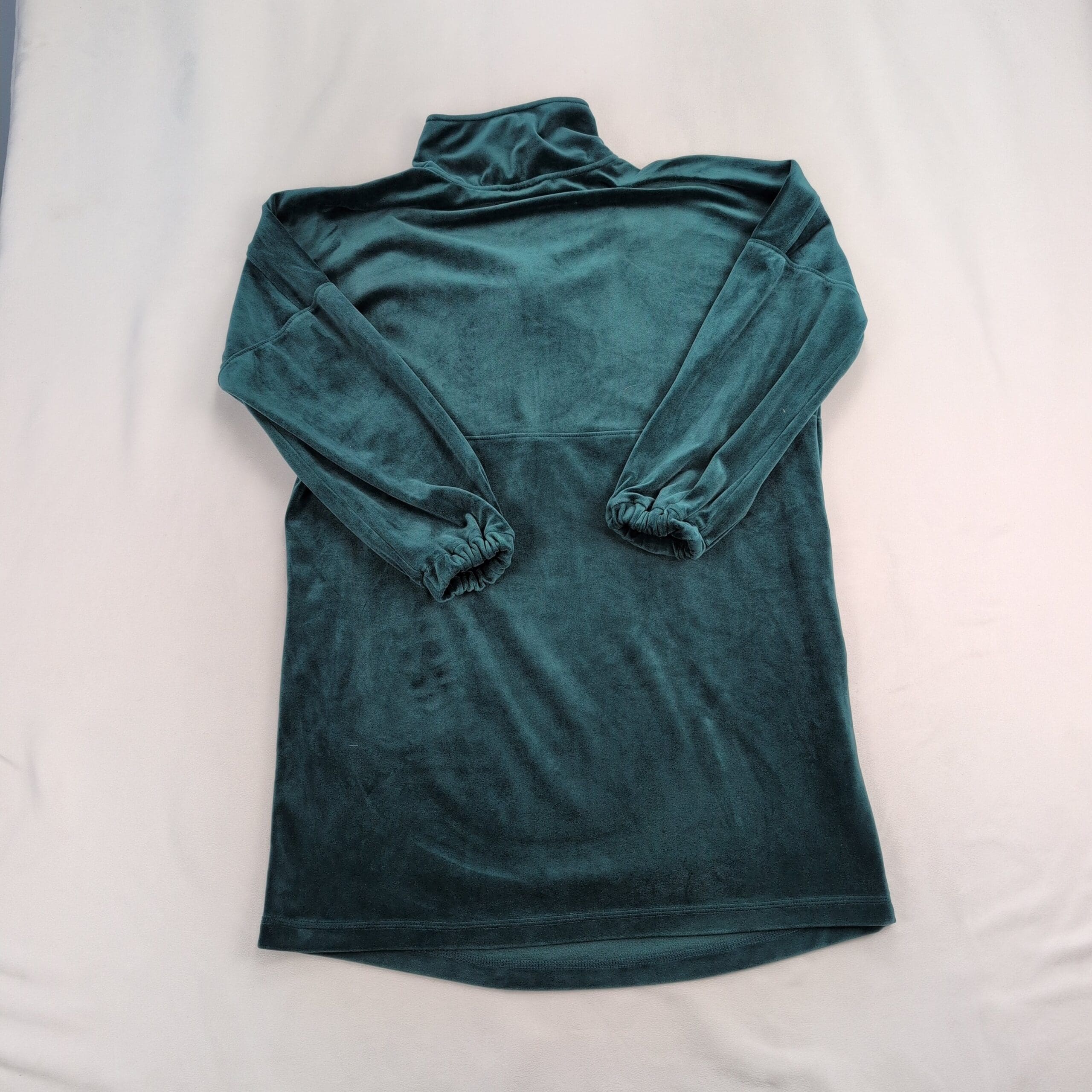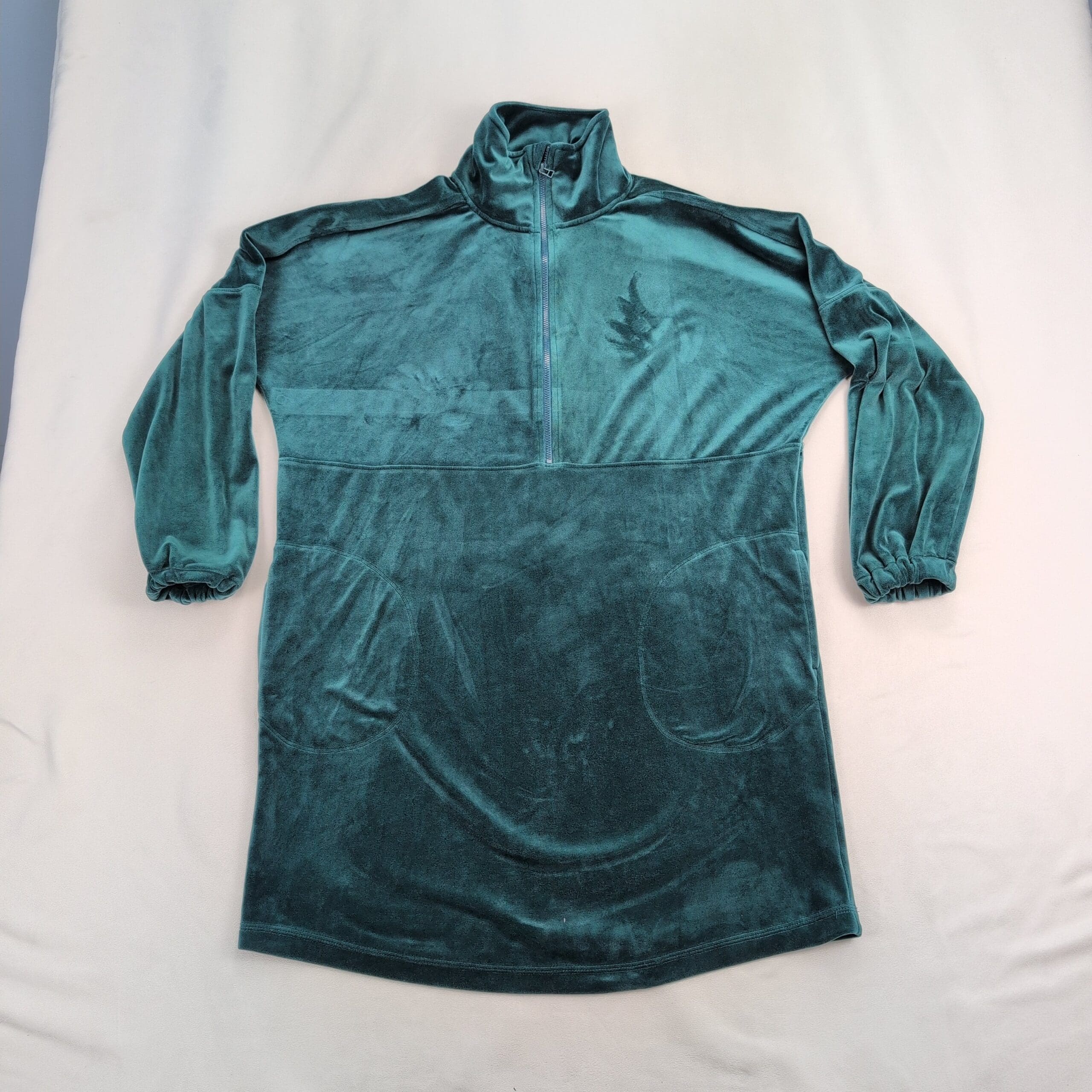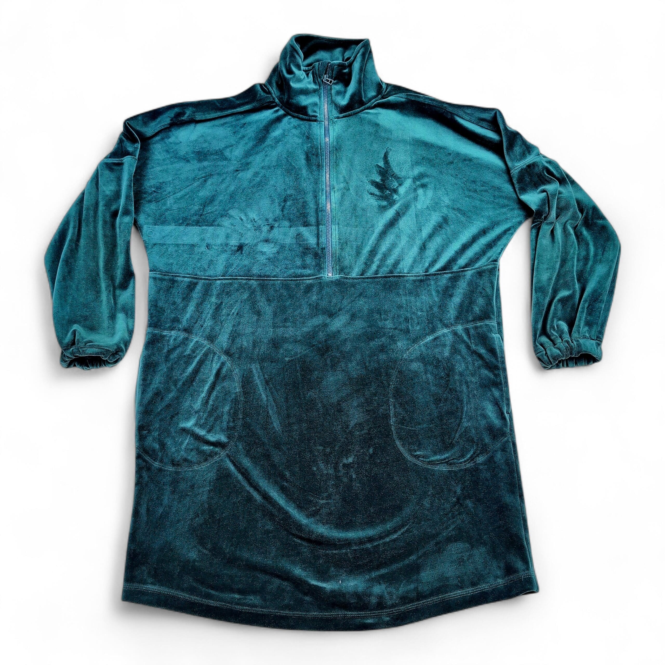Anthropologie Rosalind velvet half-zip tunic dress in size XS. Plush teal/emerald velvet with a mock neck and functional half-zip closure. Features long sleeves with elastic cuffs, seam-front patch pockets, and an A-line tunic silhouette that works as a dress or longer top. Soft luxe texture with subtle sheen — perfect for casual days or dressed up with boots.