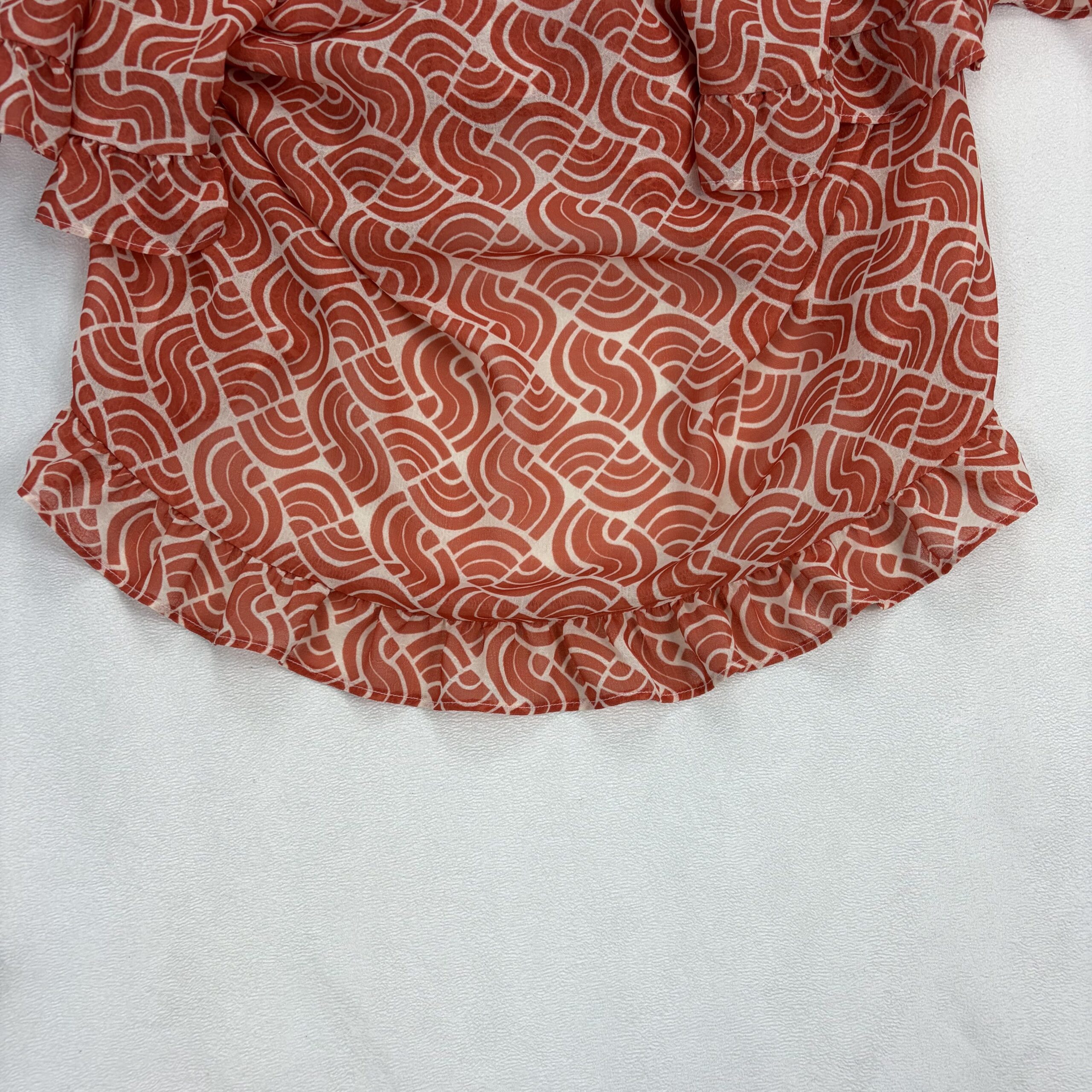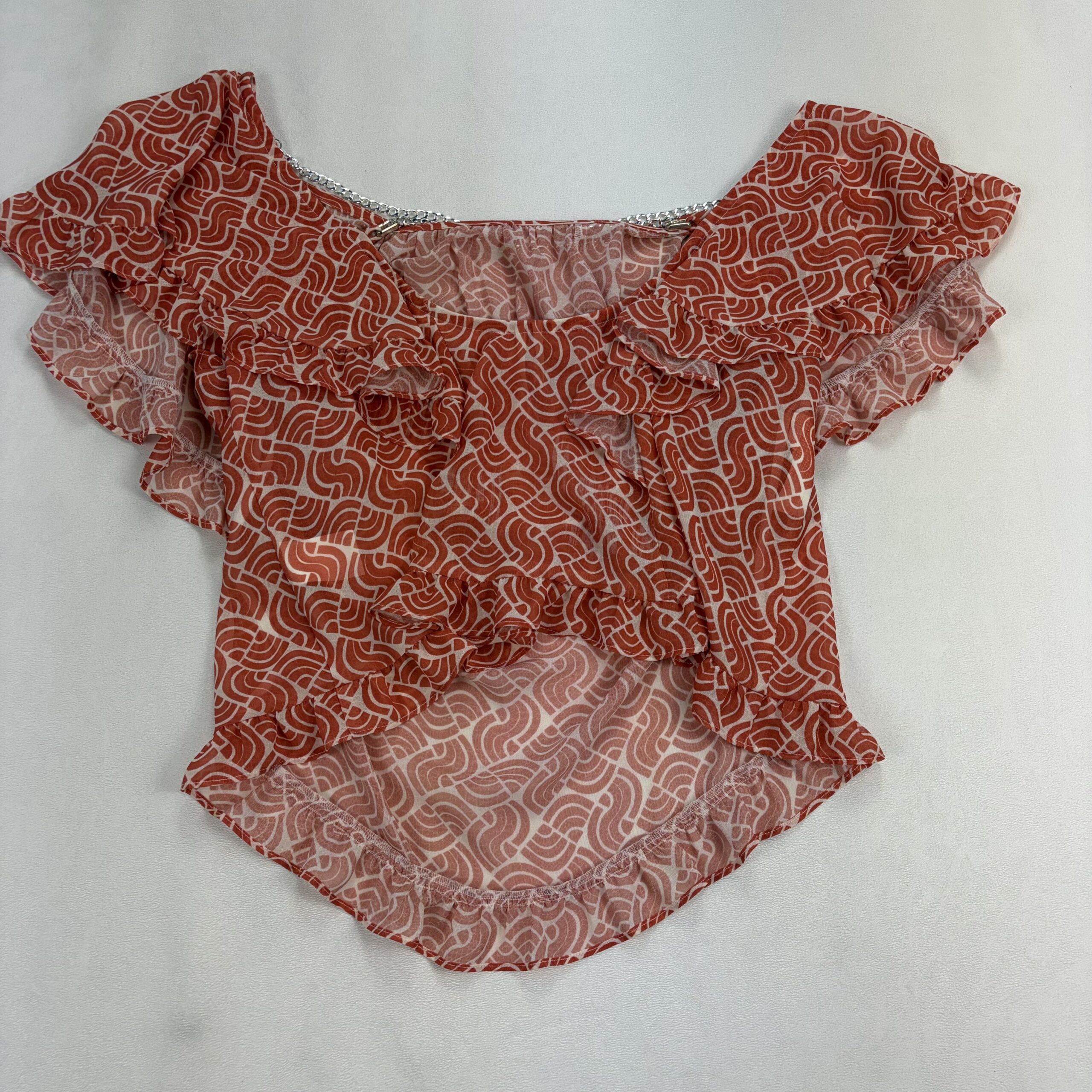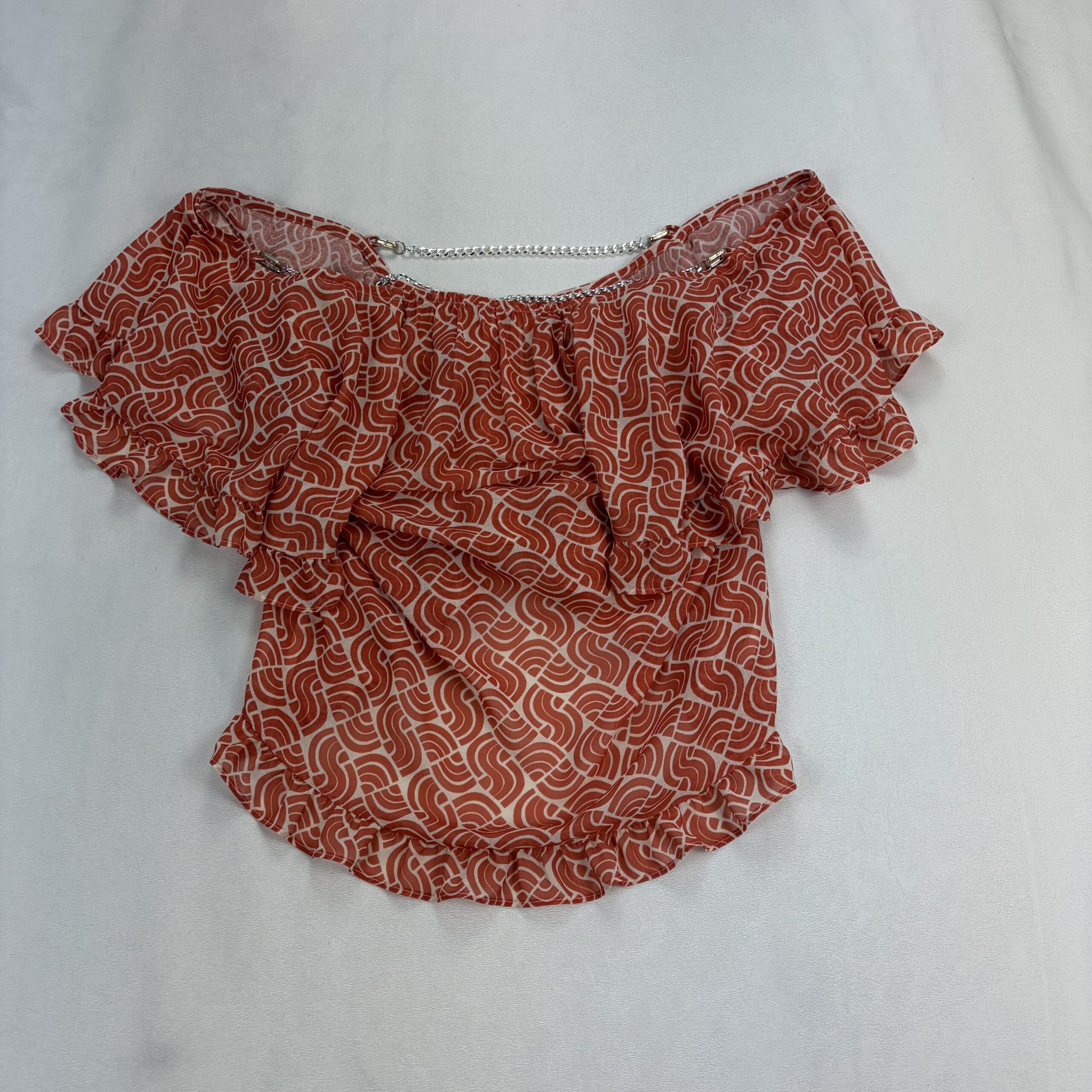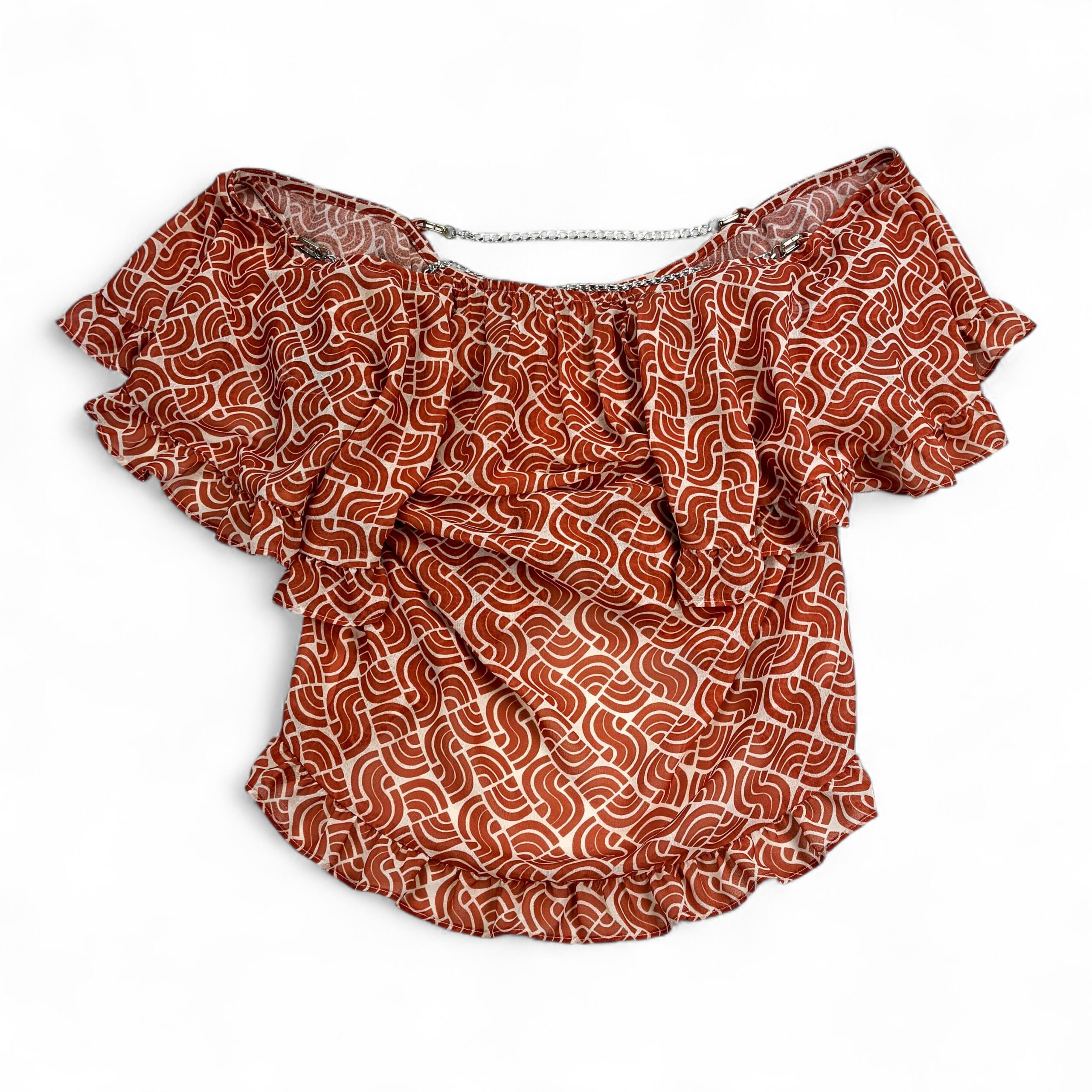 Anthropologie women’s ruffle off-shoulder blouse, size S. Burnt orange/terra-cotta geometric print on a lightweight, semi-sheer woven fabric. Features layered ruffle neckline and flutter sleeves with a decorative silver-tone chain accent at the neckline for a polished touch. Elasticized neckline and hem create an easy, flattering fit that sits off the shoulders.