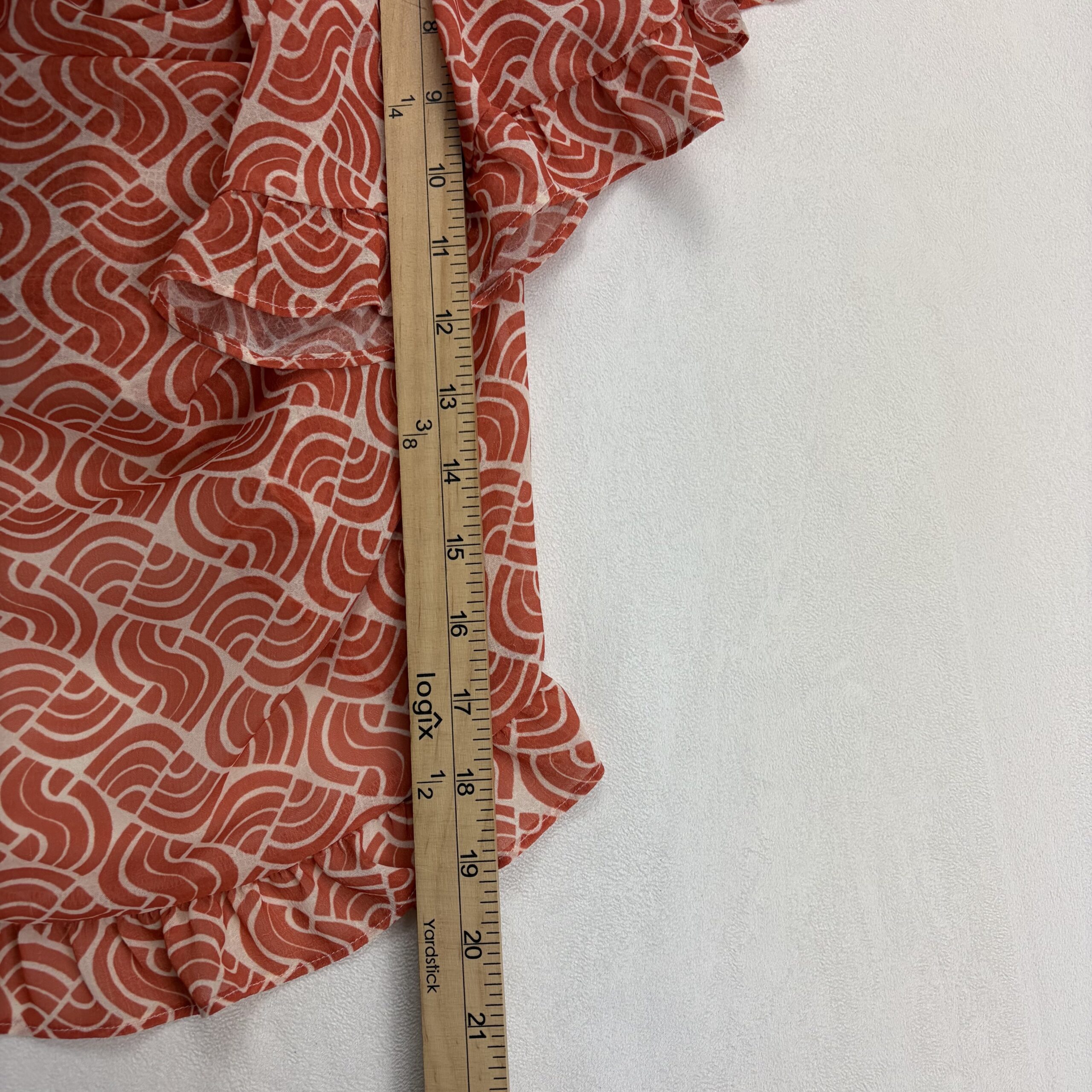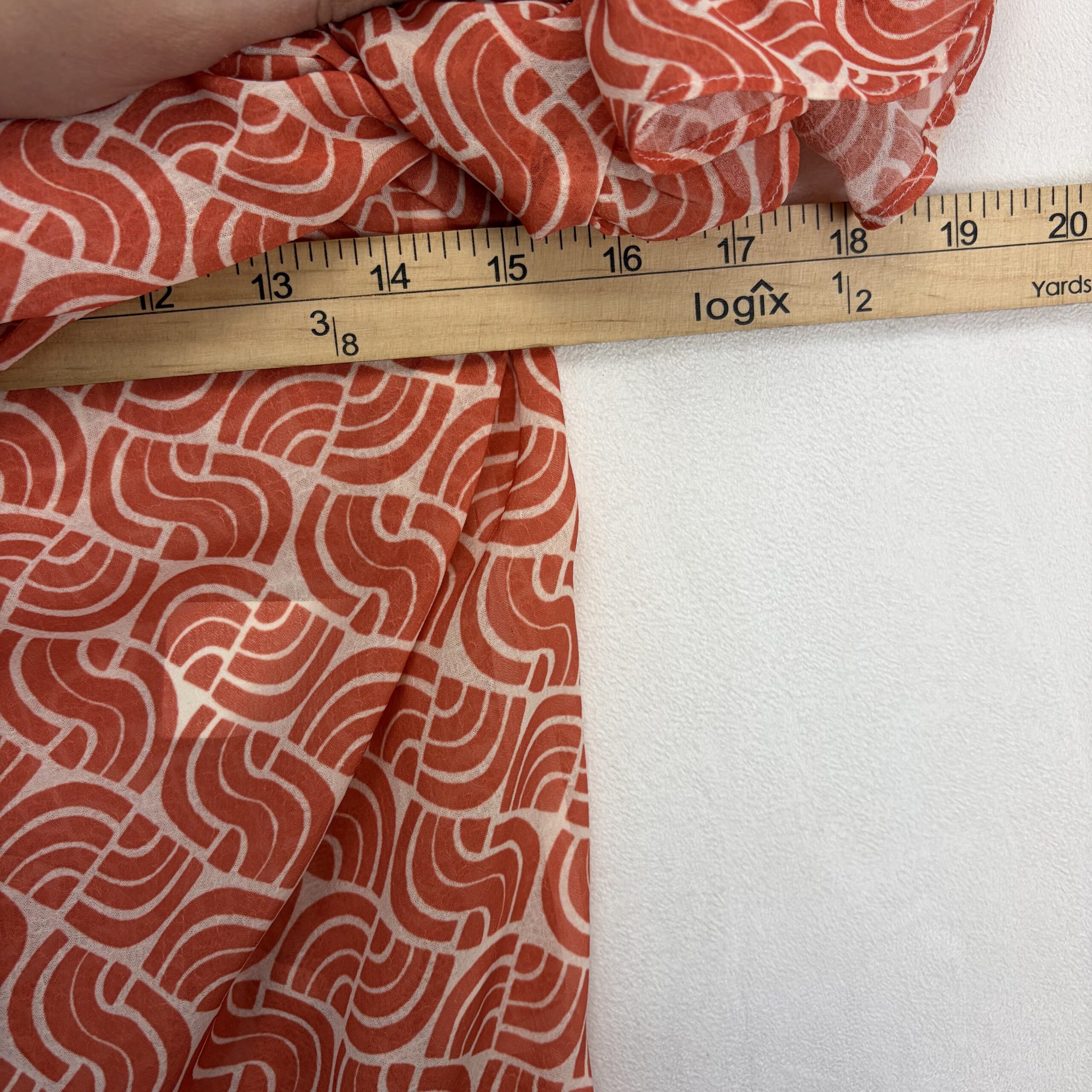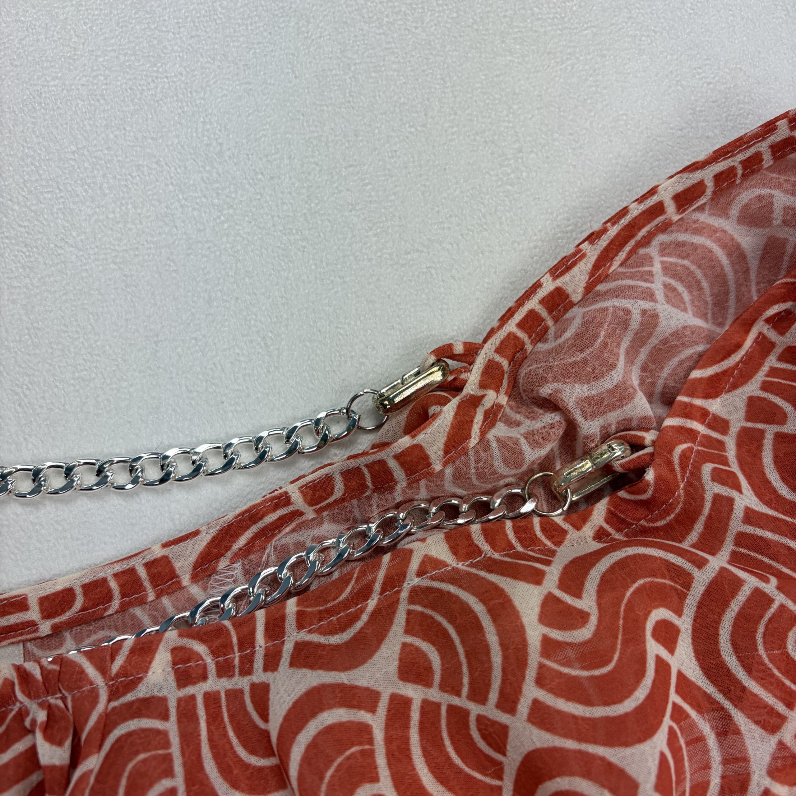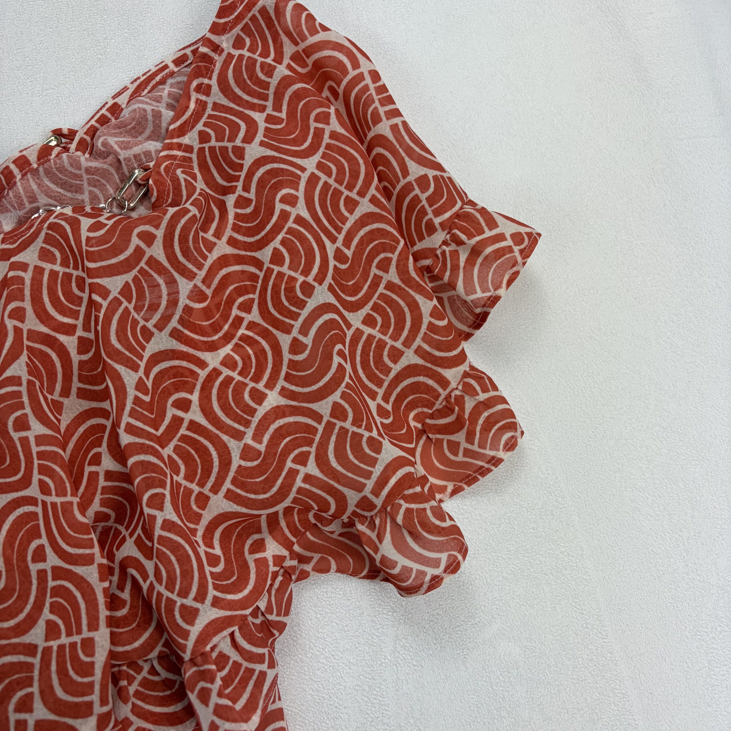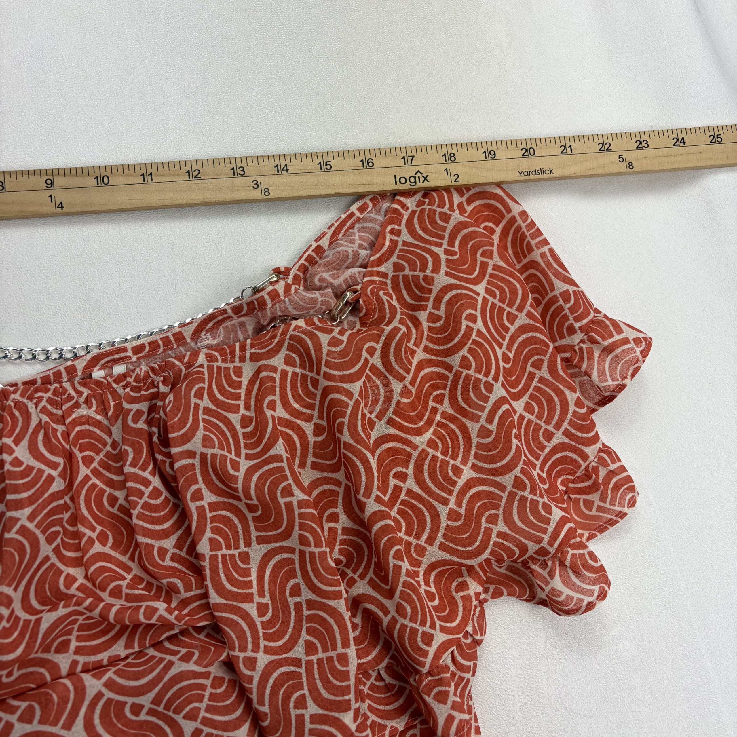 Anthropologie women’s ruffle off-shoulder blouse, size S. Burnt orange/terra-cotta geometric print on a lightweight, semi-sheer woven fabric. Features layered ruffle neckline and flutter sleeves with a decorative silver-tone chain accent at the neckline for a polished touch. Elasticized neckline and hem create an easy, flattering fit that sits off the shoulders.