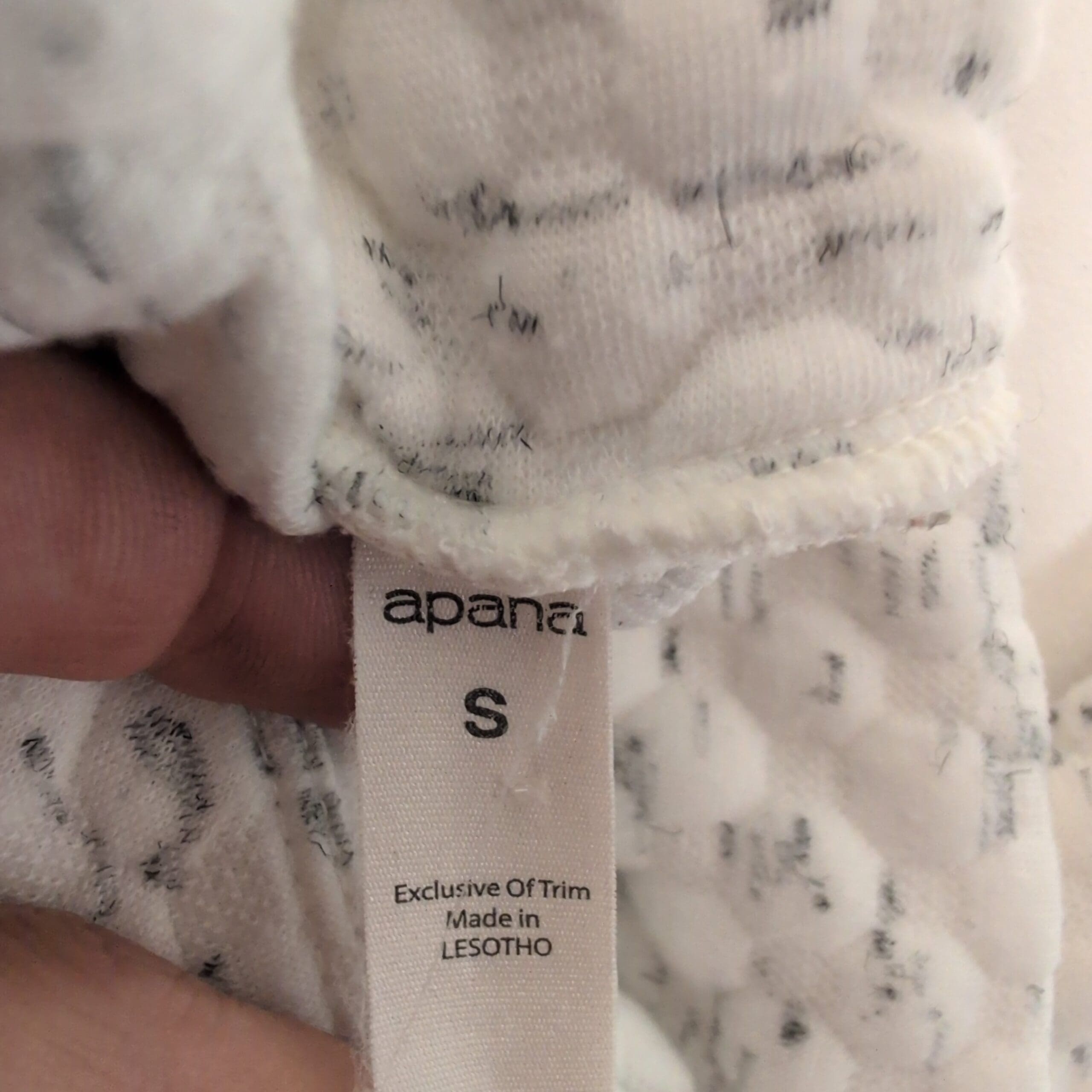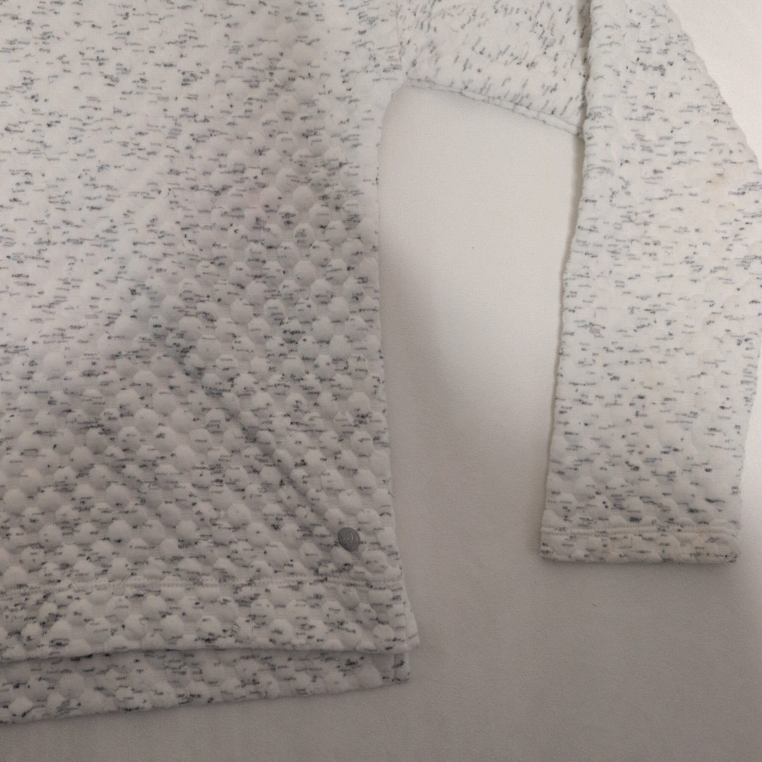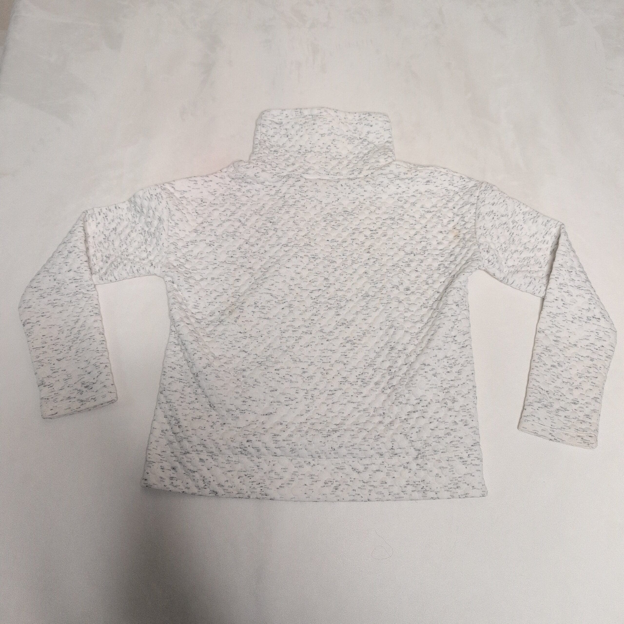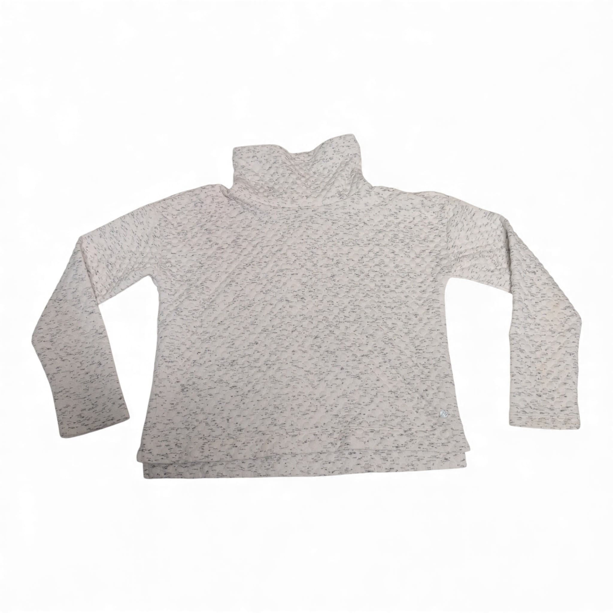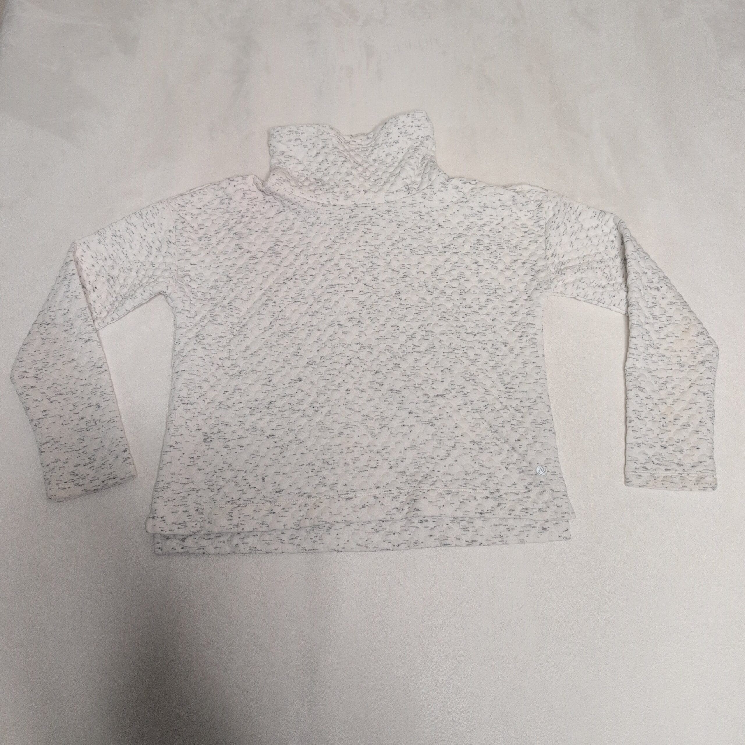 Apana women’s white quilted turtleneck top in size S. Soft textured knit with a subtle heathered speckle detail, long sleeves and a cozy funnel/turtleneck — ideal for layering or relaxed everyday wear. Lightweight and comfortable with a neat hem and a small Apana logo at the lower hem. Pre-owned; very good condition with normal light wear consistent with gentle use. Please see photos for details.