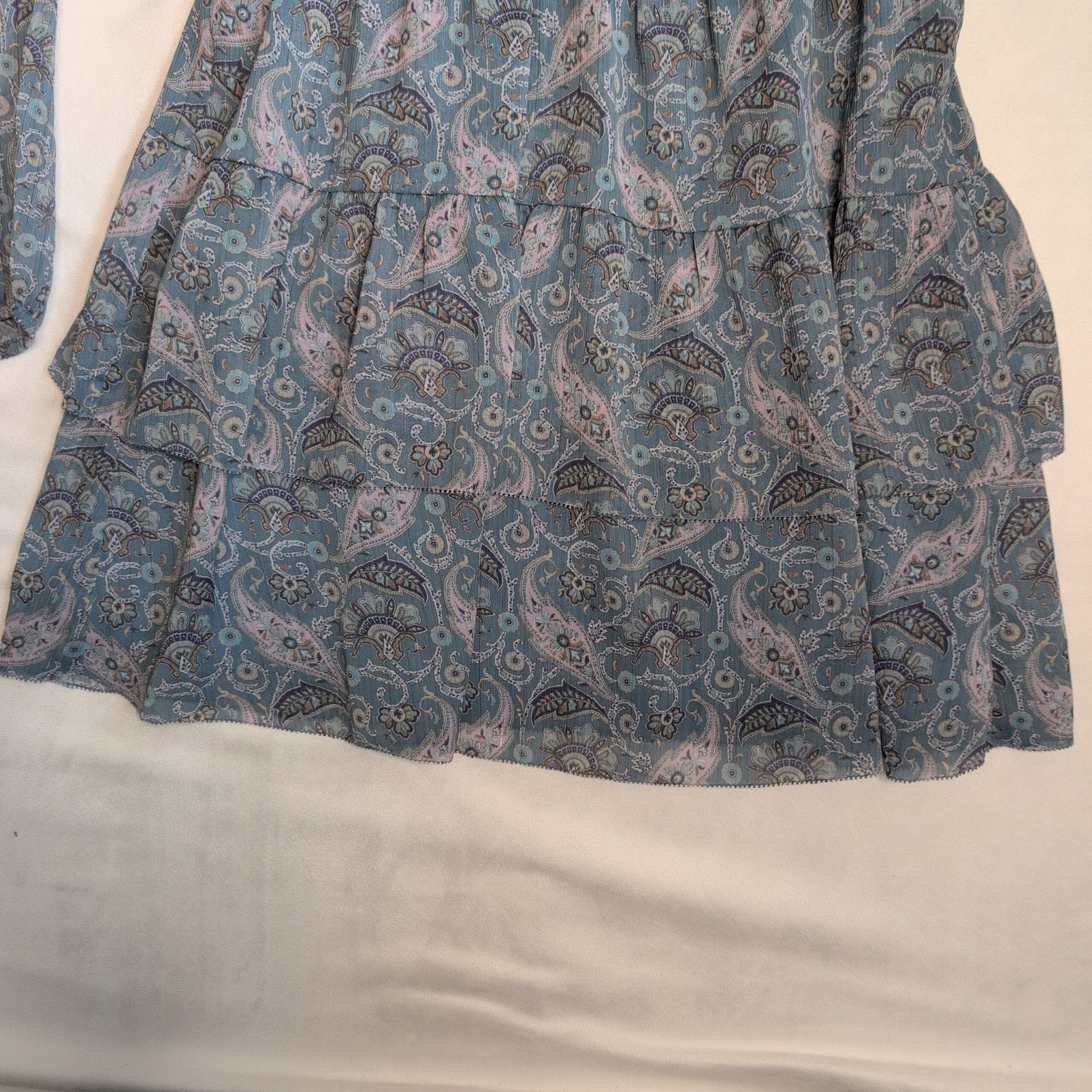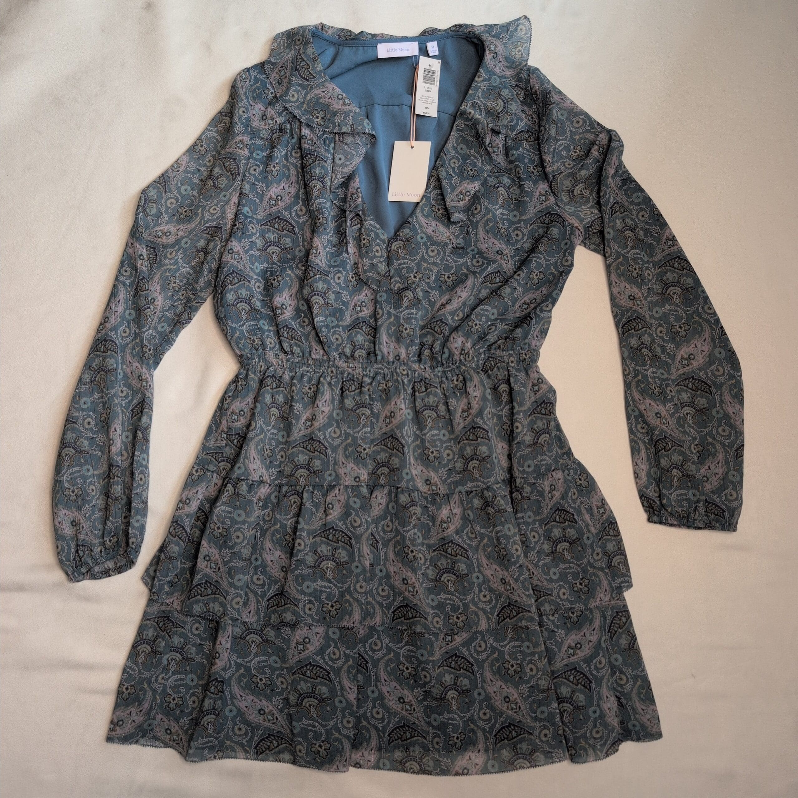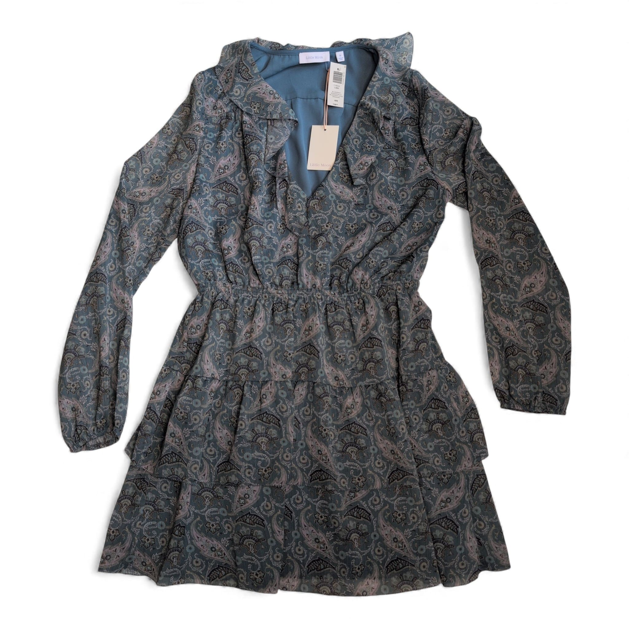 NWT— Aritzia (Little Moon) long-sleeve tiered mini dress in a muted blue paisley print. Size M (standard). Features a ruffled V-neck collar, elastic cinched waist, long sleeves with elastic cuffs, and a flowy tiered skirt. Lightweight chiffon overlay with a soft lining for comfortable coverage. Perfect for daytime or dressed up for evening. Excellent like-new condition.