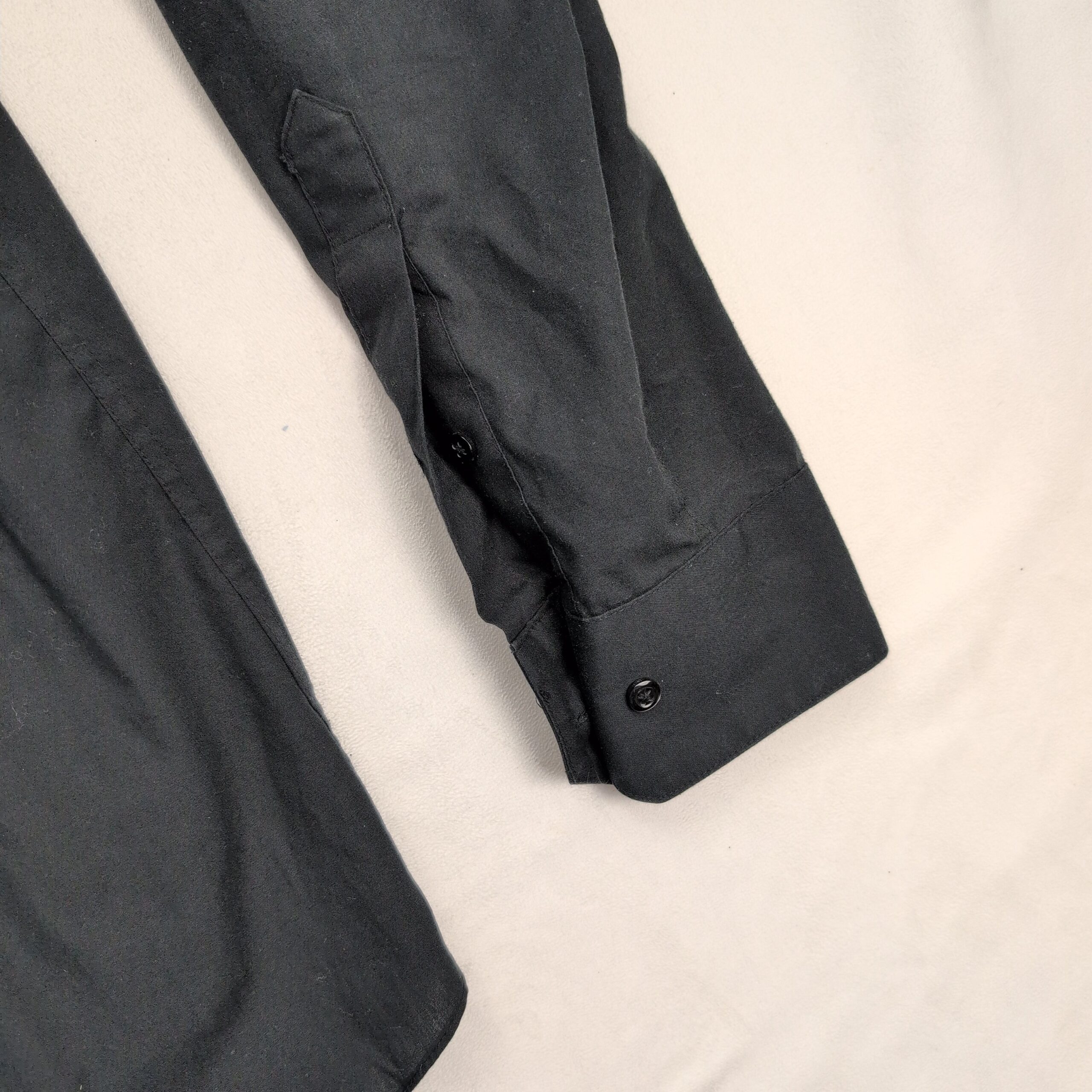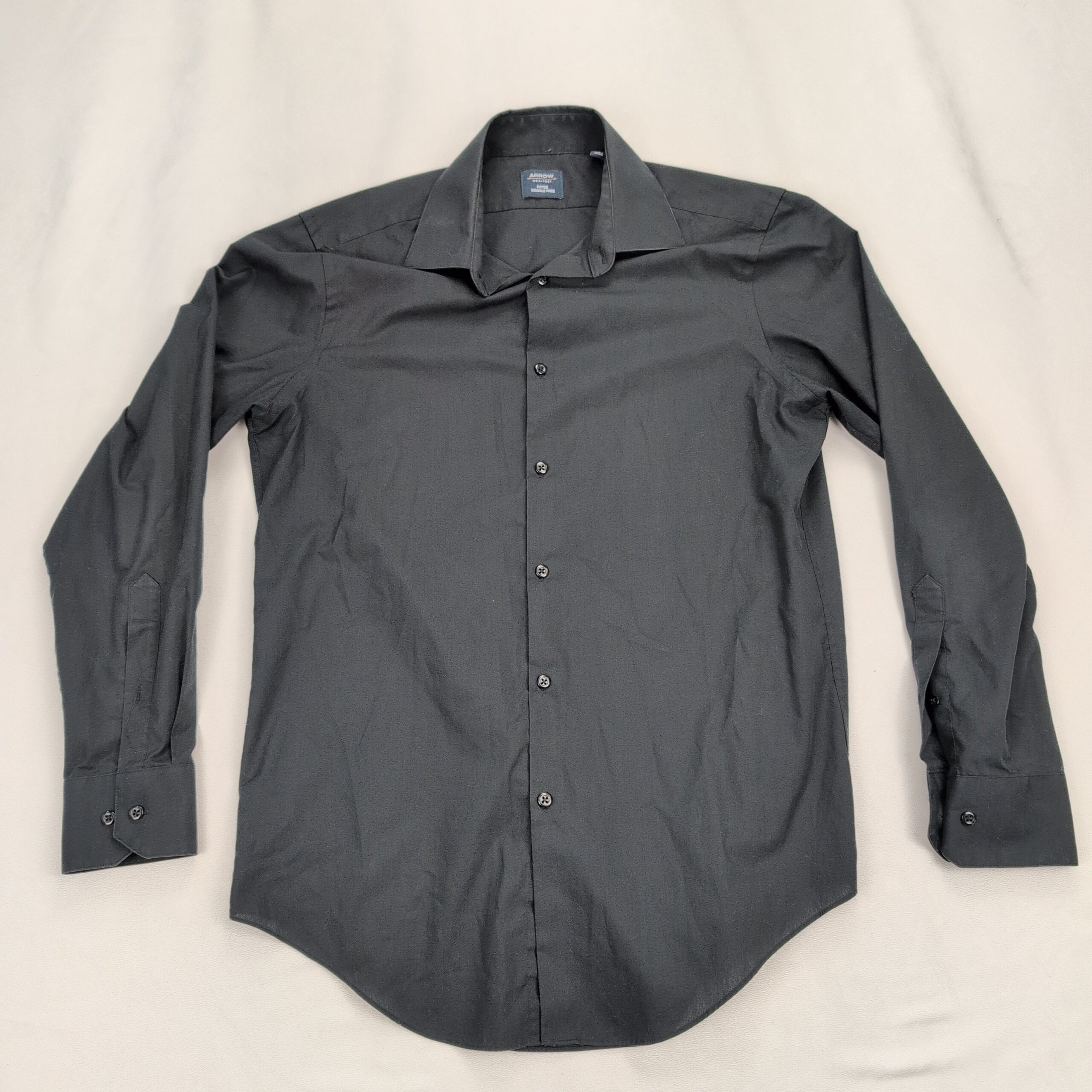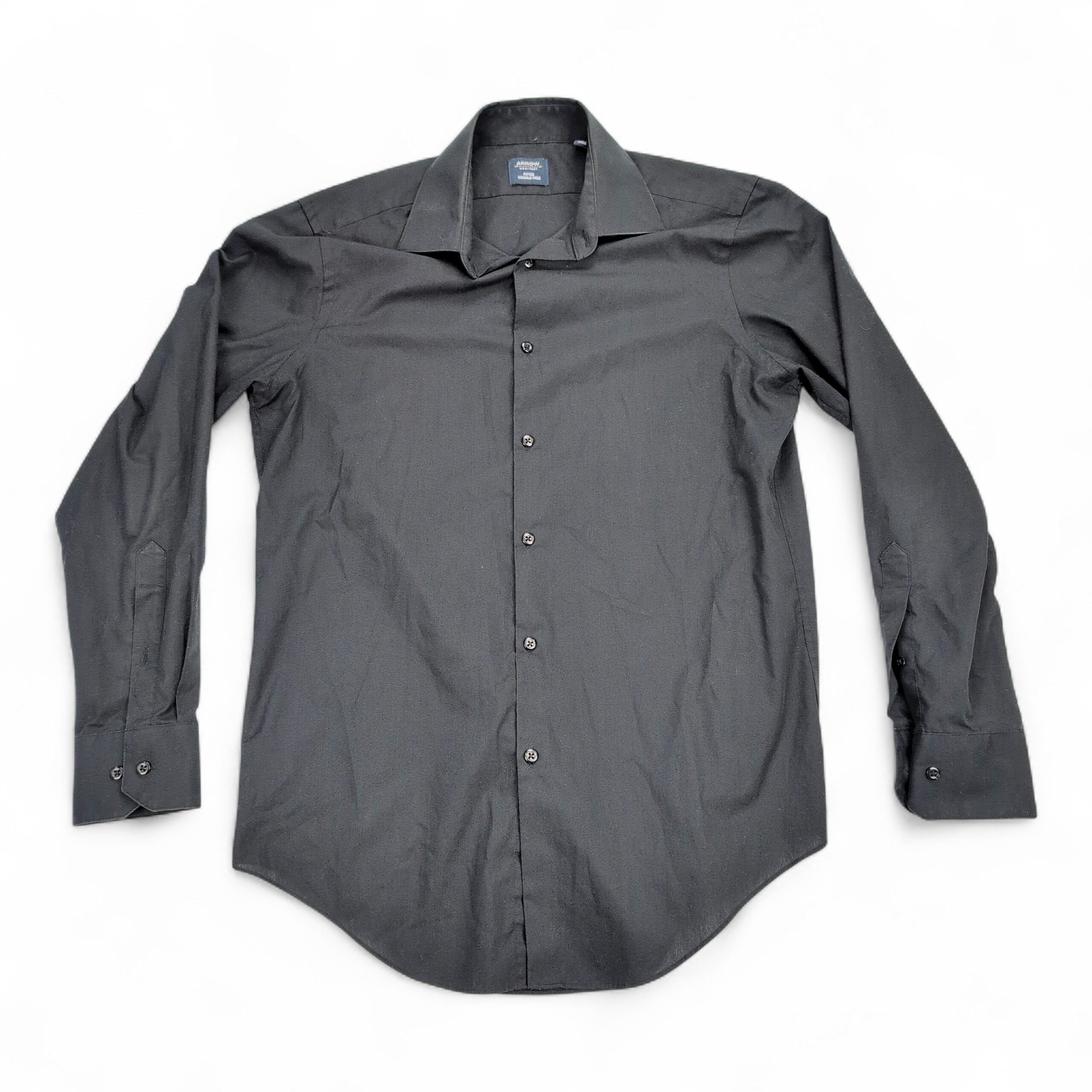 Classic Arrow men’s long-sleeve dress shirt in solid black. Size: Neck 15.5 (standard). Features a spread collar, full button placket, and button cuffs — a versatile piece for work or dressier occasions.