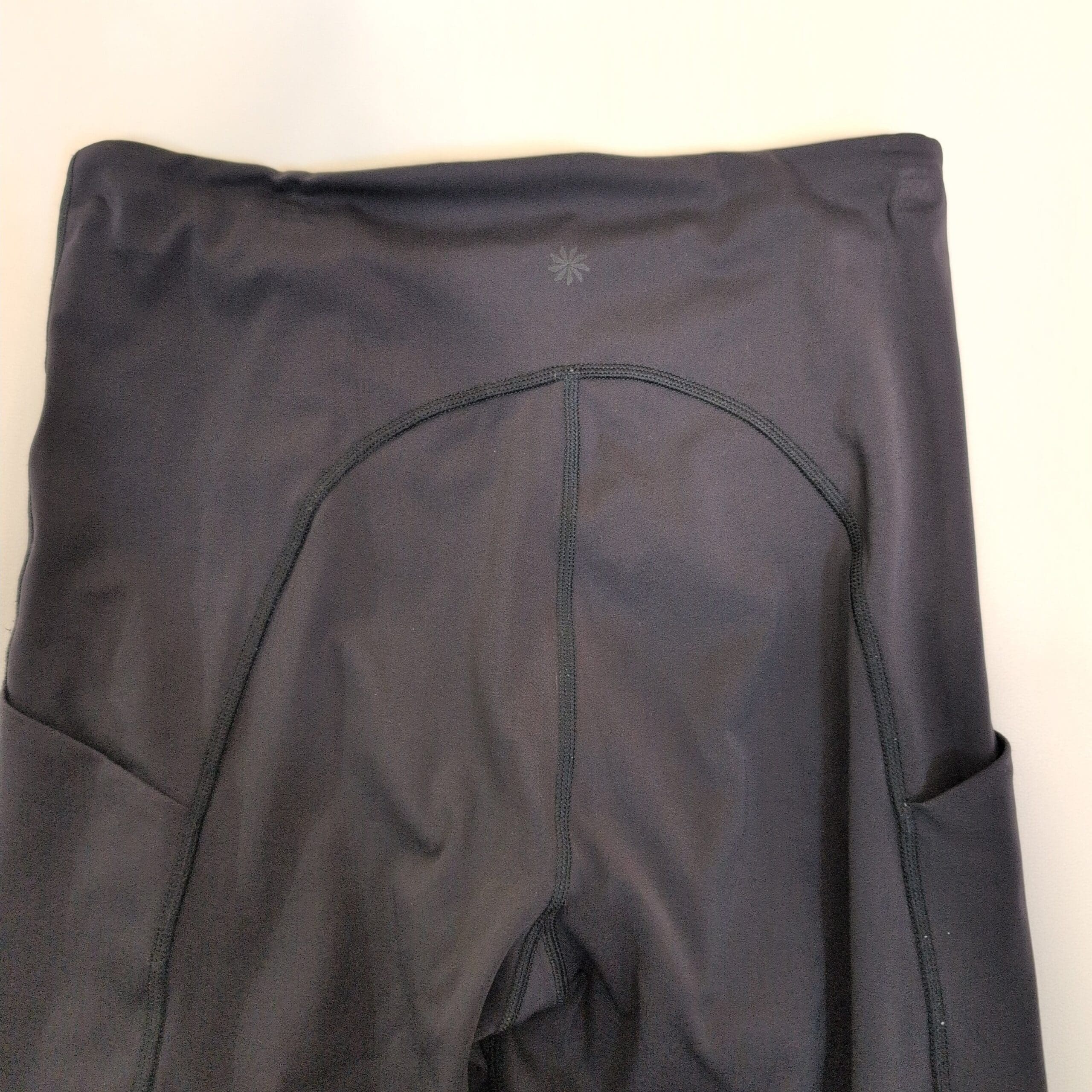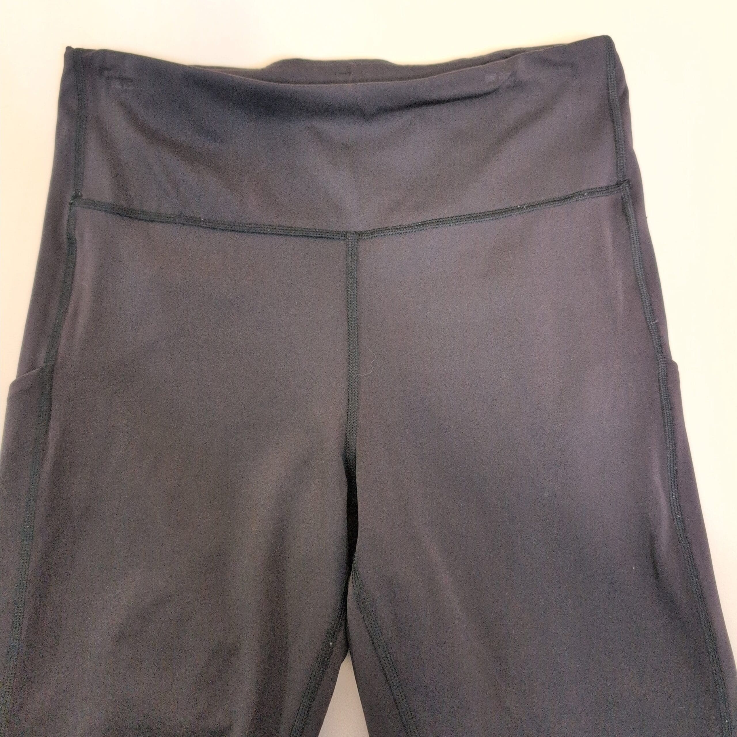 Black Athleta women’s leggings in size M. Features a wide supportive waistband for a secure, flattering fit and smooth, stretchy performance fabric. Visible stitched side panels and convenient thigh pockets to hold your phone or small essentials. Versatile for workouts, yoga, or everyday athleisure. Pre-owned and in excellent condition with minimal signs of wear.