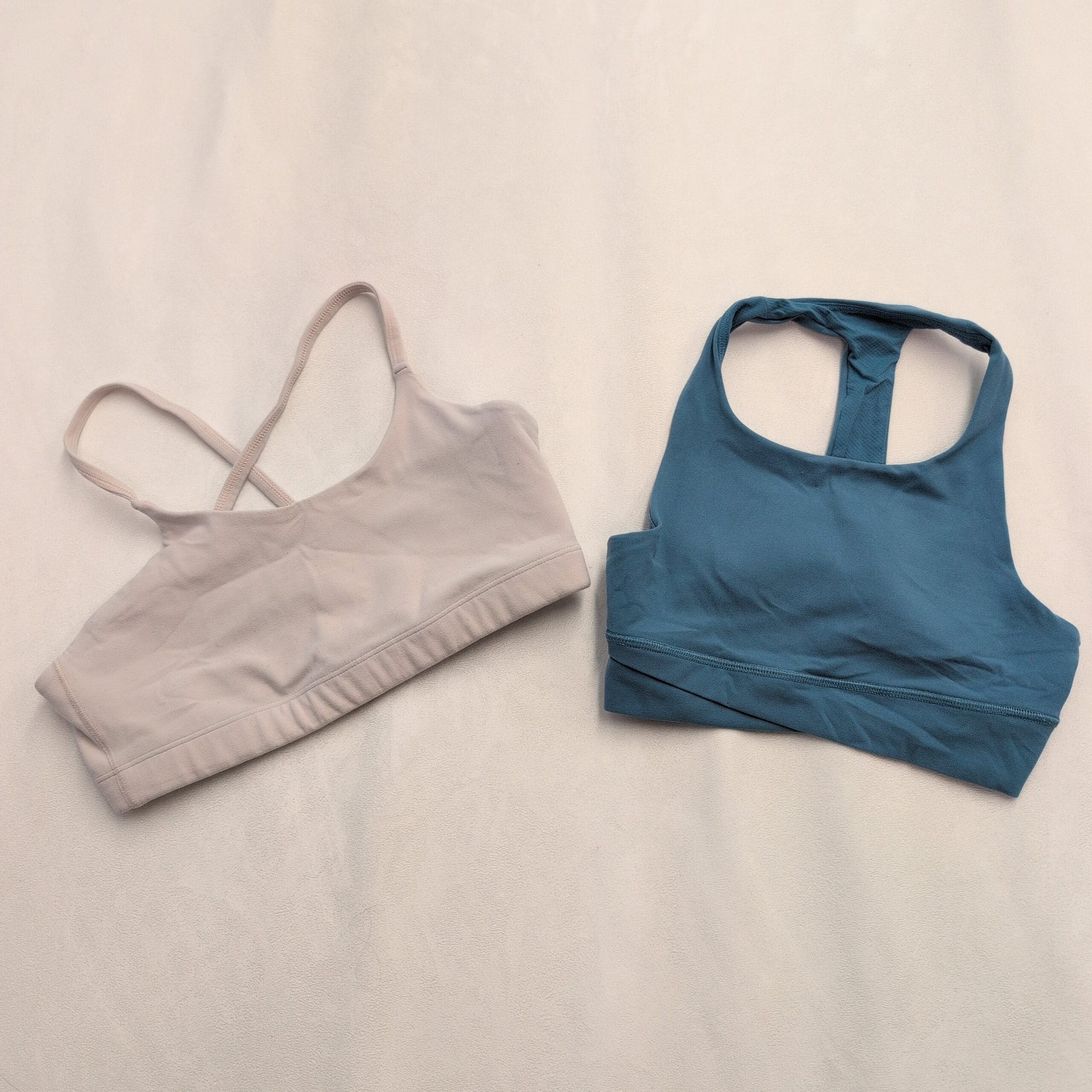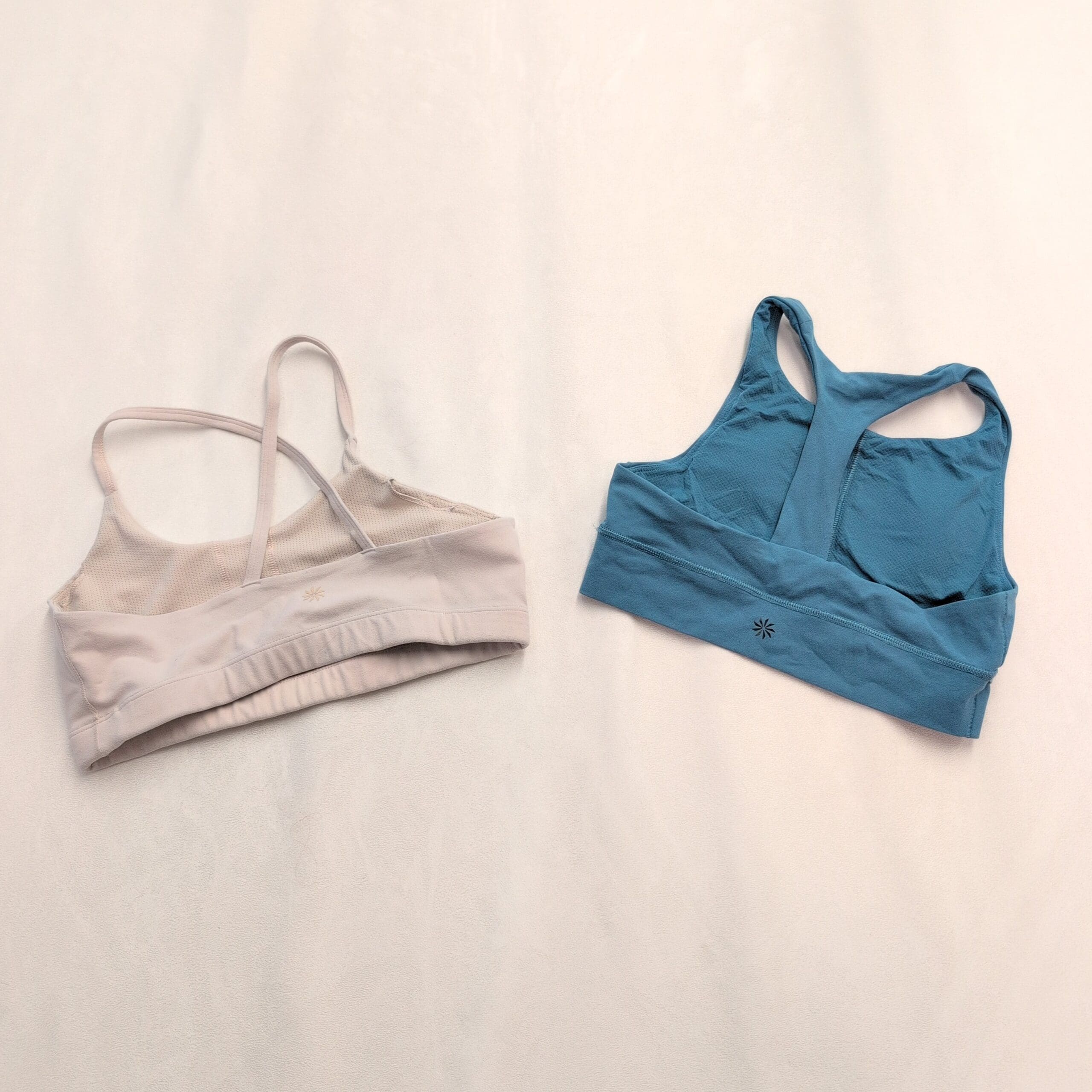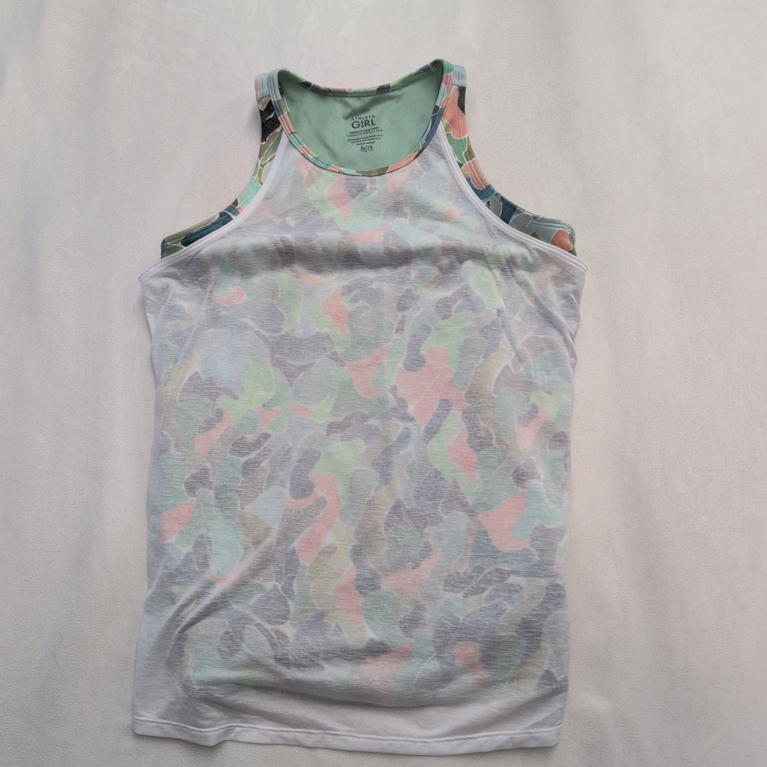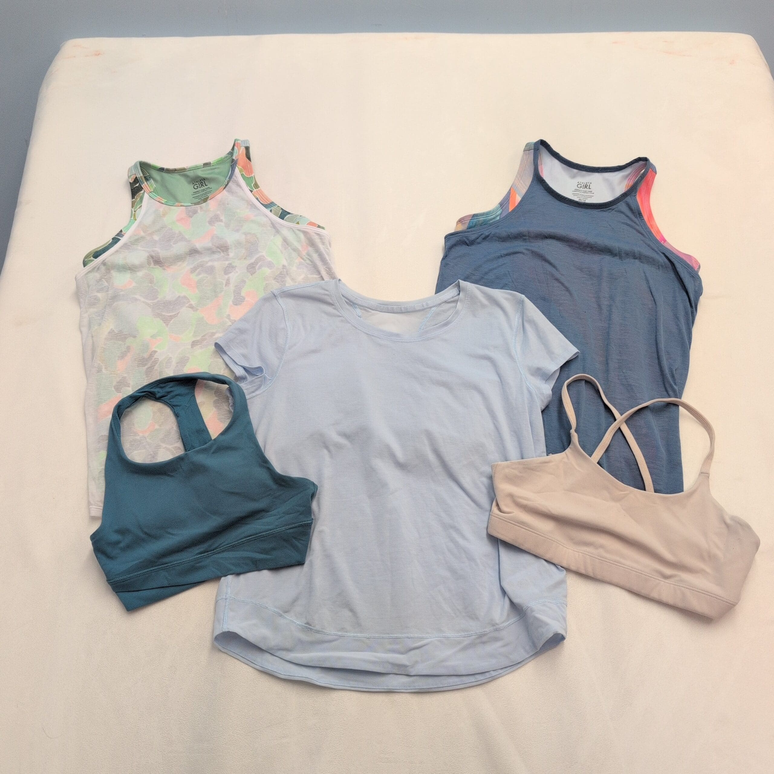 Athleta girls activewear bundle — 5 pieces in size 14 (Girls, XL). Includes two tank tops, one athletic tee and two sport bras. Colors: pastel camo racerback tank, slate blue tank with multicolor trim, light blue short-sleeve athletic tee, teal racerback sport bra and beige strappy sport bra.