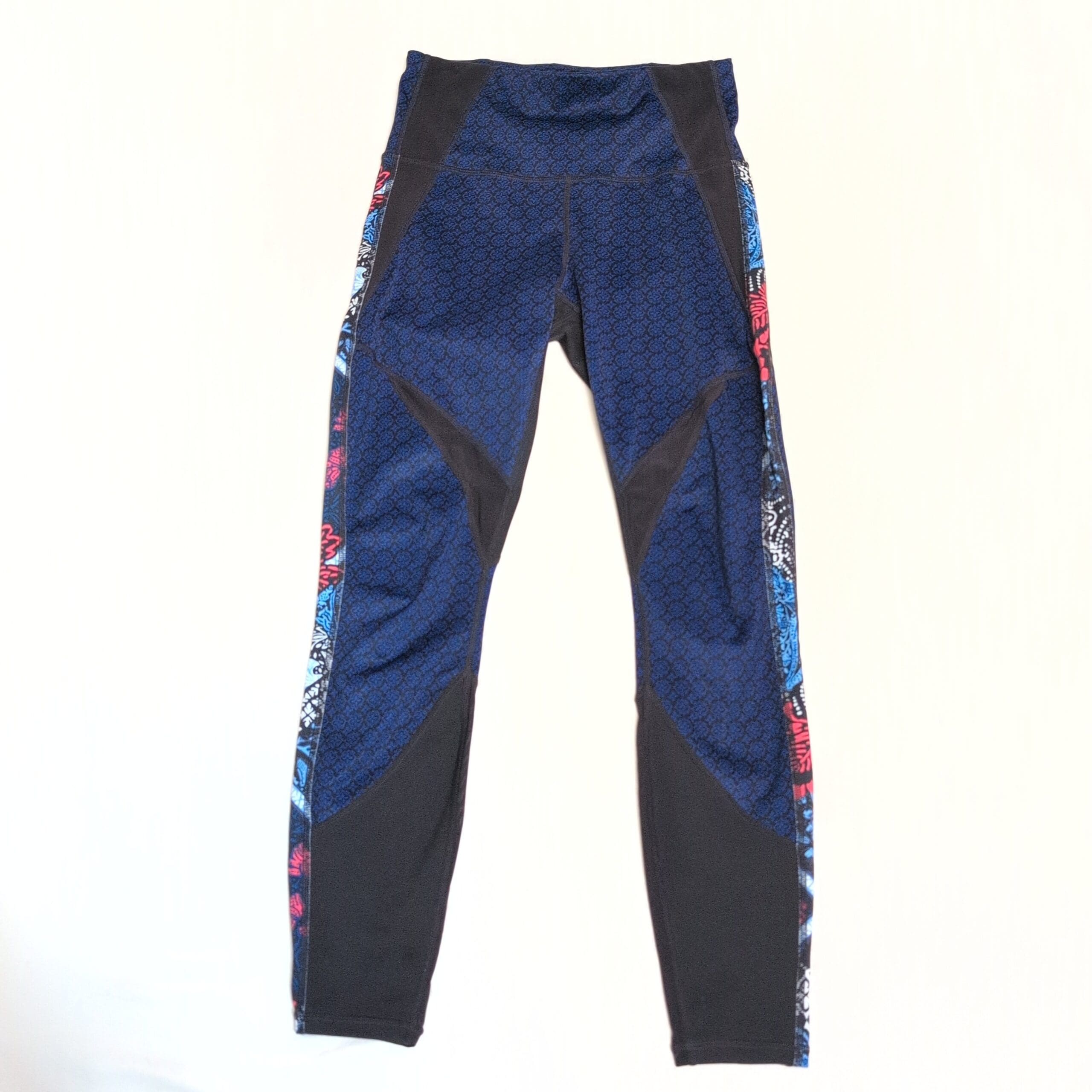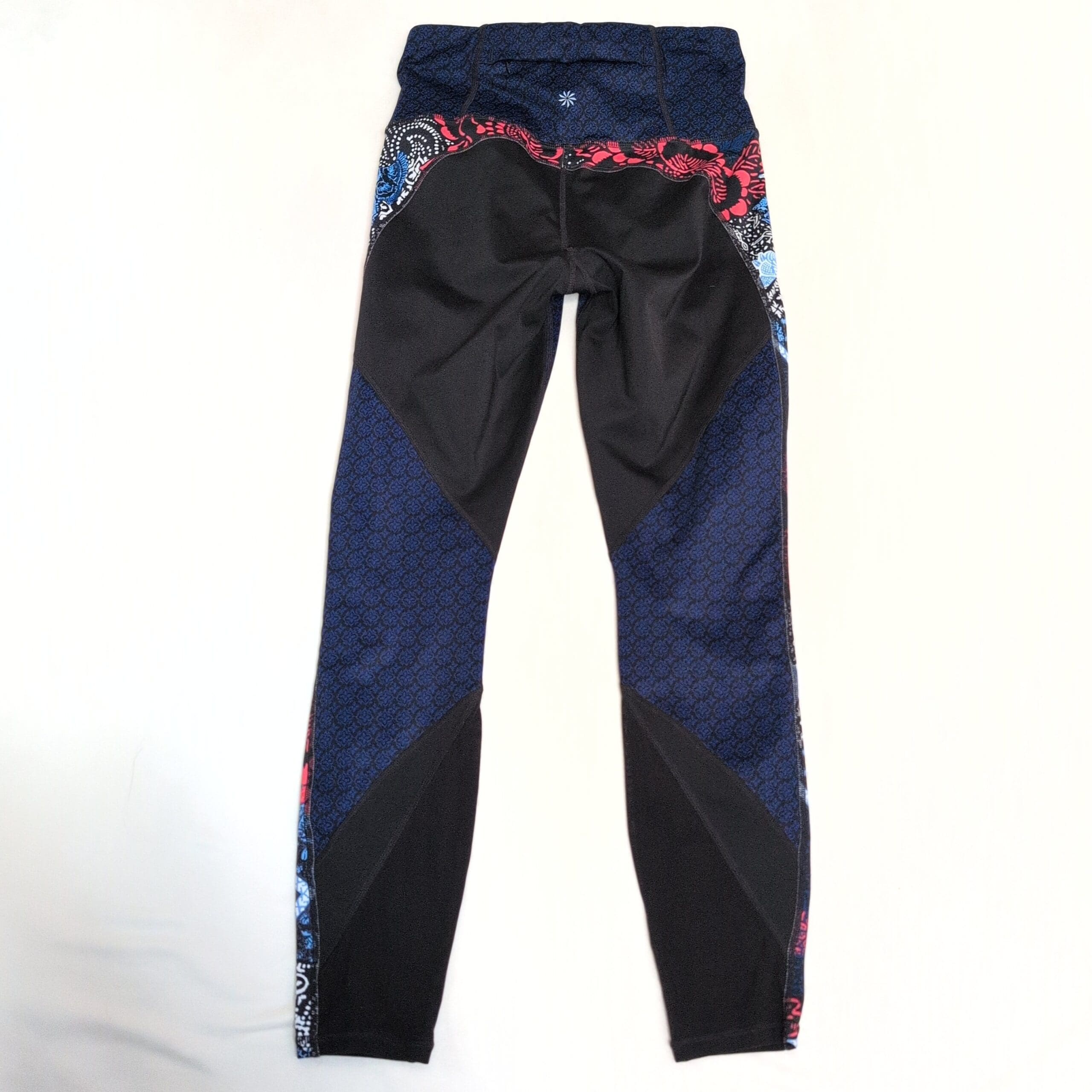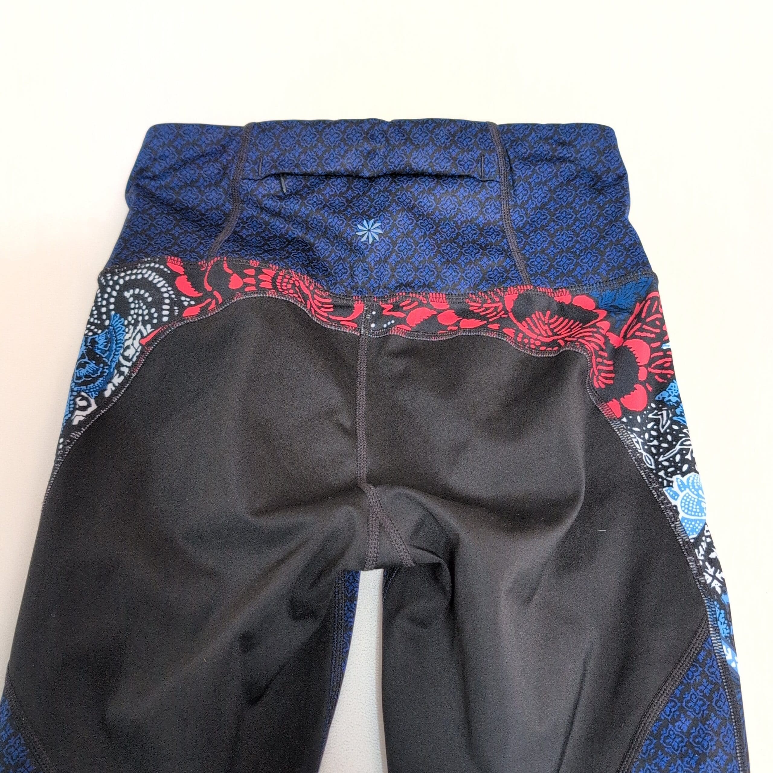 Athleta blue patterned performance leggings in size XS. Wide high-rise waistband provides support and coverage. Colorblock panels and contrasting multicolor floral side stripes add style, with functional seam lines for a flattering fit. Stretchy, breathable performance fabric ideal for workouts or everyday wear. Gently used — free of major rips, tears, stains, or flaws; typical light wear may be present.
