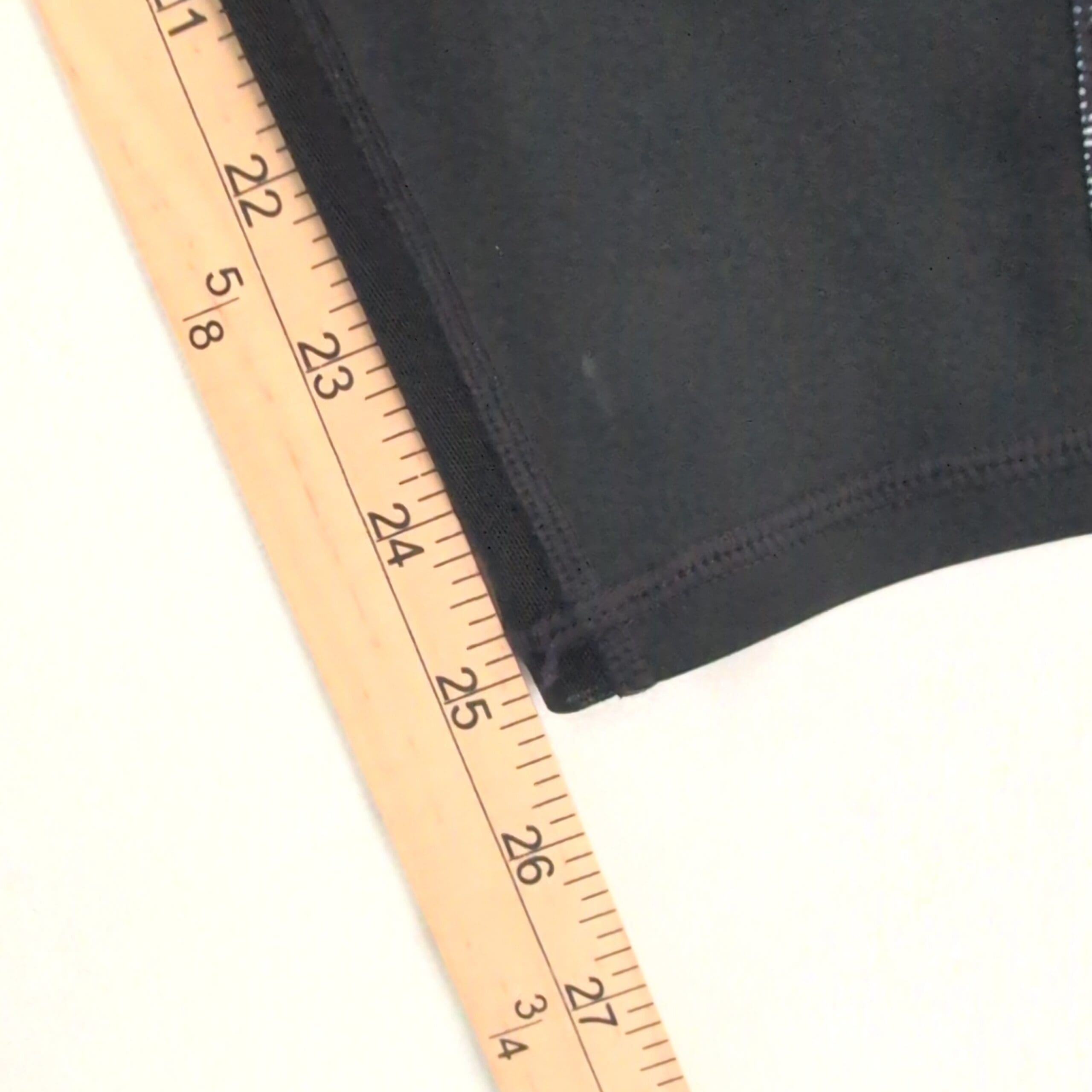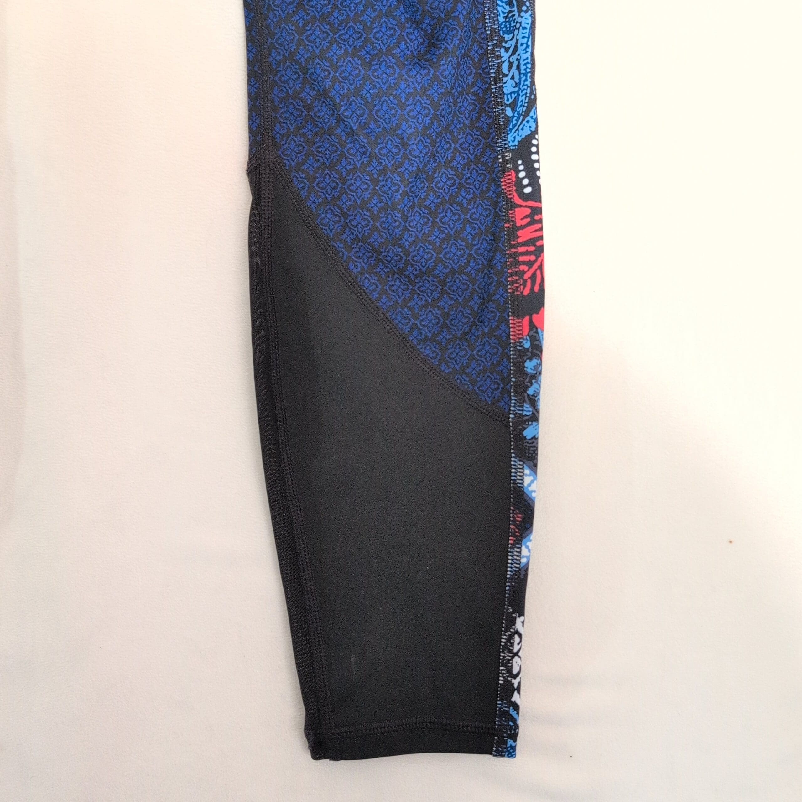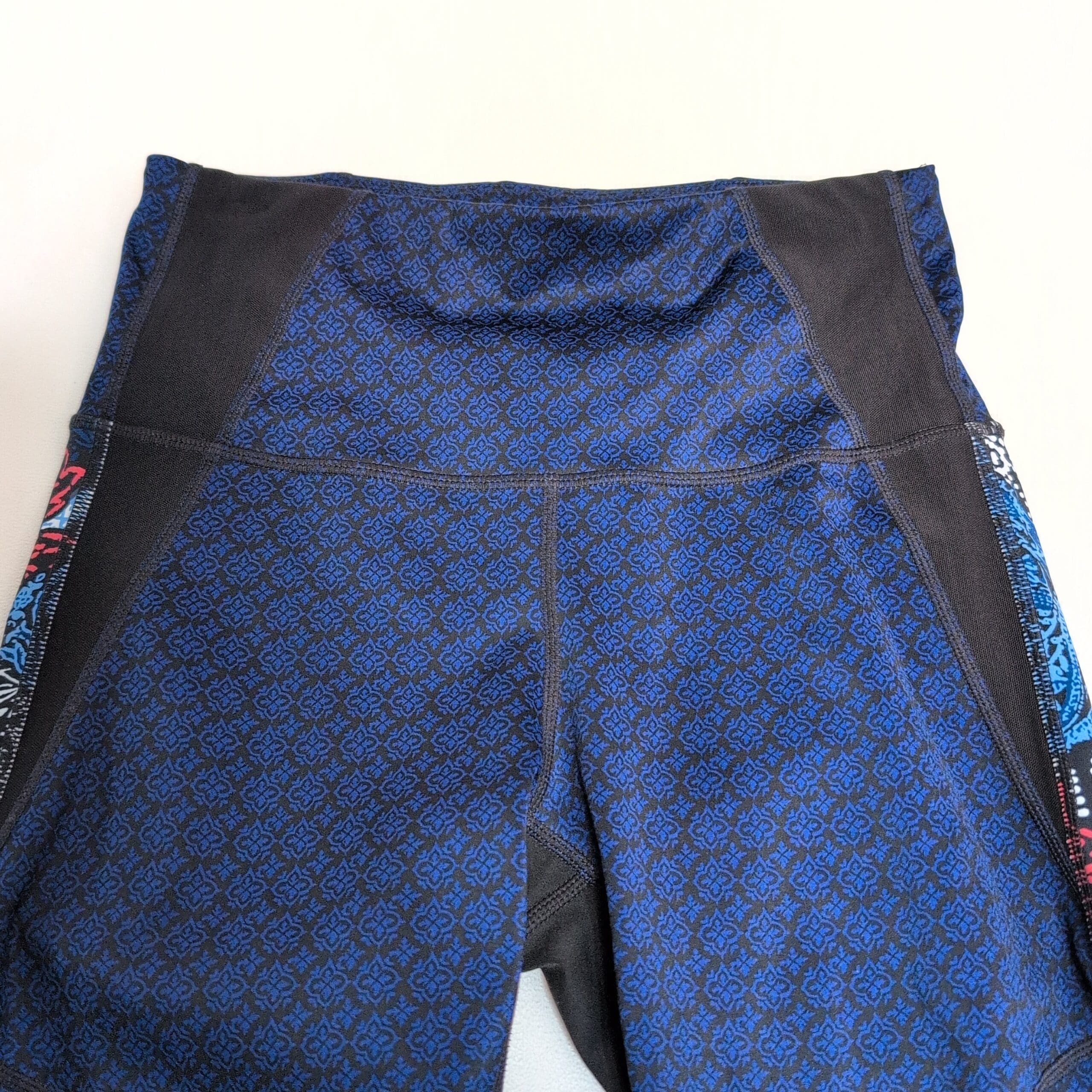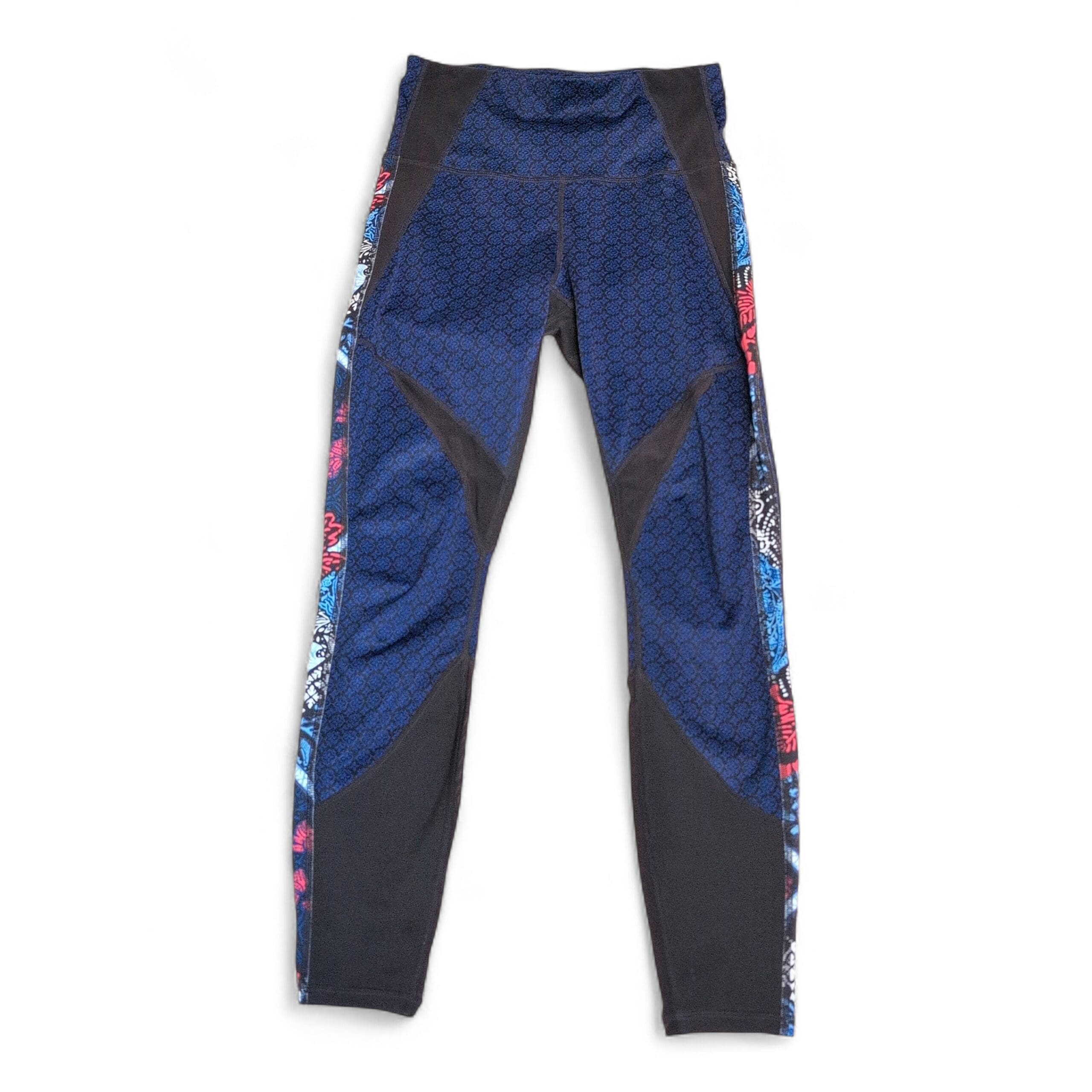 Athleta blue patterned performance leggings in size XS. Wide high-rise waistband provides support and coverage. Colorblock panels and contrasting multicolor floral side stripes add style, with functional seam lines for a flattering fit. Stretchy, breathable performance fabric ideal for workouts or everyday wear. Gently used — free of major rips, tears, stains, or flaws; typical light wear may be present.