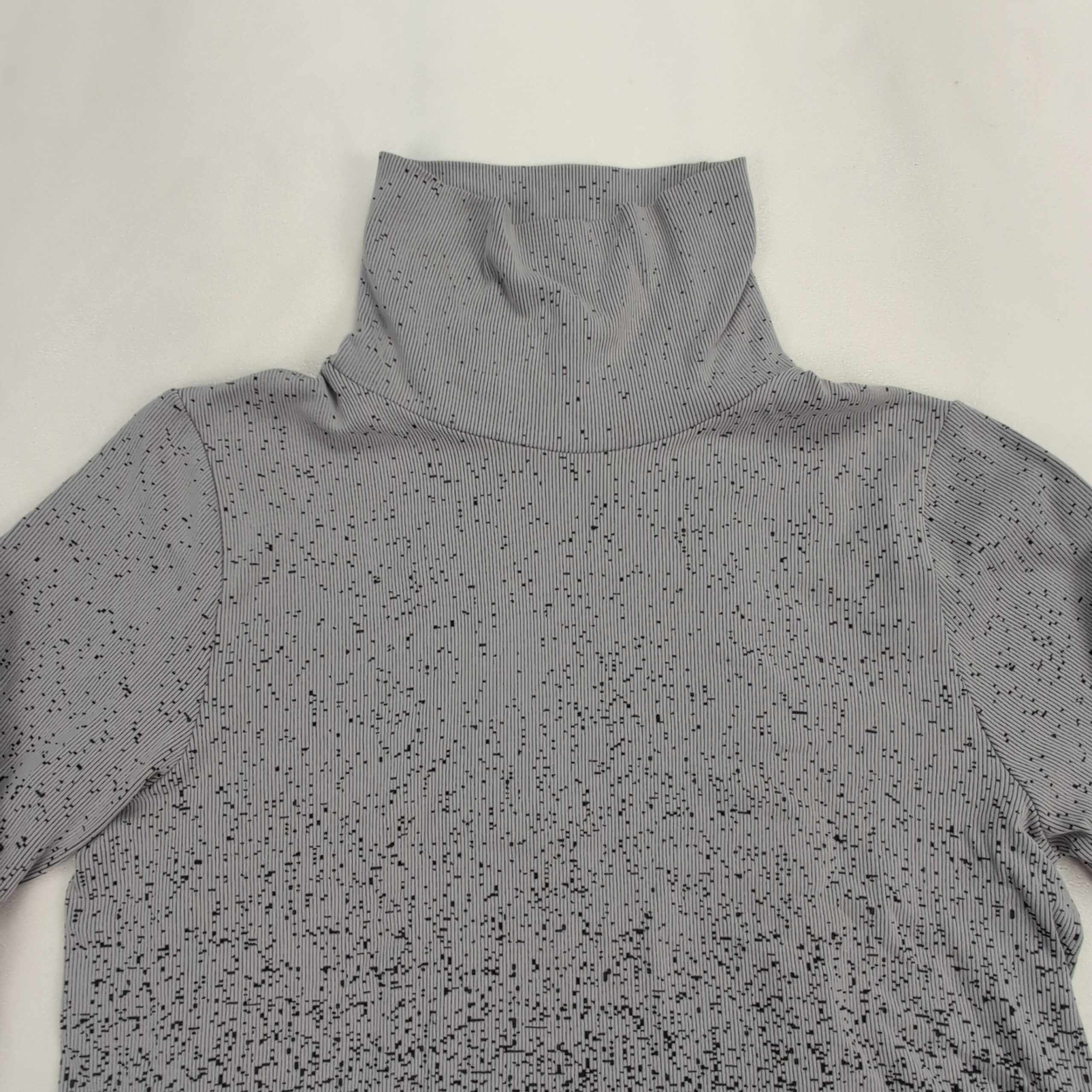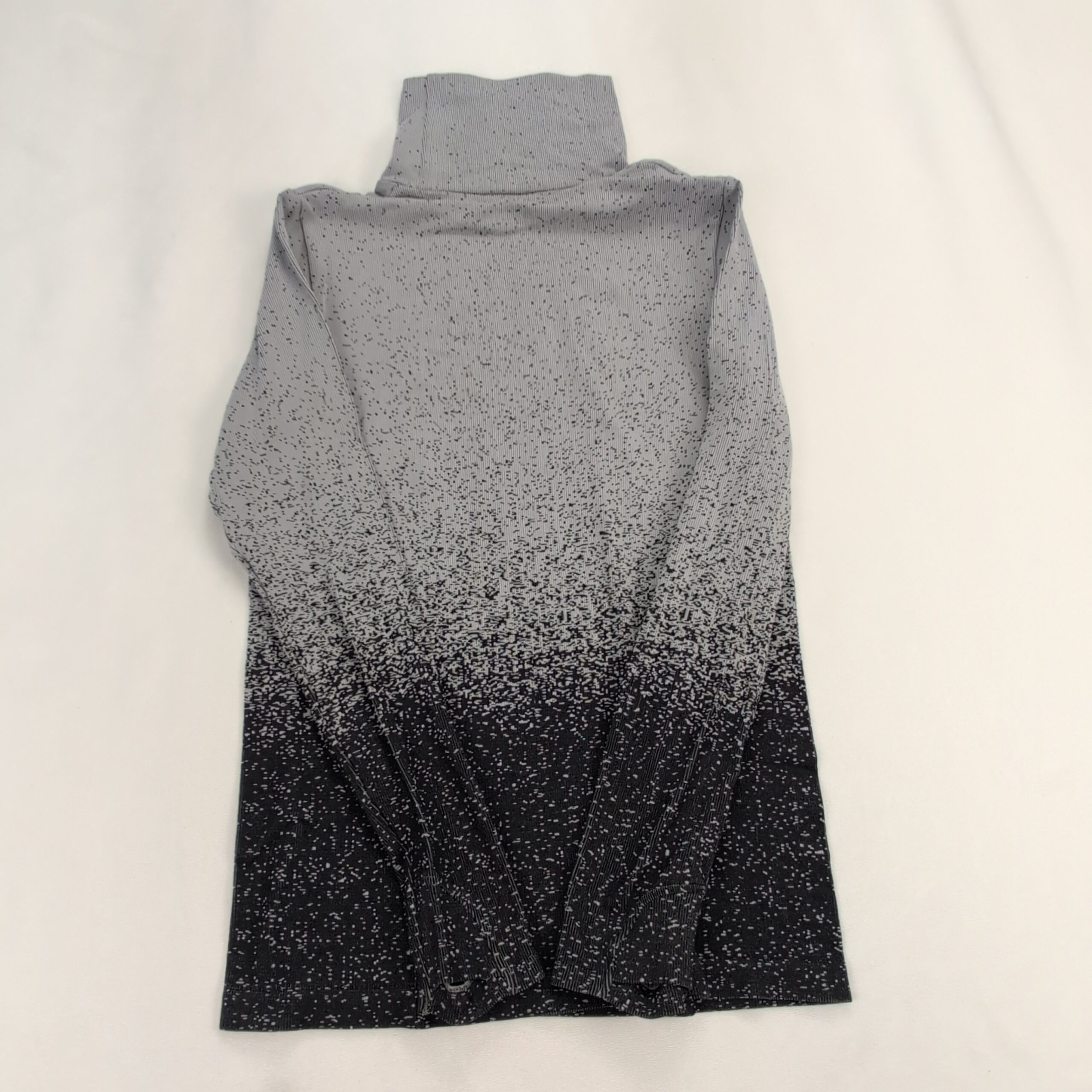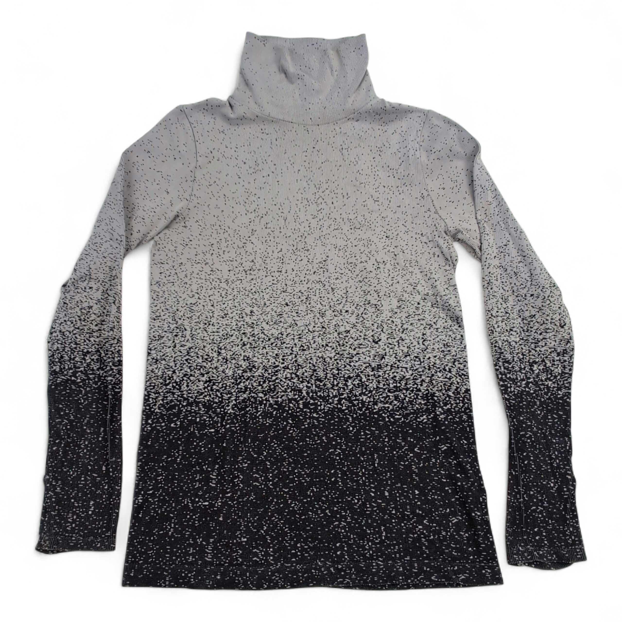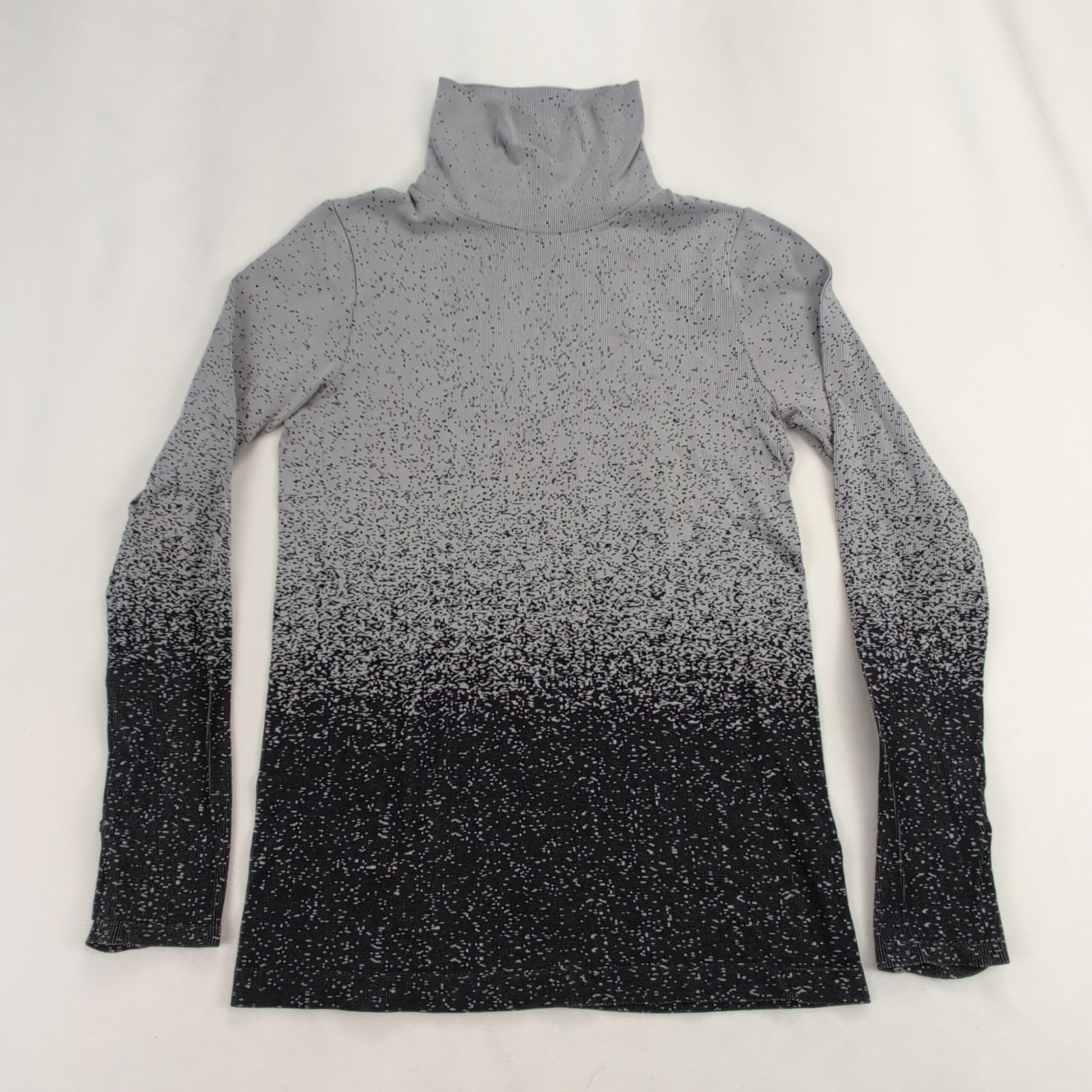 Athleta women’s turtleneck sweater in size L. Lightweight knit with an ombré speckled pattern that fades from light gray at the top to black at the hem. Tall, cozy turtleneck and long sleeves create a sleek, fitted silhouette—great for layering or worn alone for a polished casual look. Excellent used condition: free of major rips, tears, stains, or flaws; shows only typical gentle wear consistent with normal use. Fabric content and exact measurements not provided.