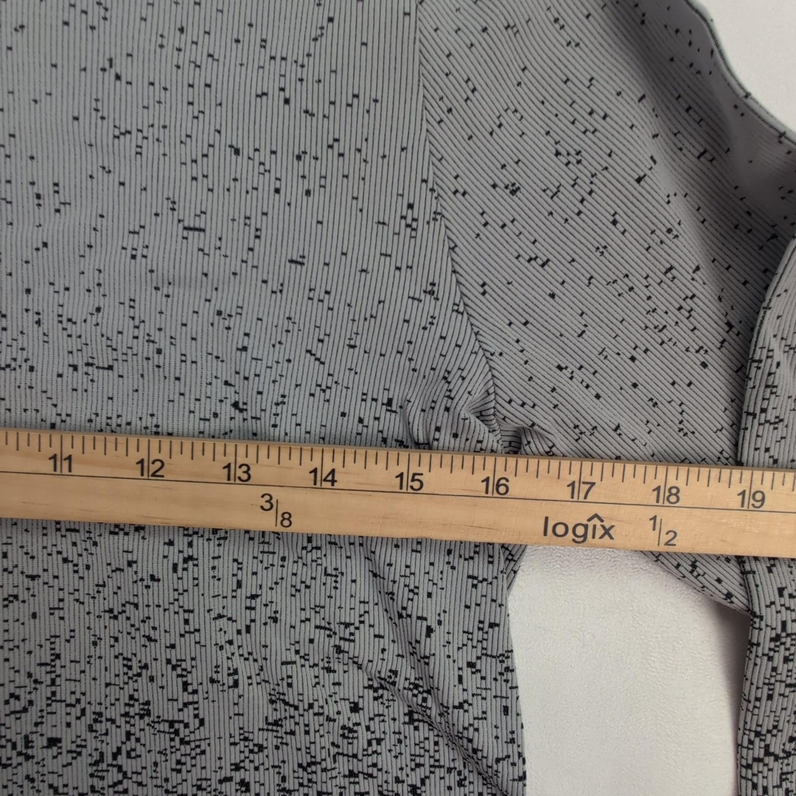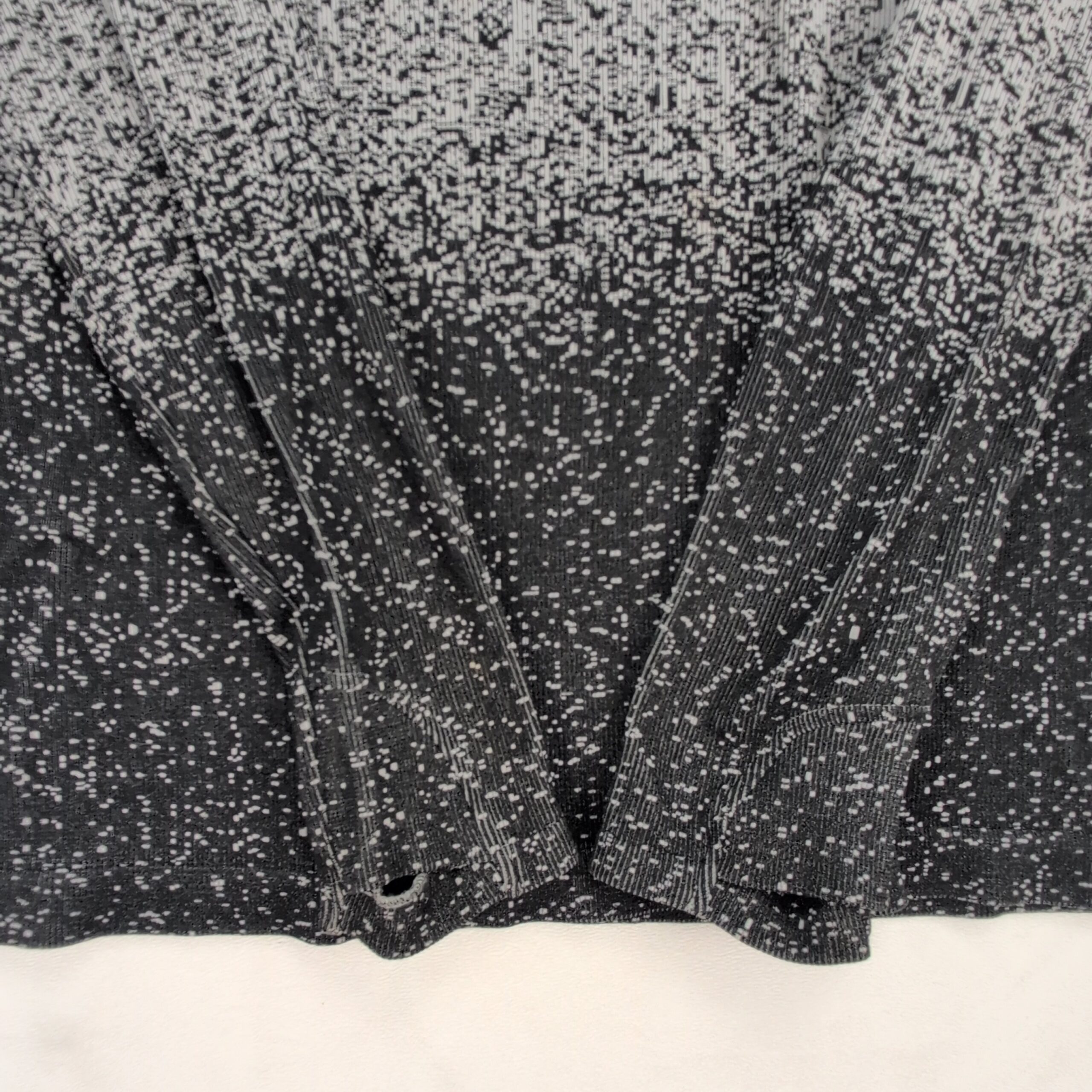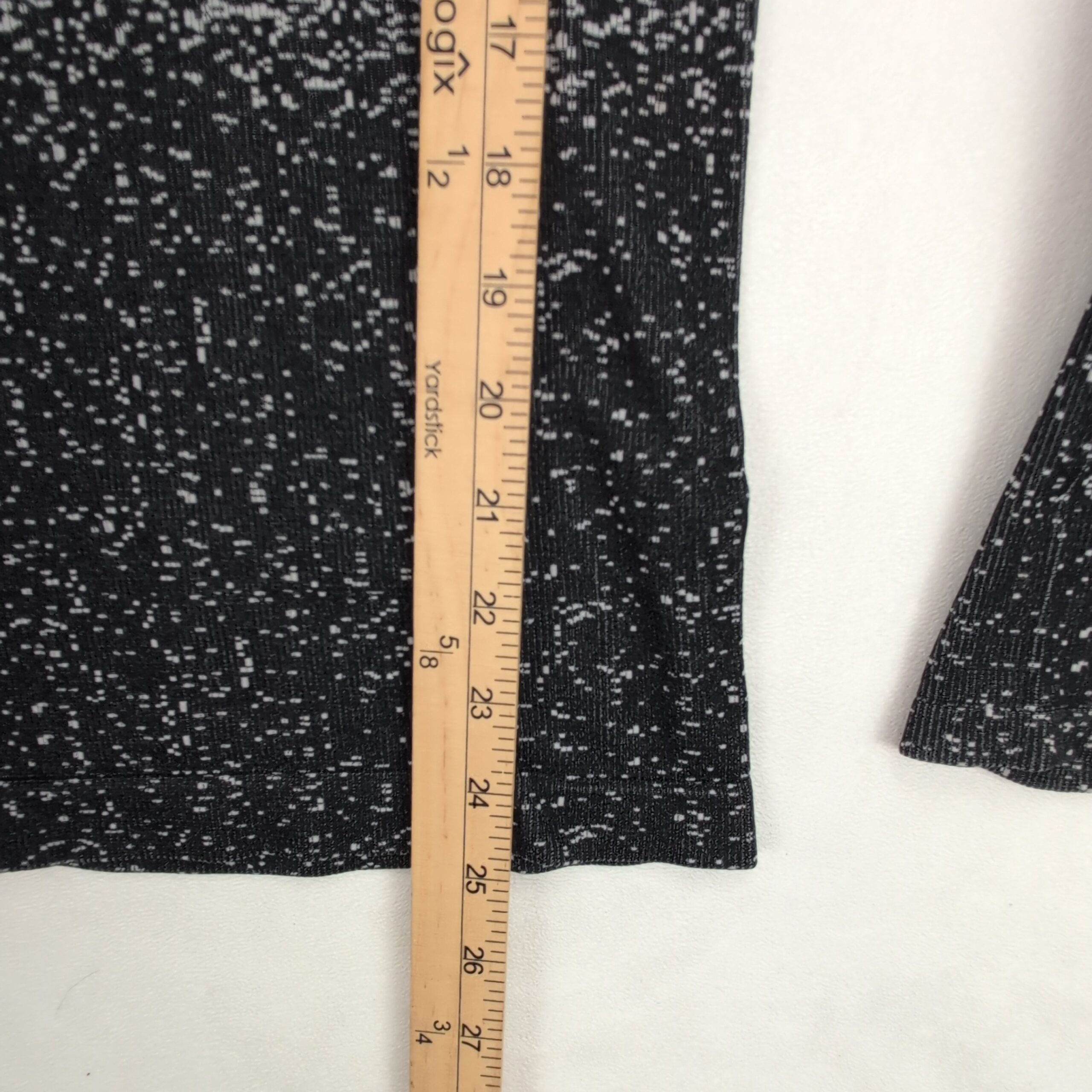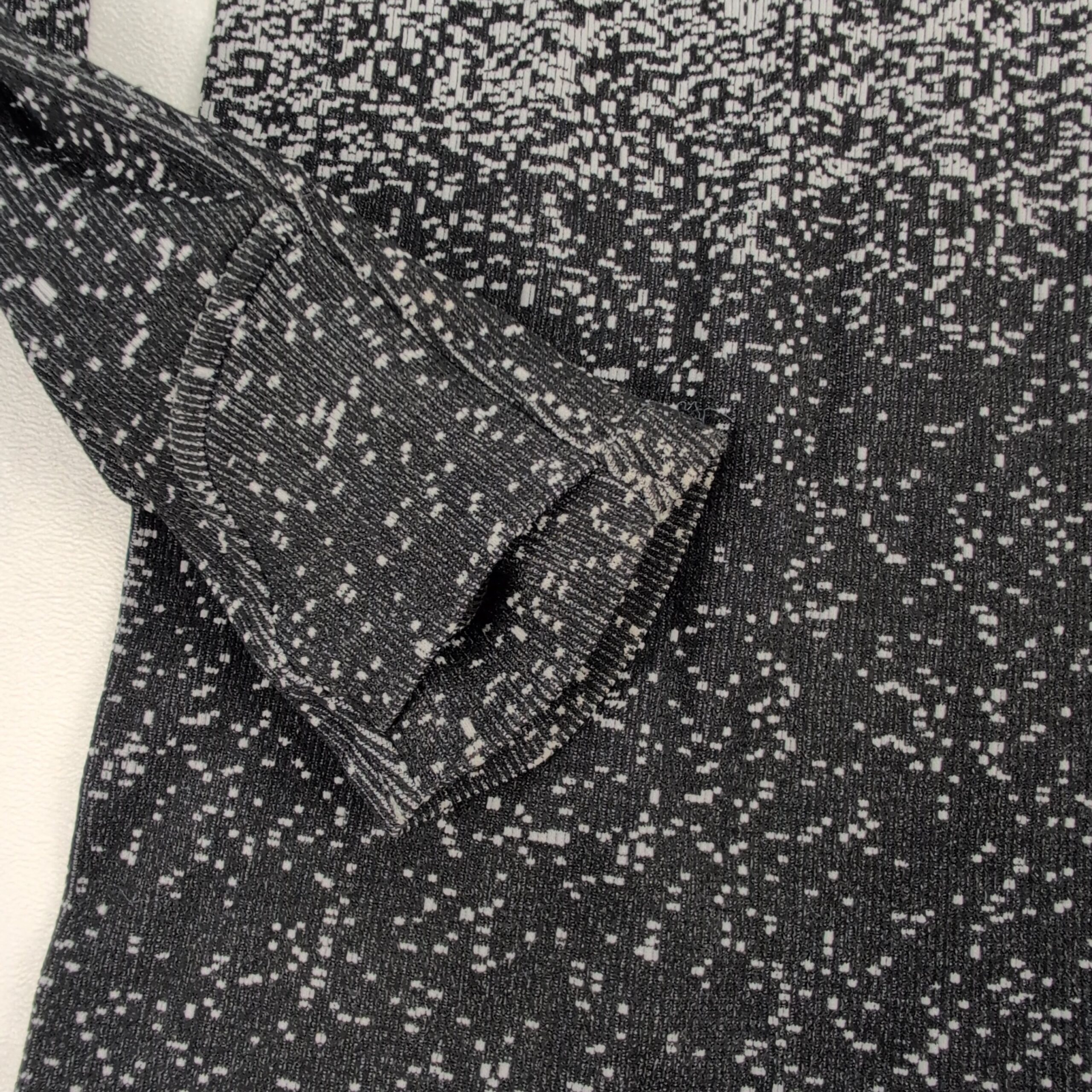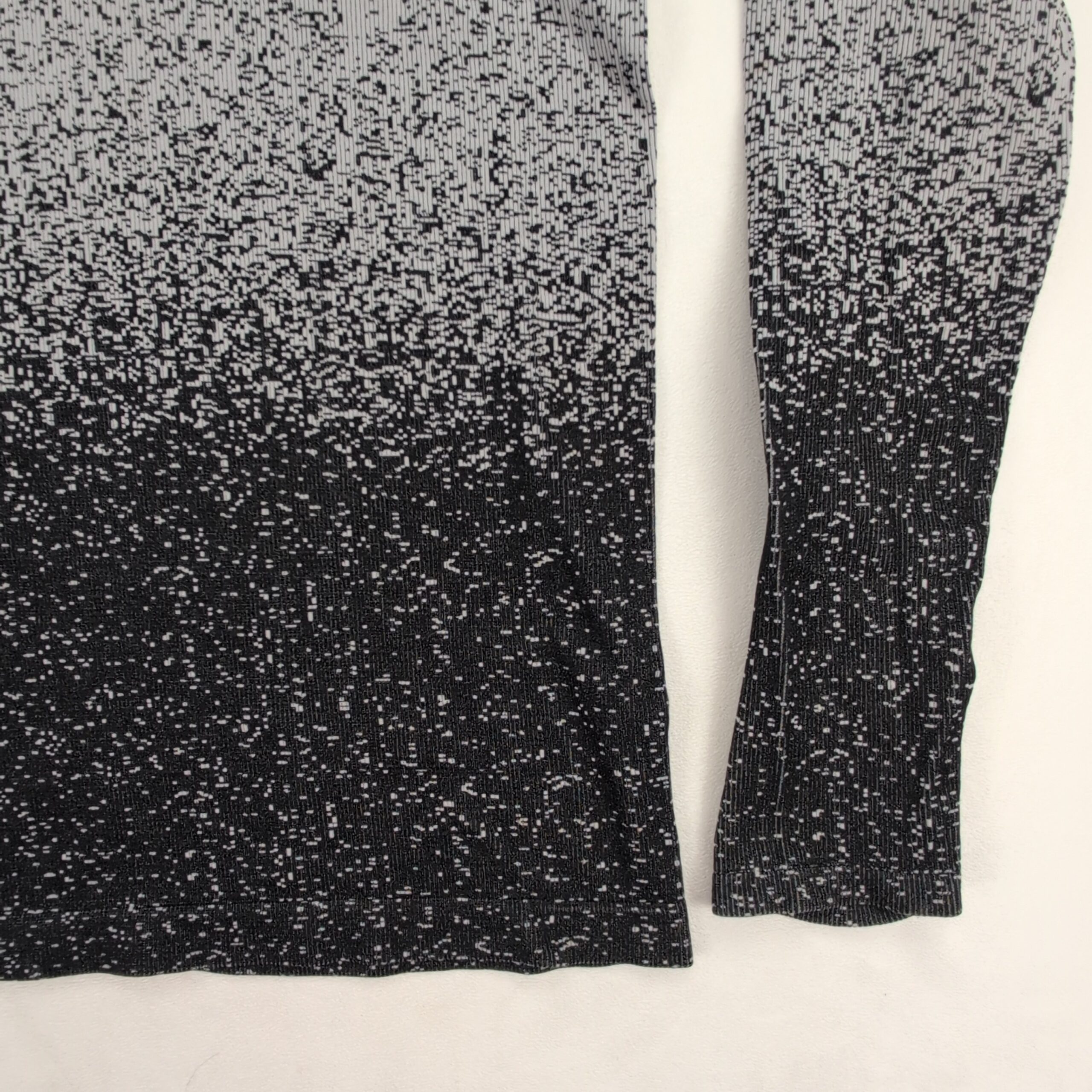 Athleta women’s turtleneck sweater in size L. Lightweight knit with an ombré speckled pattern that fades from light gray at the top to black at the hem. Tall, cozy turtleneck and long sleeves create a sleek, fitted silhouette—great for layering or worn alone for a polished casual look. Excellent used condition: free of major rips, tears, stains, or flaws; shows only typical gentle wear consistent with normal use. Fabric content and exact measurements not provided.