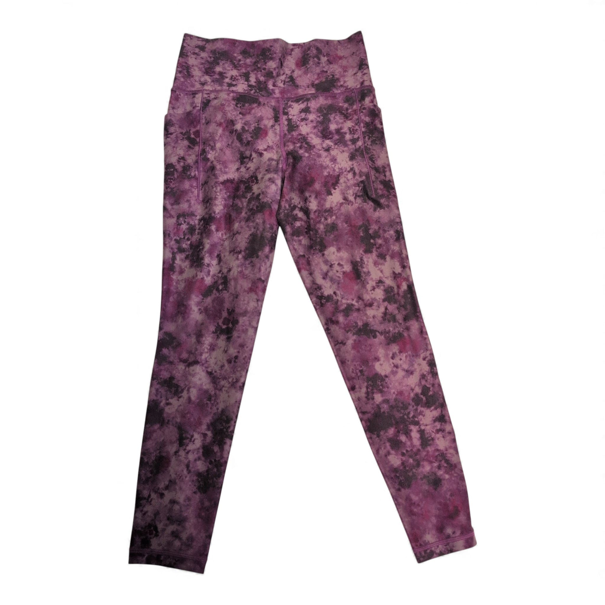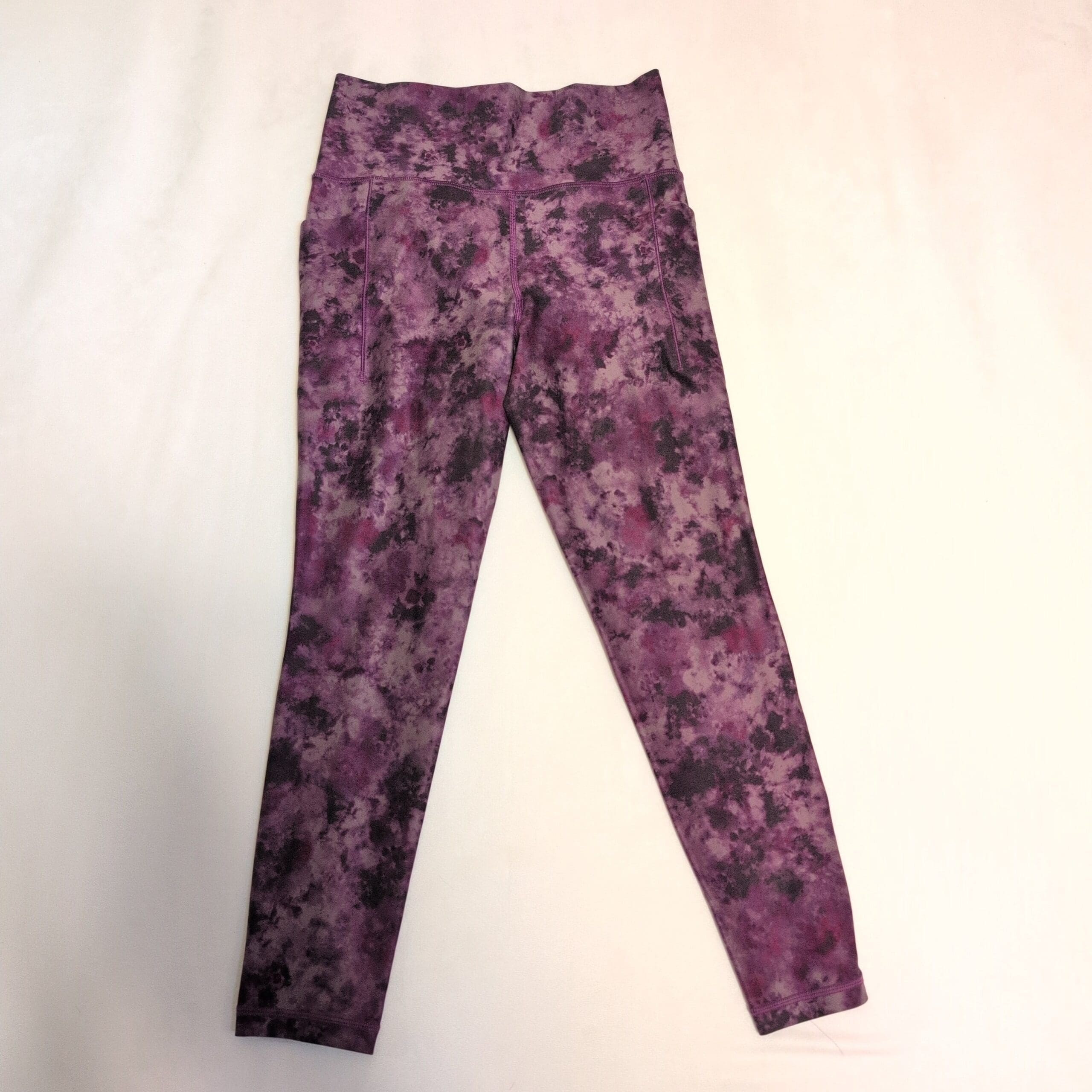 Purple abstract-print Athleta leggings in size S. Full-length, high-rise silhouette with a wide supportive waistband and two side pockets for small essentials. Smooth, stretchy performance fabric with moisture-wicking, four-way stretch for yoga, studio, or everyday wear. True to size with a secure, flattering fit.