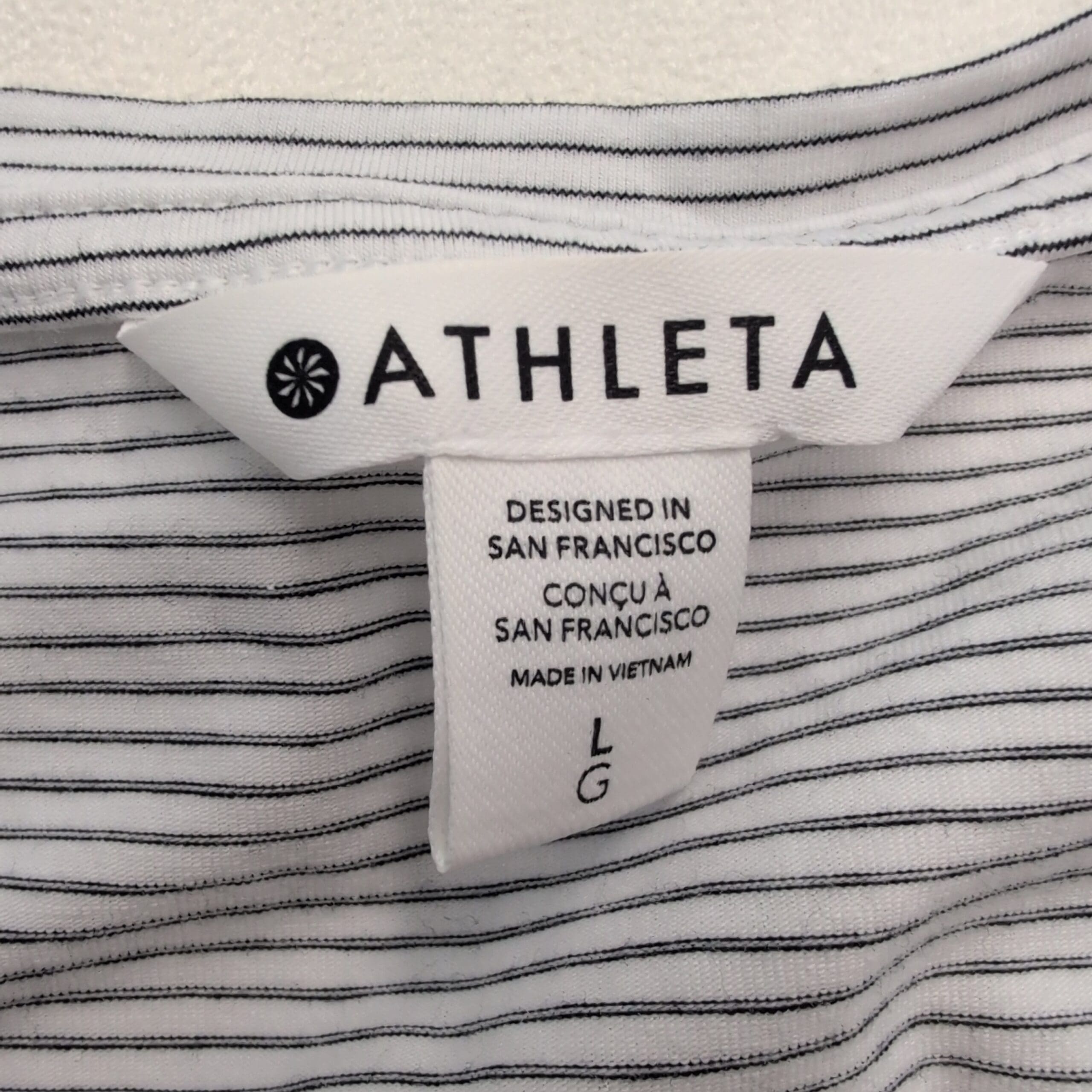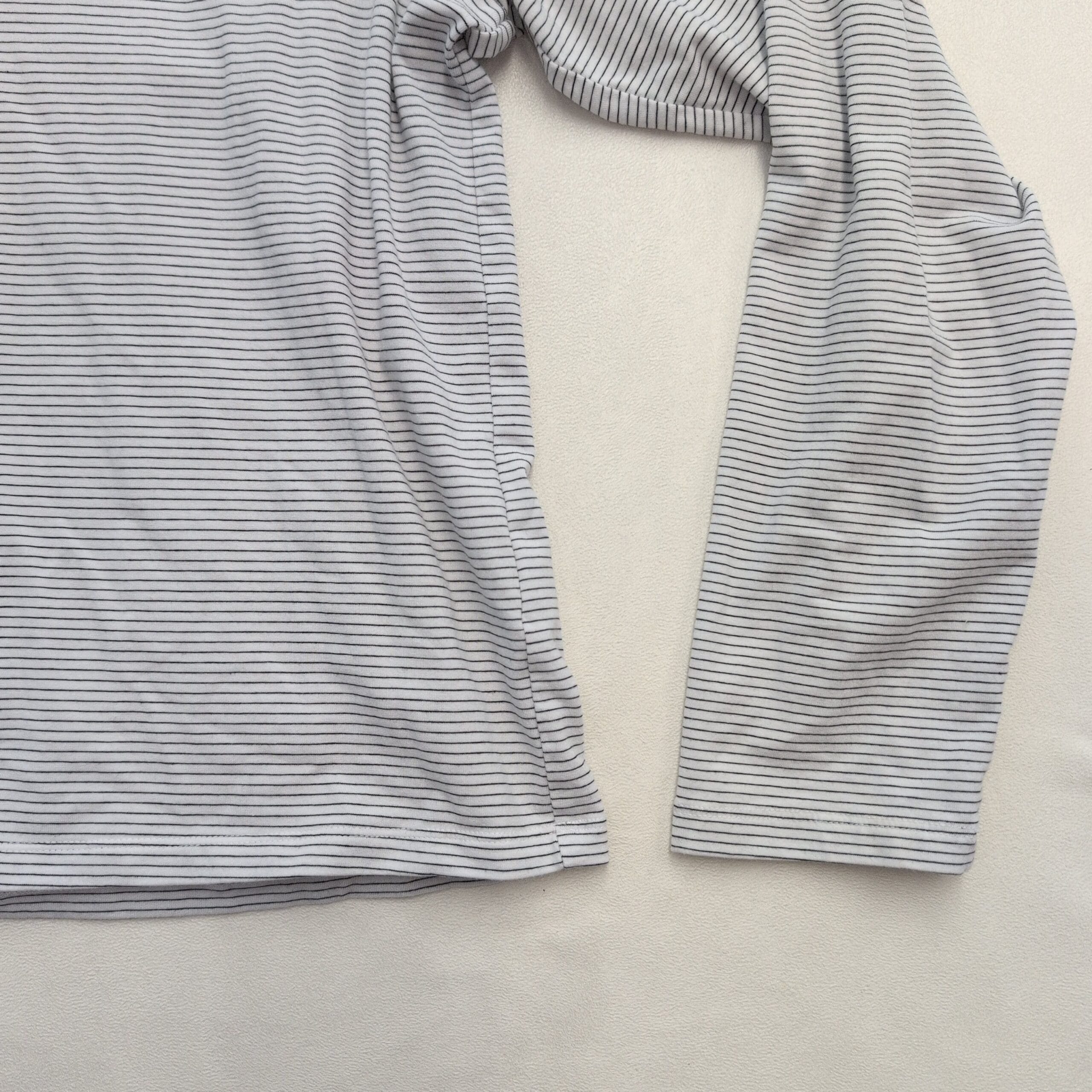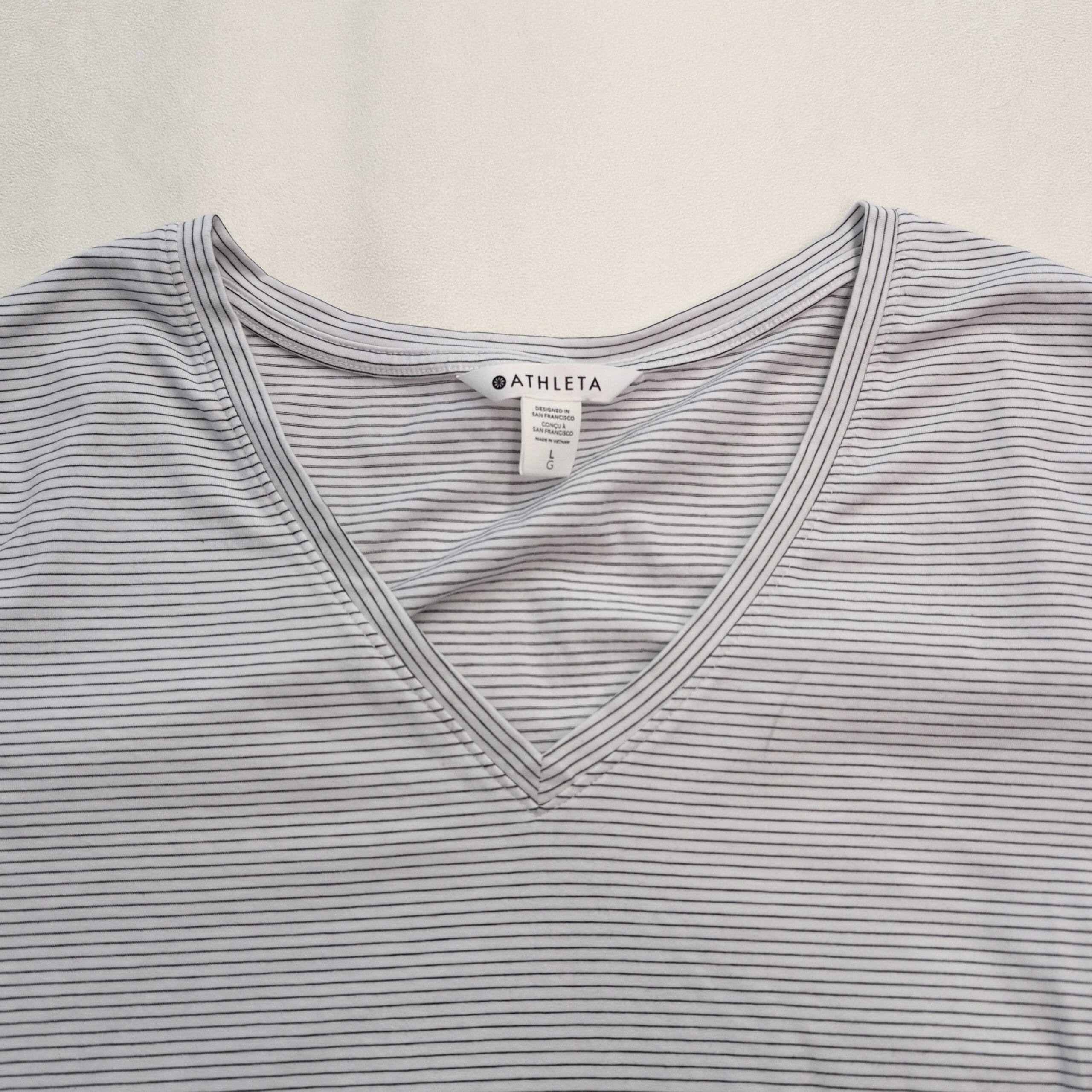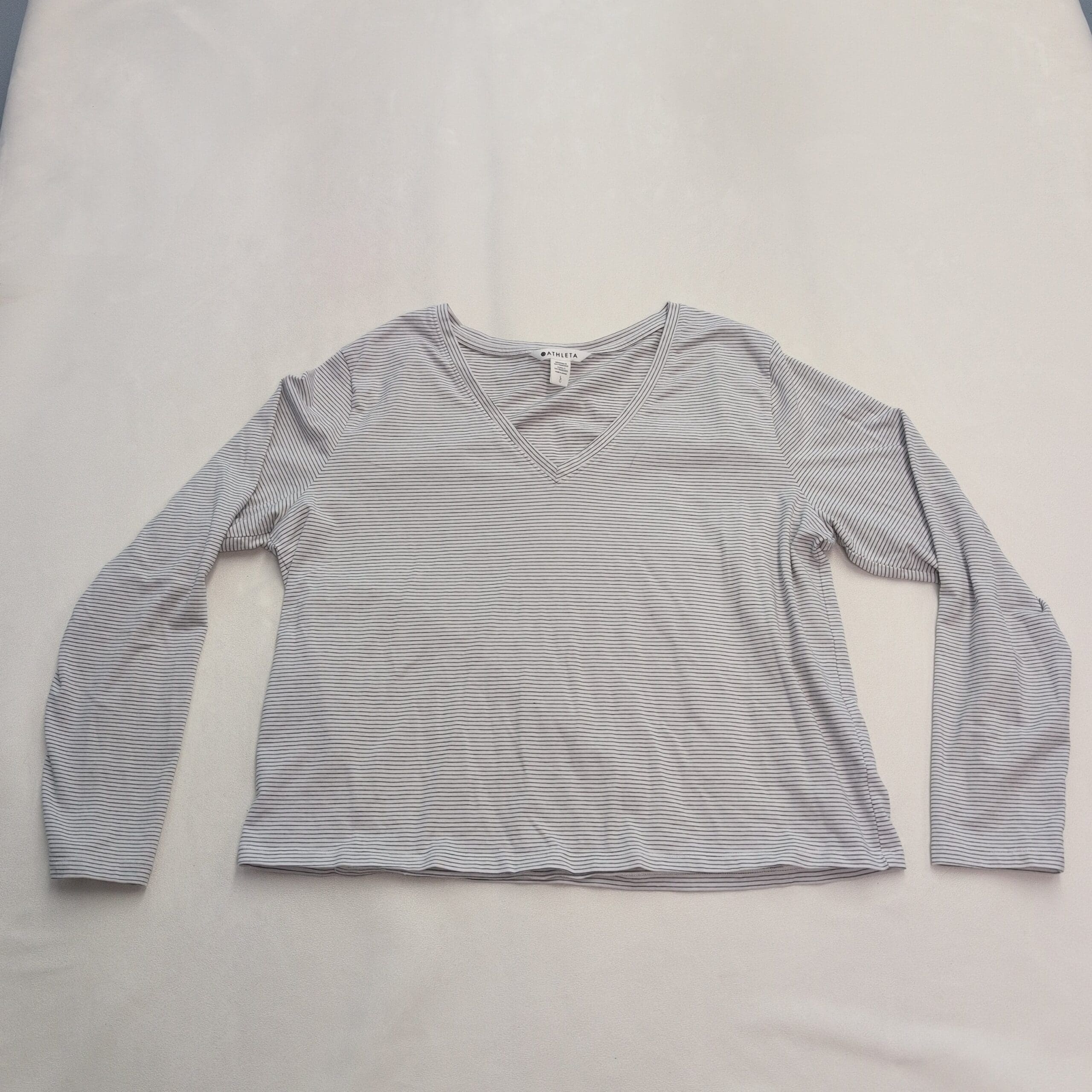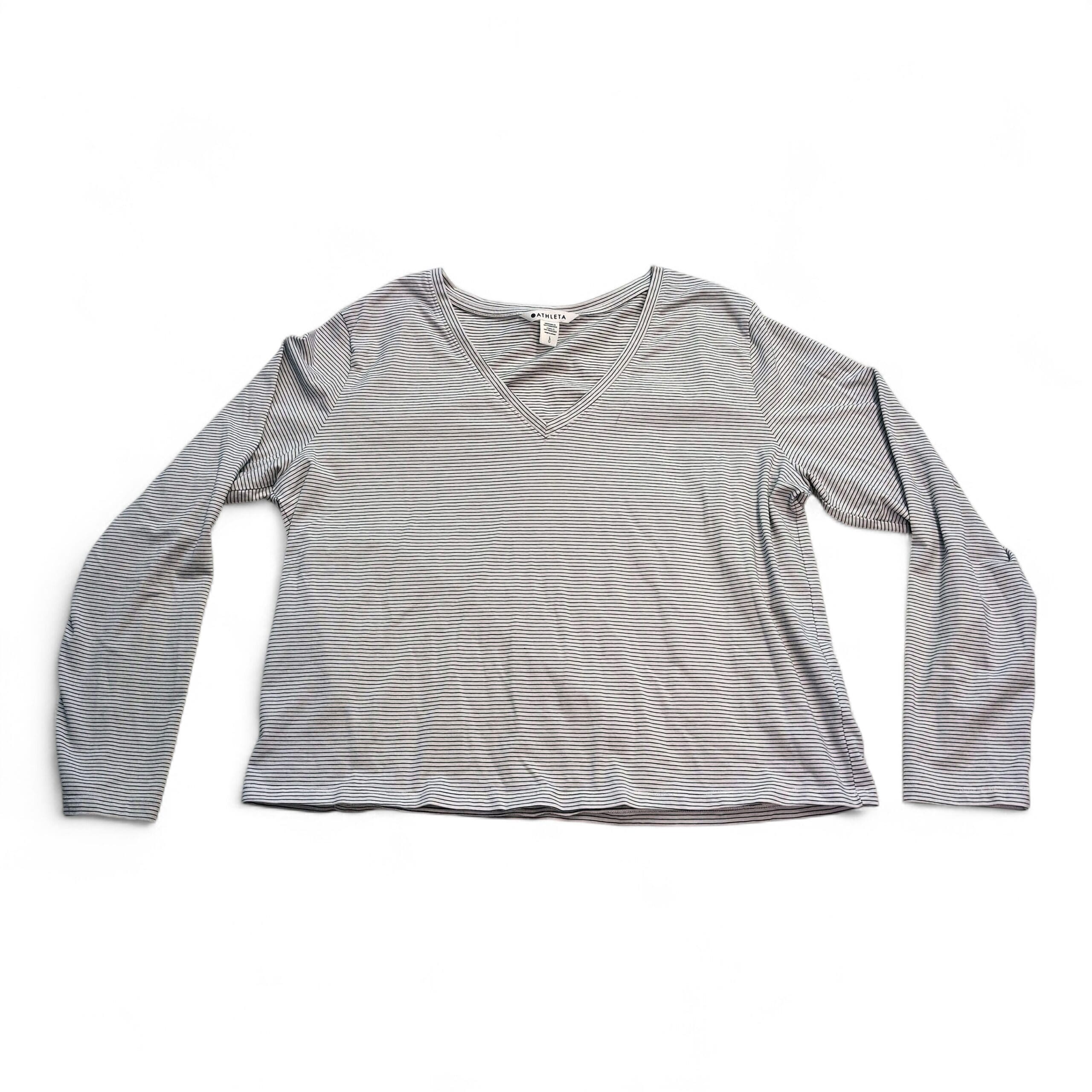 Classic Athleta long-sleeve V-neck tee in white with subtle thin gray stripes. Size L with a relaxed, slightly boxy fit—lightweight, soft knit that’s ideal for layering or wearing on its own. Clean neckline and hems; simple, versatile silhouette works for casual days or travel. Gently used and free of major rips, tears, stains, or flaws; typical light wear may be present. See photos for condition details.