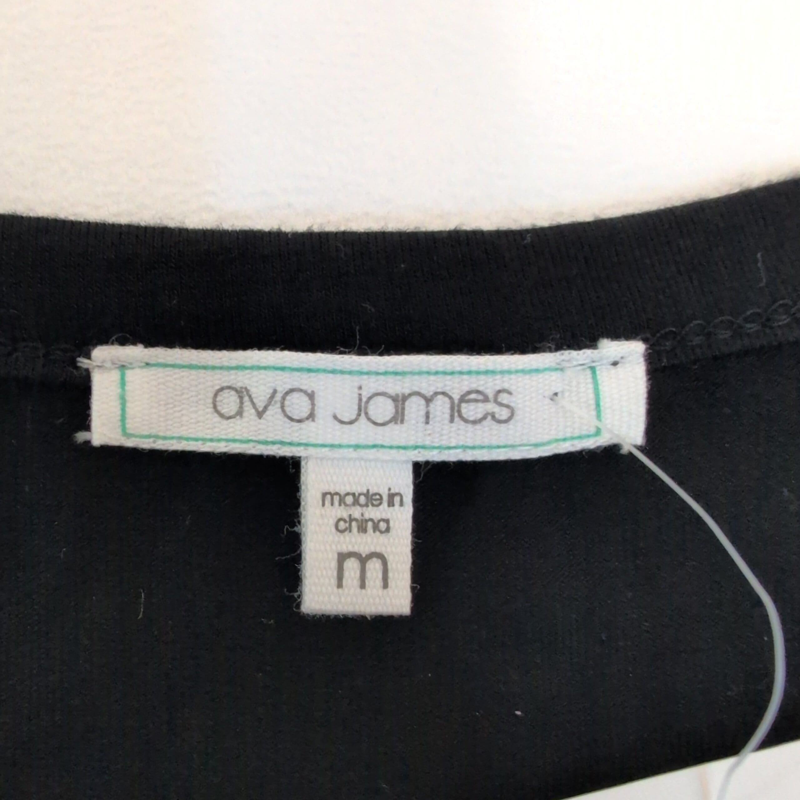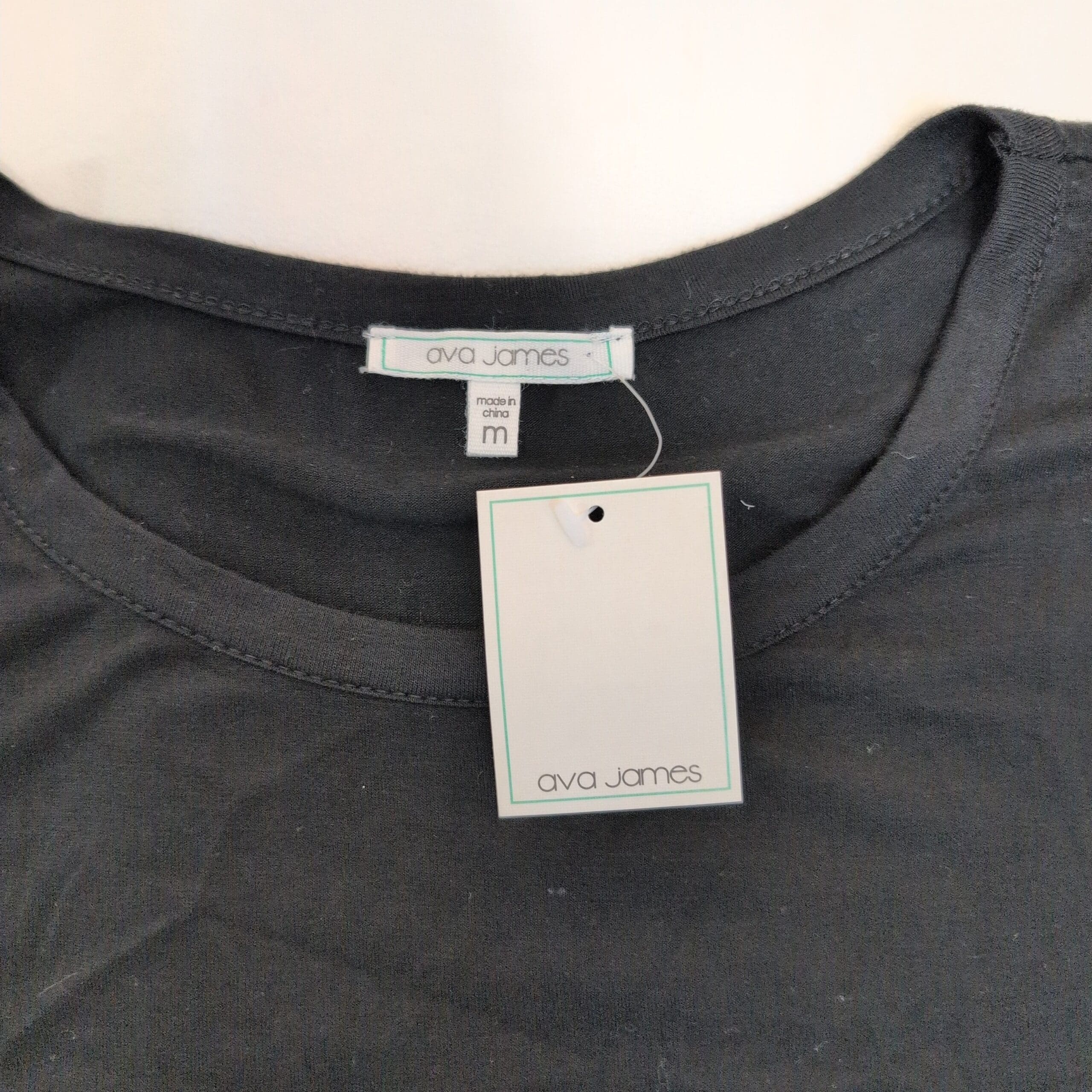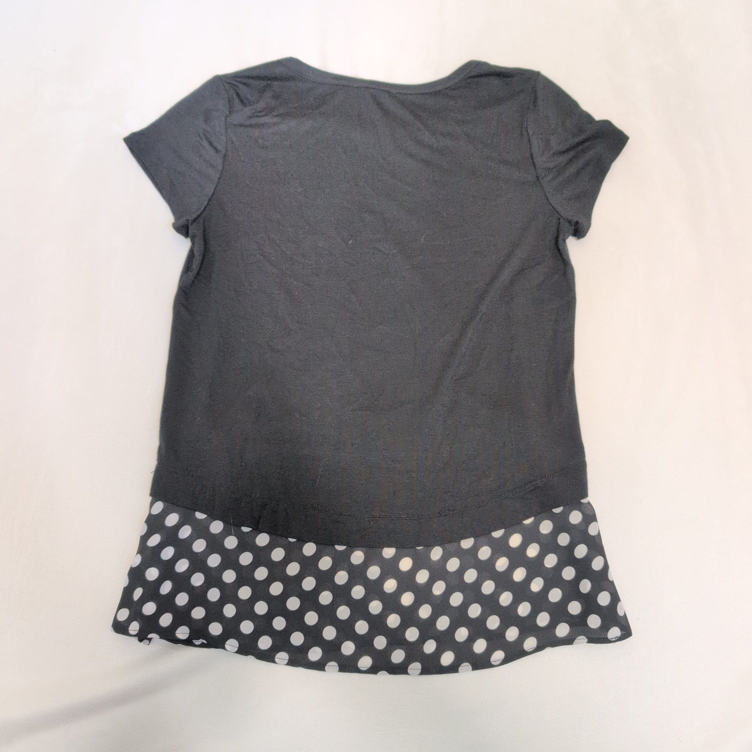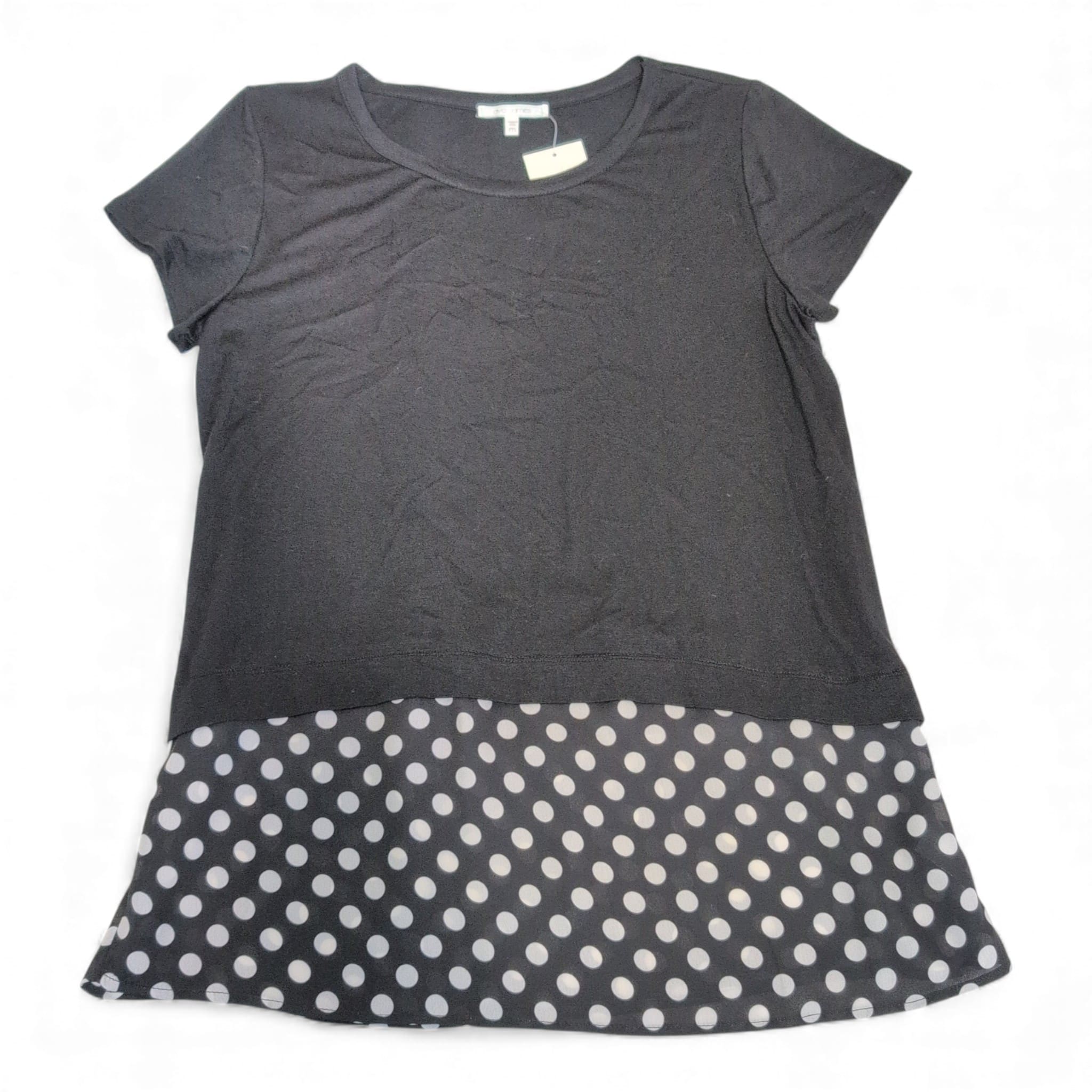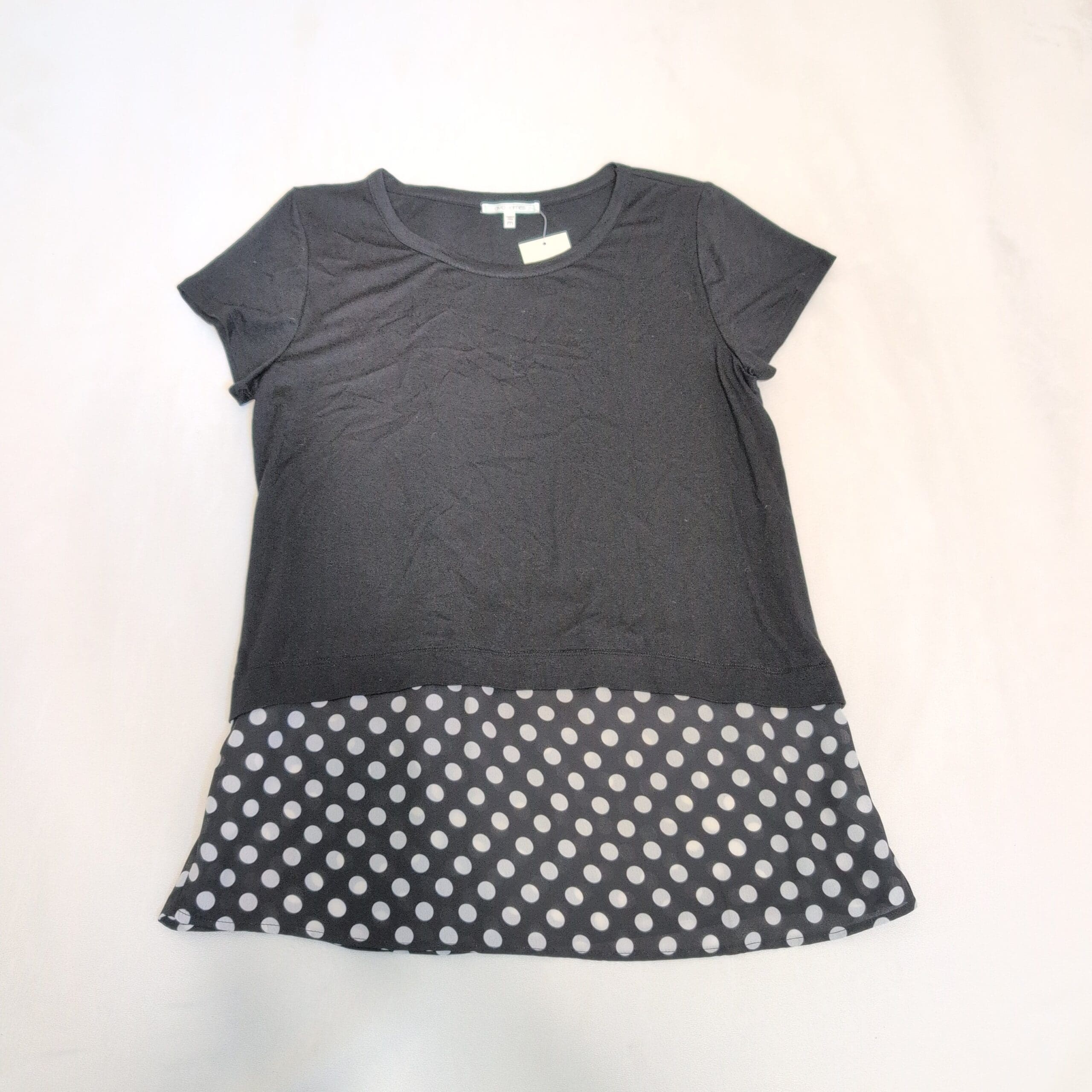 Ava James black short sleeve women’s top in size M. Classic crew neckline and comfortable knit body with a flirty black-and-white polka dot chiffon-look layered hem for added movement and style. Versatile piece that pairs well with jeans, skirts, or work pants. Gently used — in good wearable condition; please review photos for details and any minor wear.