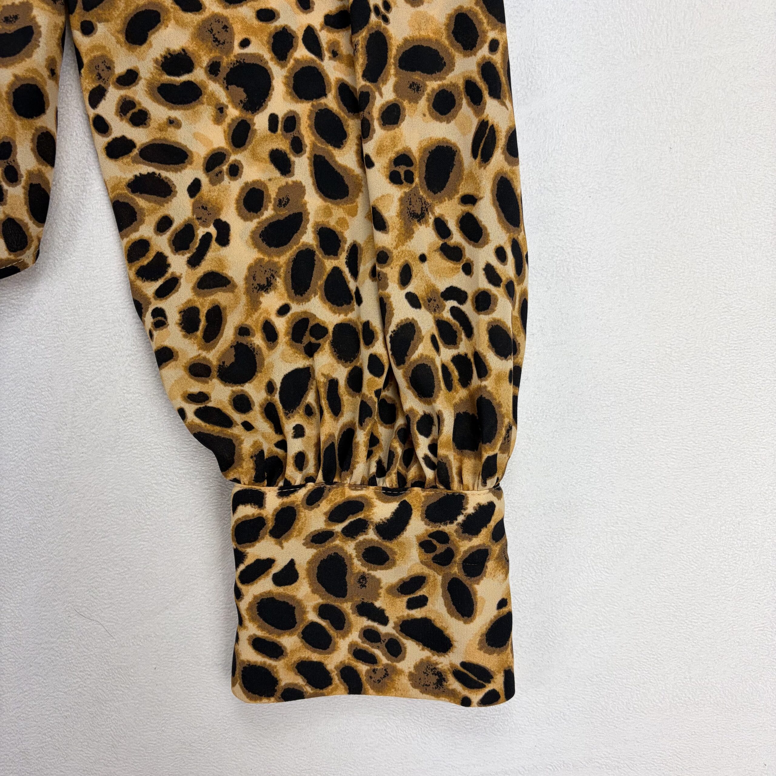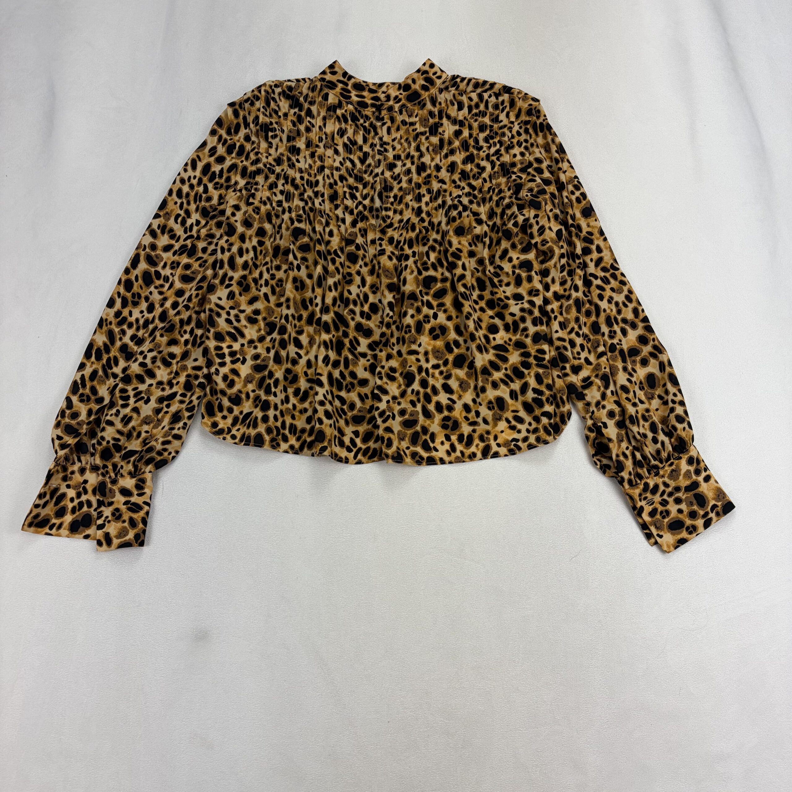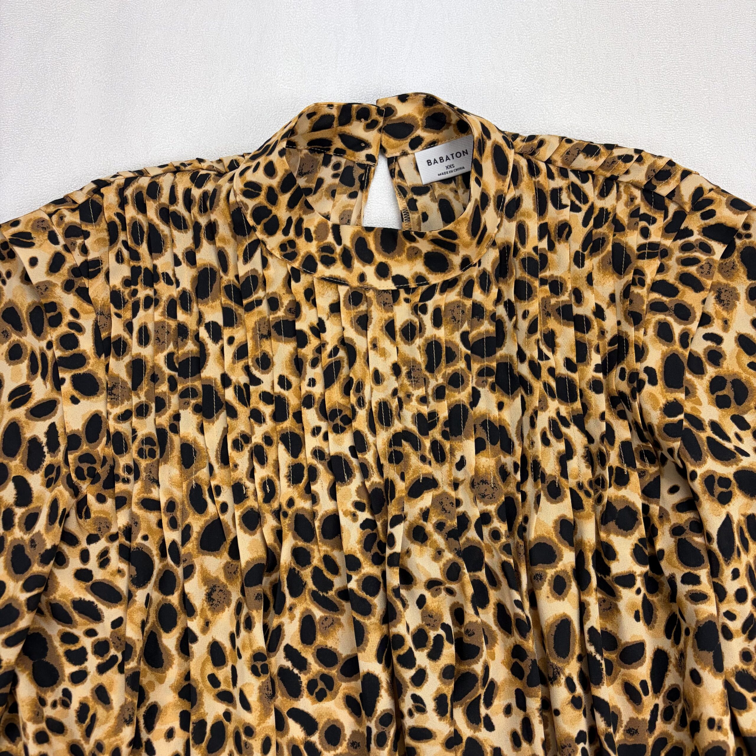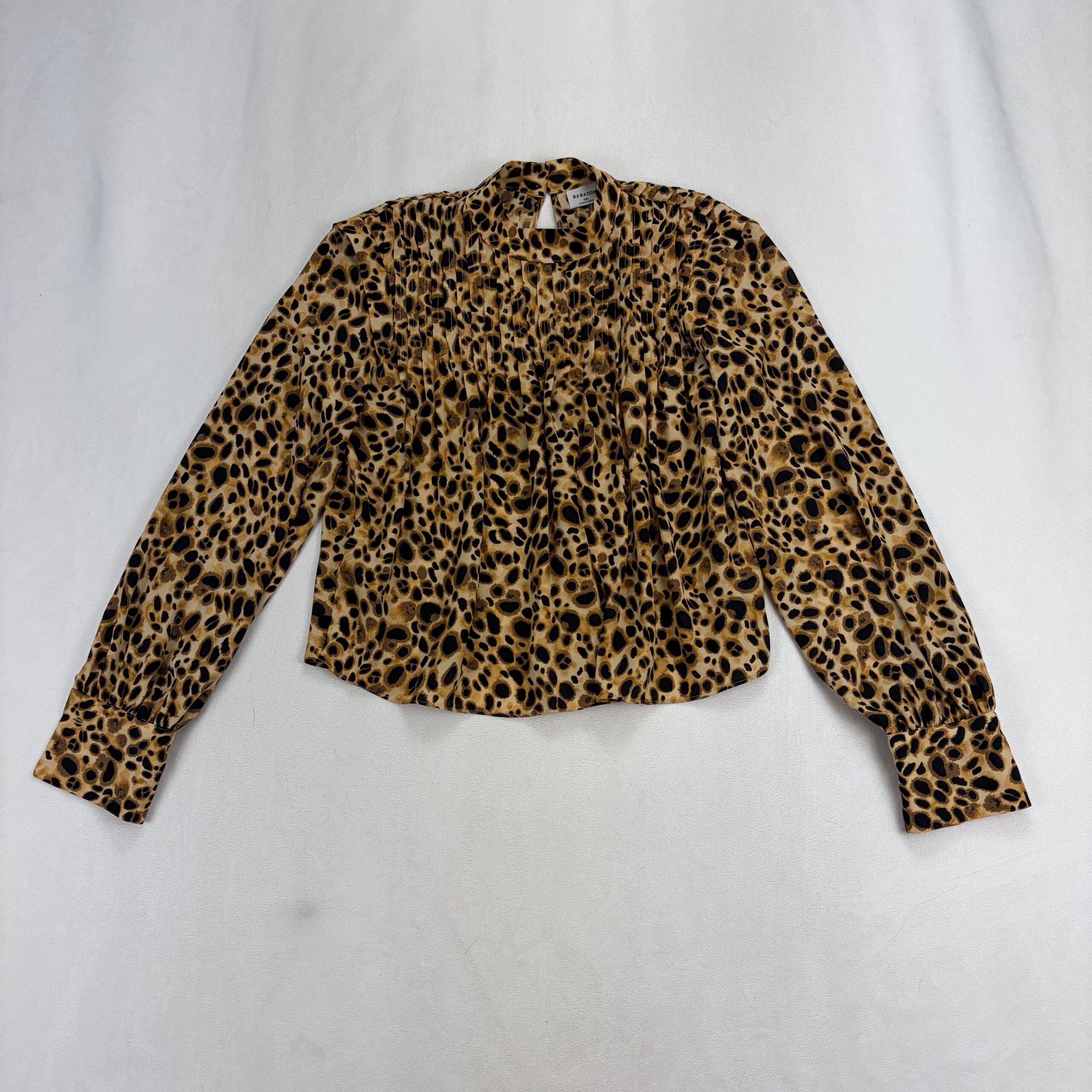 Babaton leopard-print long sleeve blouse in size XXS. Features pleated front detailing, mock neckline with back keyhole, button cuffs and a relaxed hem — timeless print great for work or weekend. Excellent used condition; free of major rips, tears, stains, or flaws. Typical light wear may be present; please see photos for pattern and condition.