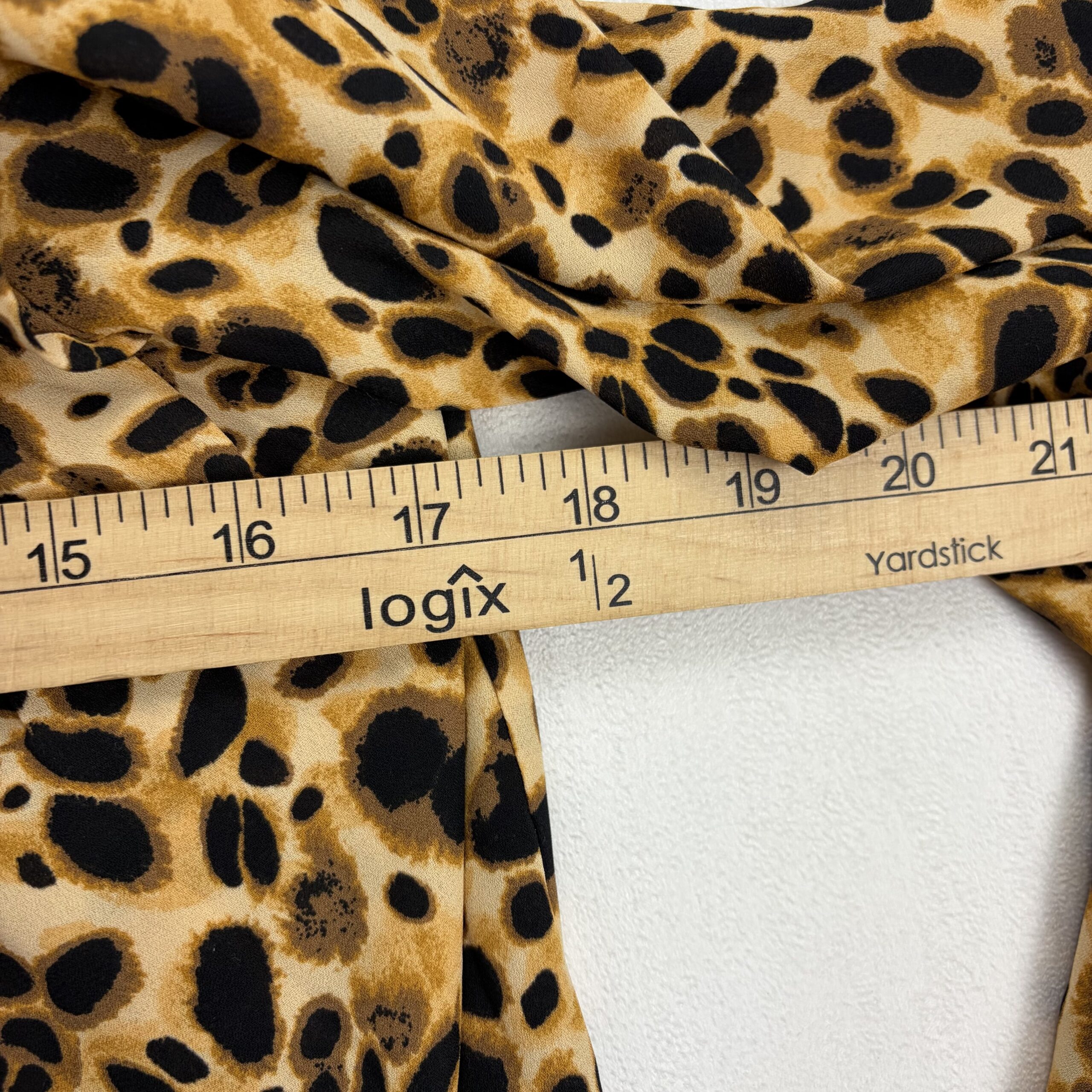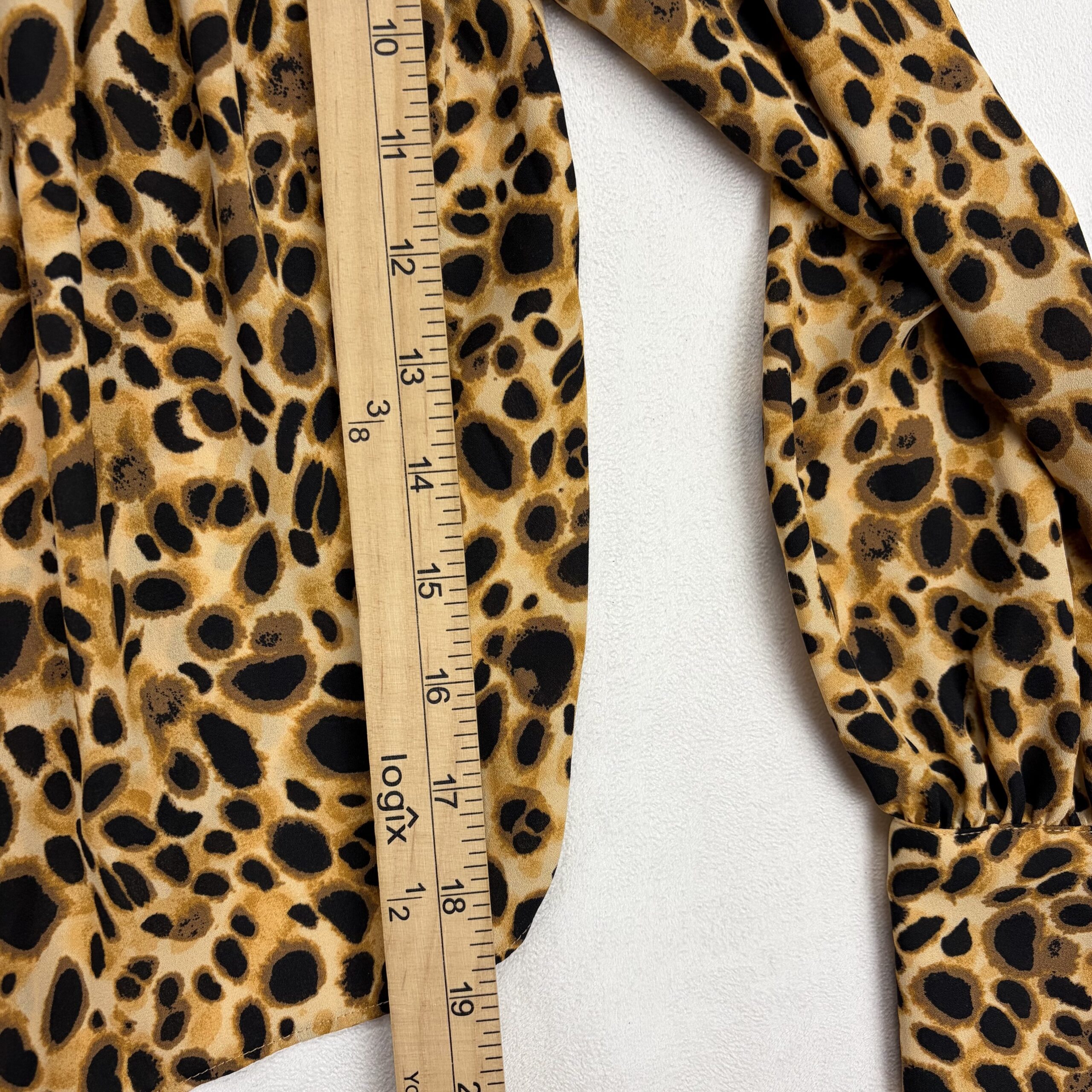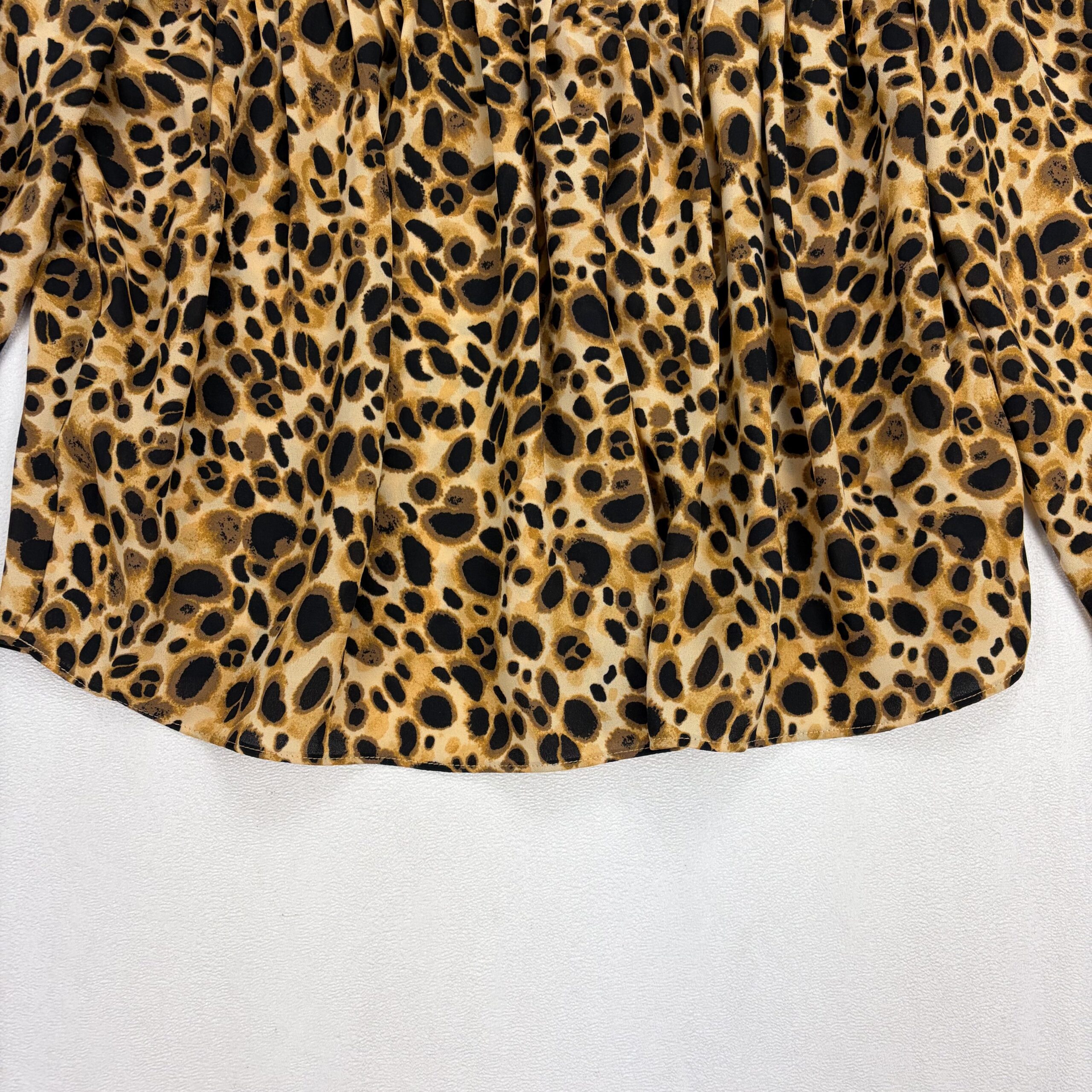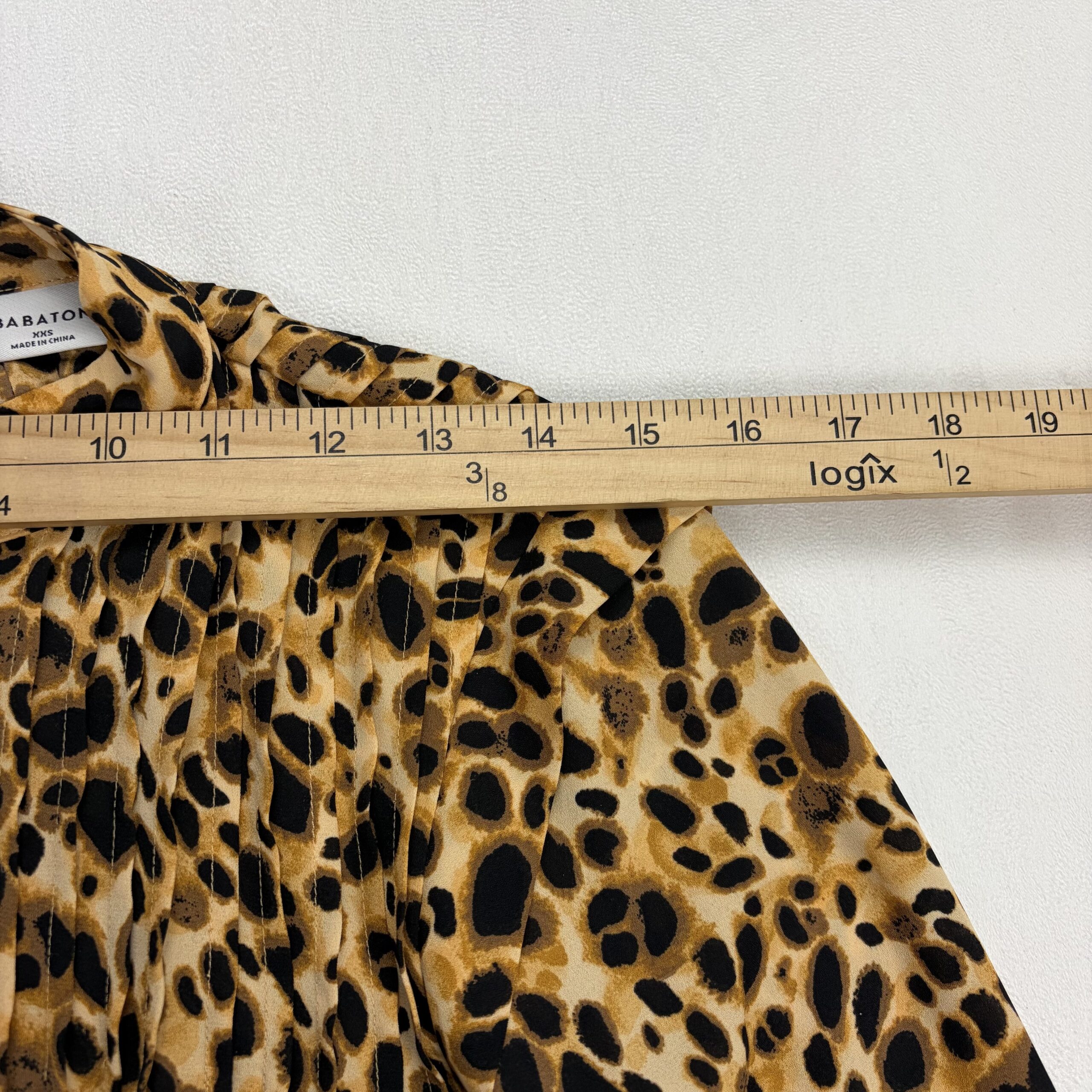 Babaton leopard-print long sleeve blouse in size XXS. Features pleated front detailing, mock neckline with back keyhole, button cuffs and a relaxed hem — timeless print great for work or weekend. Excellent used condition; free of major rips, tears, stains, or flaws. Typical light wear may be present; please see photos for pattern and condition.