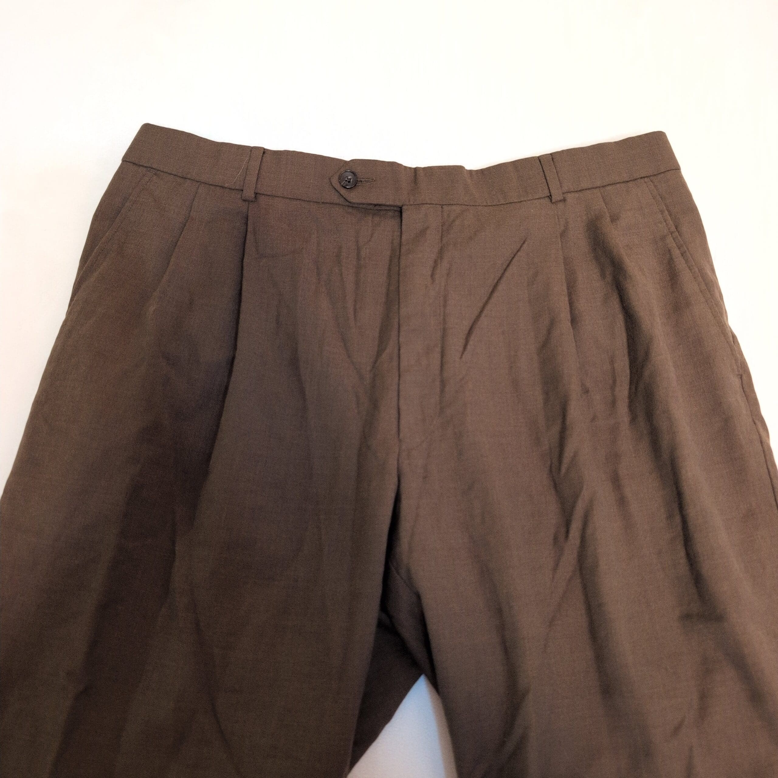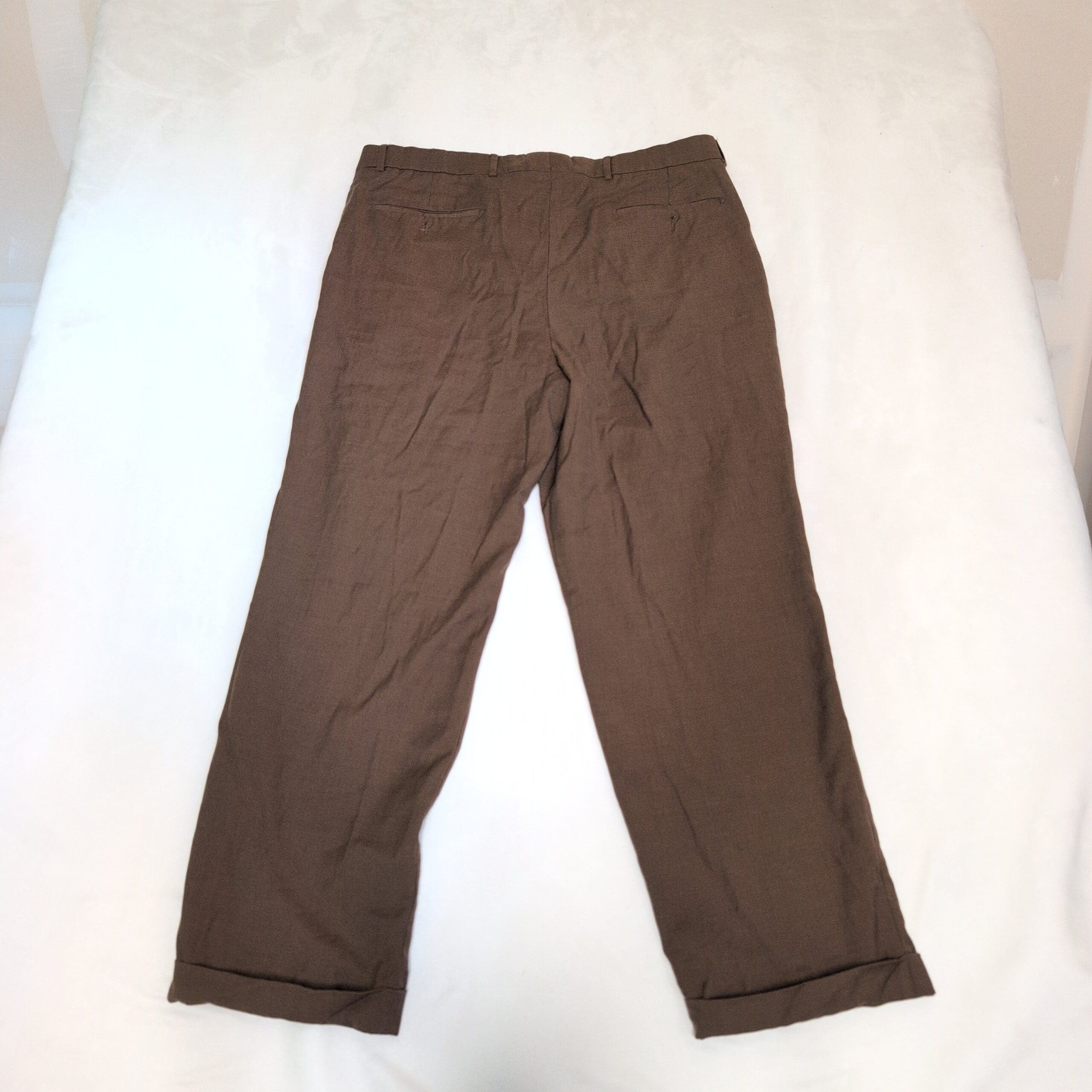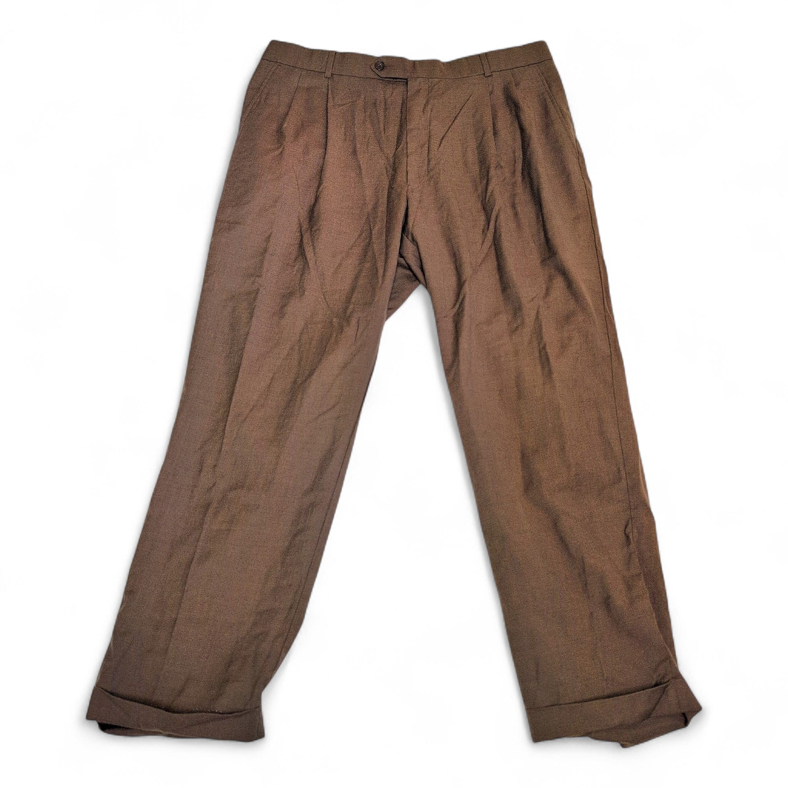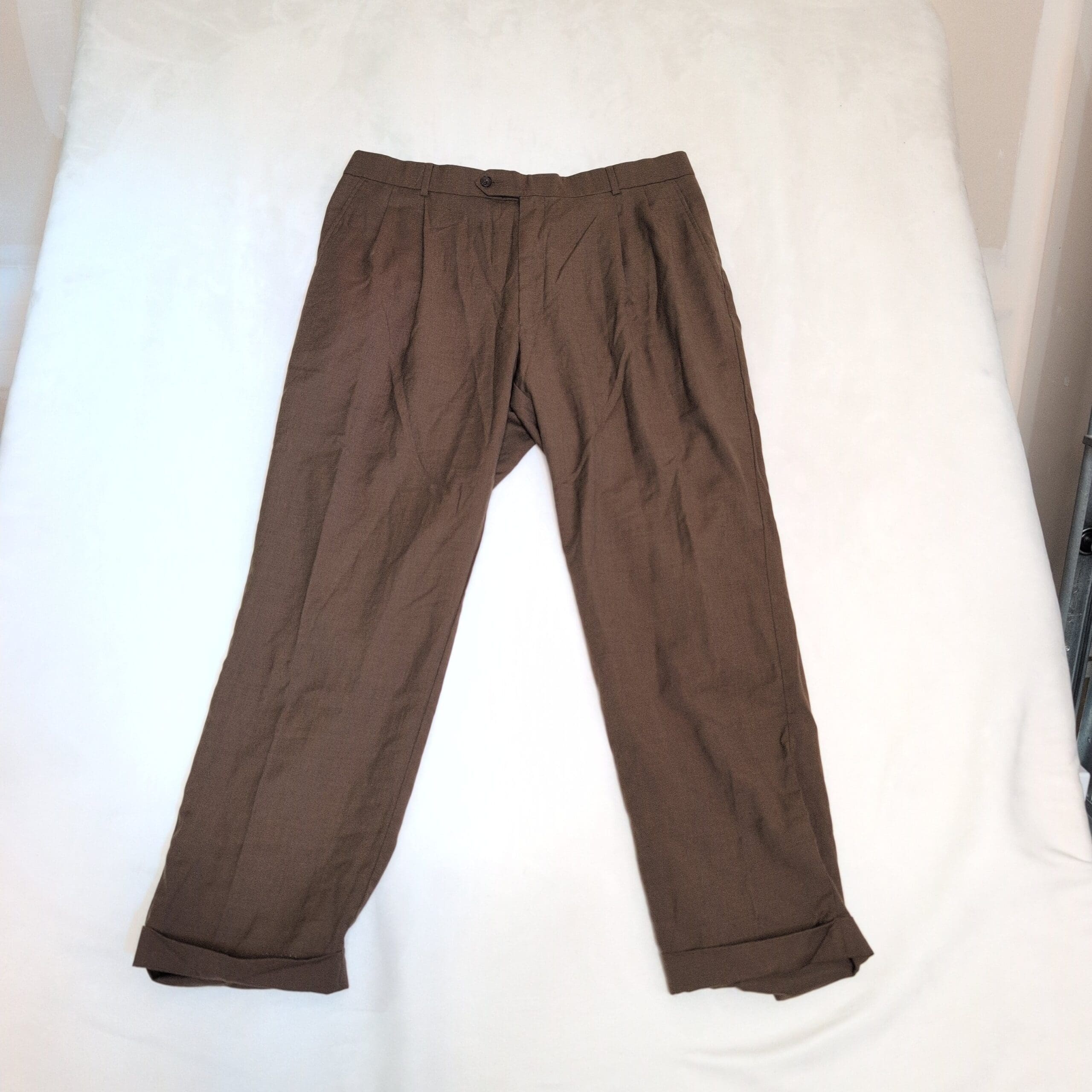 Classic Ballin men’s brown dress pants in waist 38. 100% wool fabric with a tailored, slightly relaxed silhouette and front pleats. Features belt loops, zip fly with button closure, slanted side pockets and a welt back pocket. Cuffed hem as shown. Gently used — free of major rips, tears, or stains; may show light creasing and normal wear consistent with prior use. Perfect for office or smart-casual occasions.