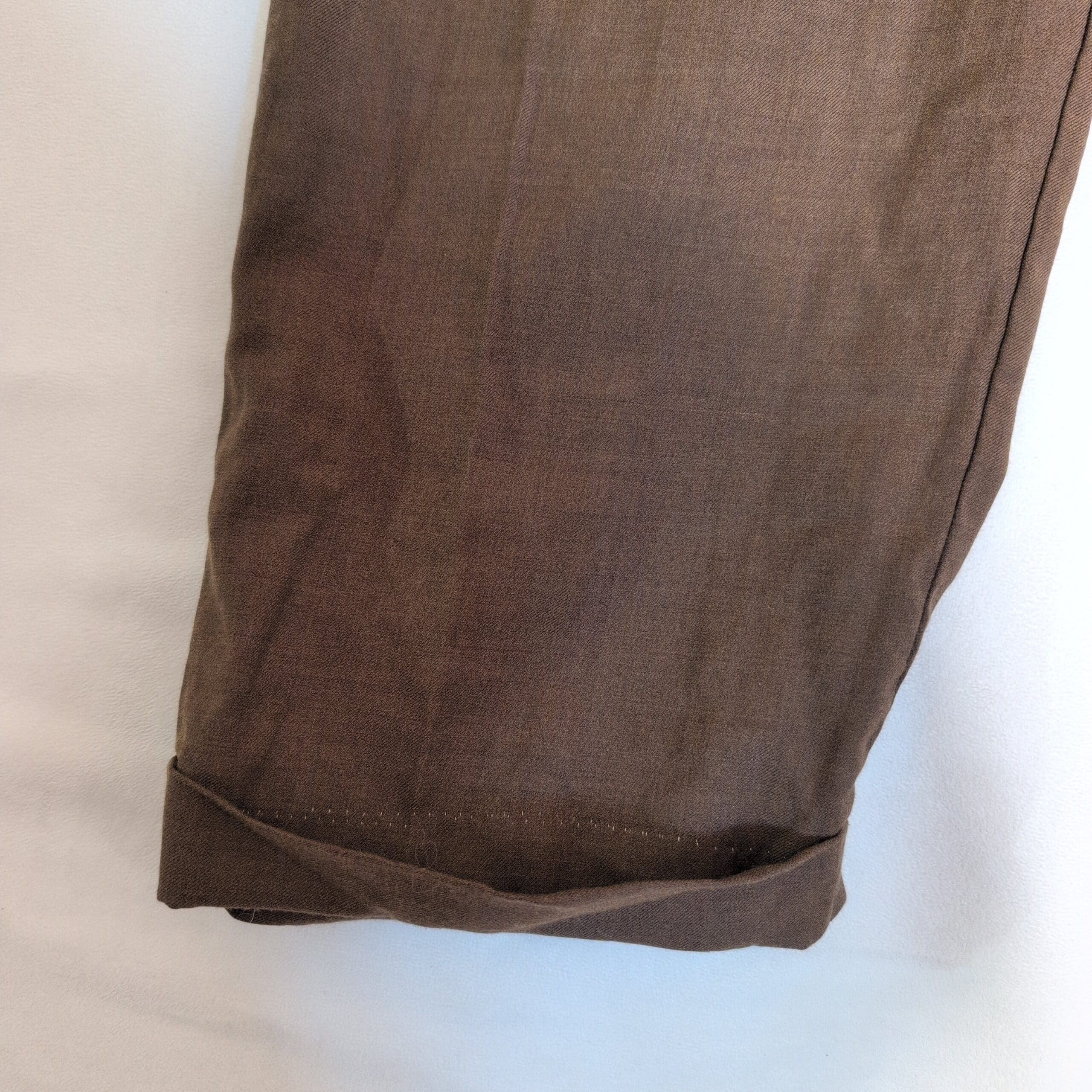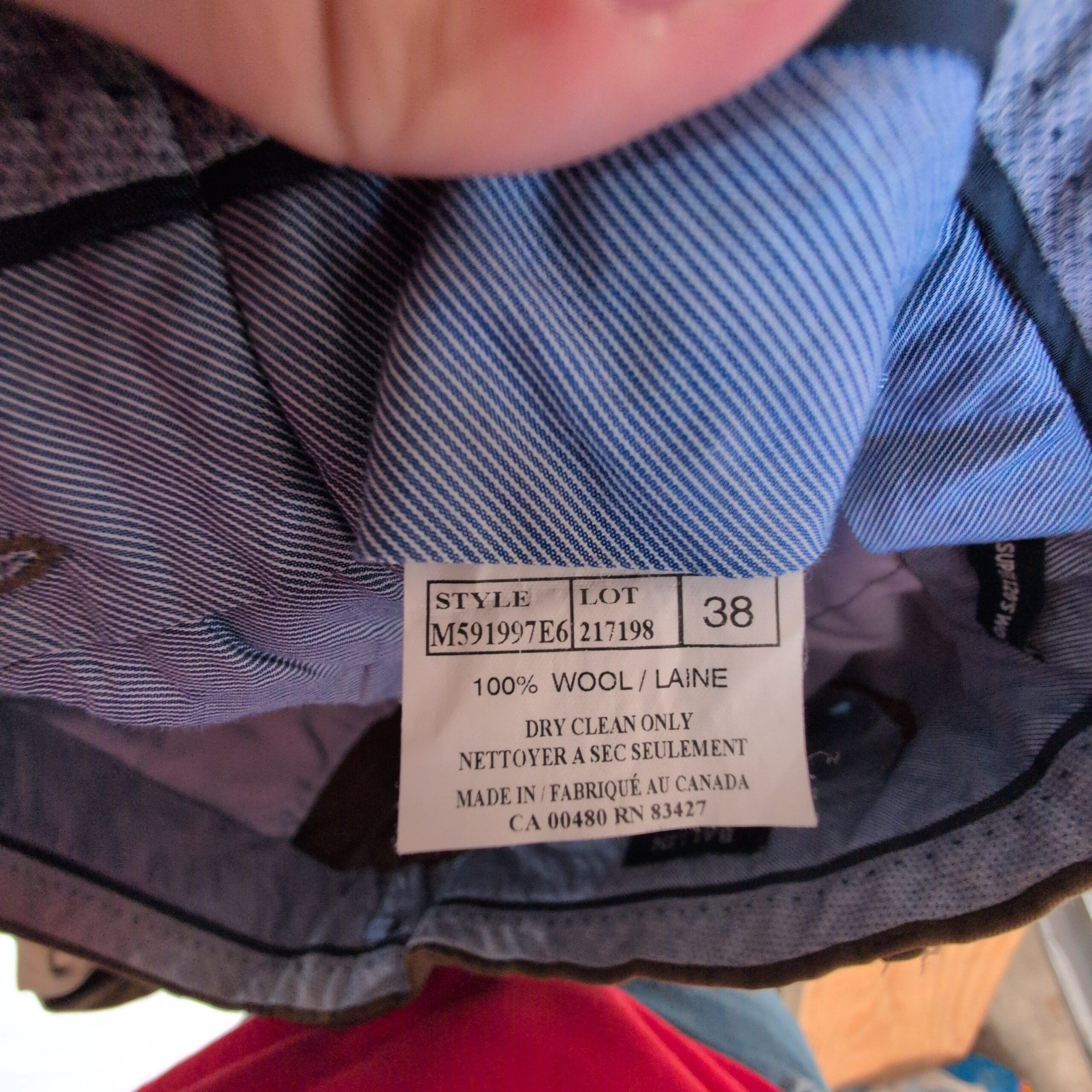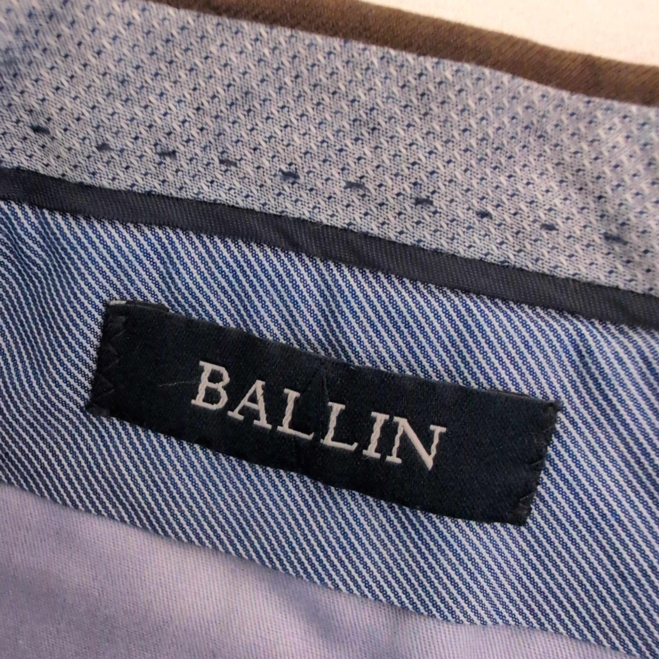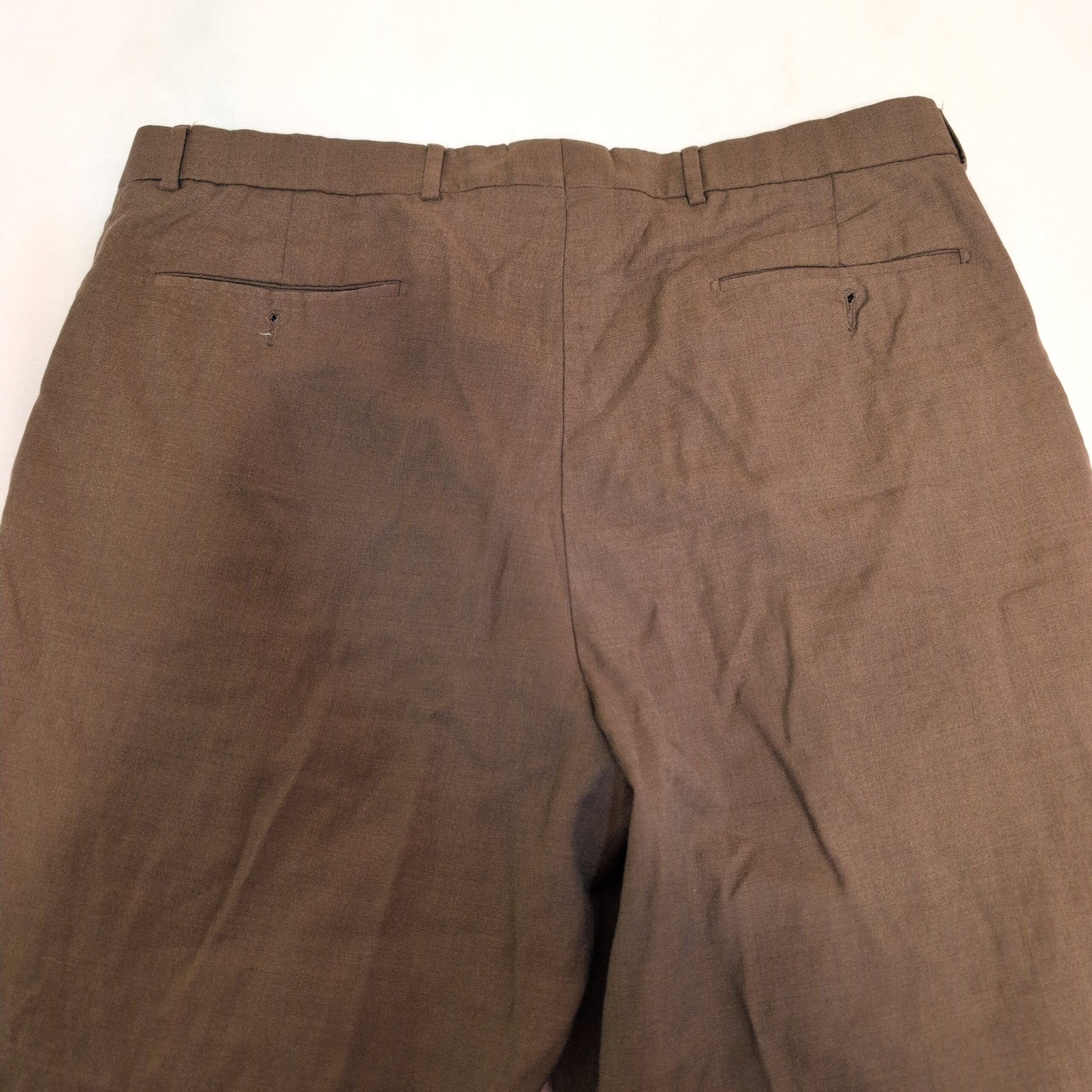 Classic Ballin men’s brown dress pants in waist 38. 100% wool fabric with a tailored, slightly relaxed silhouette and front pleats. Features belt loops, zip fly with button closure, slanted side pockets and a welt back pocket. Cuffed hem as shown. Gently used — free of major rips, tears, or stains; may show light creasing and normal wear consistent with prior use. Perfect for office or smart-casual occasions.