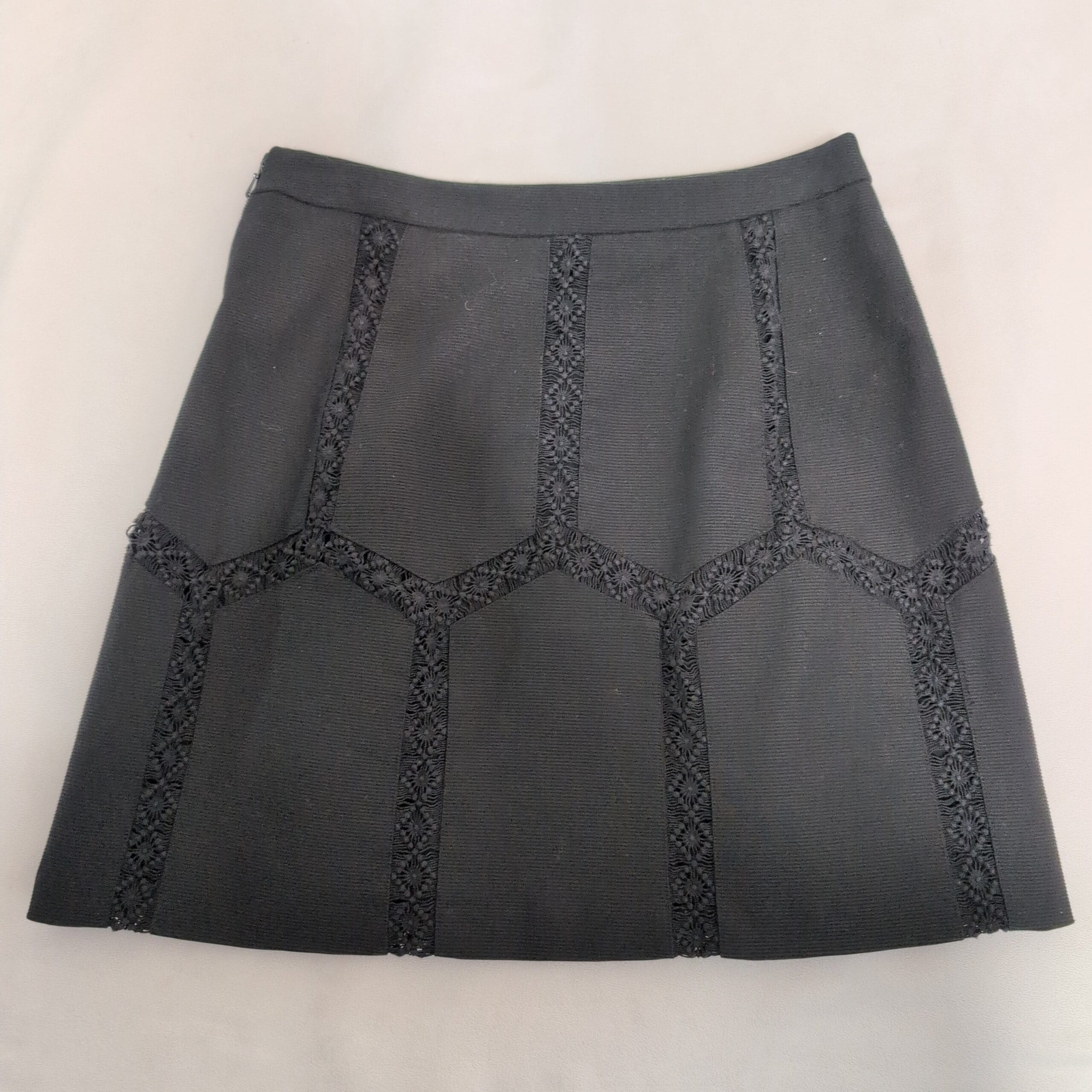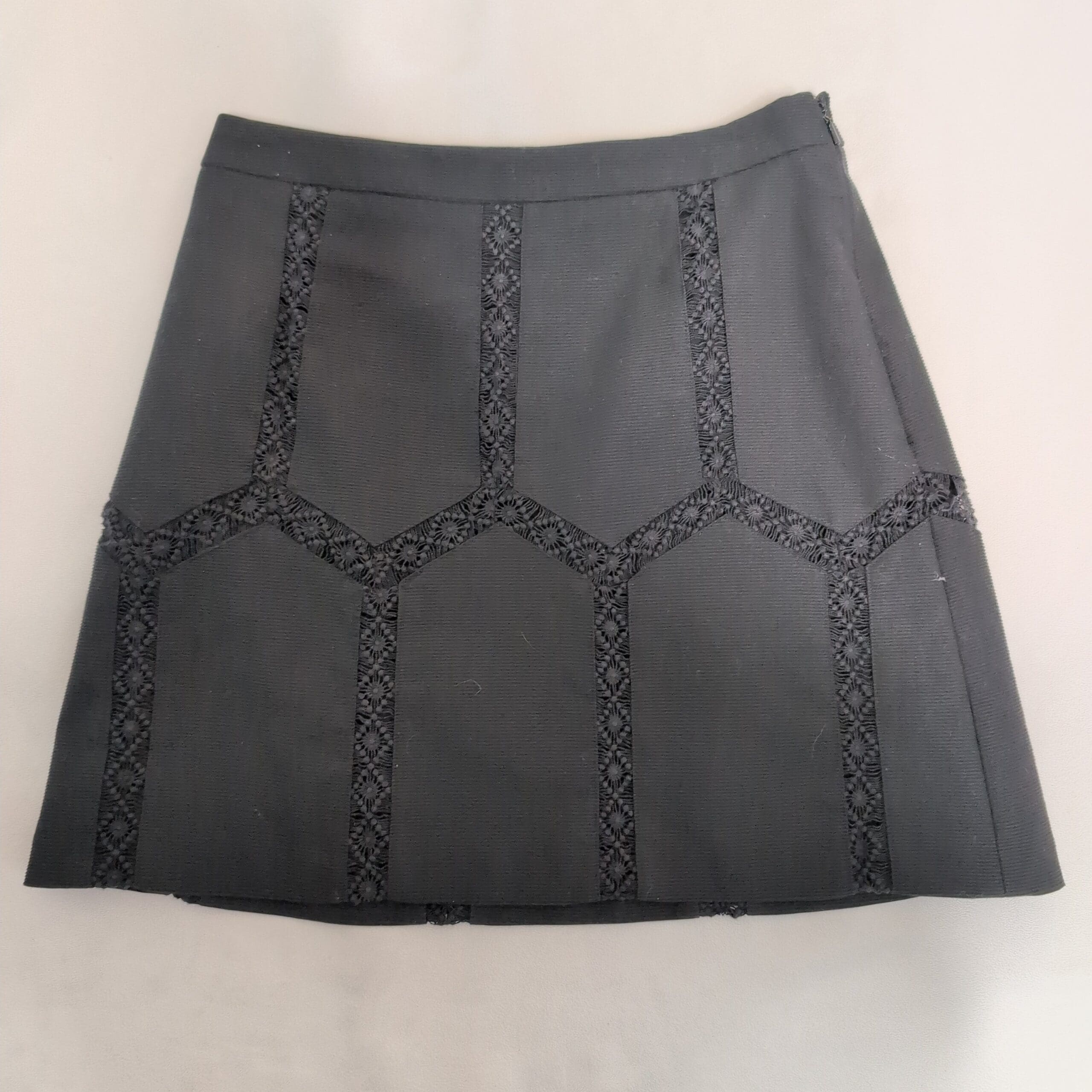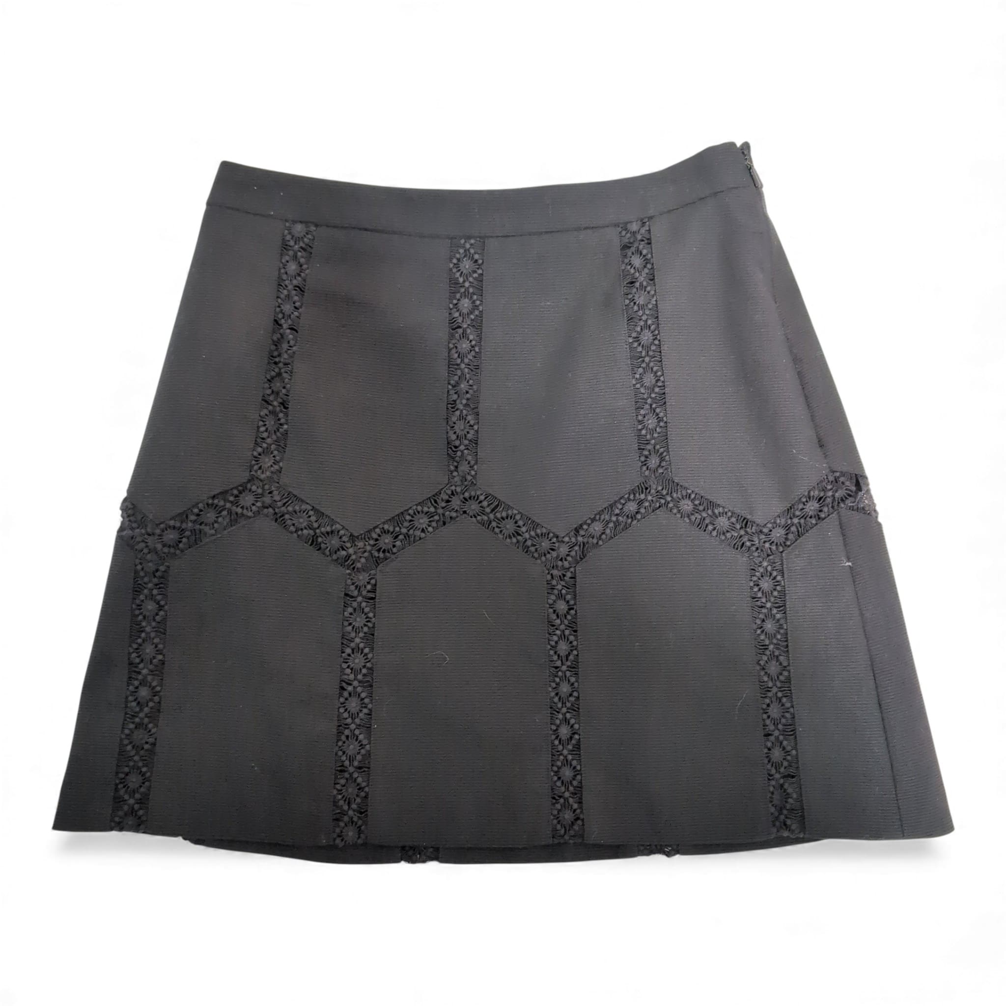 Banana Republic black mini skirt in size 2. Features decorative lace-embroidered paneling forming a geometric motif across the front for subtle texture and visual interest. Clean waistband with a side zipper closure for a tailored fit. Versatile style that pairs well with blouses, sweaters, or blazers for work or evening wear.