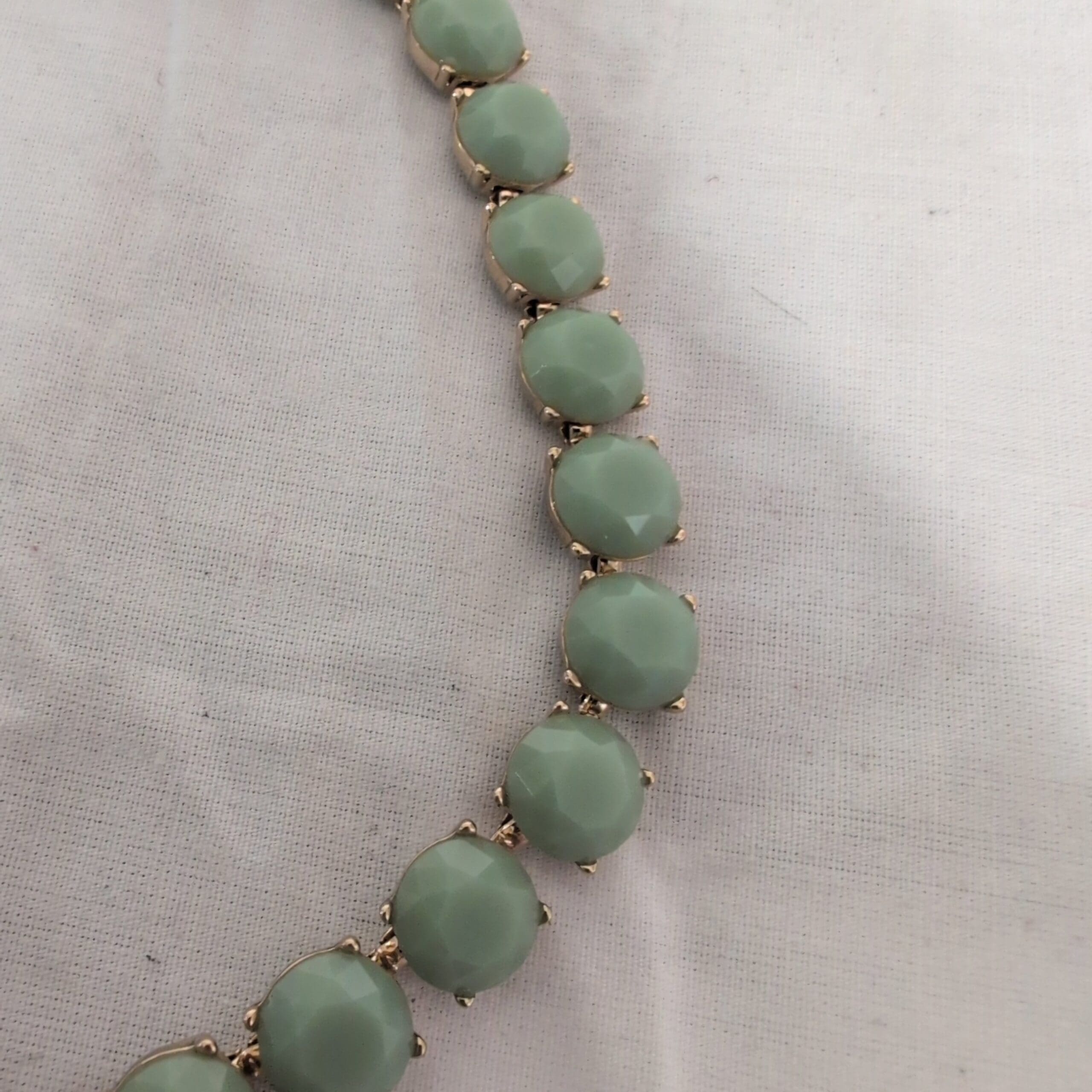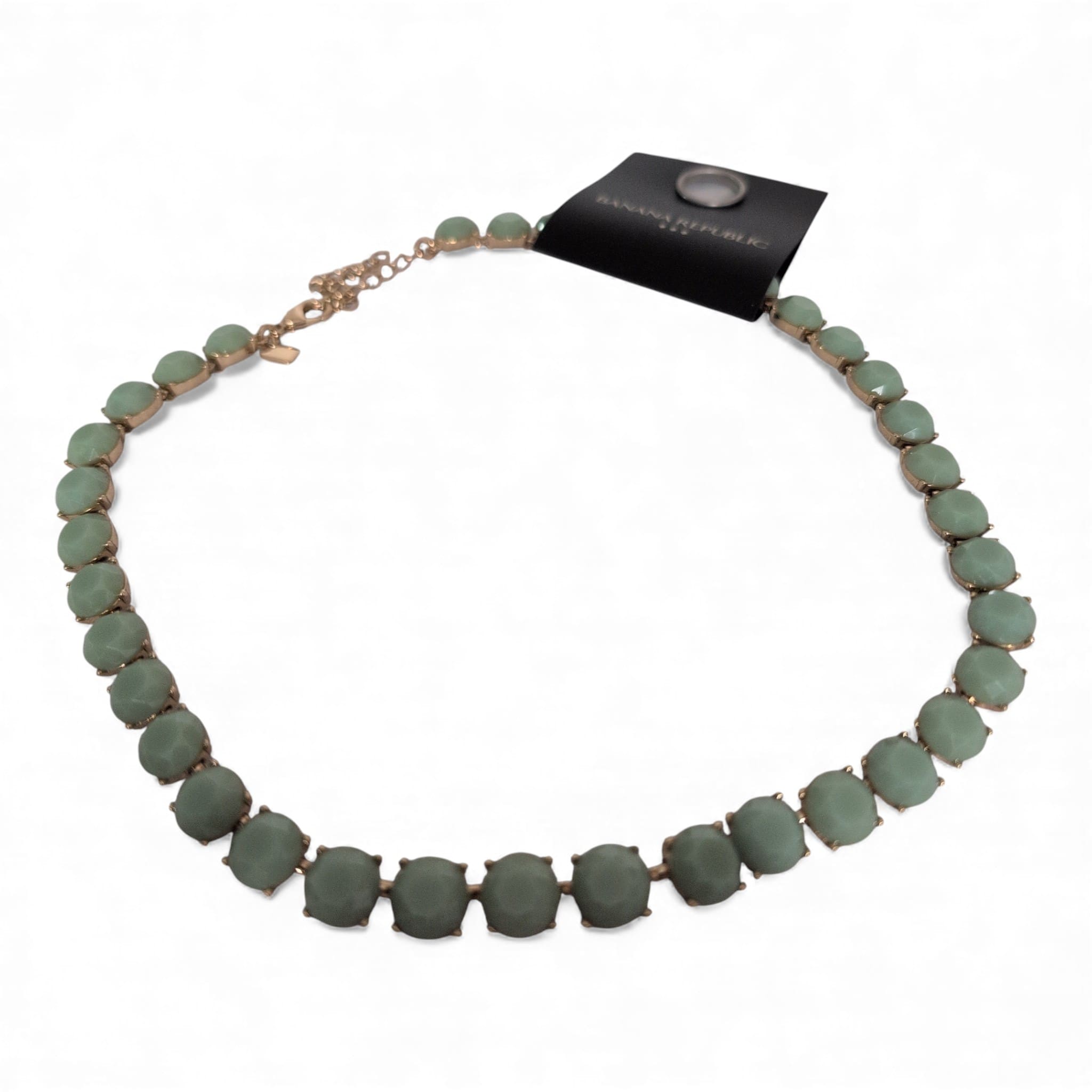 Banana Republic mint green statement necklace – New With Tags (NWT). Faceted mint-green stones are set in gold-tone links for a bright, polished collar-style look. Includes original tag and an adjustable chain for a customizable fit; excellent condition with no flaws. One size (OS), perfect for dressing up daytime or evening outfits.