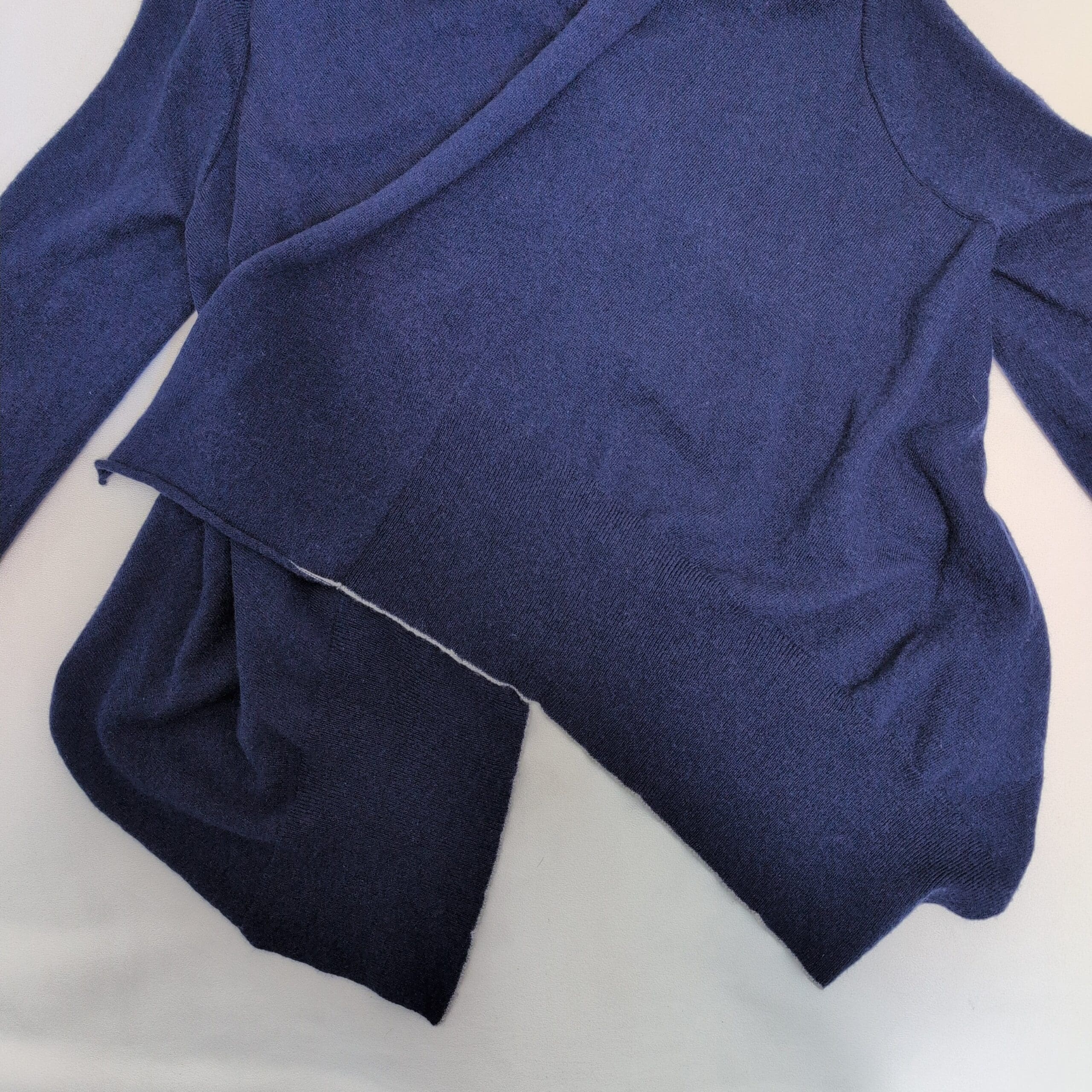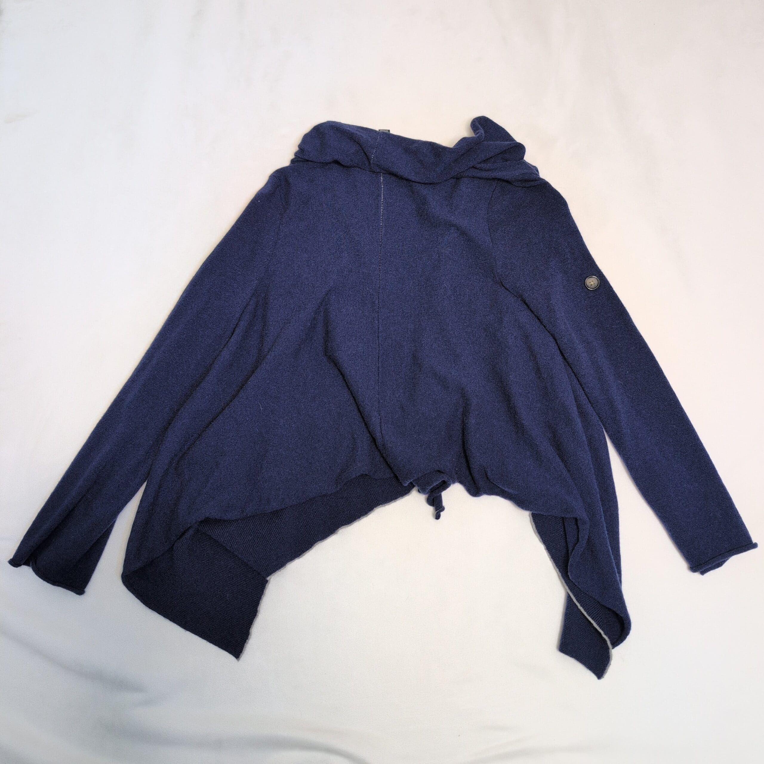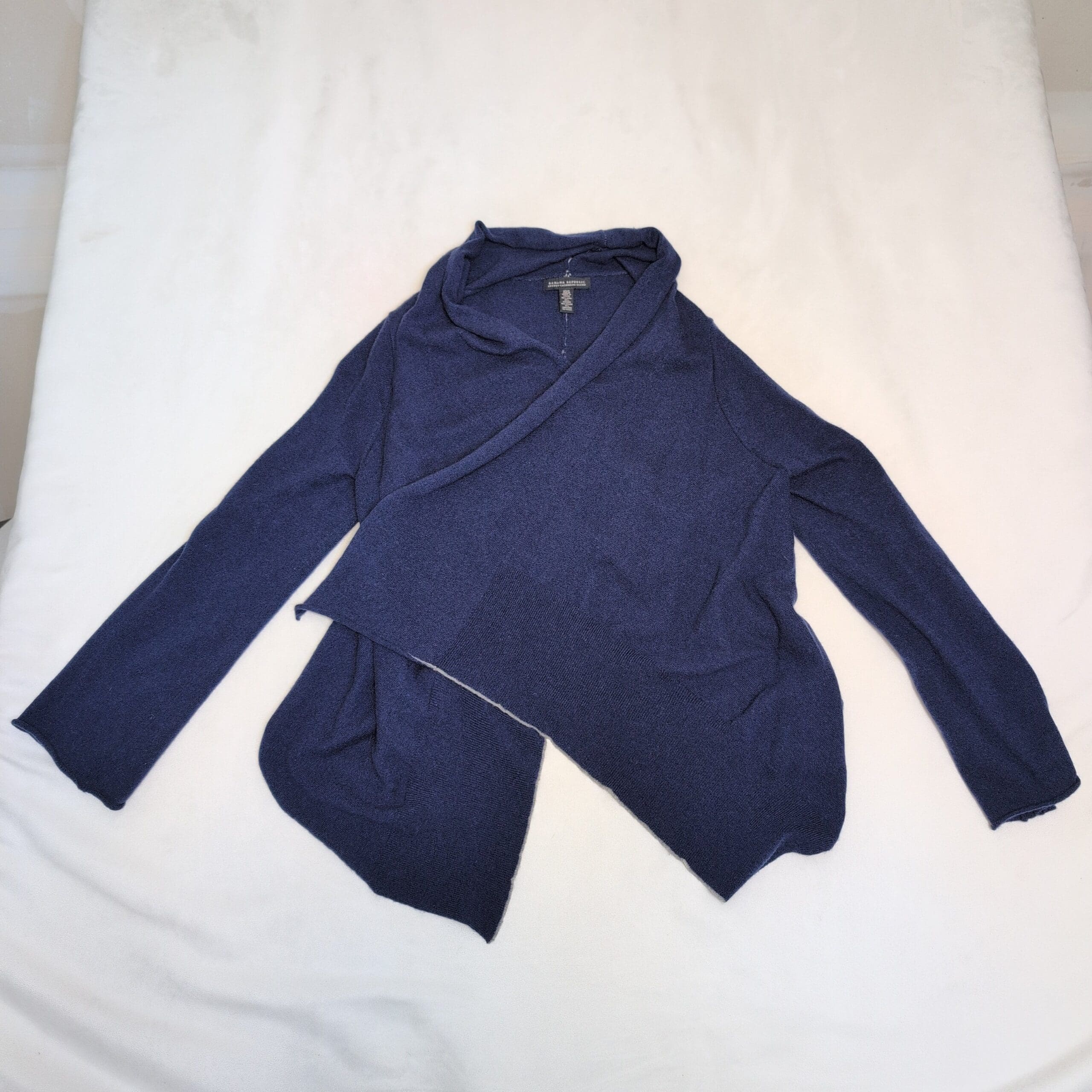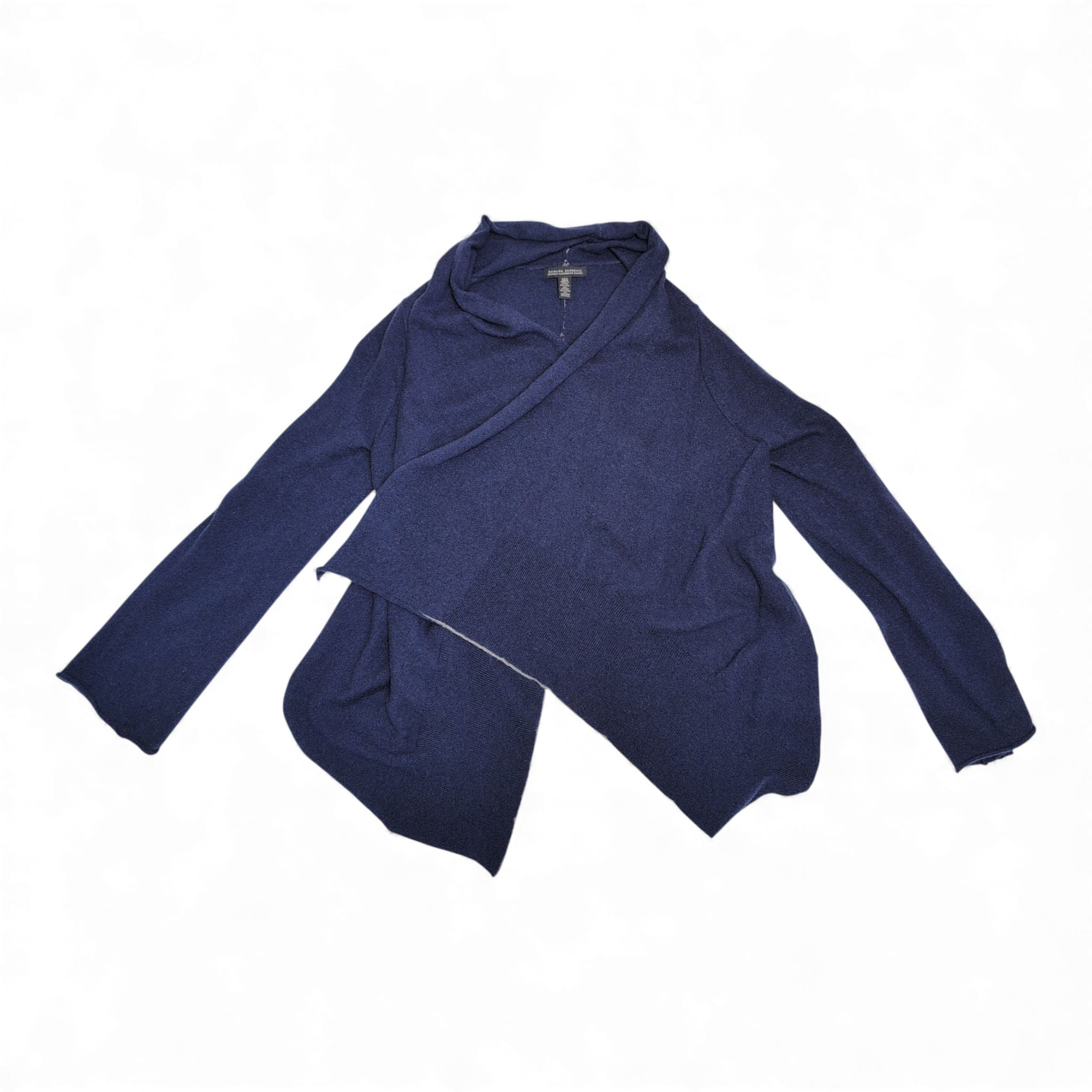 Banana Republic navy wrap cardigan in size XS. Lightweight, drapey knit with an open asymmetrical front and shawl collar for a soft, layered look. Long sleeves and a relaxed silhouette make this a versatile piece for work or weekend styling. Good pre-owned condition with normal light wear; no visible stains, holes, or odors. Please review photos for color, texture, and details. No measurements provided.