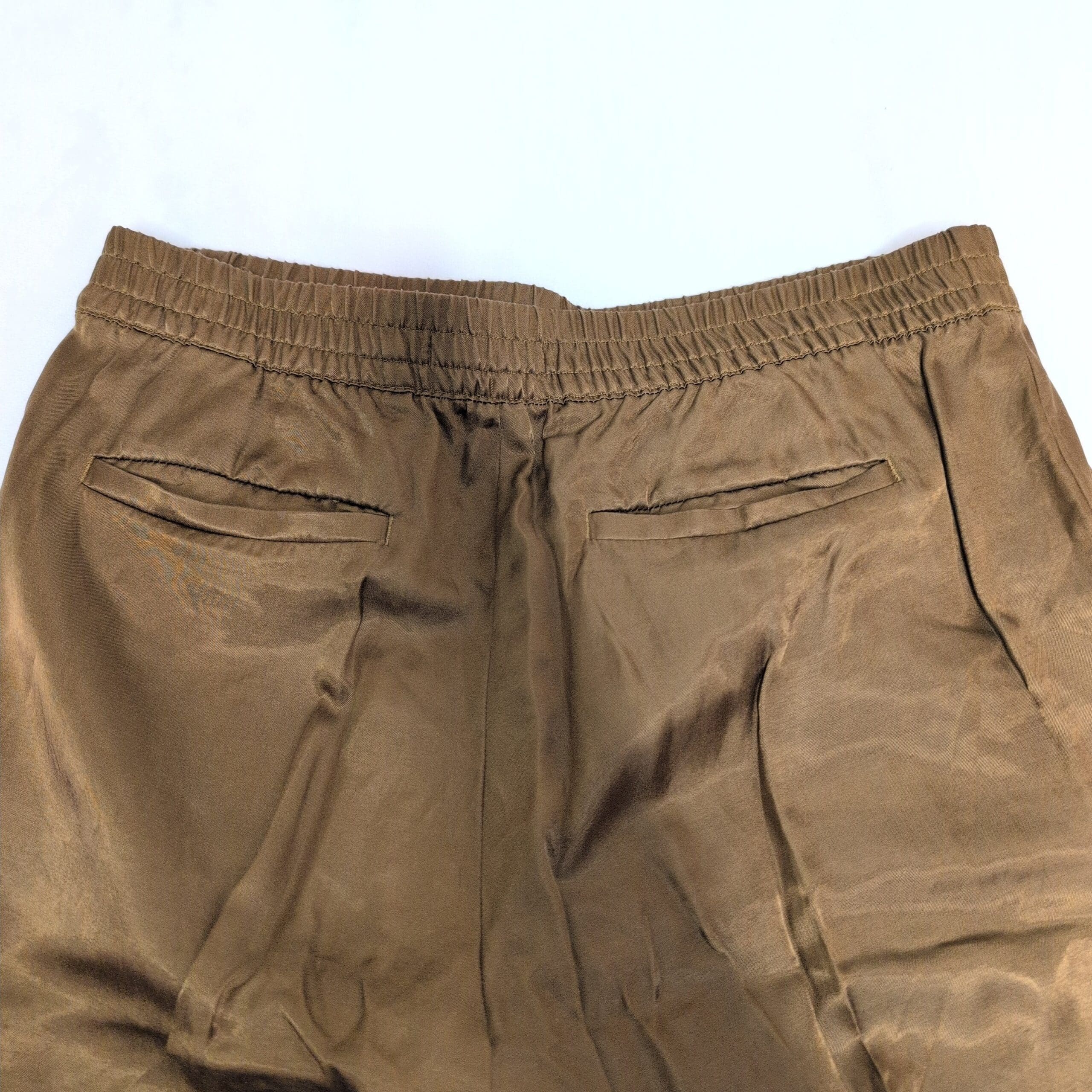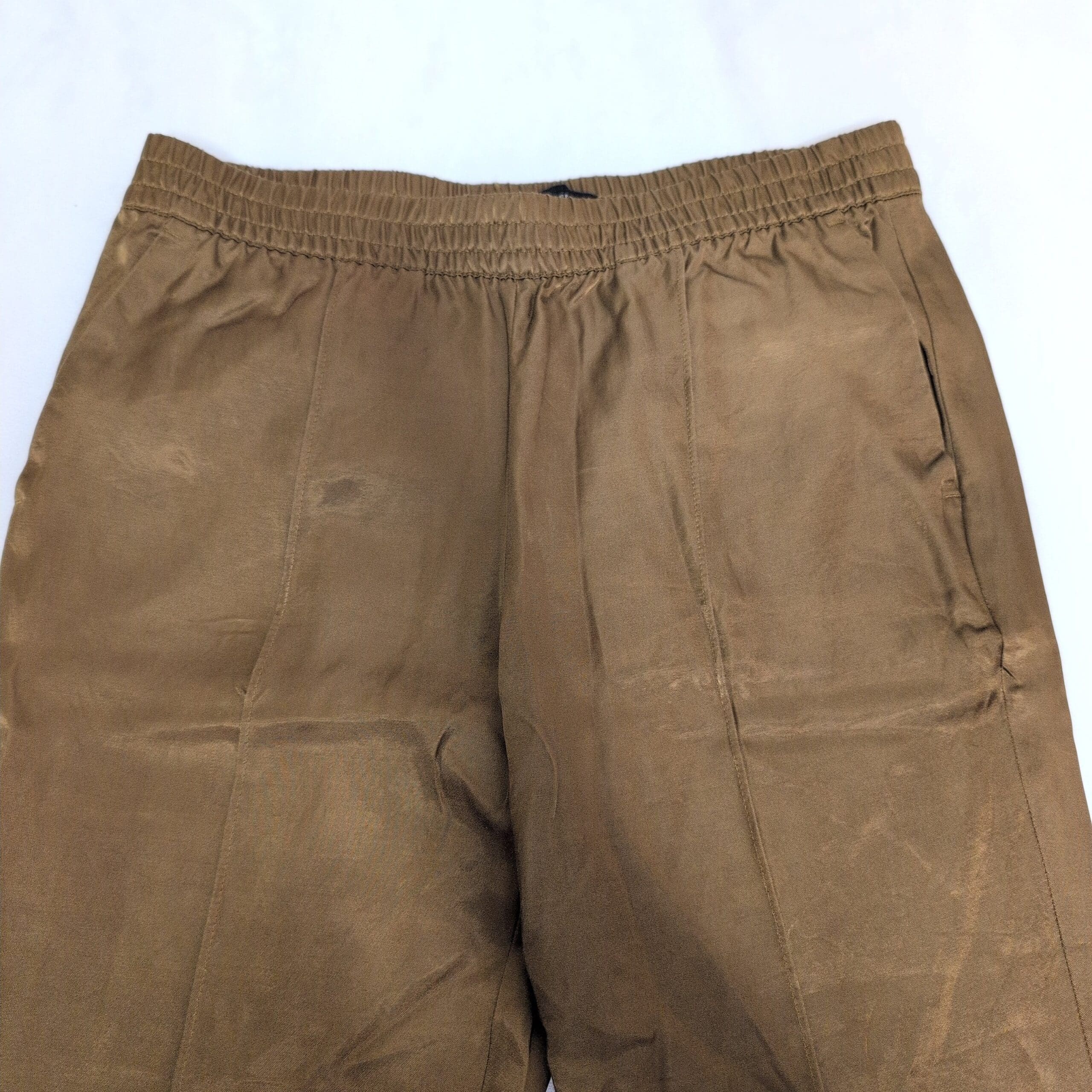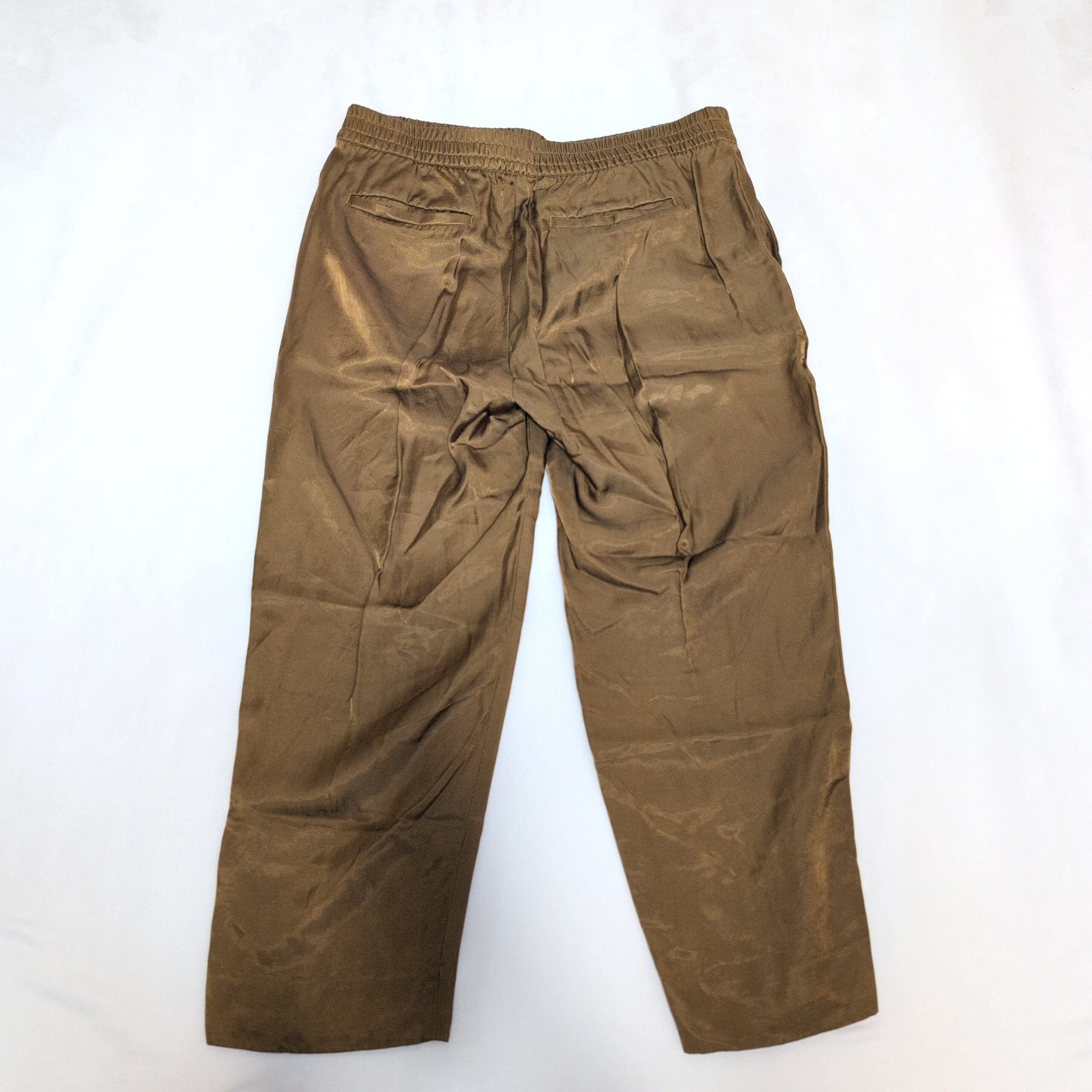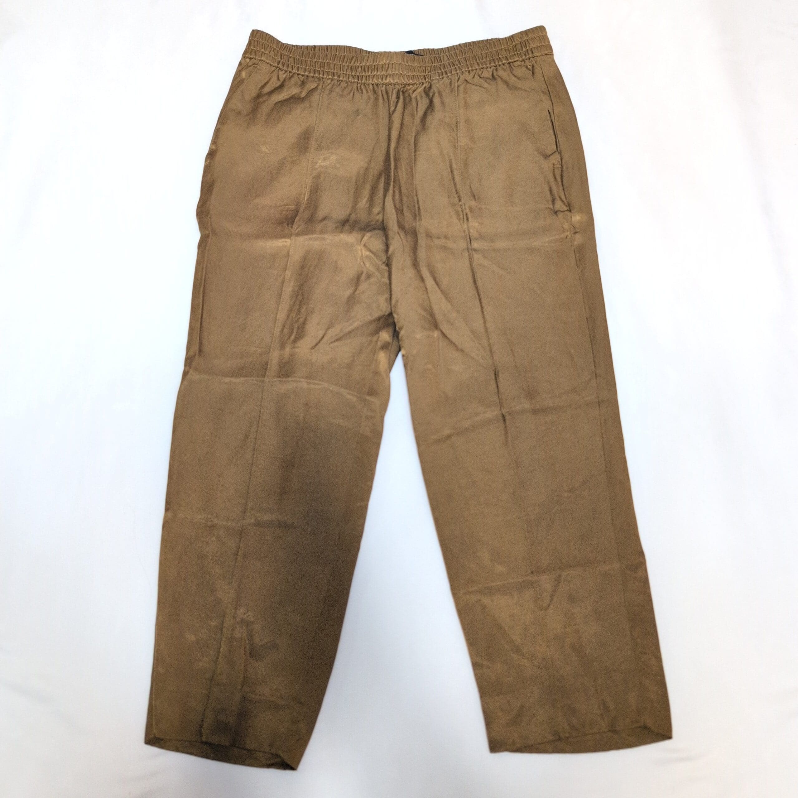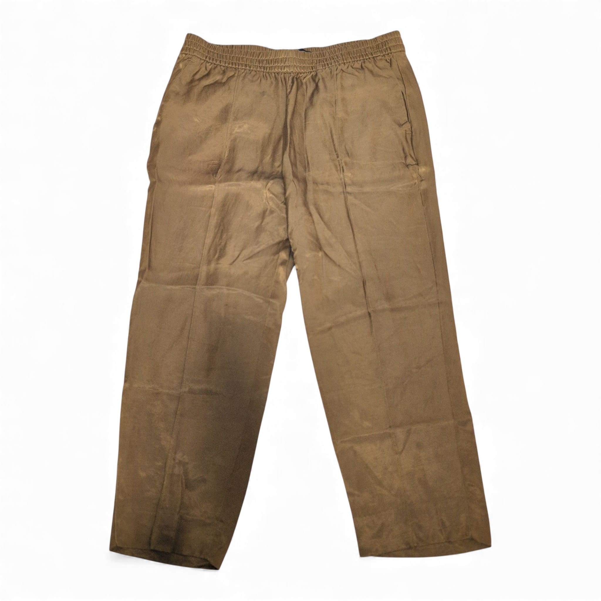 Banana Republic petite cropped ankle pants in a warm gold tone. Pull-on style with elastic waistband and a relaxed straight leg for an easy, polished look. Lightweight fabric with a subtle sheen and functional front pockets. Pre-owned: good overall condition with light creasing and minor signs of wear consistent with gentle use — please review photos for details.