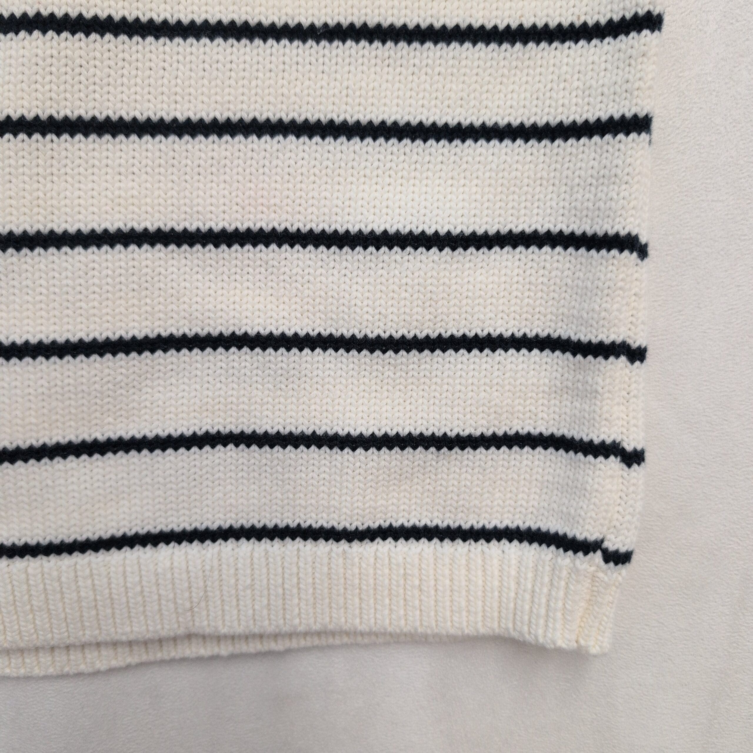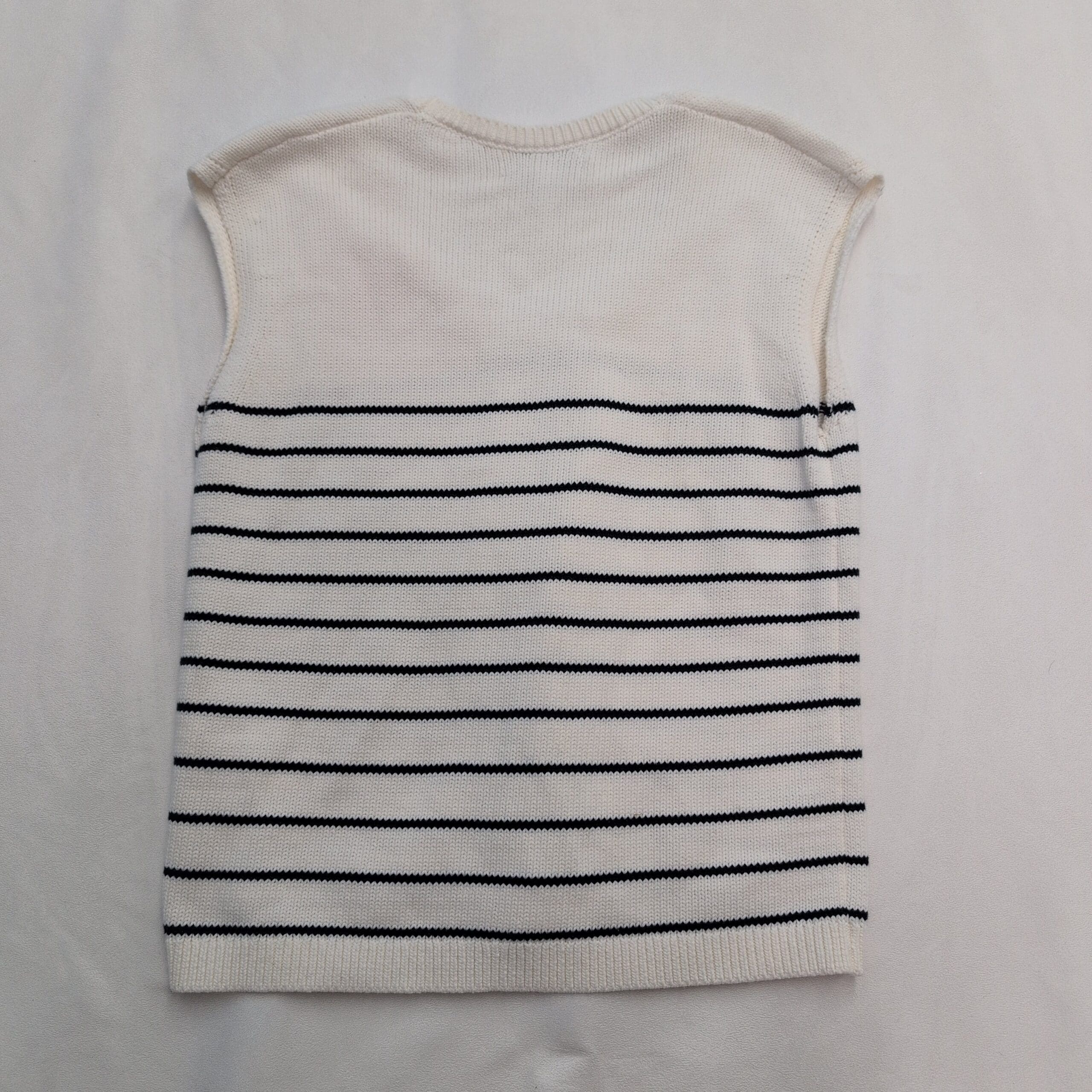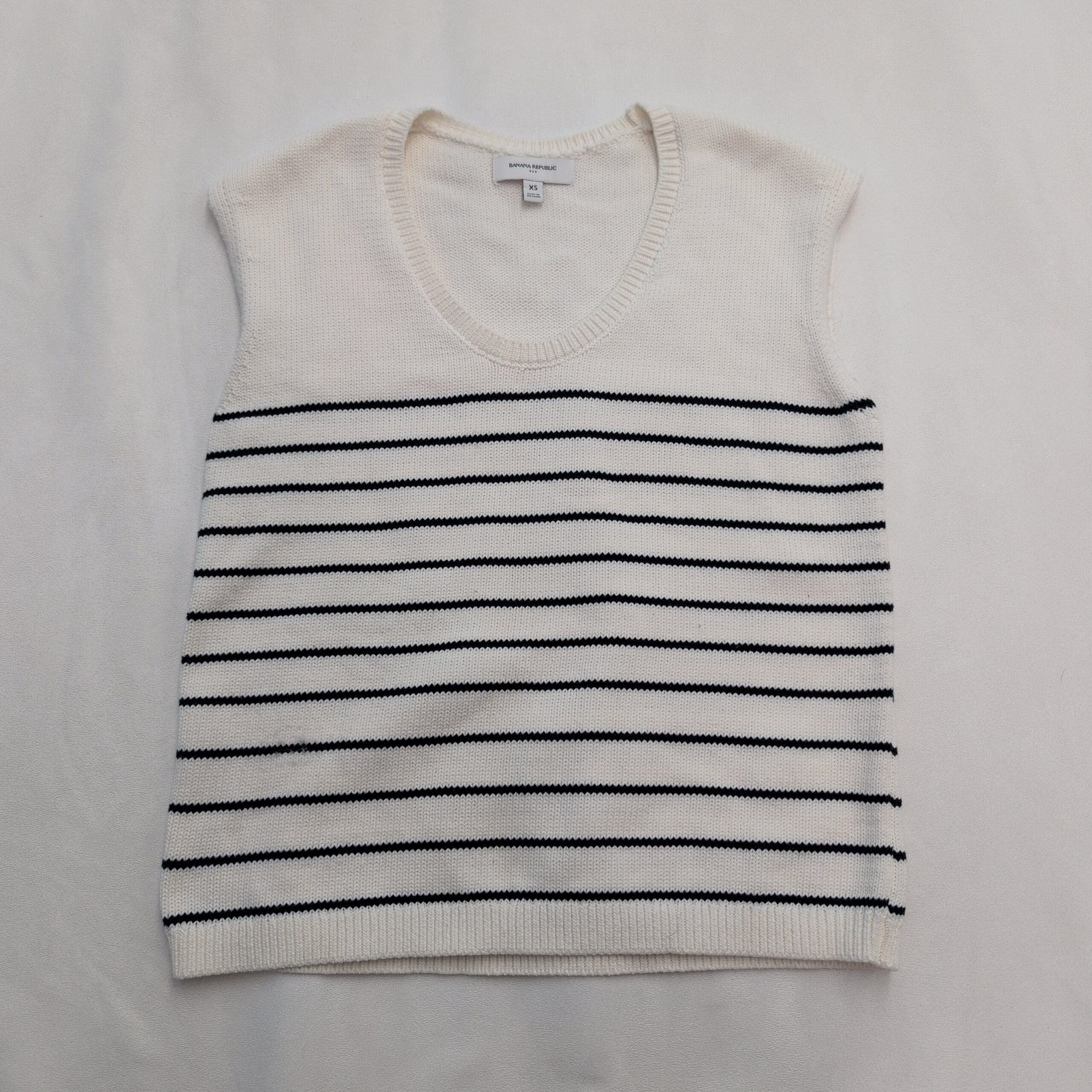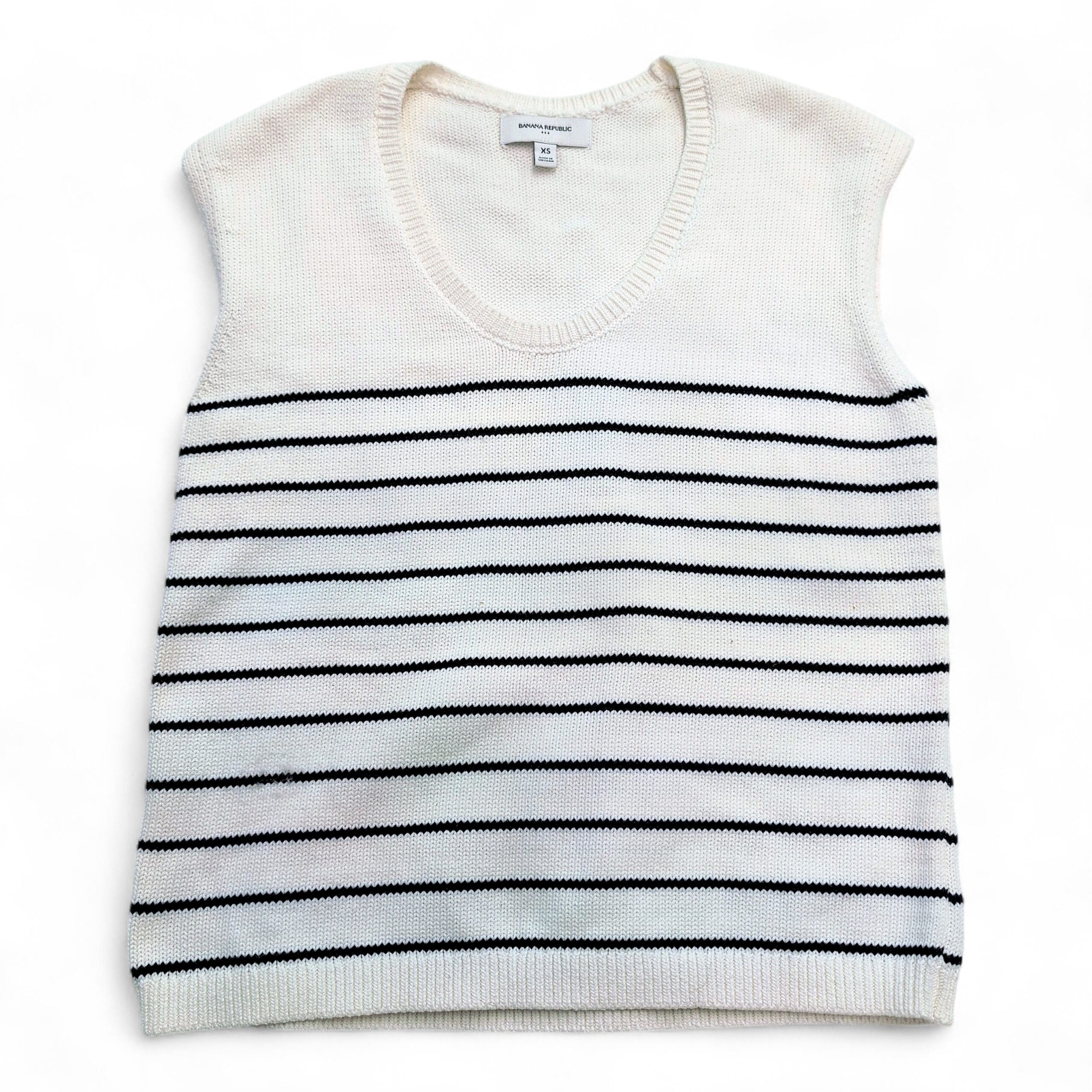 Banana Republic sleeveless knit sweater vest in white with navy horizontal stripes. Lightweight, classic scoop neckline and ribbed hem — perfect for layering over shirts or wearing solo for a crisp, nautical-inspired look. Size: XS (standard).