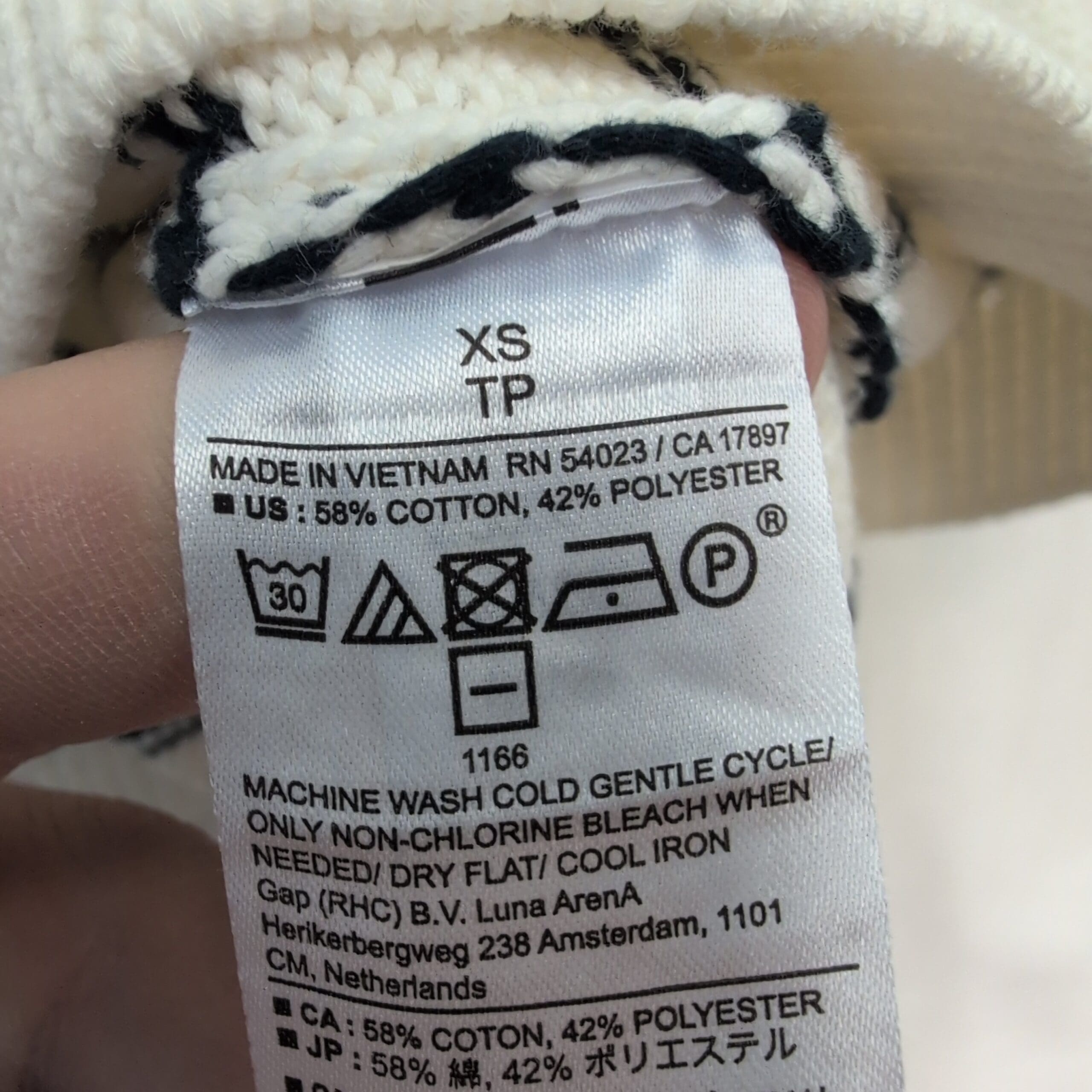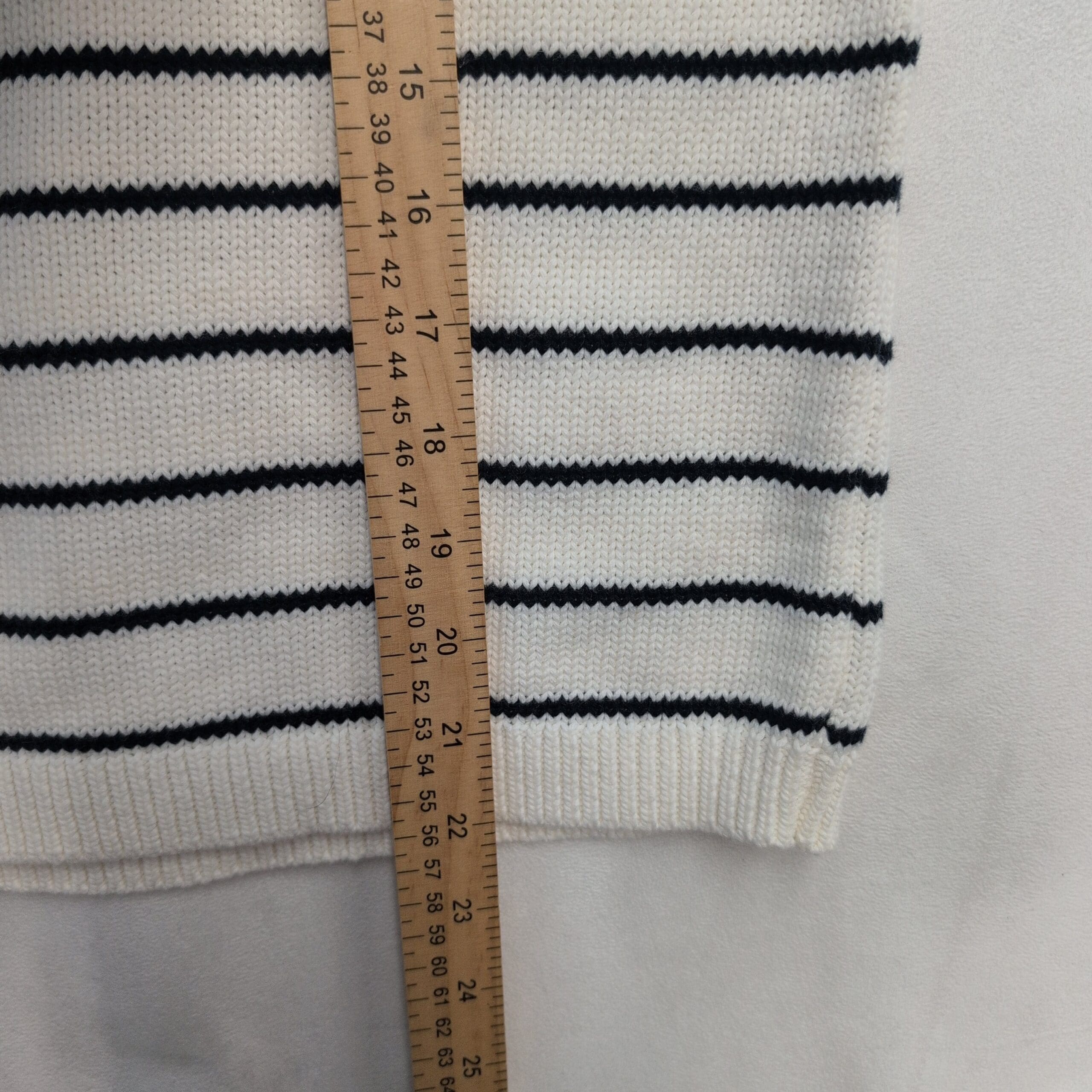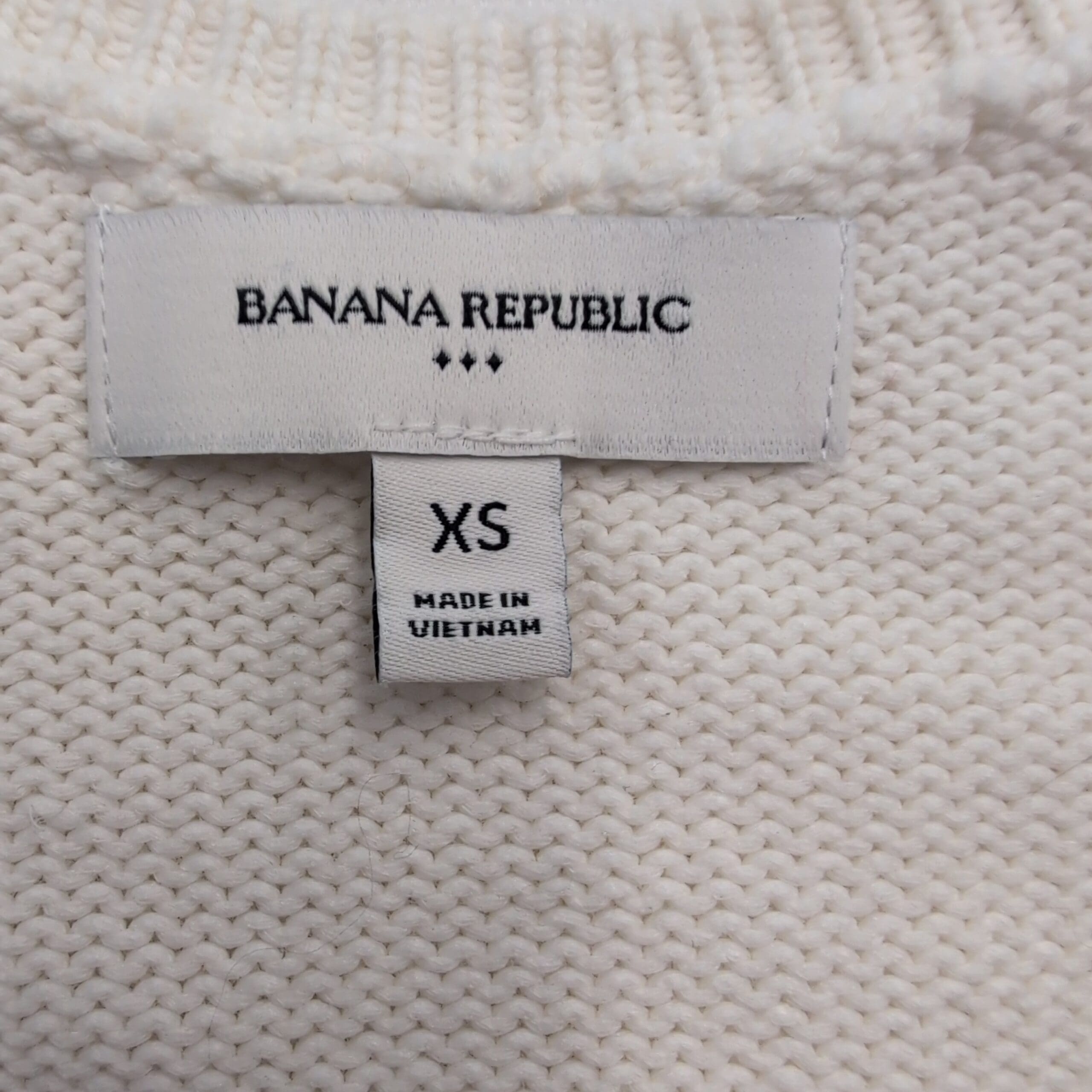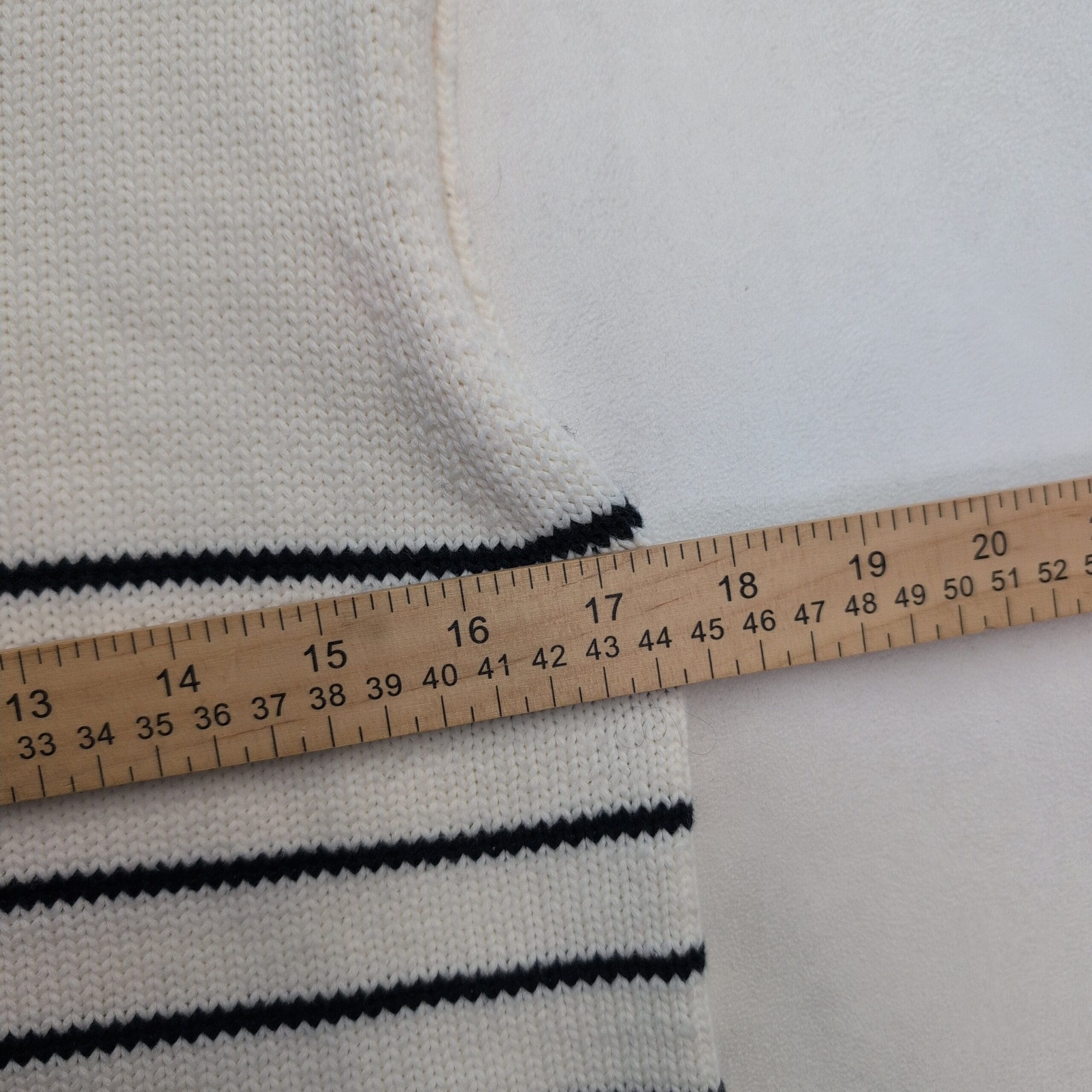 Banana Republic sleeveless knit sweater vest in white with navy horizontal stripes. Lightweight, classic scoop neckline and ribbed hem — perfect for layering over shirts or wearing solo for a crisp, nautical-inspired look. Size: XS (standard).