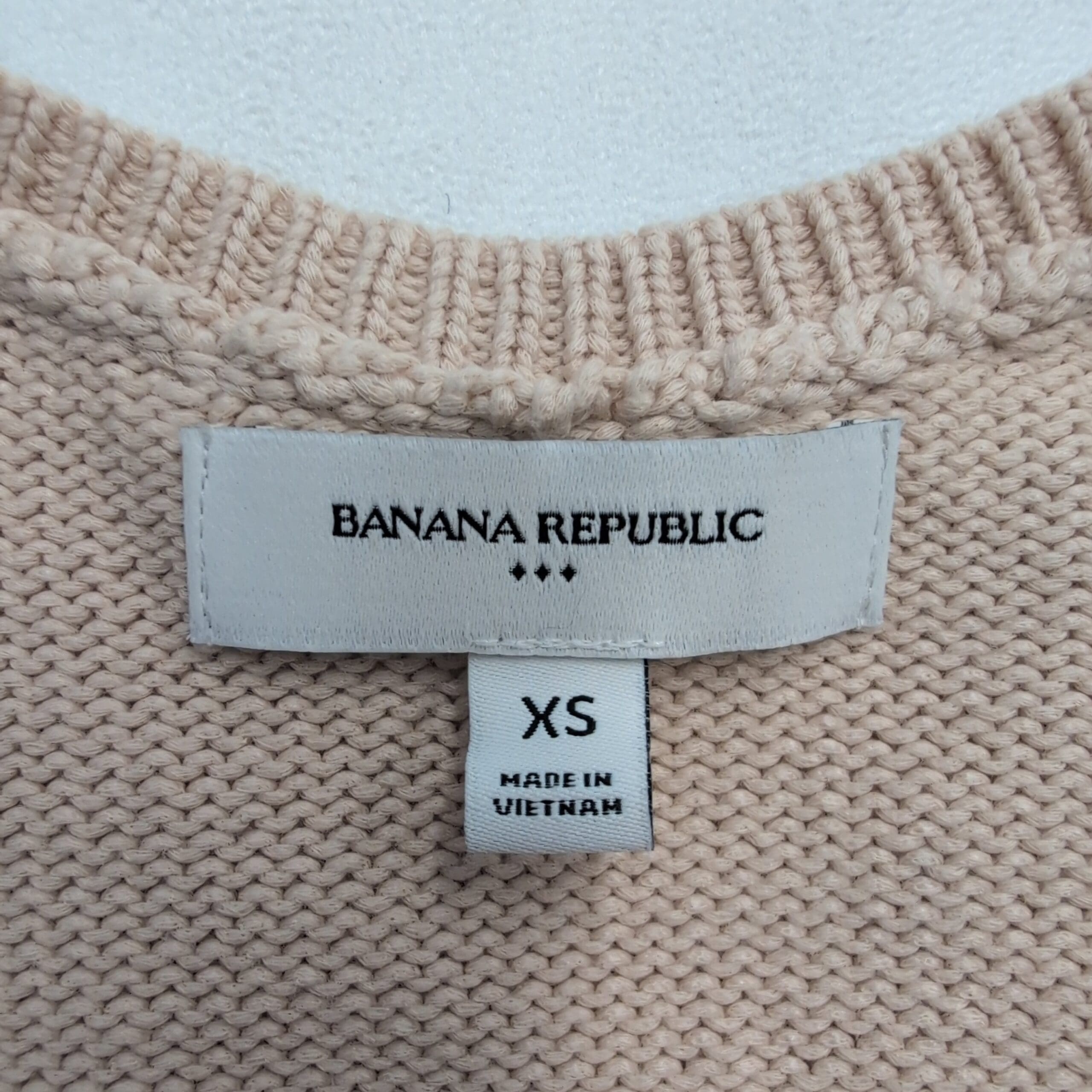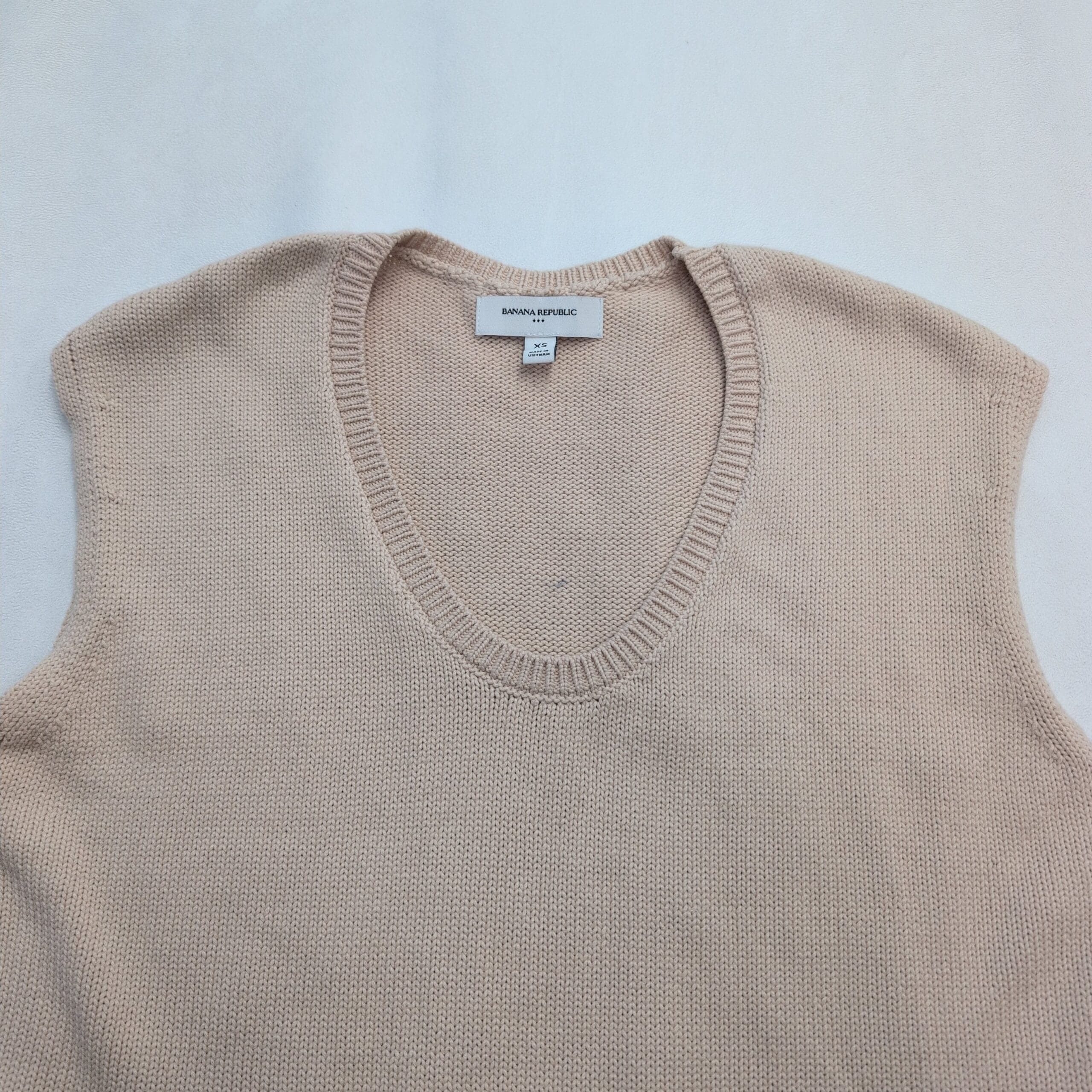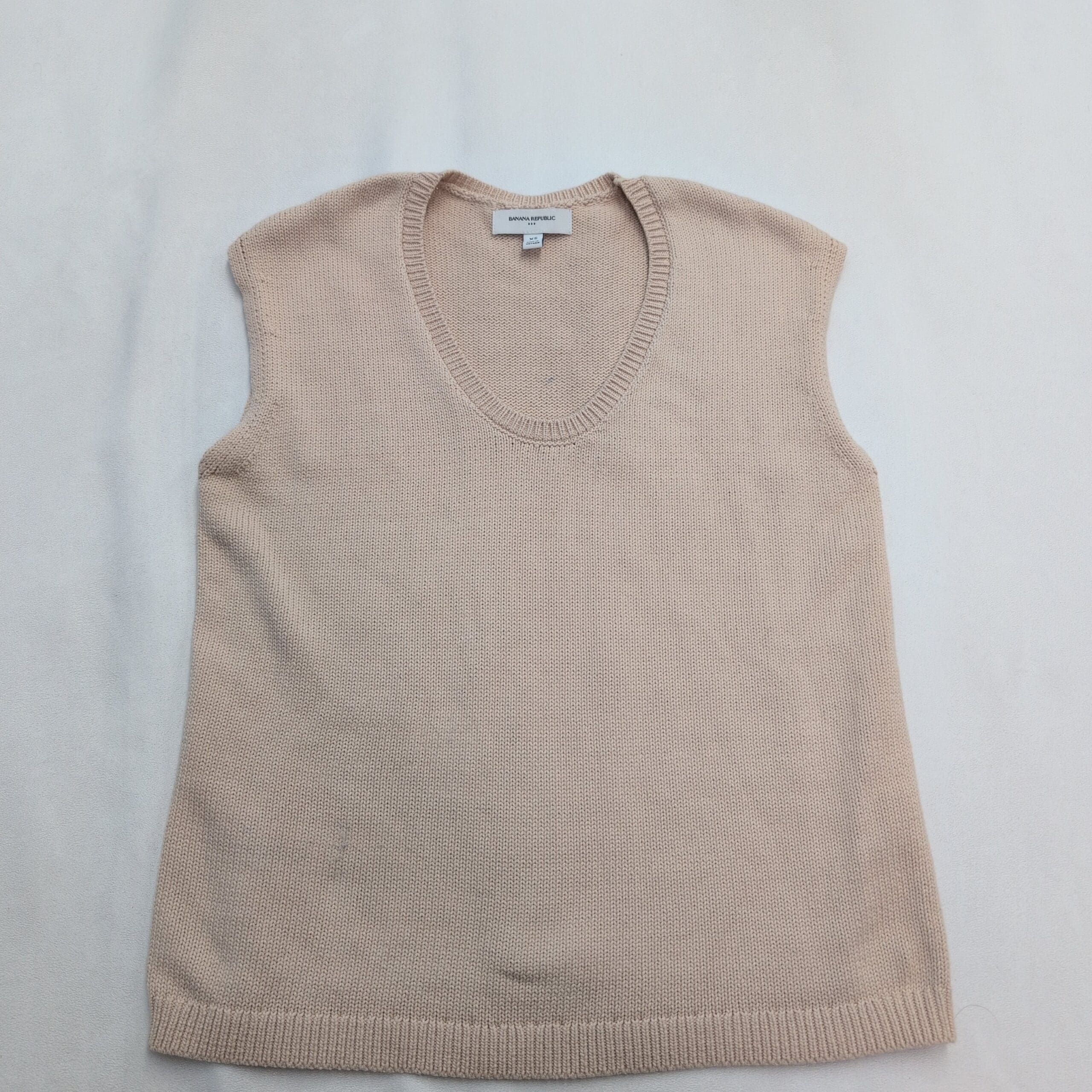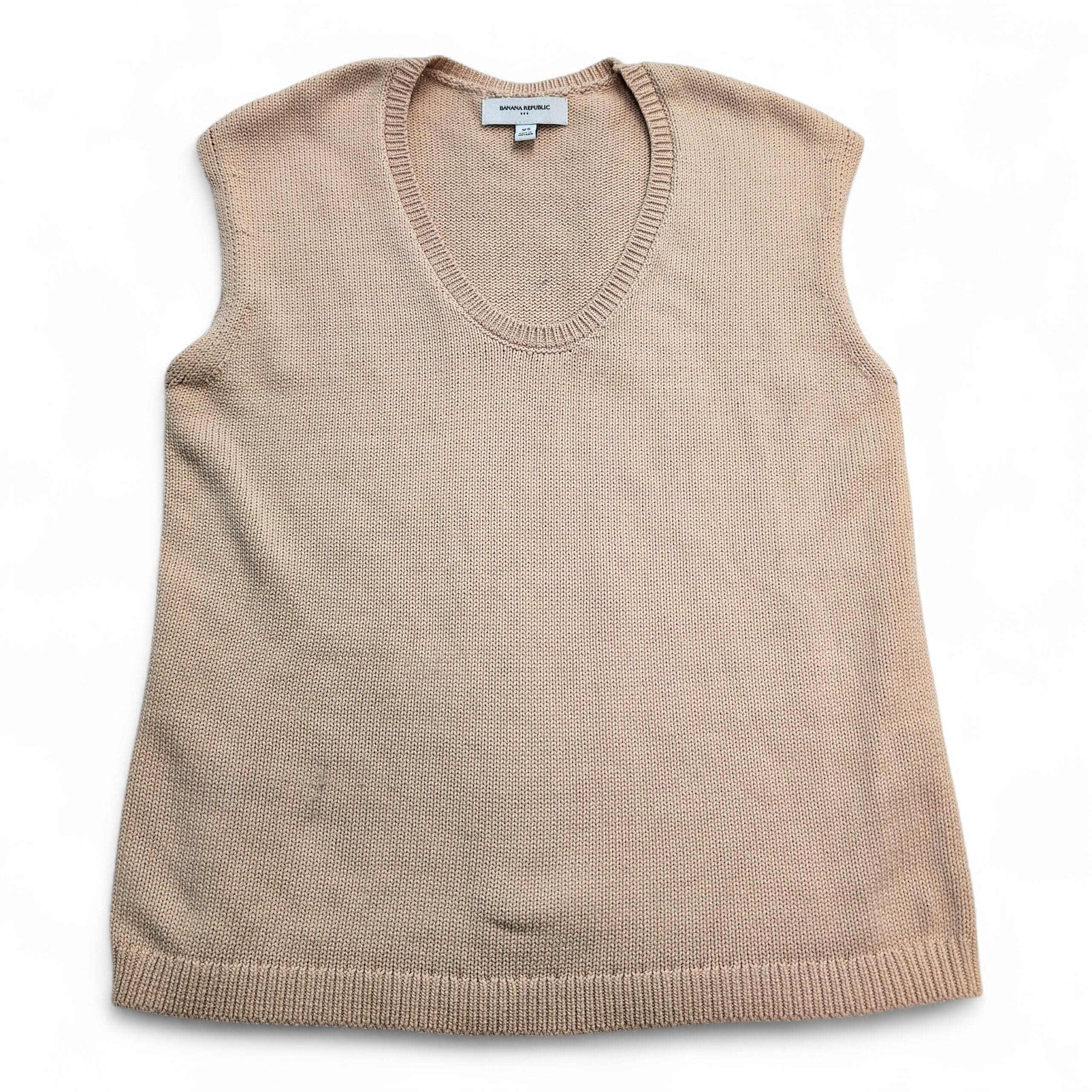 Classic Banana Republic sleeveless V-neck sweater vest in a versatile tan shade. Knit construction with ribbed neckline and hem offers a clean, polished look—perfect layered over a button-down or tee, or worn solo for warmer days. Size XS (standard). Gently used condition and free of major rips, tears, or stains. Quality note: minor pilling consistent with light wear.