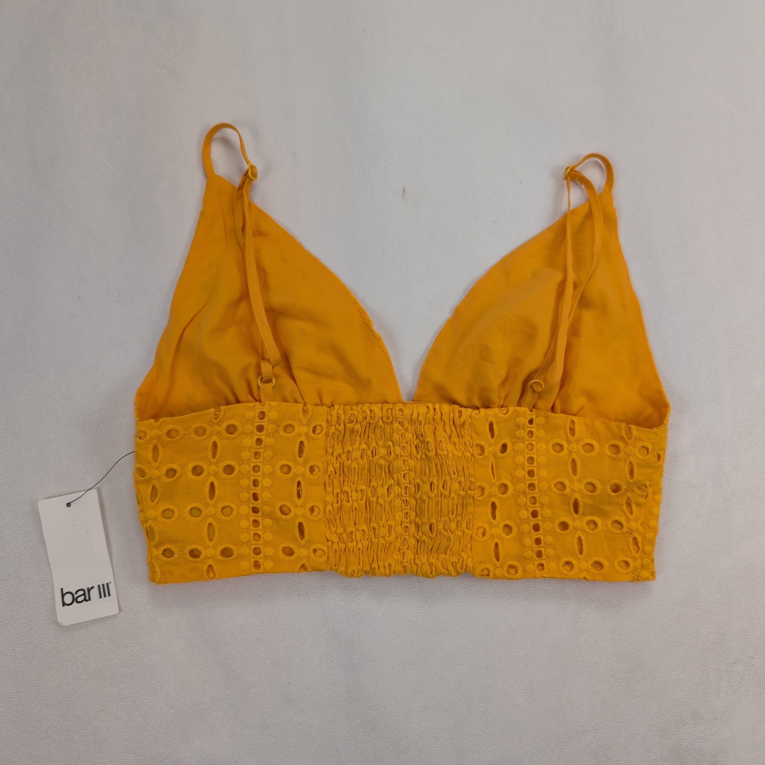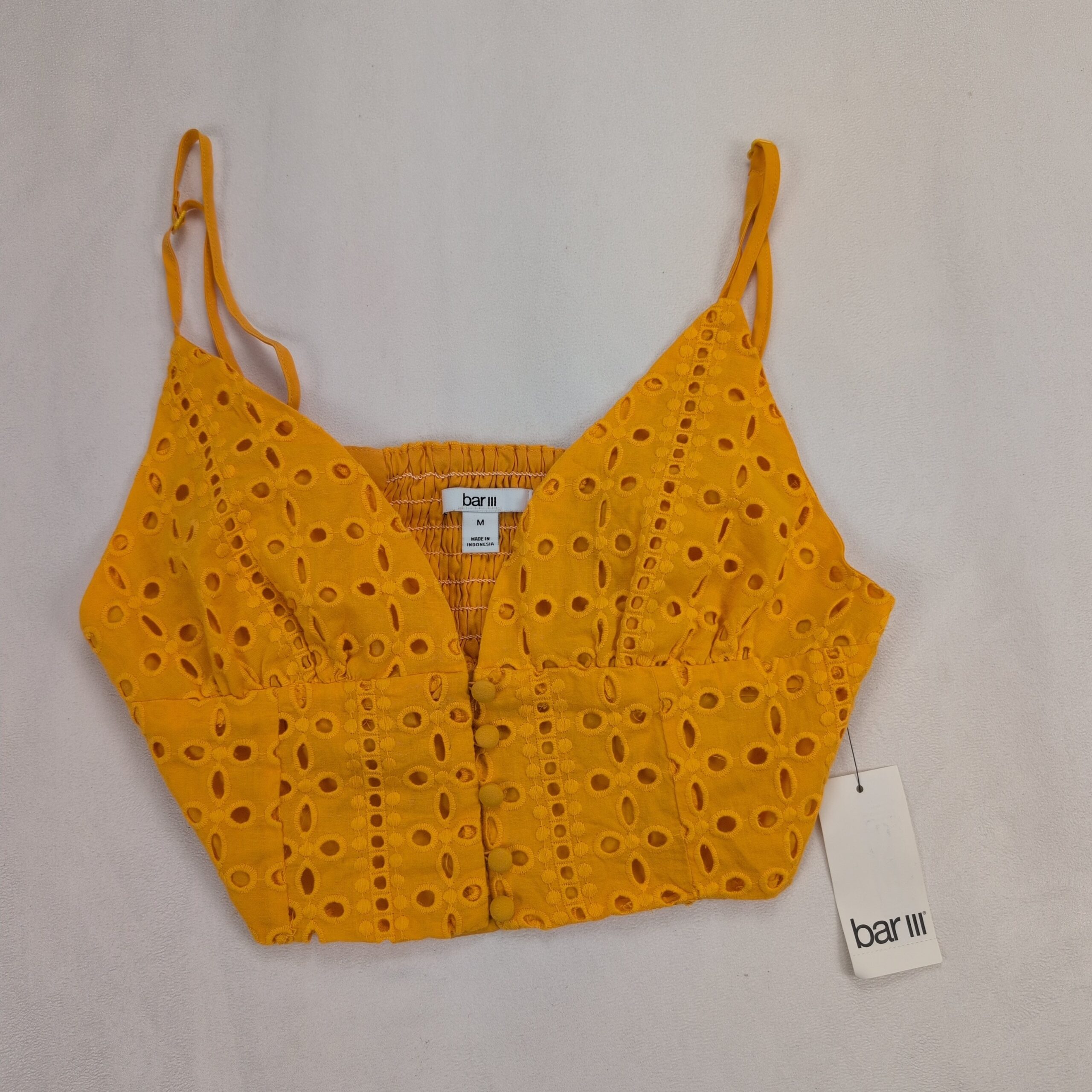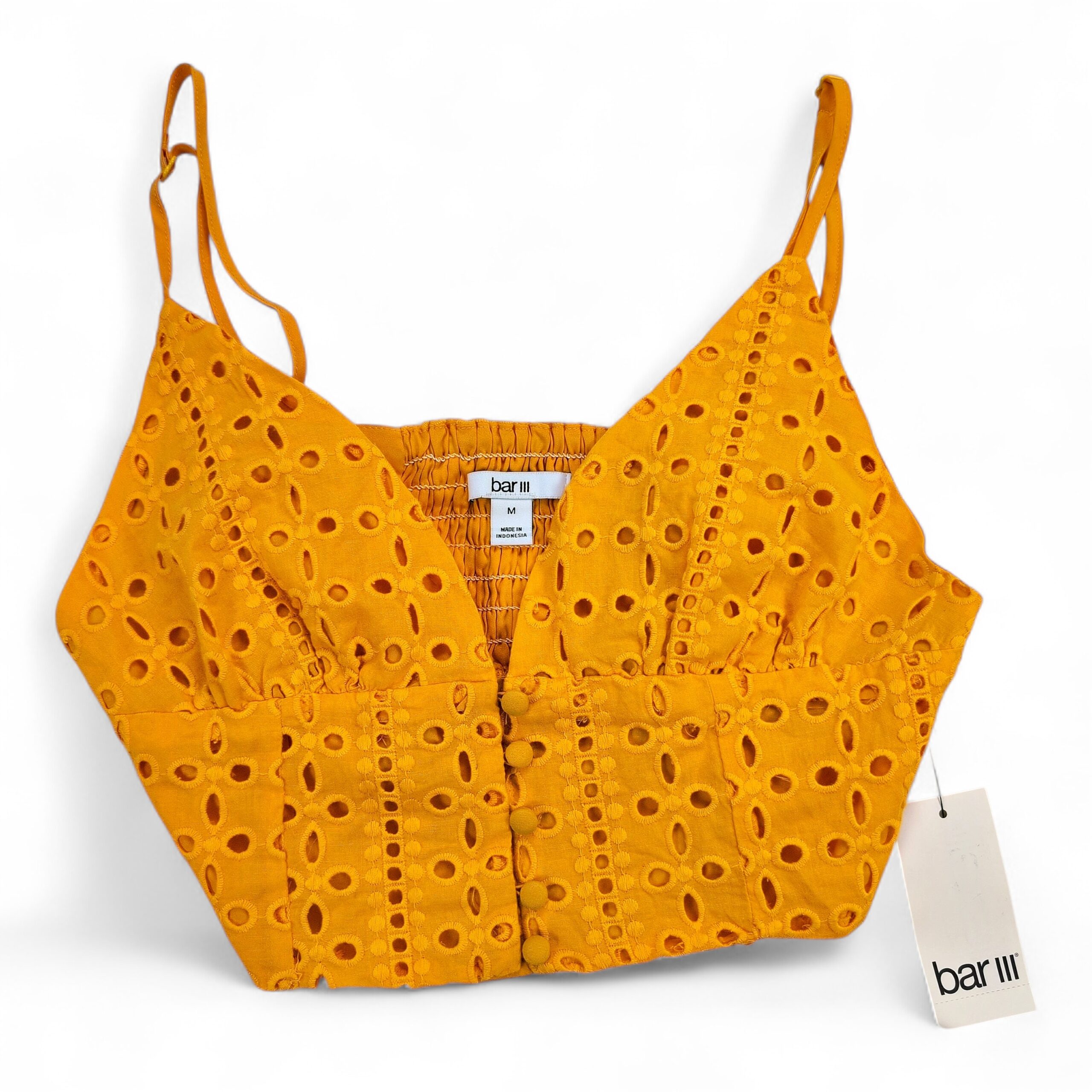 Bar III mustard yellow eyelet (broderie anglaise) cropped cami top in size M. Features fabric-covered button-front detail, adjustable spaghetti straps, and a smocked back panel for added stretch and comfort. Lightweight, summery piece perfect for pairing with high-waist jeans, skirts, or layering under a jacket.