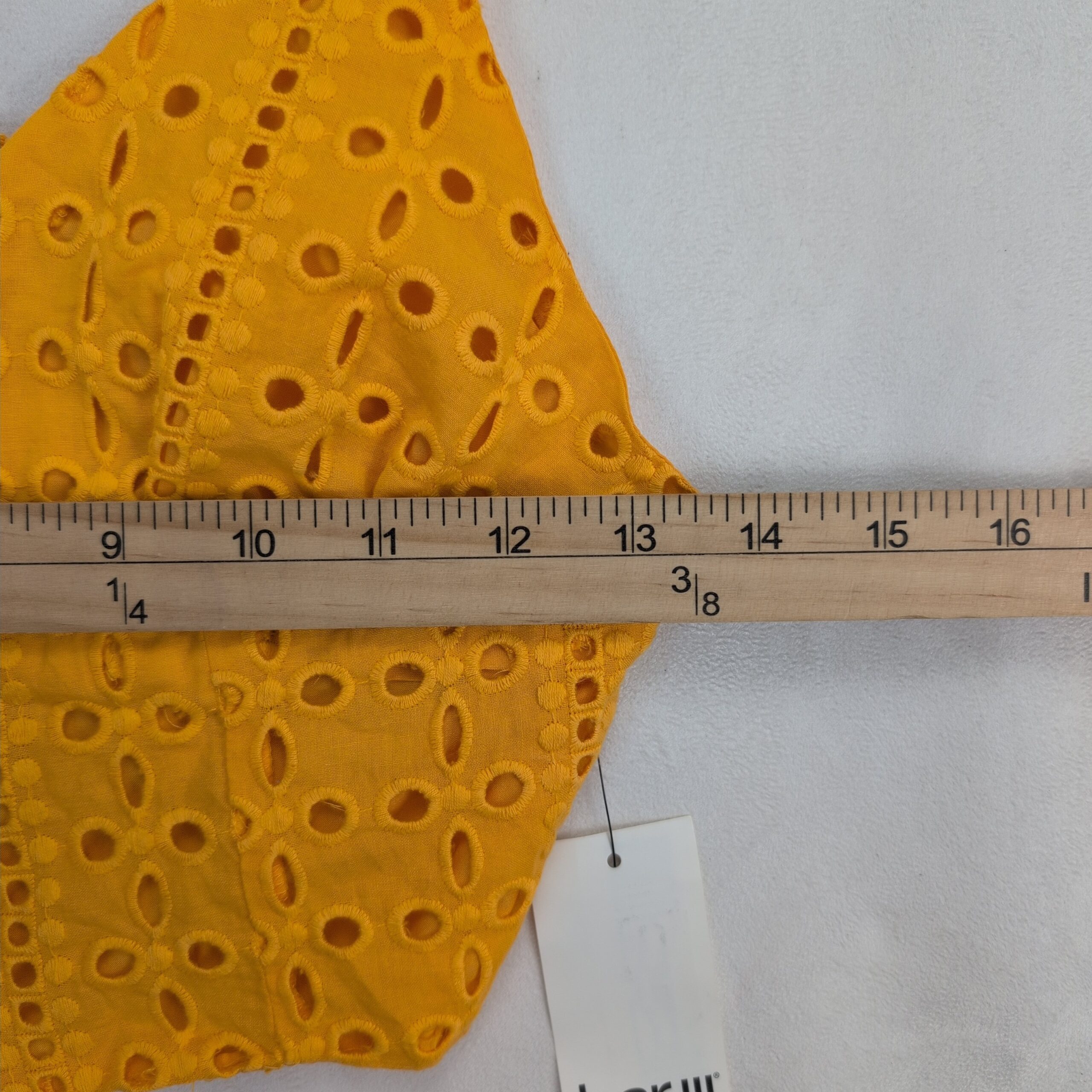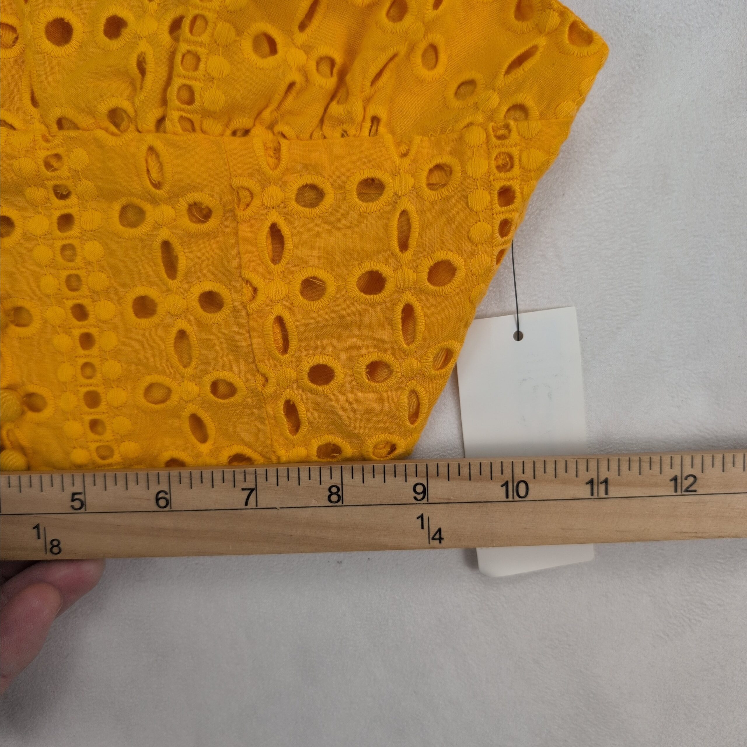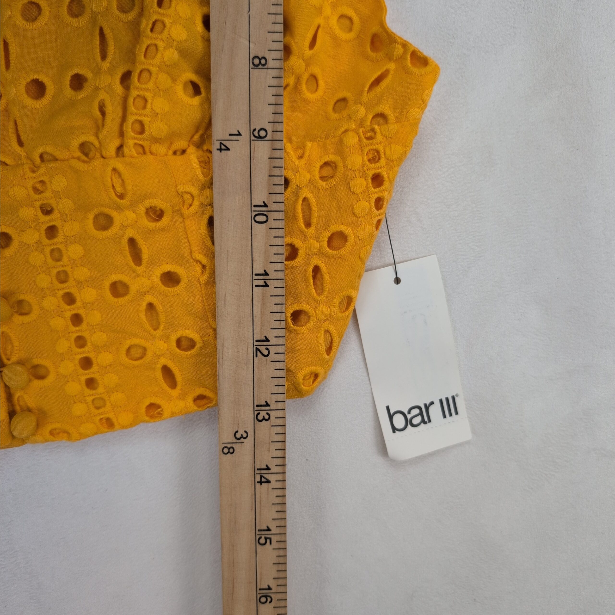 Bar III mustard yellow eyelet (broderie anglaise) cropped cami top in size M. Features fabric-covered button-front detail, adjustable spaghetti straps, and a smocked back panel for added stretch and comfort. Lightweight, summery piece perfect for pairing with high-waist jeans, skirts, or layering under a jacket.