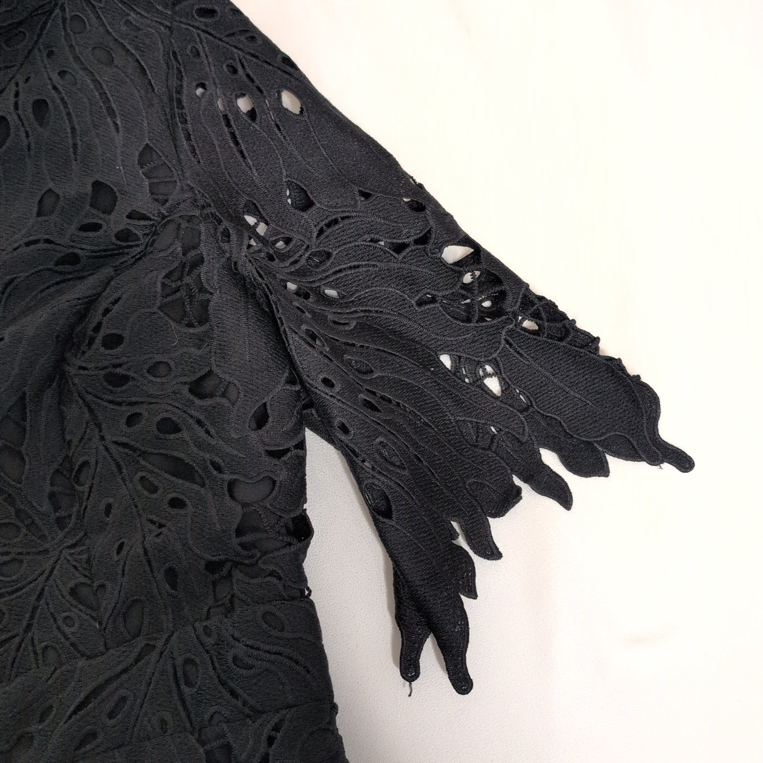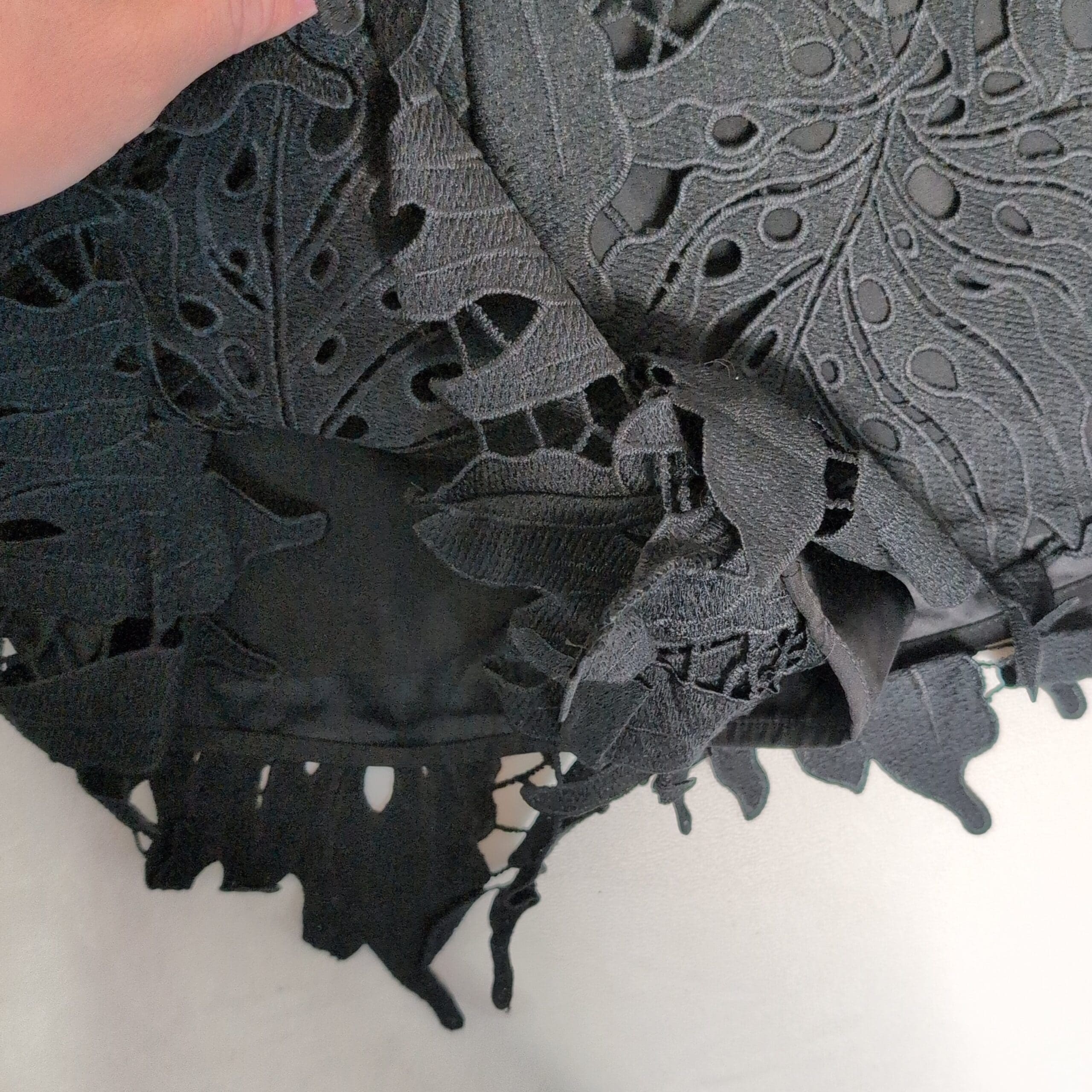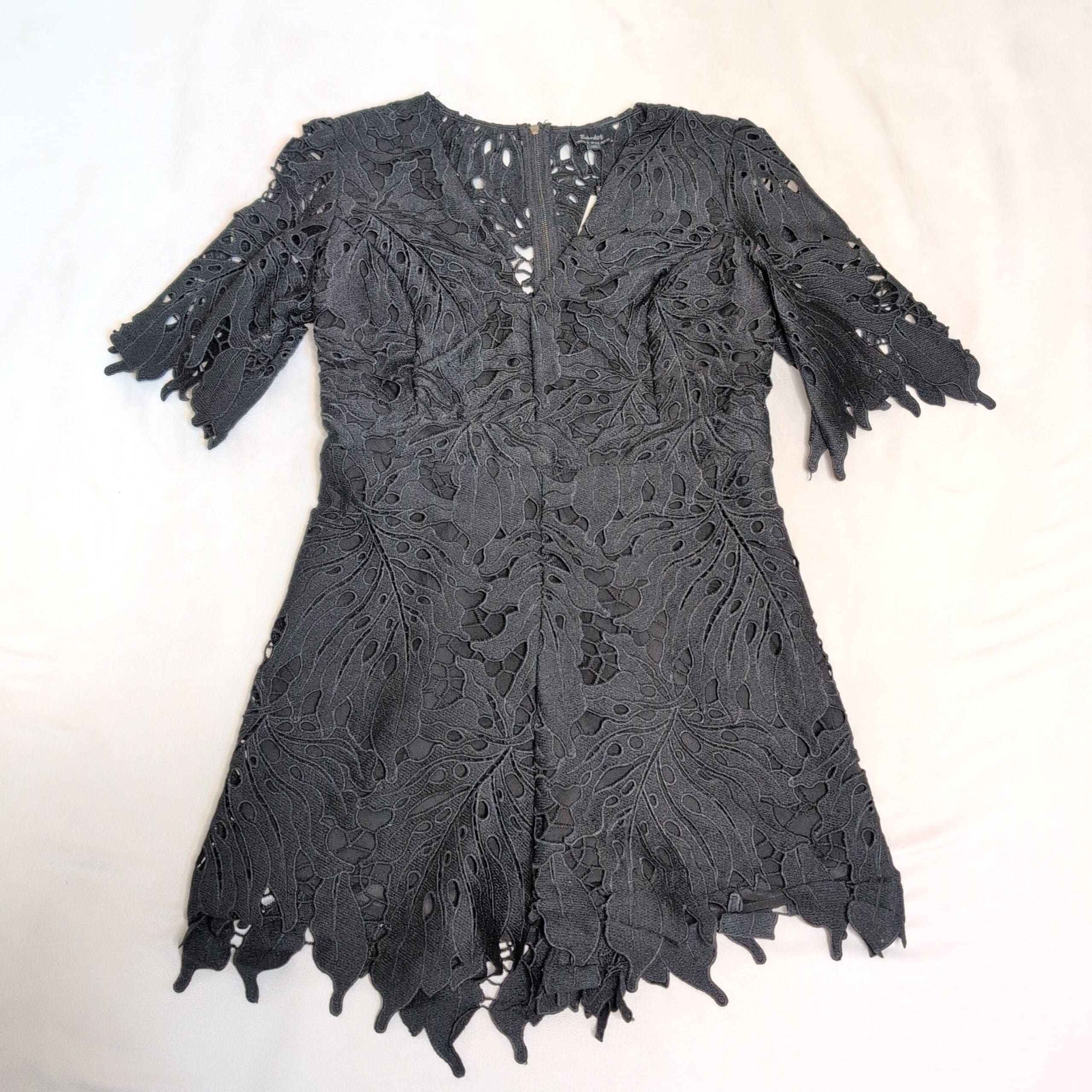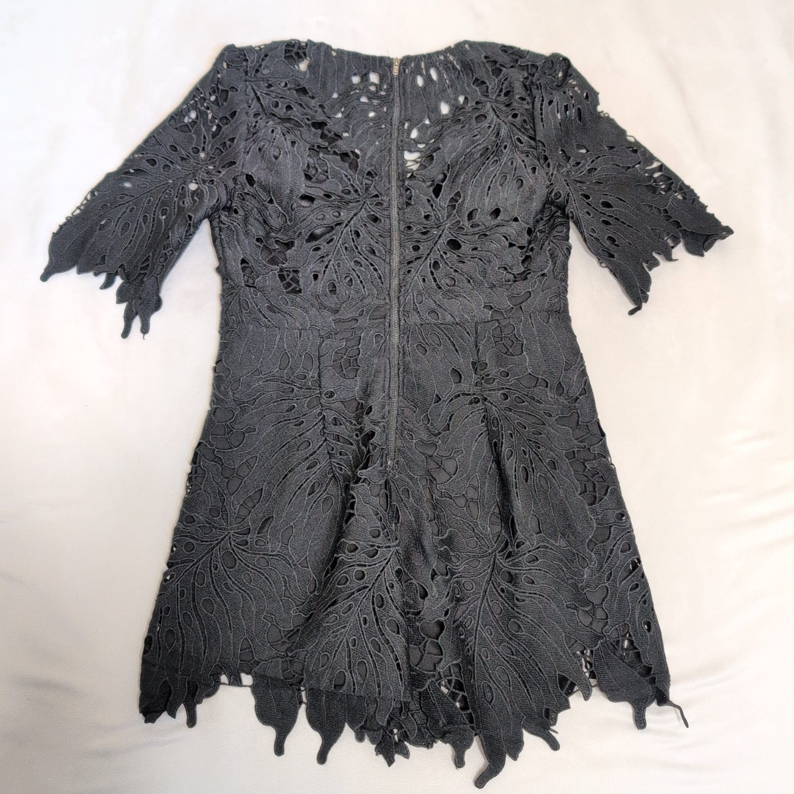 Beautiful Bardot black lace jumpsuit romper in women’s size 8. Features an intricate leaf-like lace overlay with scalloped, cutwork hem and sleeves, a V-neckline, back zipper closure, defined waist and a tailored shorts silhouette for a dressy, modern look. The body is lined for coverage while the sleeves and hem retain delicate semi-sheer detailing for added texture and visual interest.