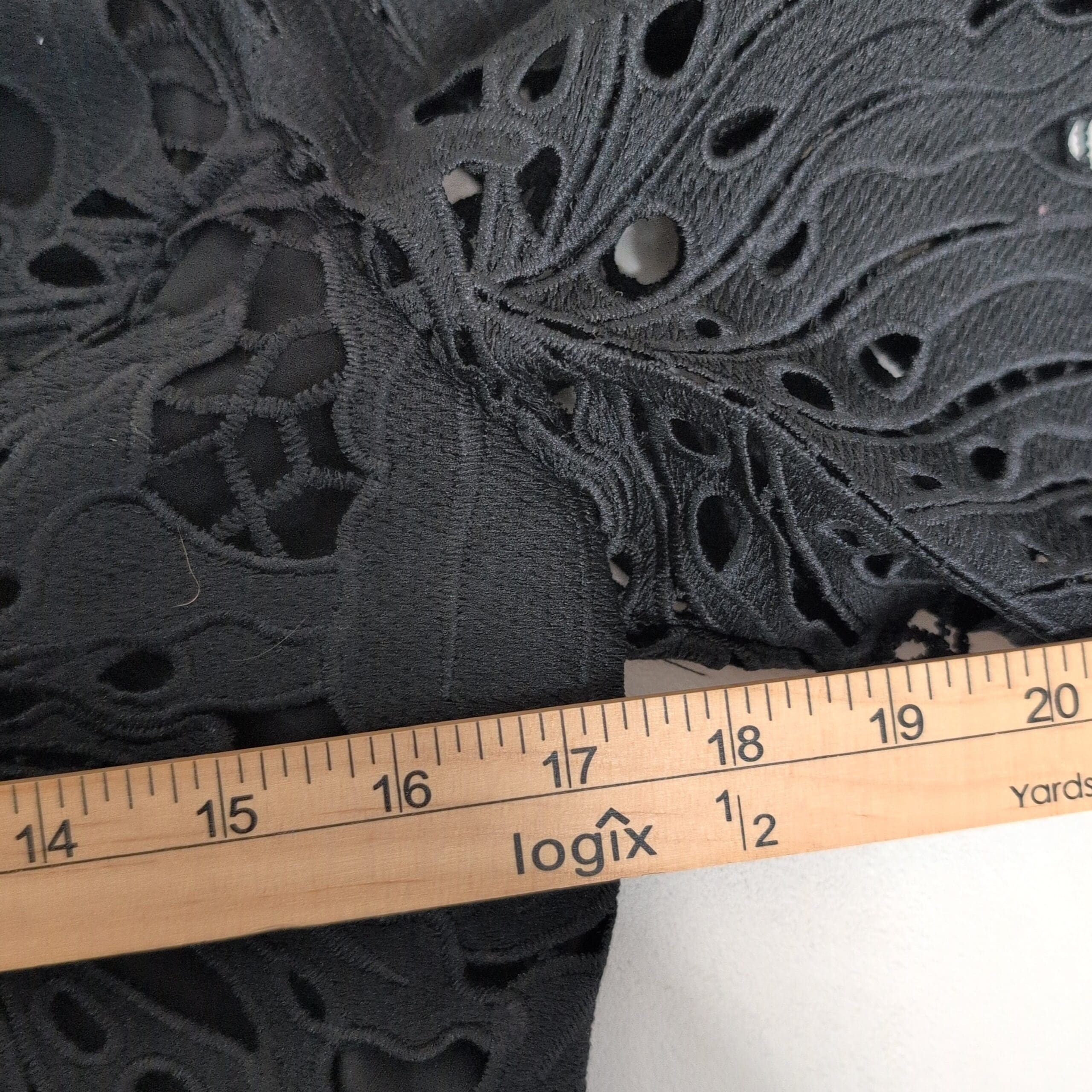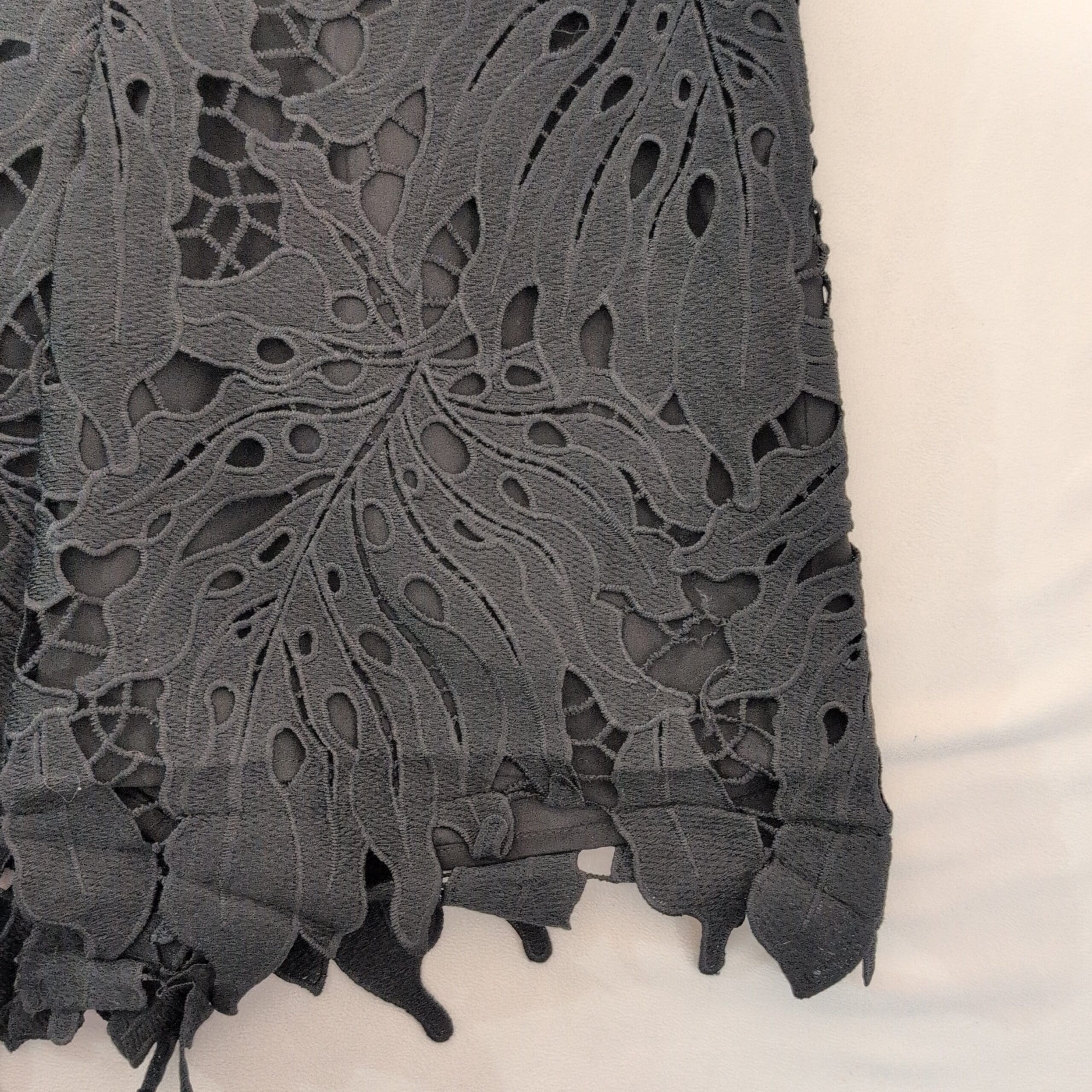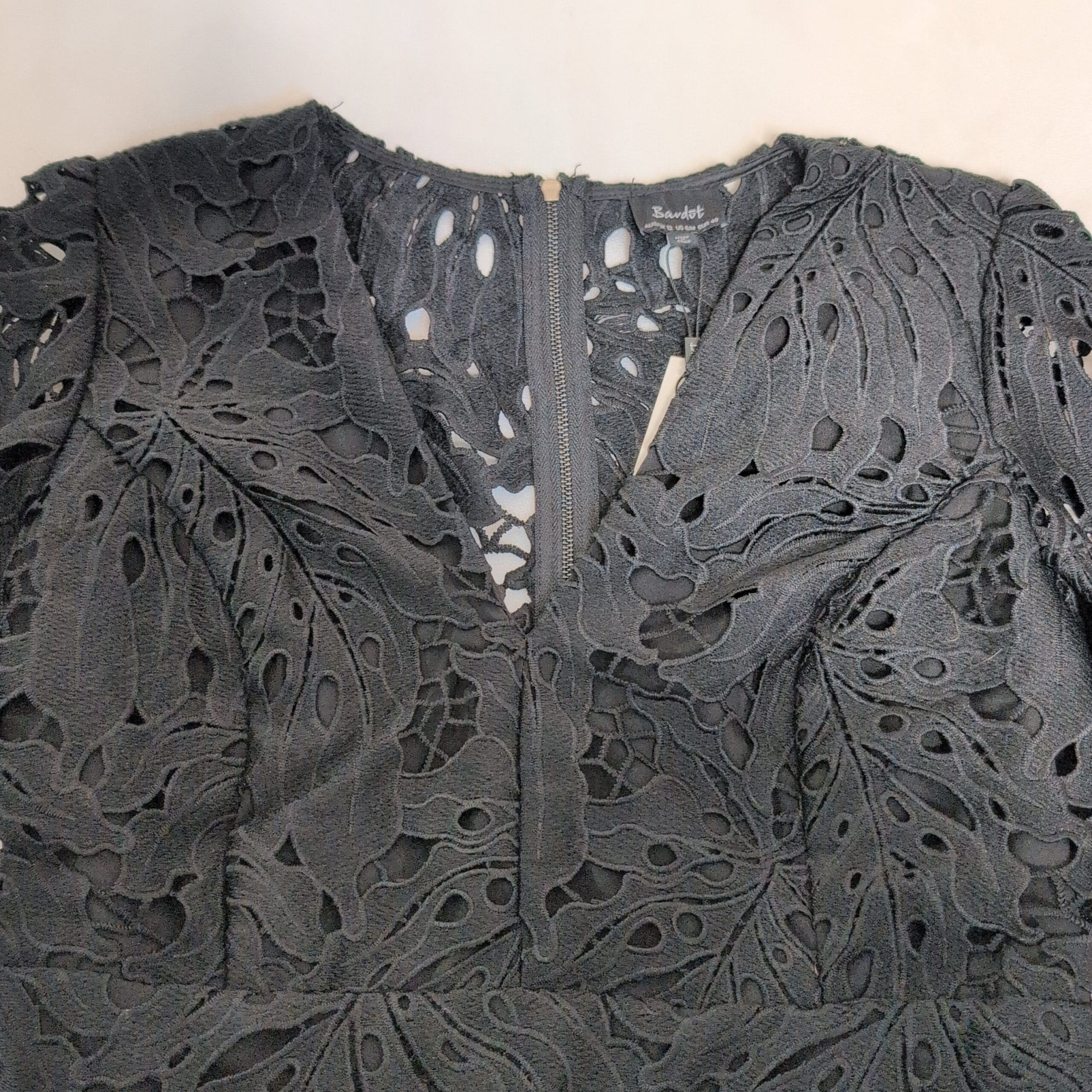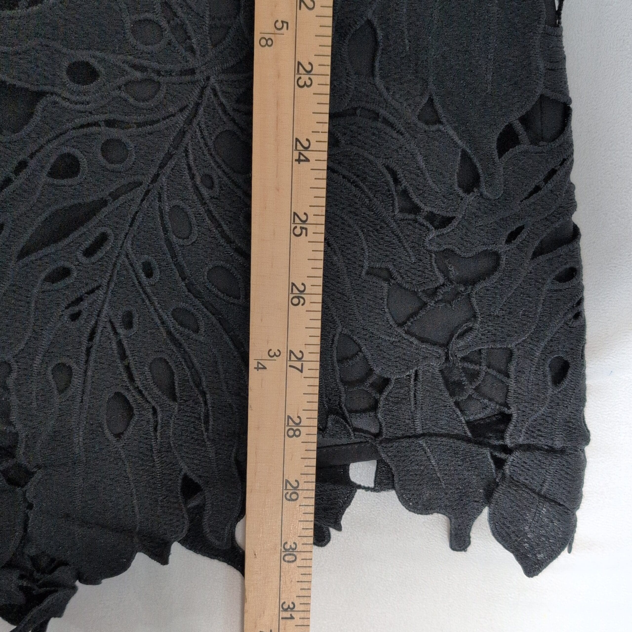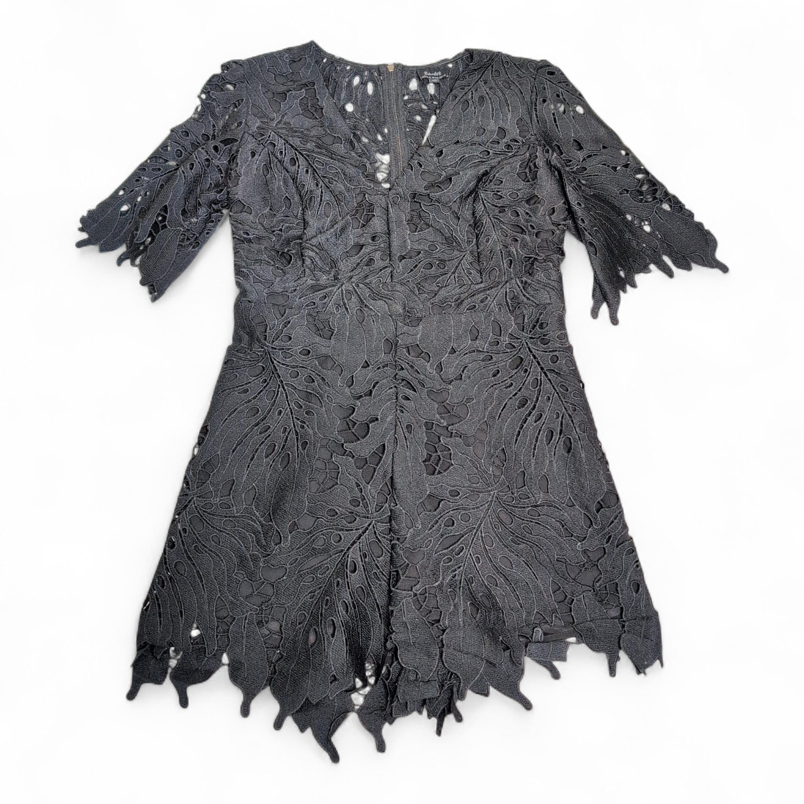 Beautiful Bardot black lace jumpsuit romper in women’s size 8. Features an intricate leaf-like lace overlay with scalloped, cutwork hem and sleeves, a V-neckline, back zipper closure, defined waist and a tailored shorts silhouette for a dressy, modern look. The body is lined for coverage while the sleeves and hem retain delicate semi-sheer detailing for added texture and visual interest.
