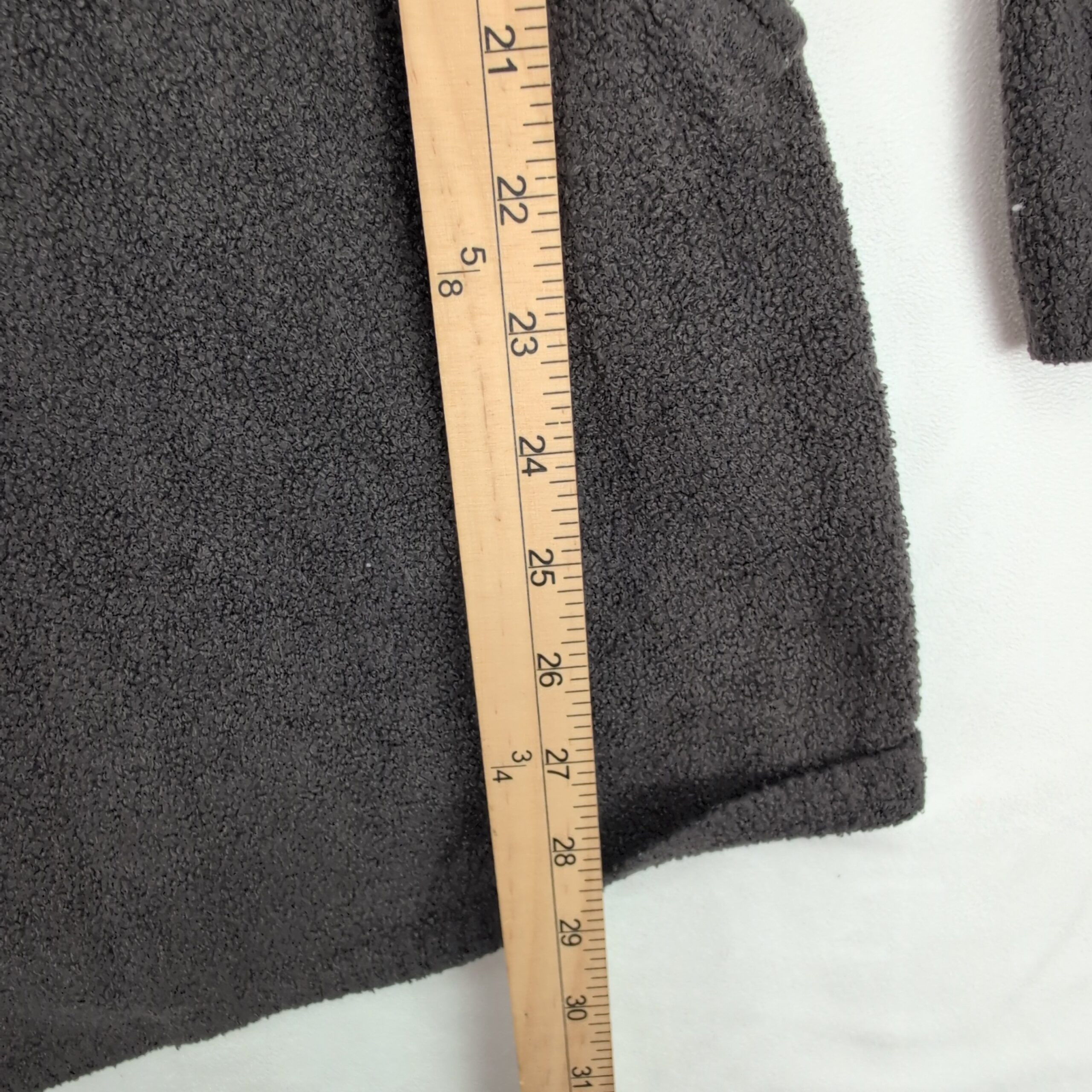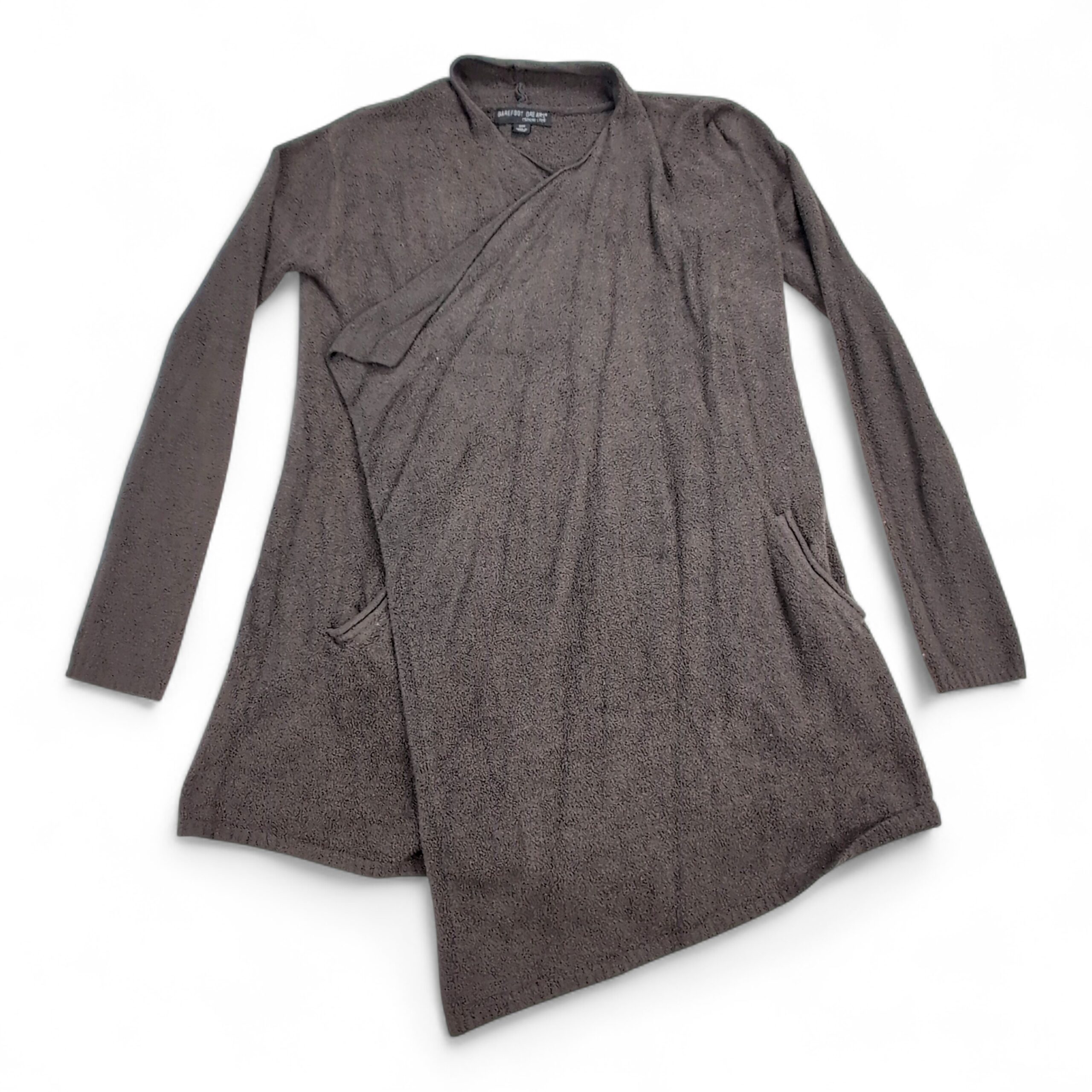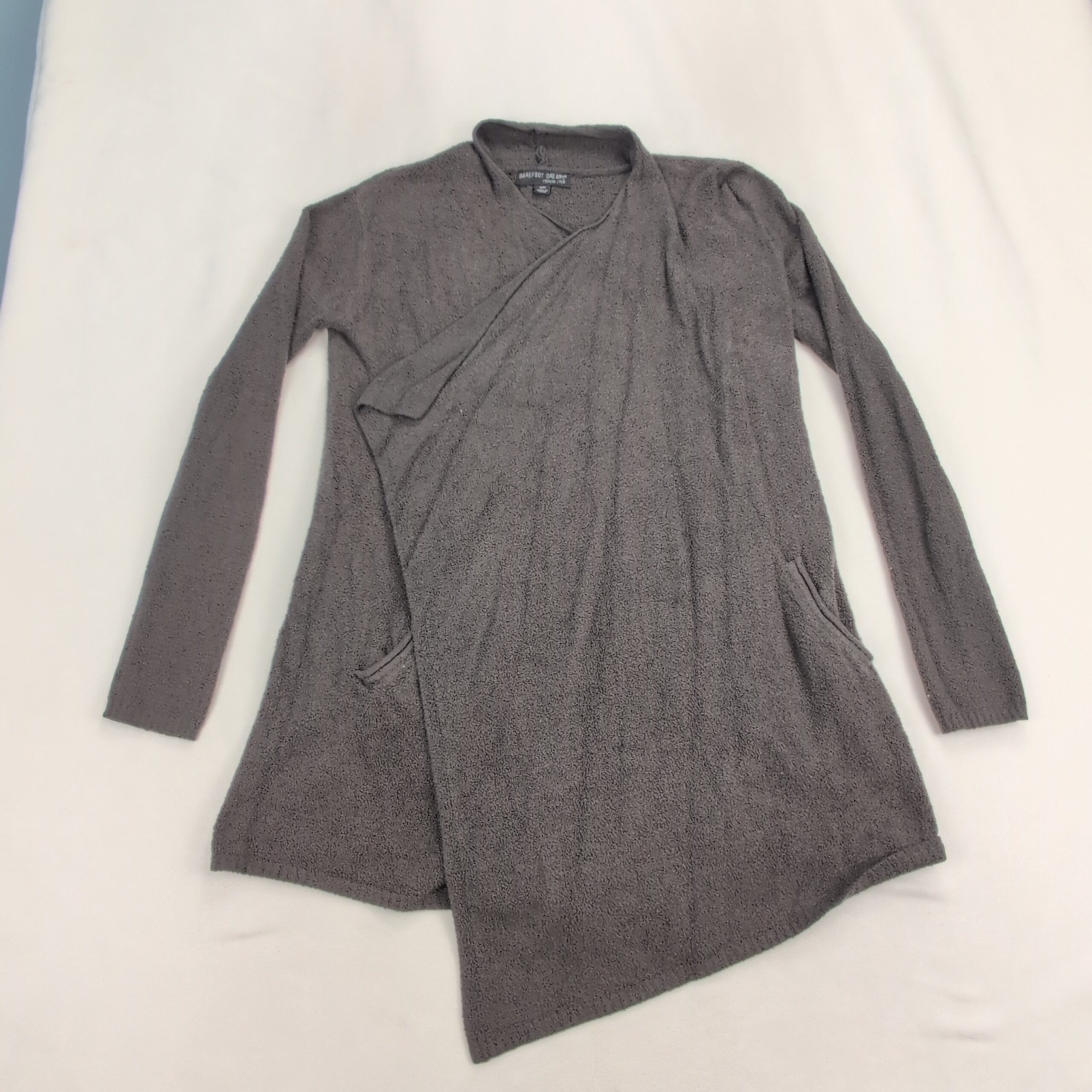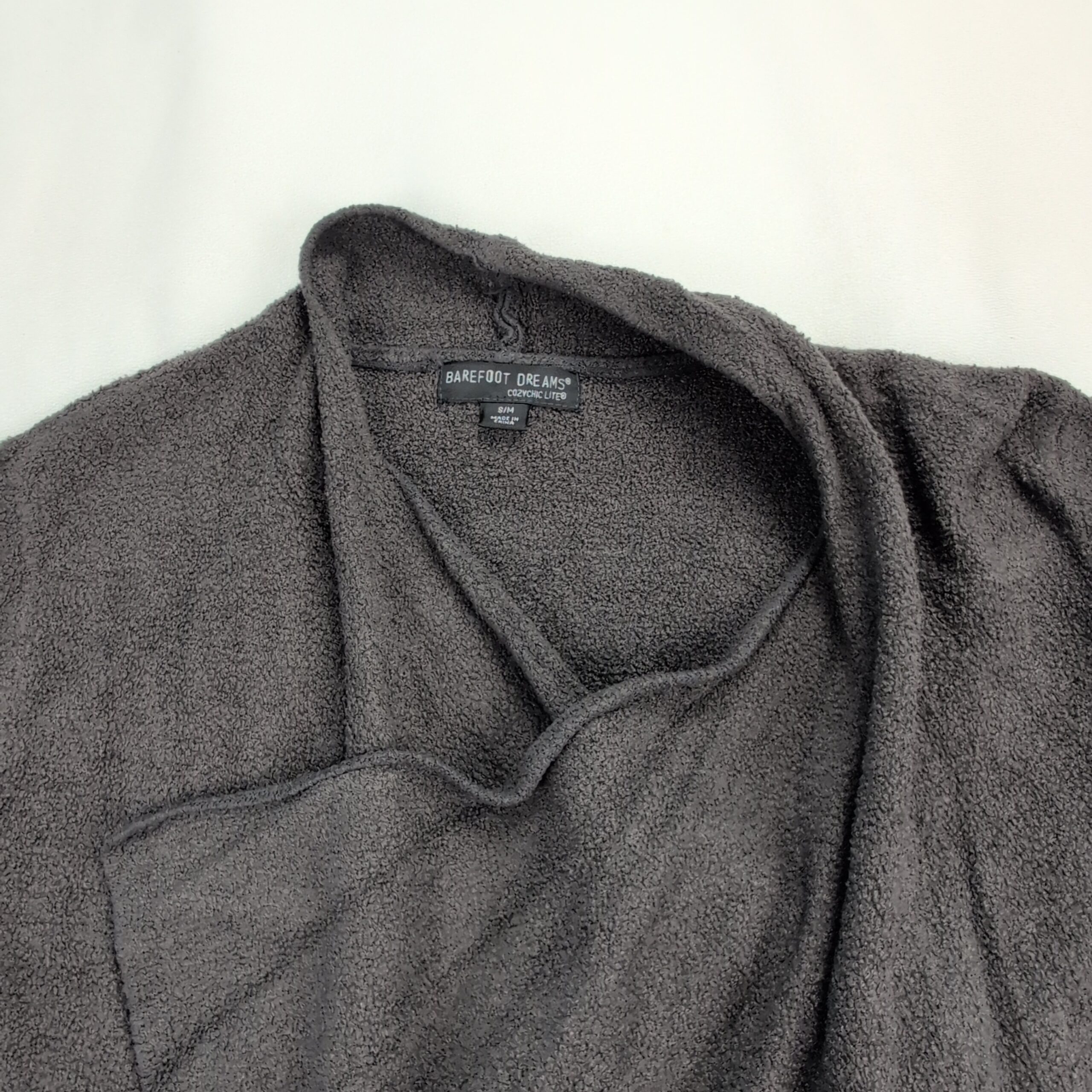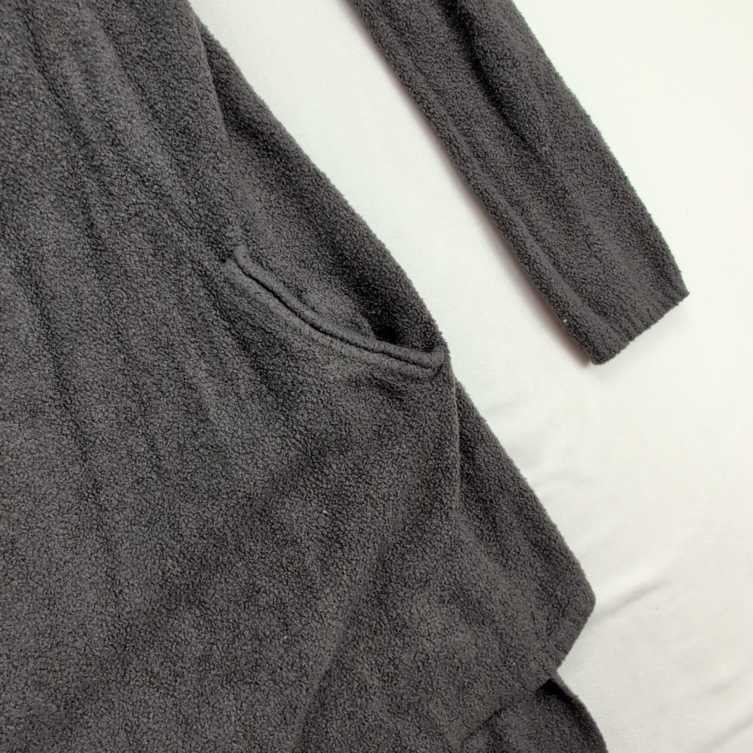 Barefoot Dreams CozyChic wrap cardigan, size S, in charcoal gray. Open-front, longline silhouette with an asymmetric hem and front patch pockets — soft, plush knit perfect for layering. Lightweight yet cozy and versatile for everyday wear. Excellent used condition; free of major rips, tears, stains, or flaws. Typical gentle wear consistent with normal use.