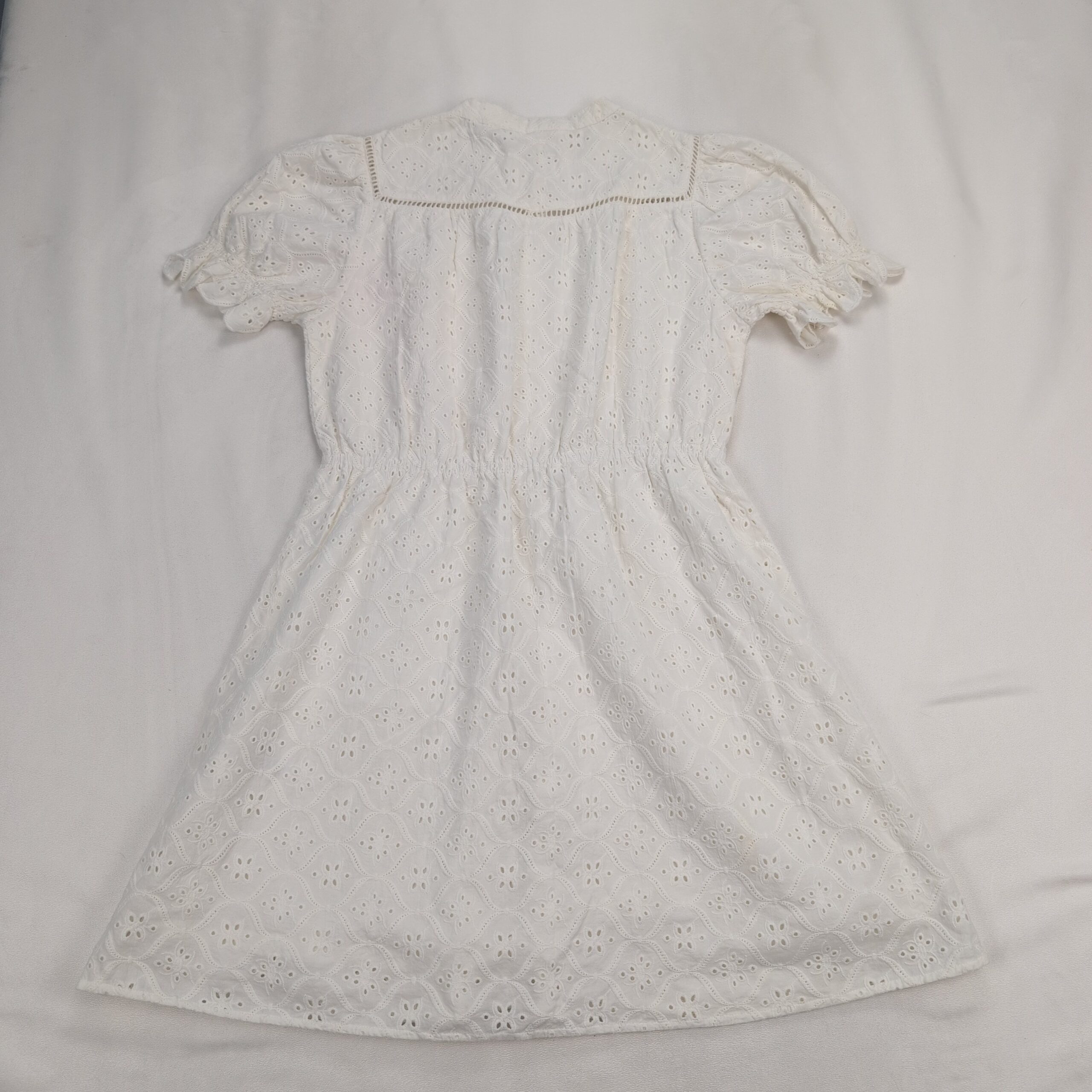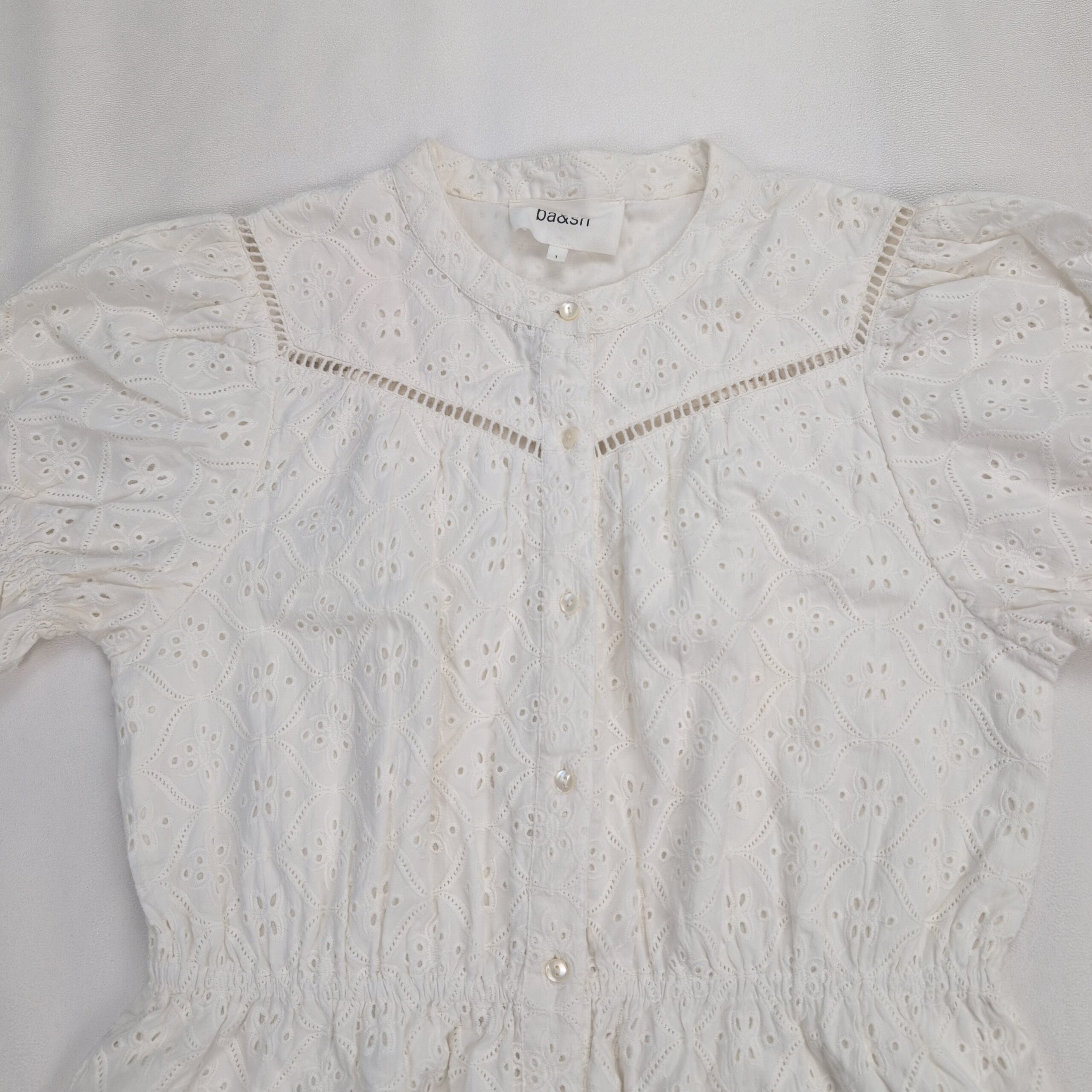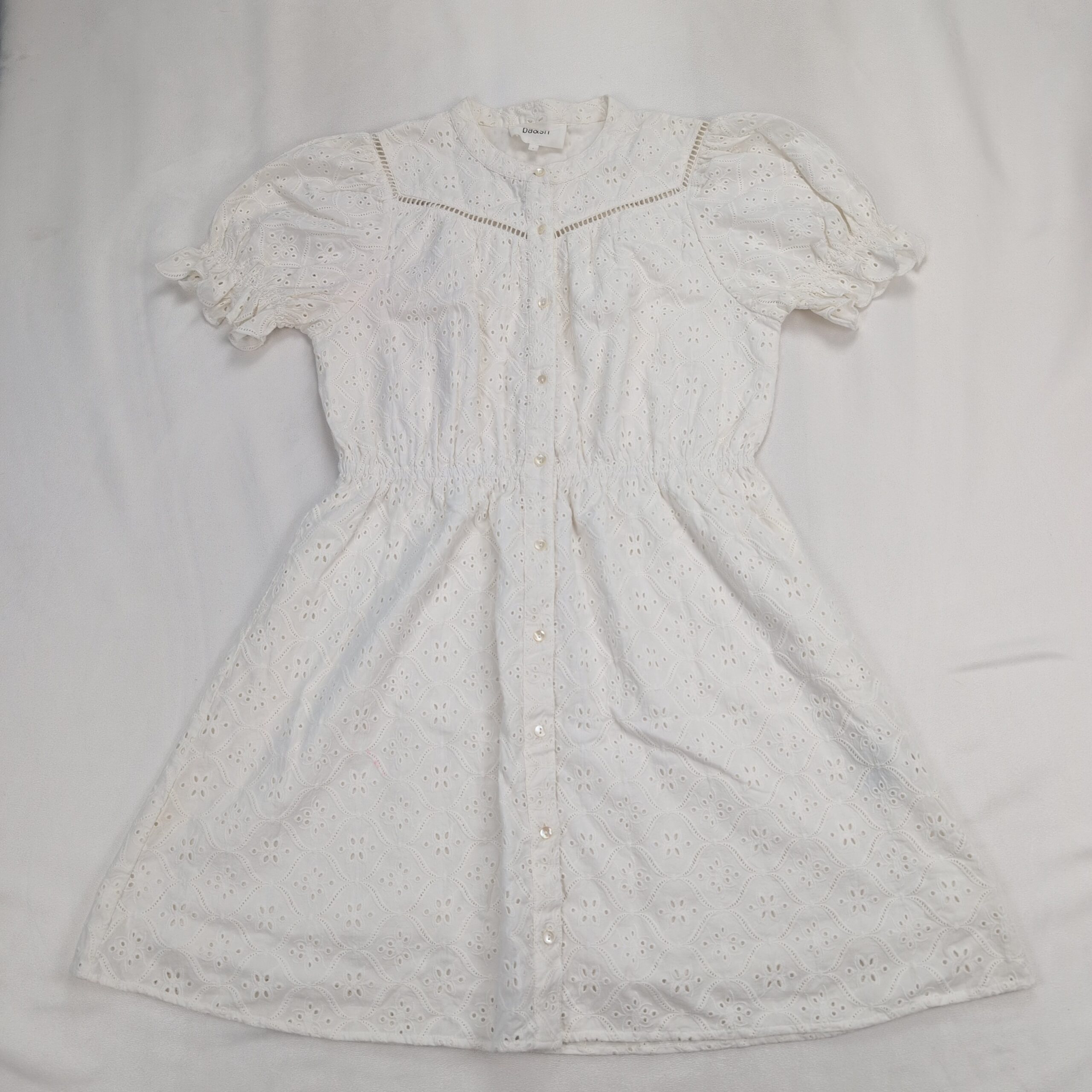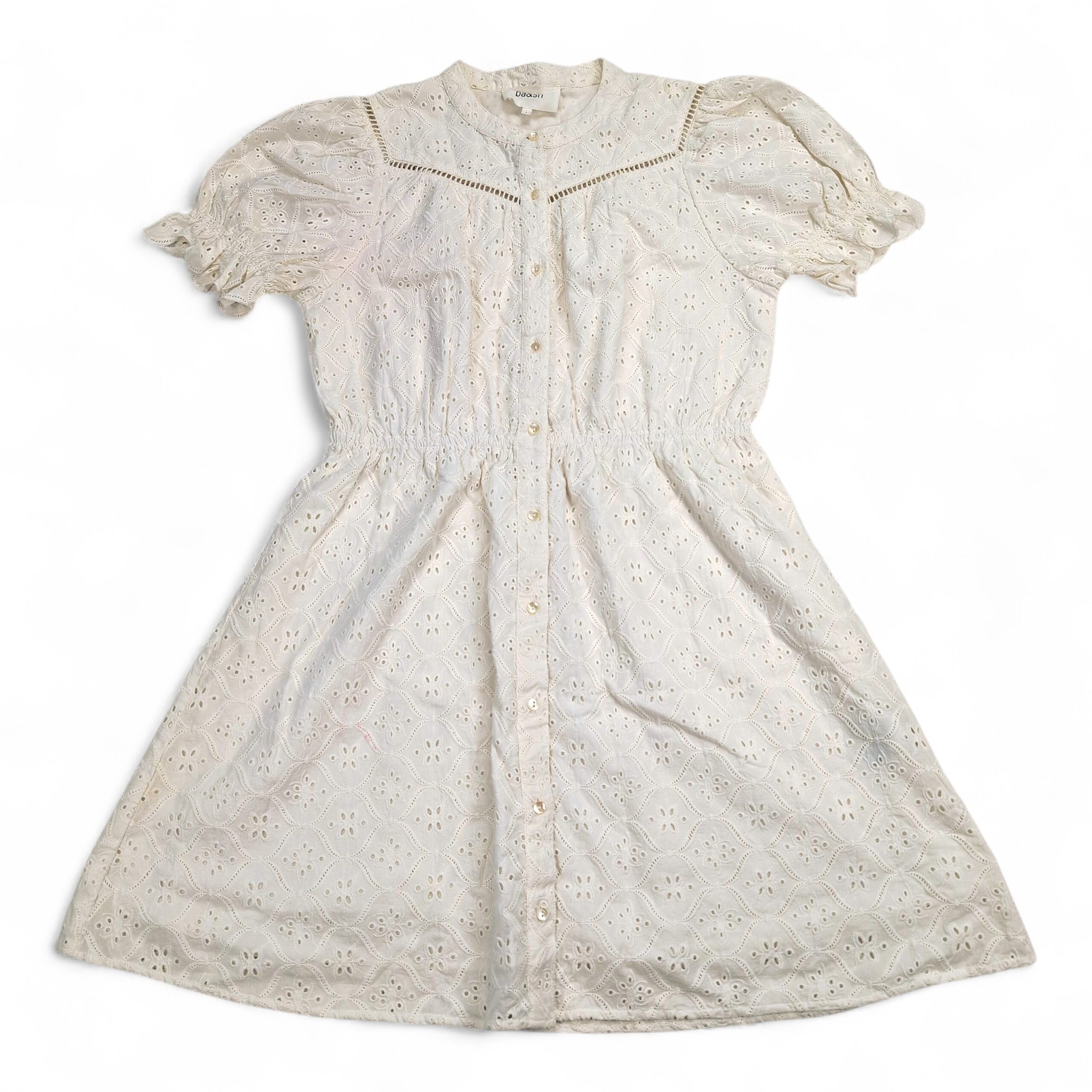 Ba&sh white broderie anglaise (eyelet) button-front mini dress in size S. Lightweight cotton eyelet fabric with ladder-lace detail at the yoke, elasticized waist for a defined silhouette, and short puff sleeves with subtle tie detail. Pearl-effect buttons down the front and a gentle A-line skirt make this a versatile warm-weather piece. Condition: Excellent used condition — free of major rips, tears, stains, or flaws; normal light wear consistent with gentle use.