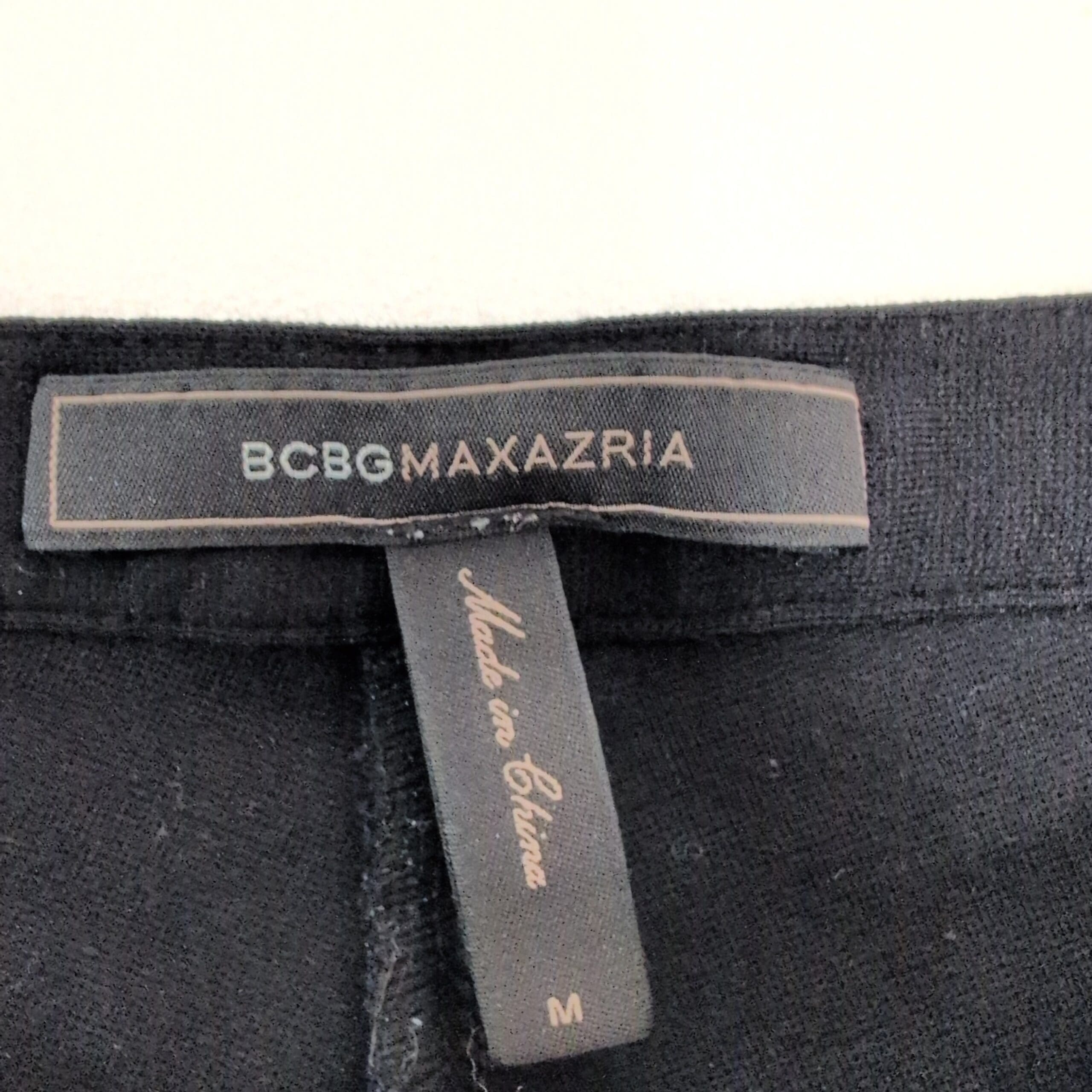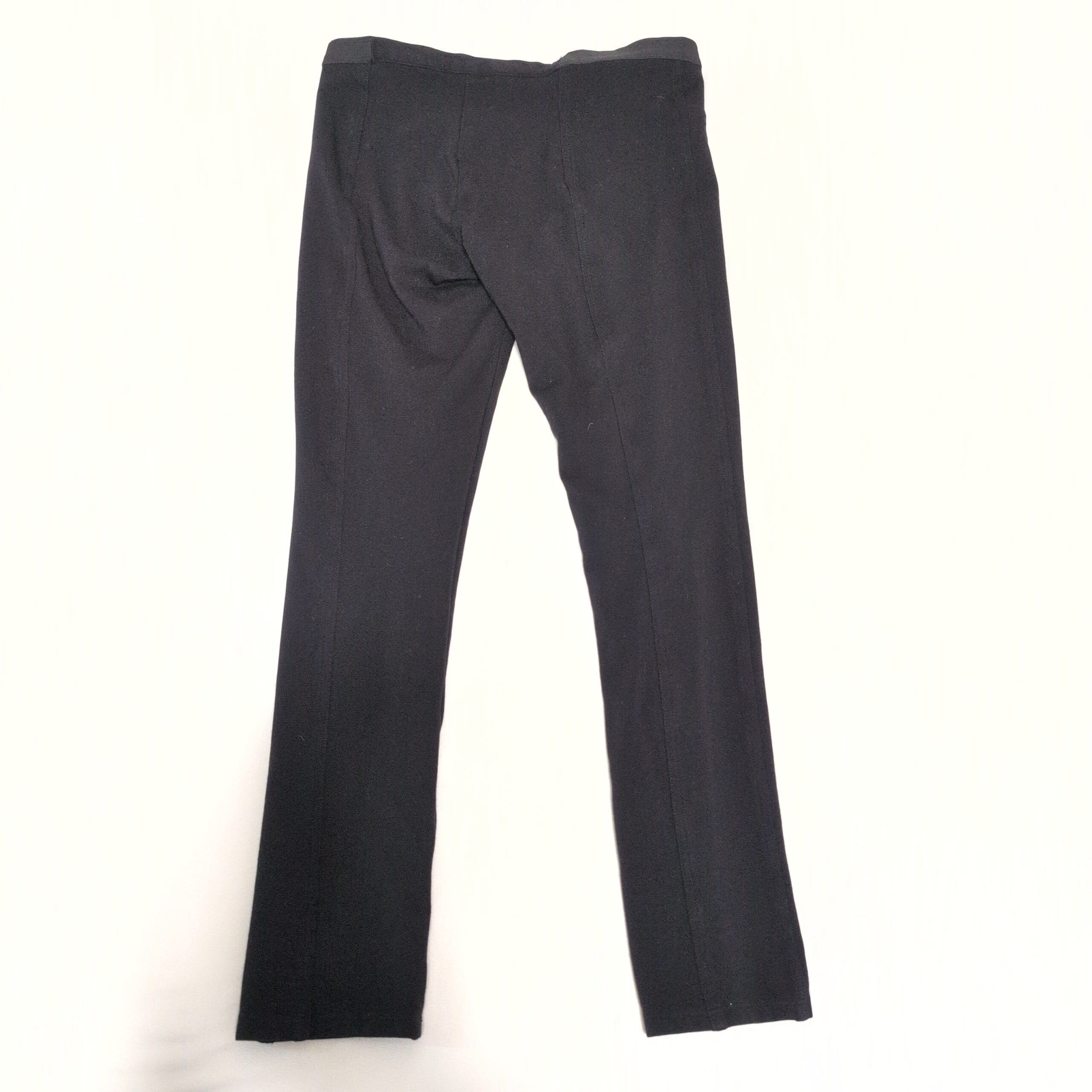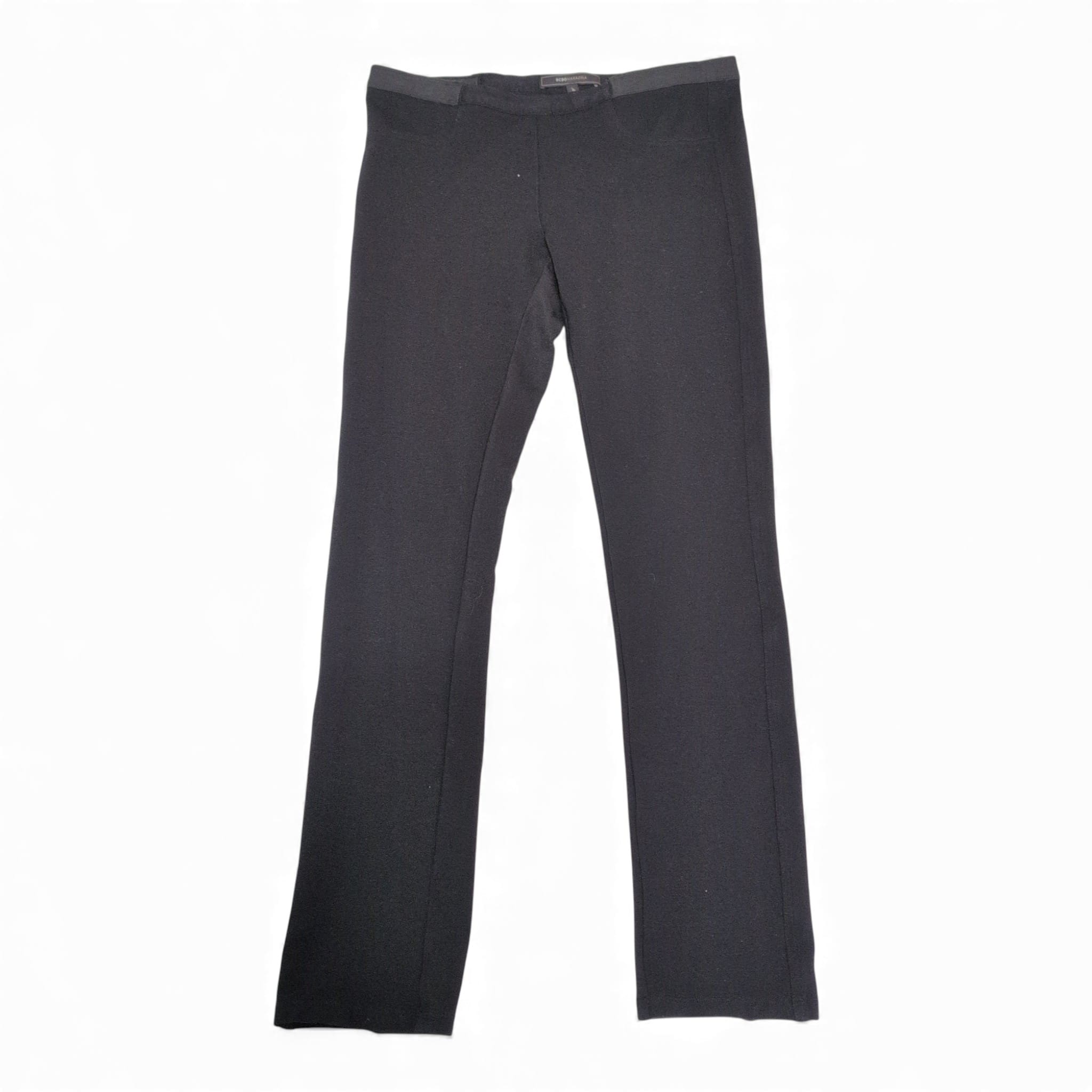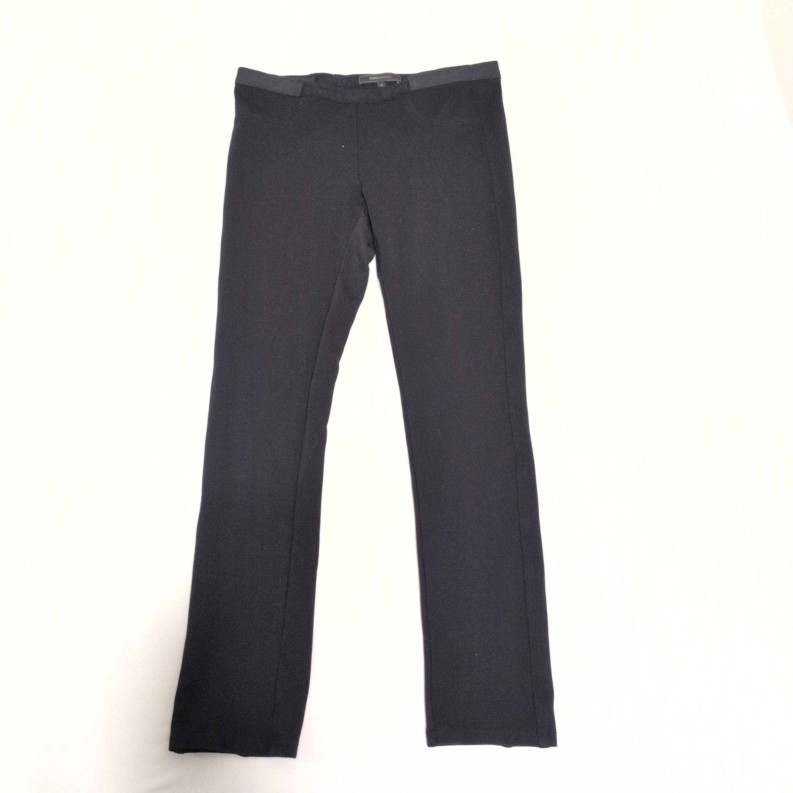 BCBGMAXAZRIA black leggings in size M (women). Sleek, straight-leg silhouette with an elastic waistband — versatile for work or weekend. Comfortable stretch with a smooth finish that pairs easily with blazers or casual tops. Gently used: minor signs of wear including light pilling and a tiny speck—please review photos for condition. No holes or major stains noted.