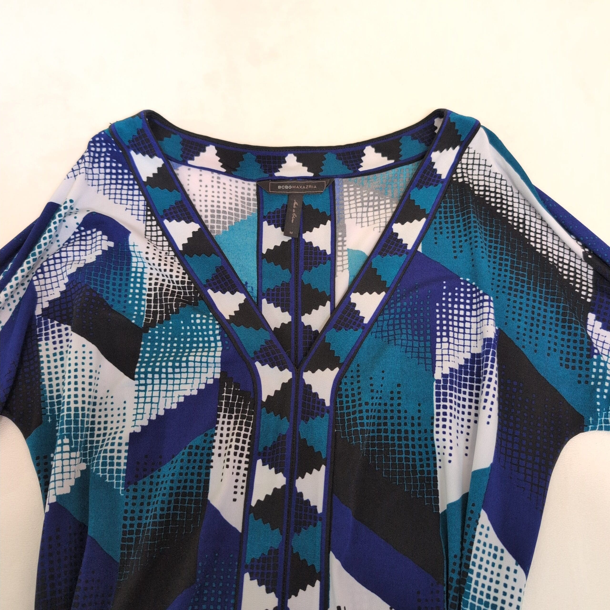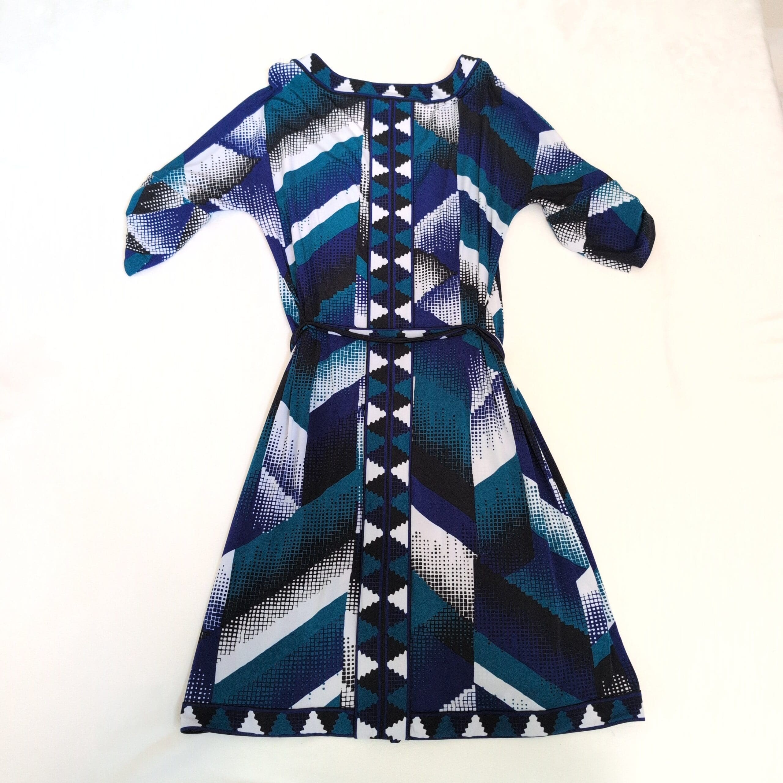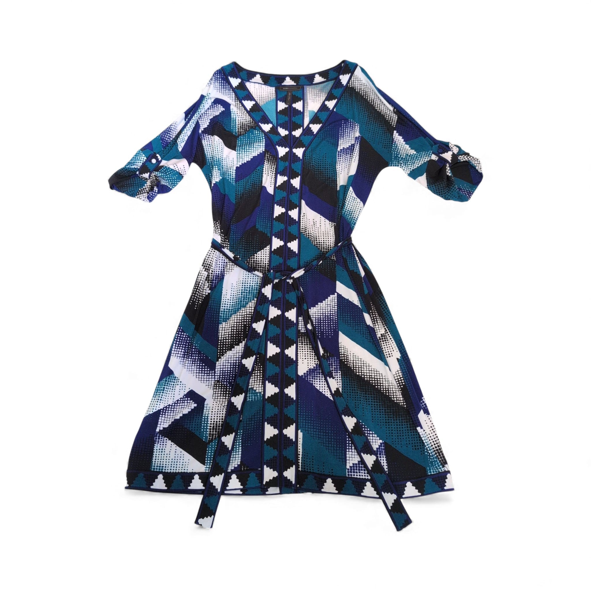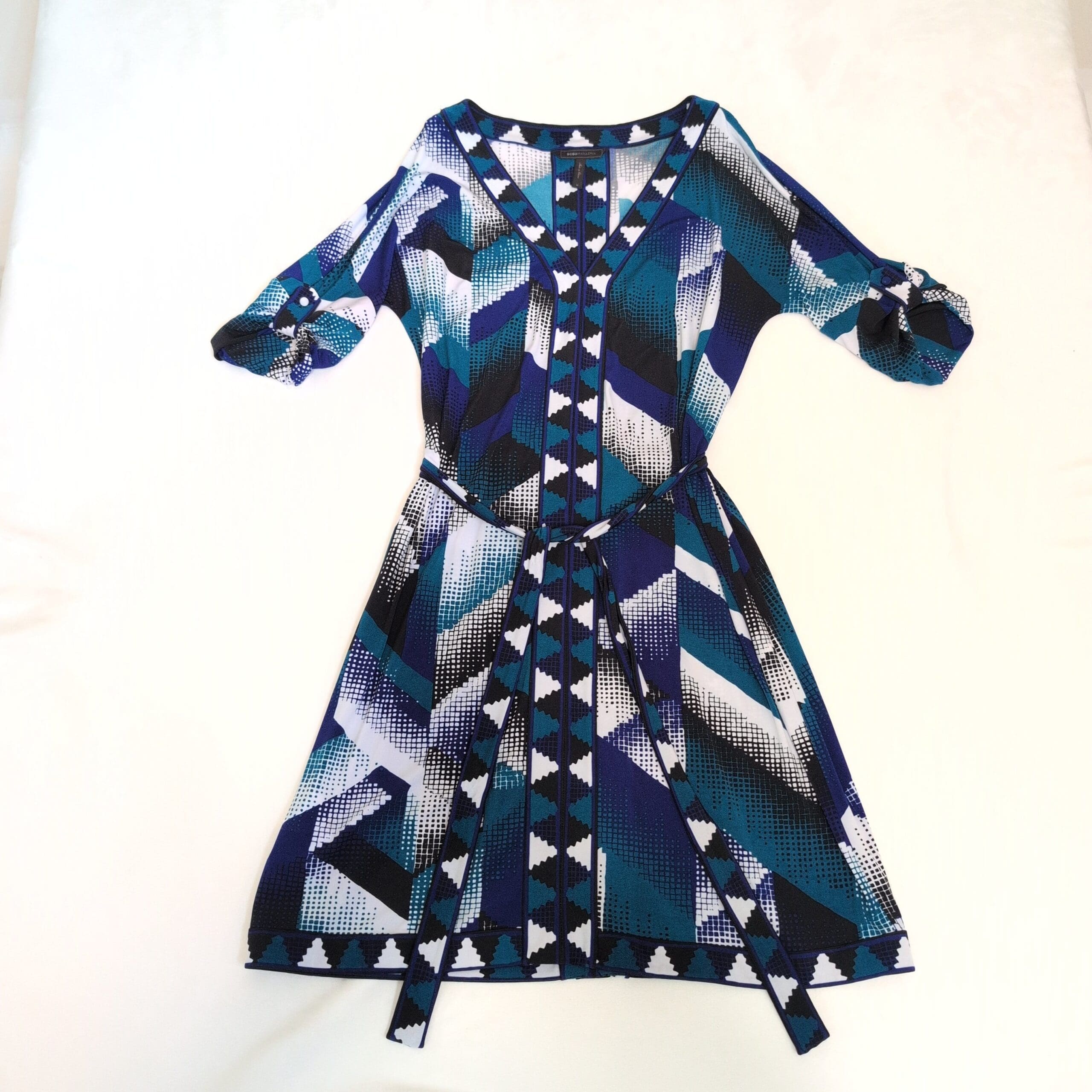 BCBGMAXAZRIA women’s dress in a striking blue geometric print. Size M (standard). Features a V-neckline, three-quarter roll-tab sleeves, and a self-tie belt to cinch the waist. Flattering fit-and-flare silhouette with contrast trim down the center front and along the hem. Flowing, versatile piece that works for day-to-evening occasions.