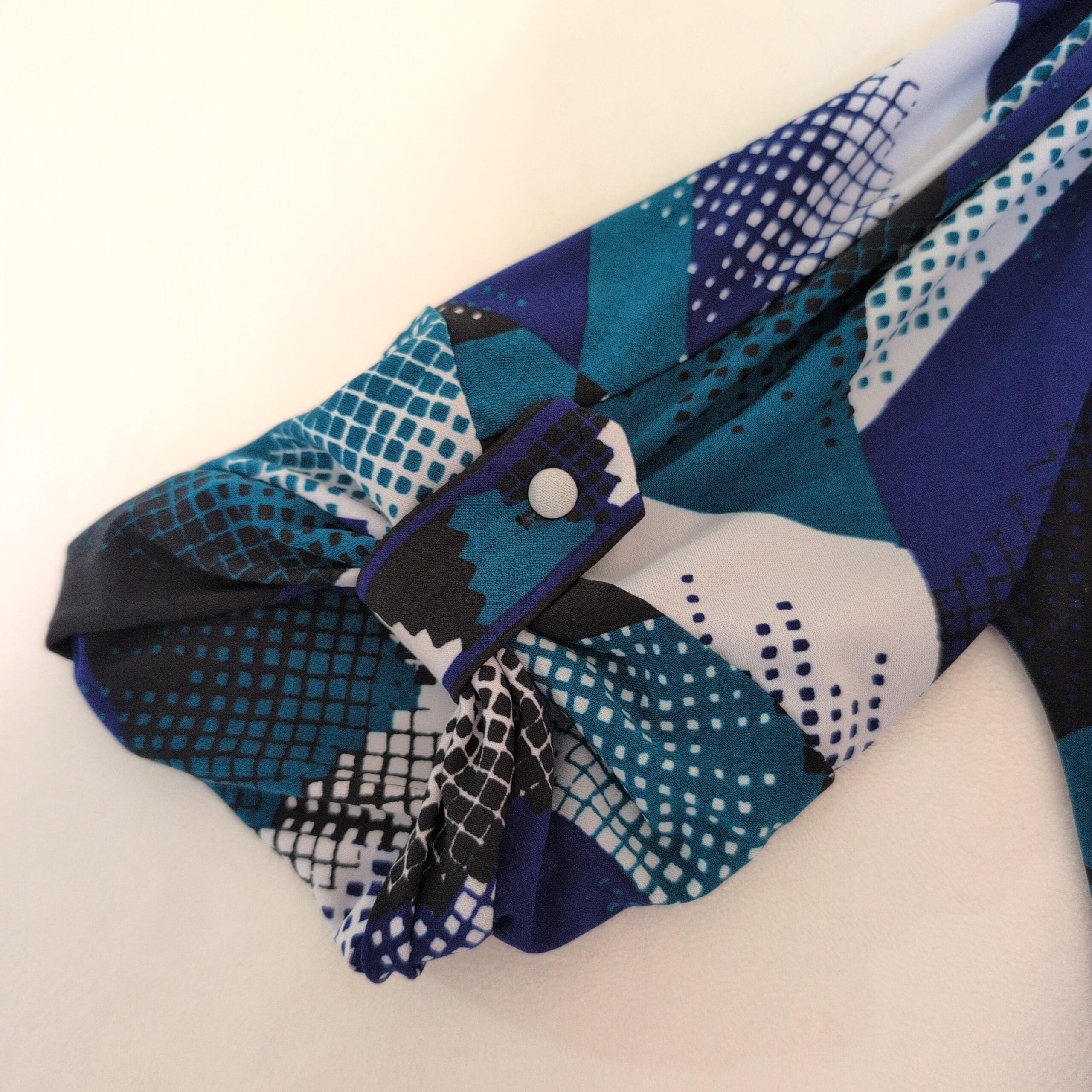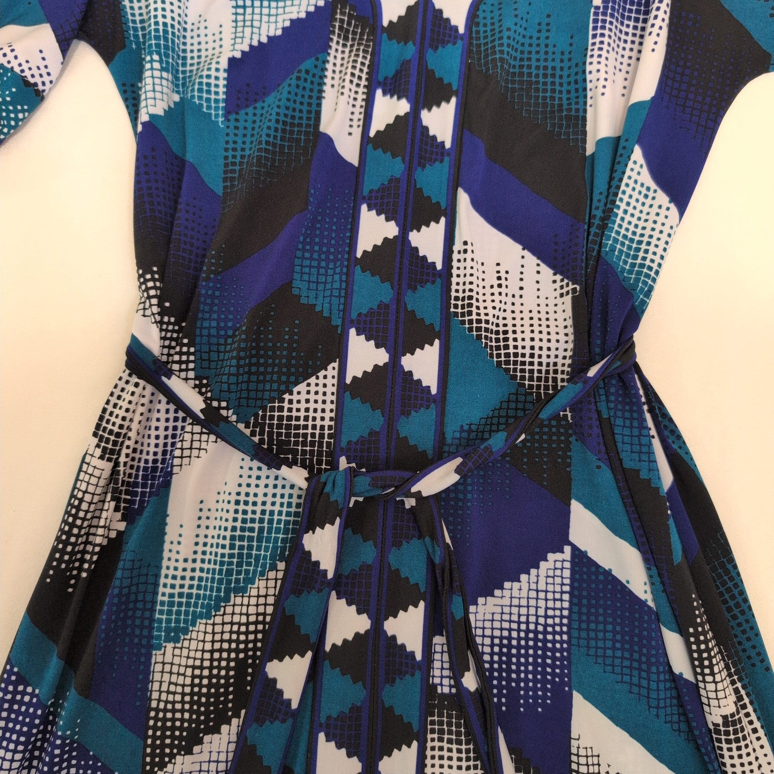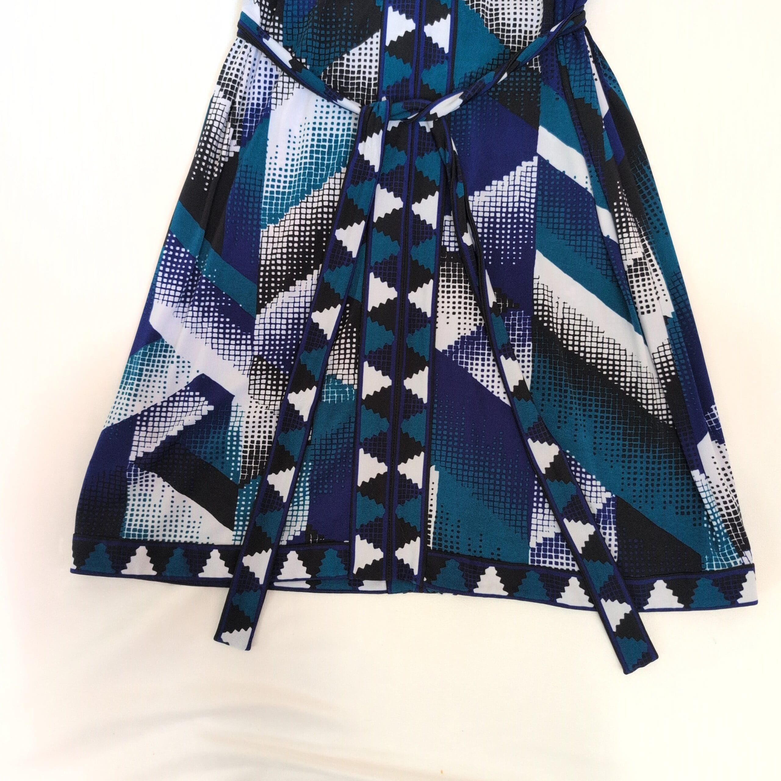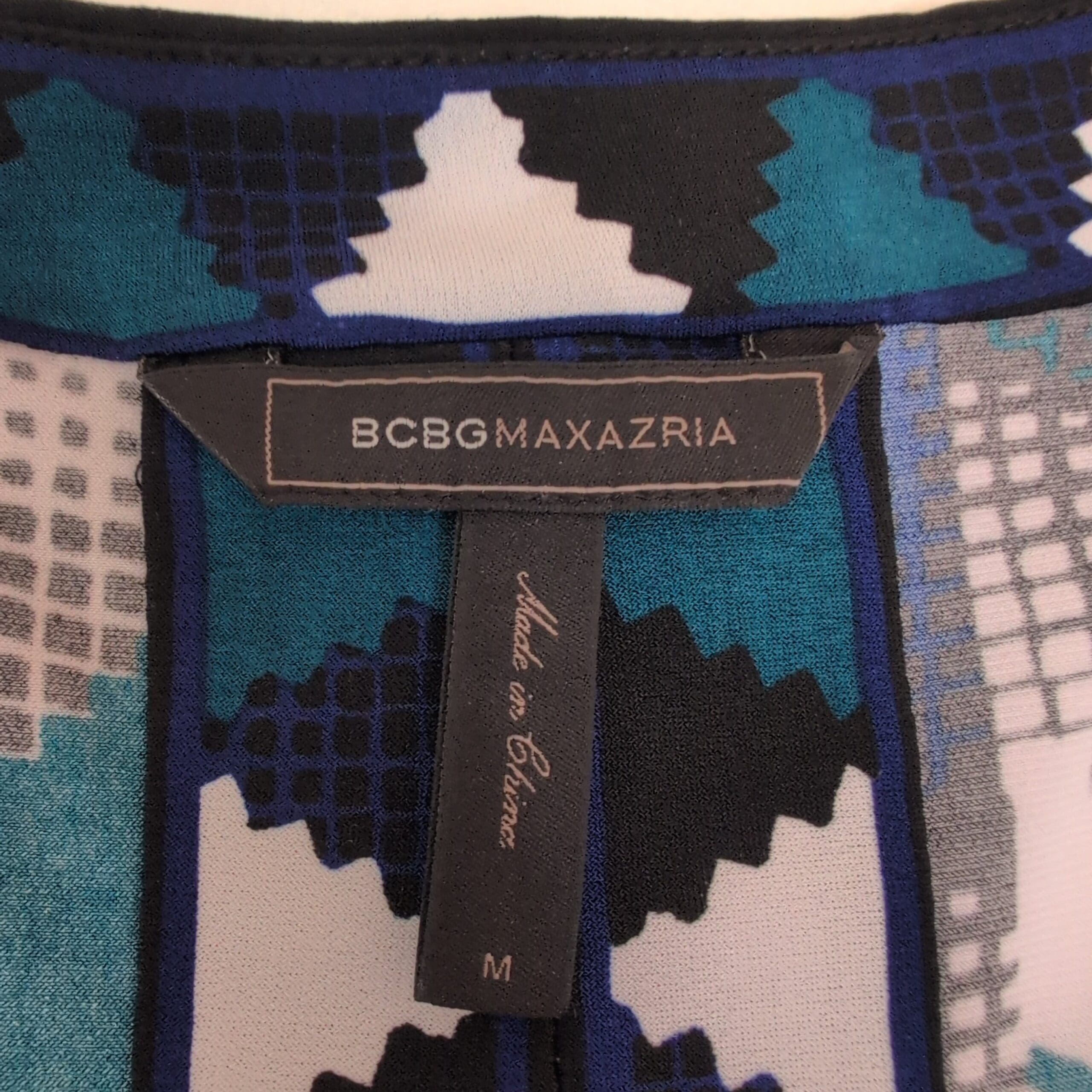 BCBGMAXAZRIA women’s dress in a striking blue geometric print. Size M (standard). Features a V-neckline, three-quarter roll-tab sleeves, and a self-tie belt to cinch the waist. Flattering fit-and-flare silhouette with contrast trim down the center front and along the hem. Flowing, versatile piece that works for day-to-evening occasions.