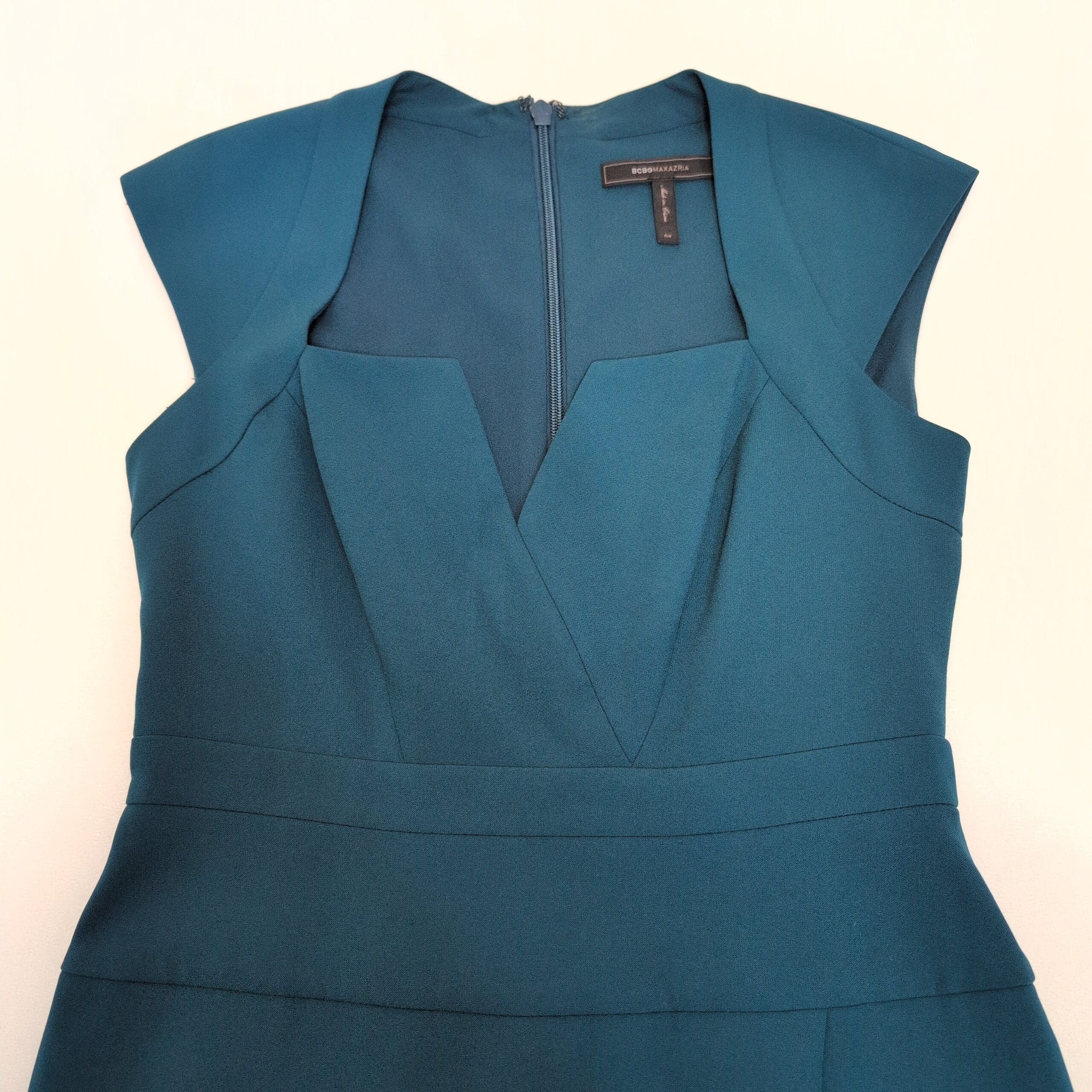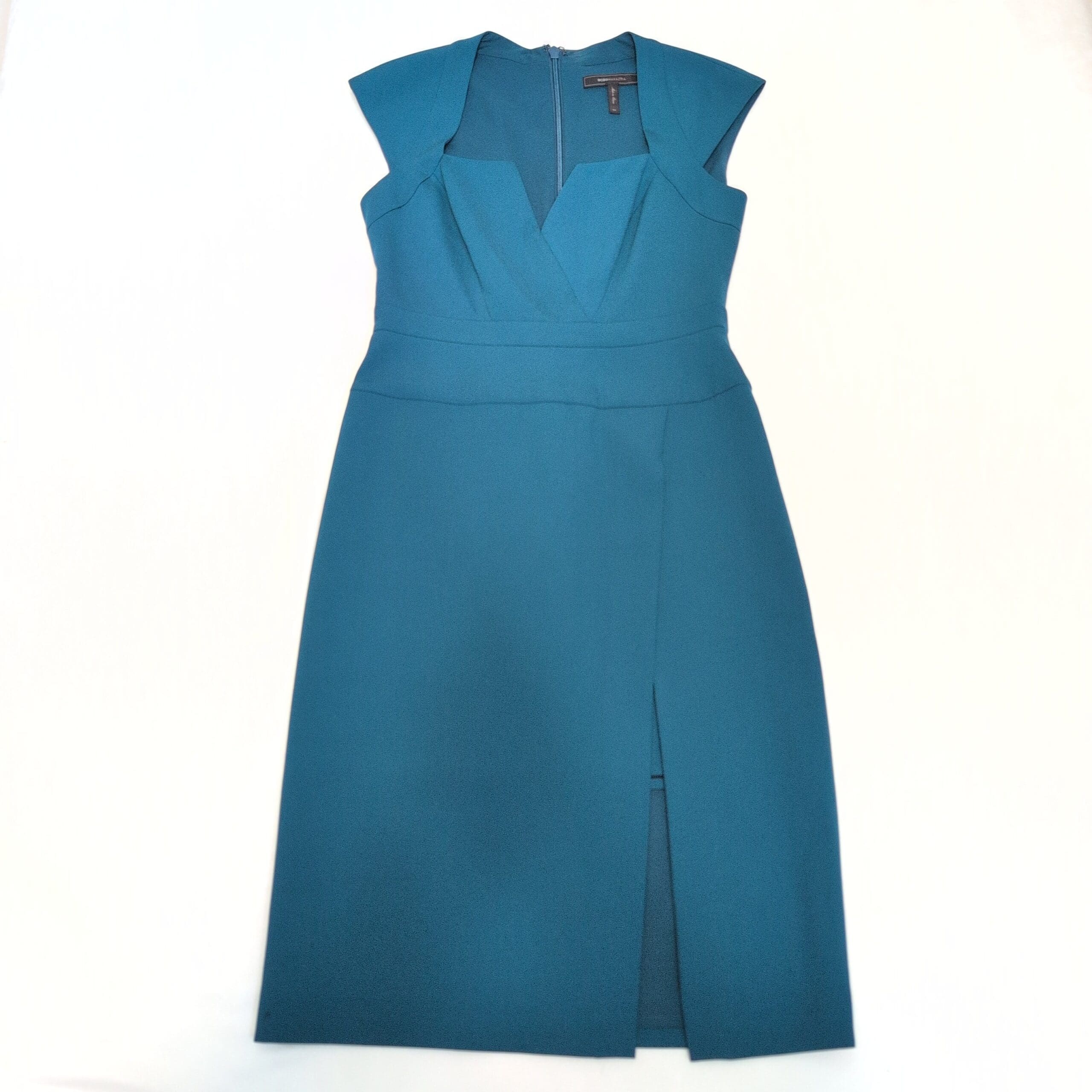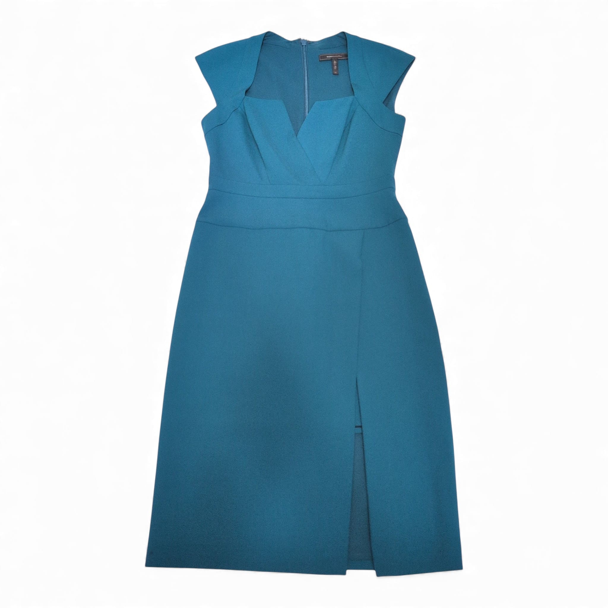 BCBGMAXAZRIA midi dress in a rich green (teal) shade — size 4. Features a structured, fitted bodice with a flattering V-sweetheart neckline, cap sleeves, defined waist seam and a clean A-line skirt with a front slit. Back center zipper closure for easy wear. Elegant, modern silhouette ideal for weddings, cocktail events, or special occasions. Gently used; please review photos for condition and details.