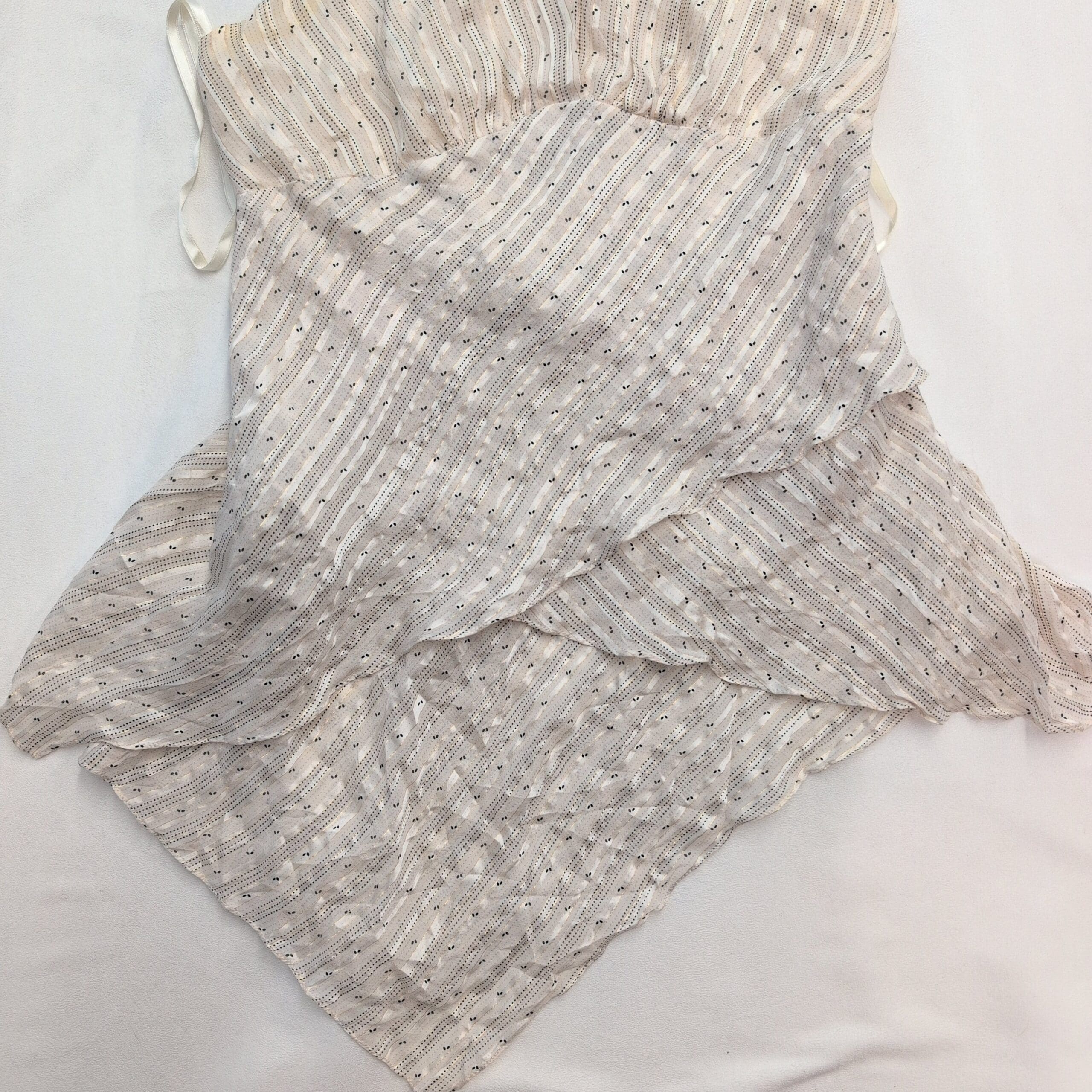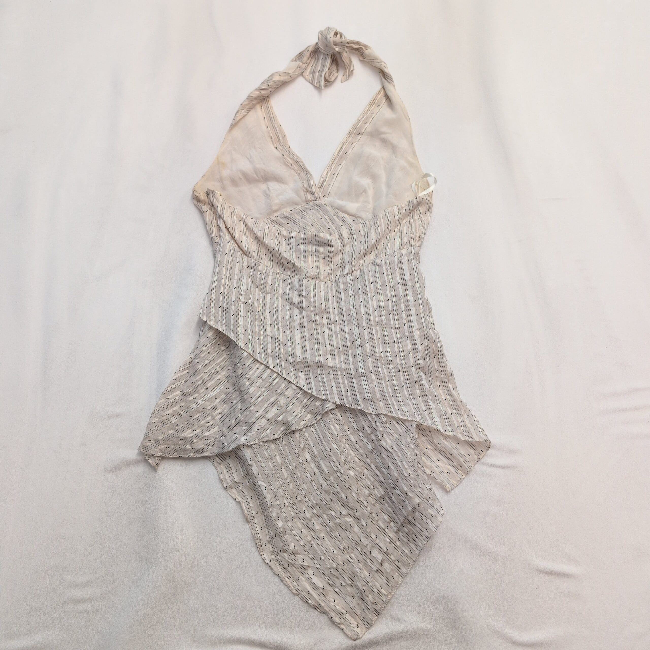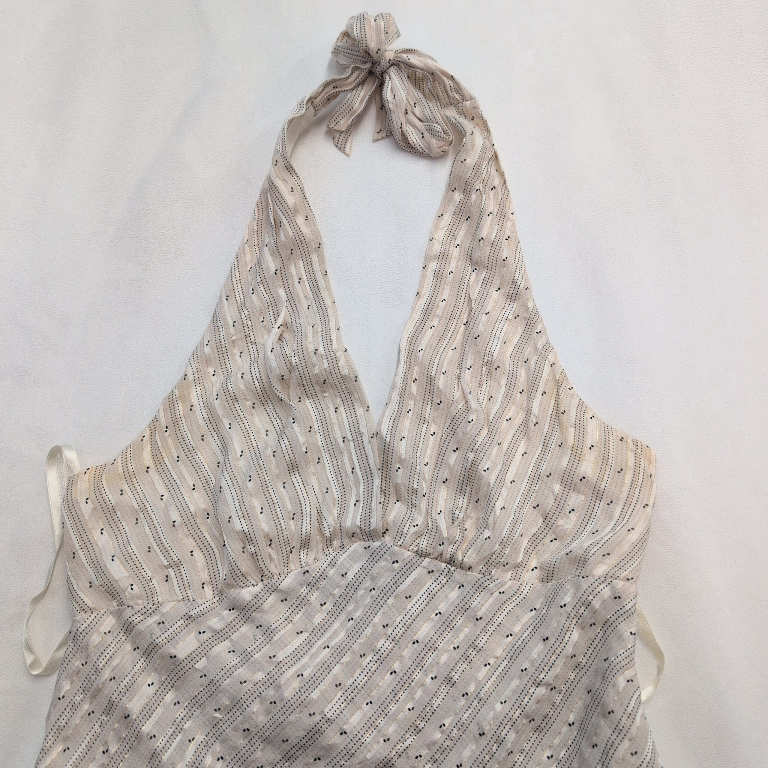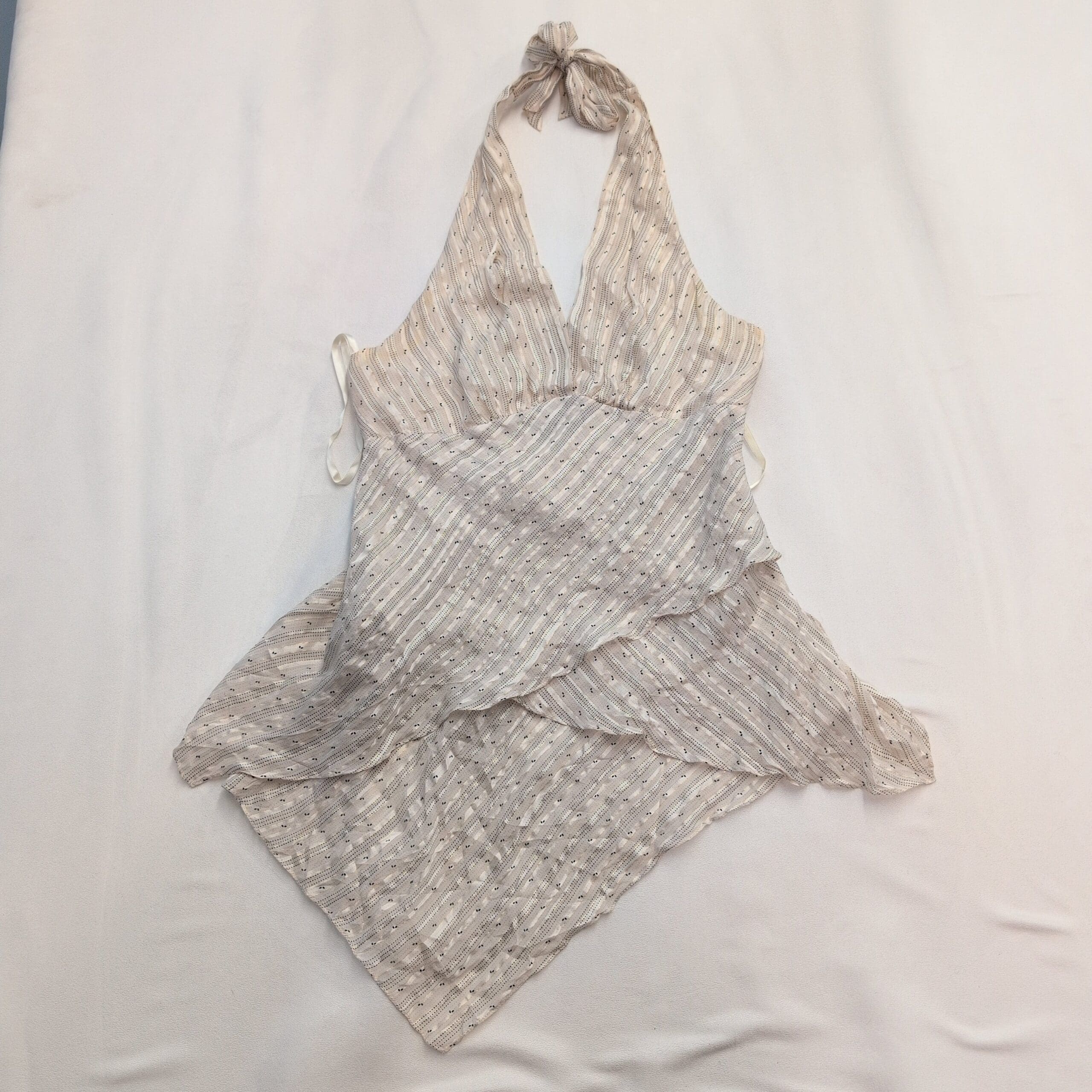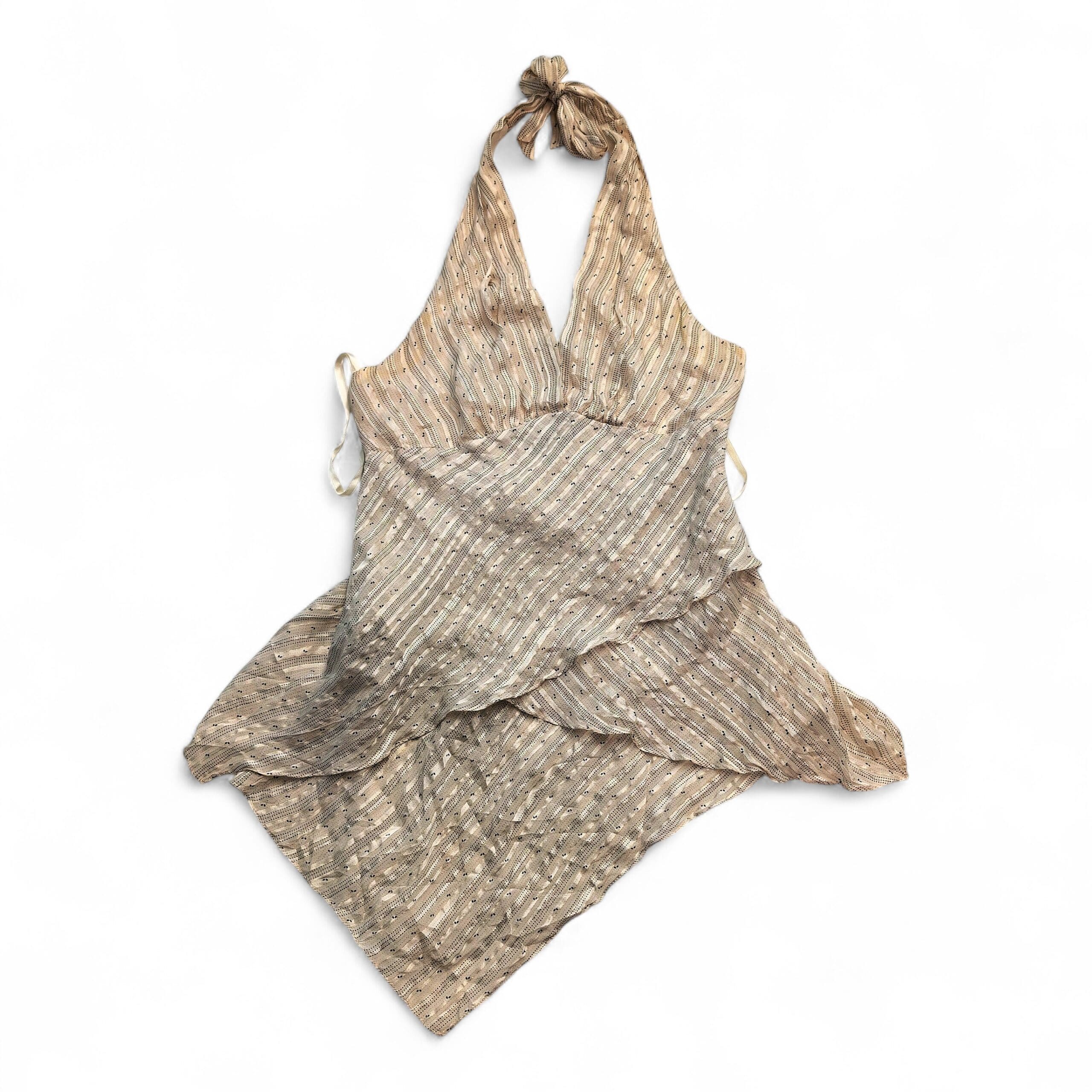 BCBGMaxAzria silk-blend halter mini dress in a soft ivory-beige/tan. Size S. Features a plunging V halter neckline with tie at the neck, fitted empire waist, and a layered wrap-style skirt with an asymmetrical hem for graceful movement. Lightweight silk-blend fabric with a subtle textured stripe pattern offers an elegant, airy silhouette perfect for warm-weather events or date nights.
