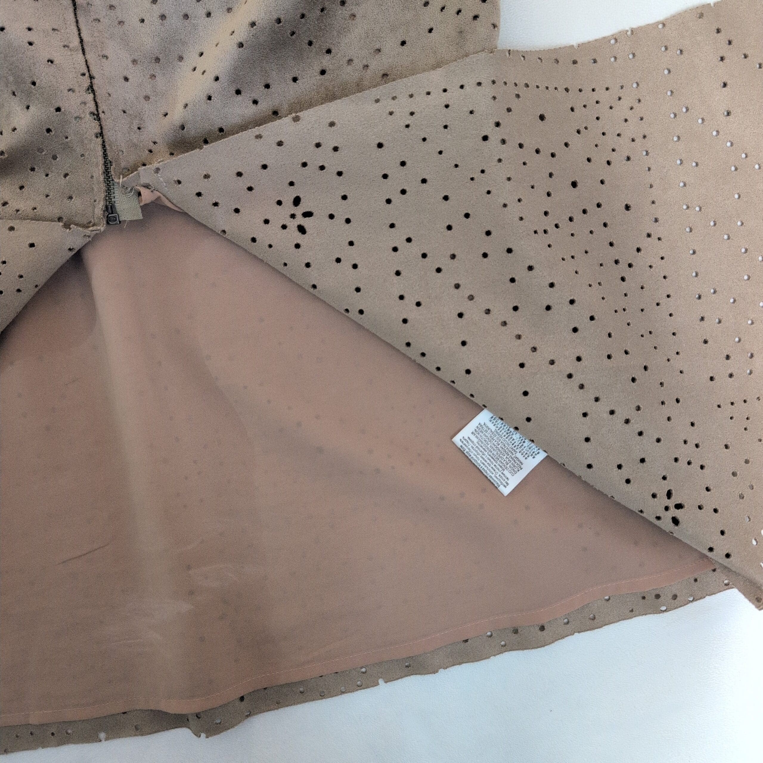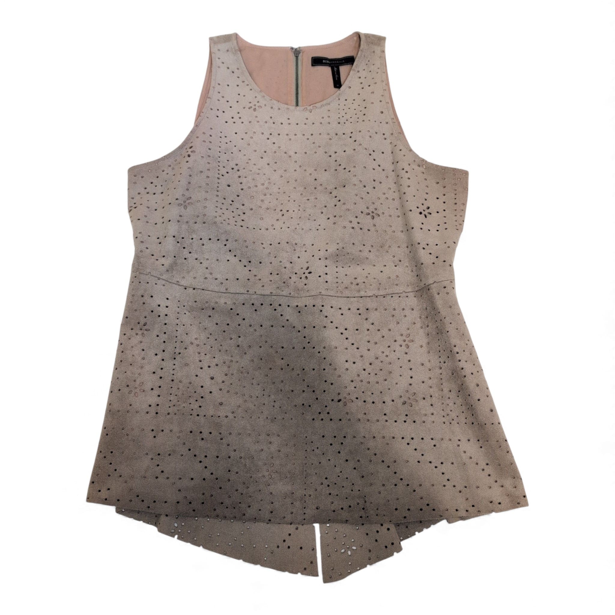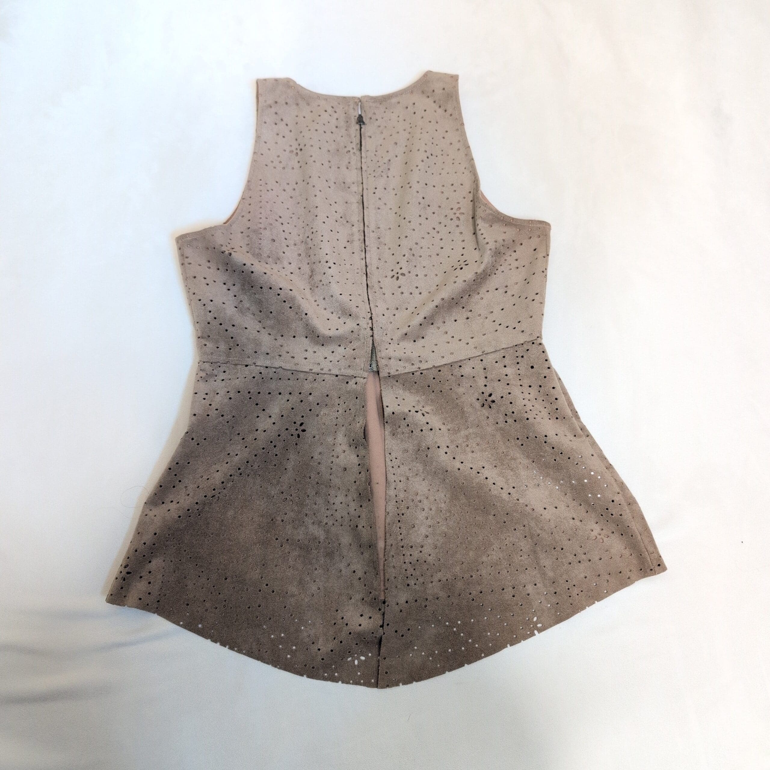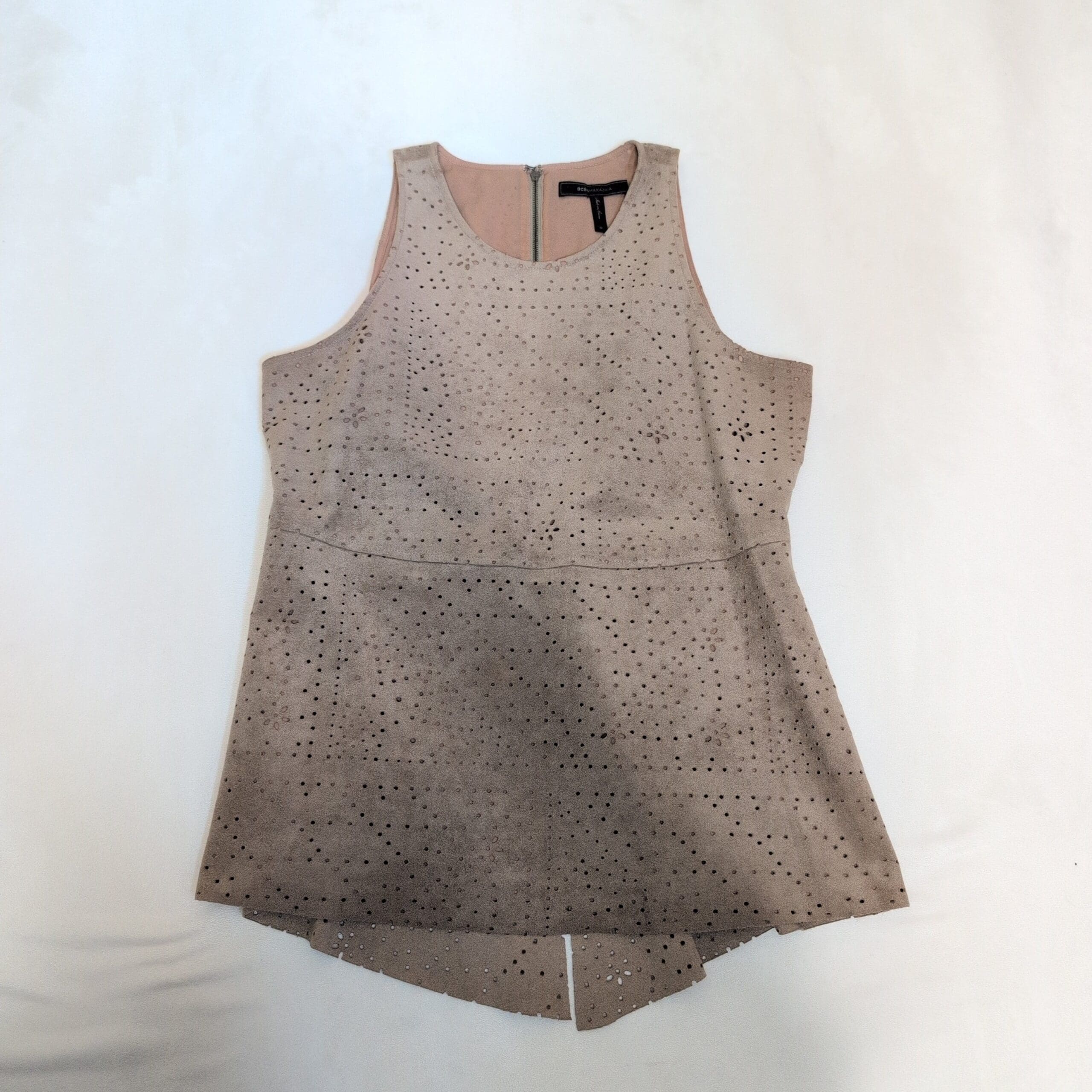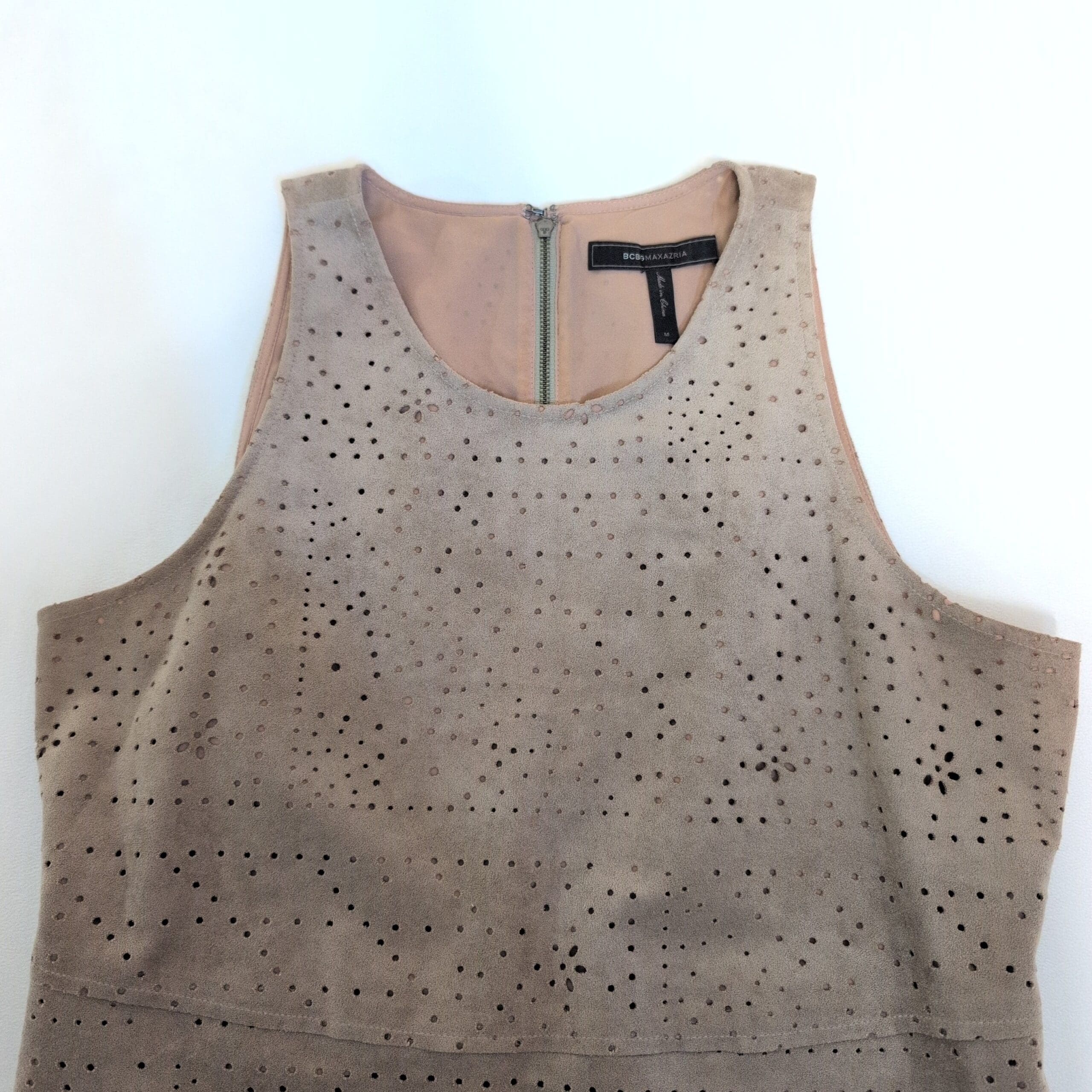 BCBGMAXAZRIA tan perforated tank top in size M. Sleeveless with a round neckline and an exposed back zipper. Soft suede-like texture with laser-cut perforation detailing throughout, and a slightly flared A-line silhouette with a longer back hem for a flattering drape. Great for layering or dressing up with tailored pants or a skirt. Gently used with light signs of wear consistent with previous use.