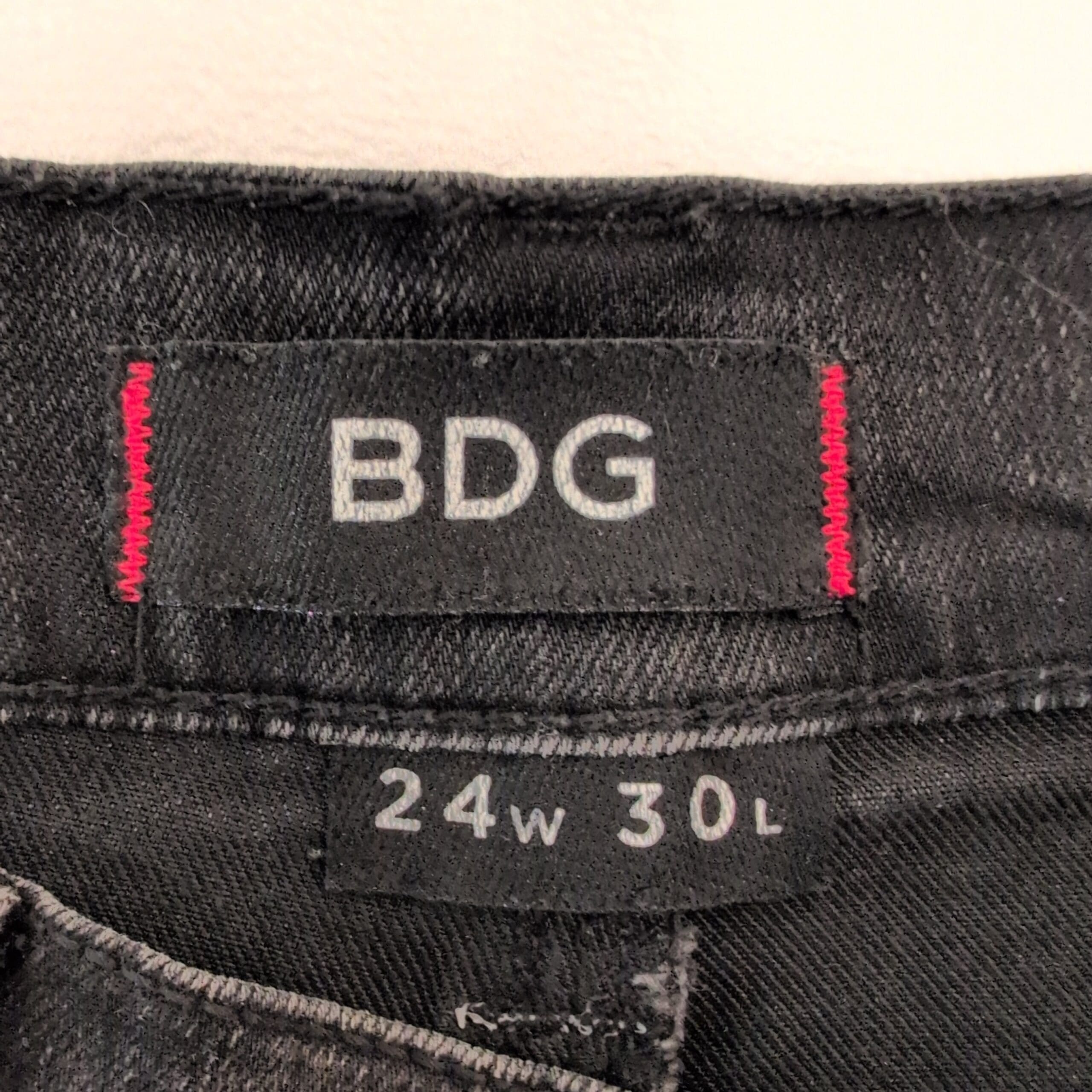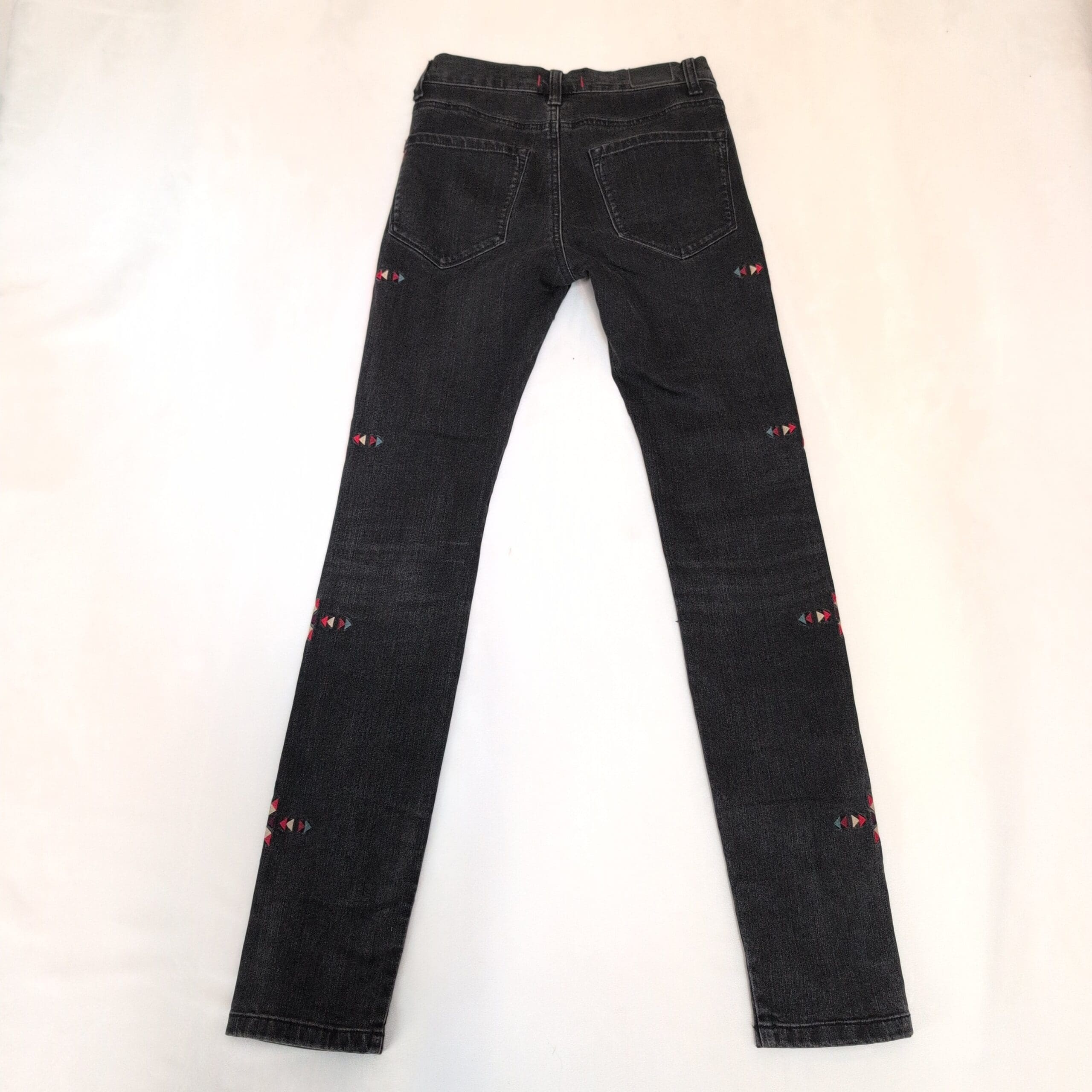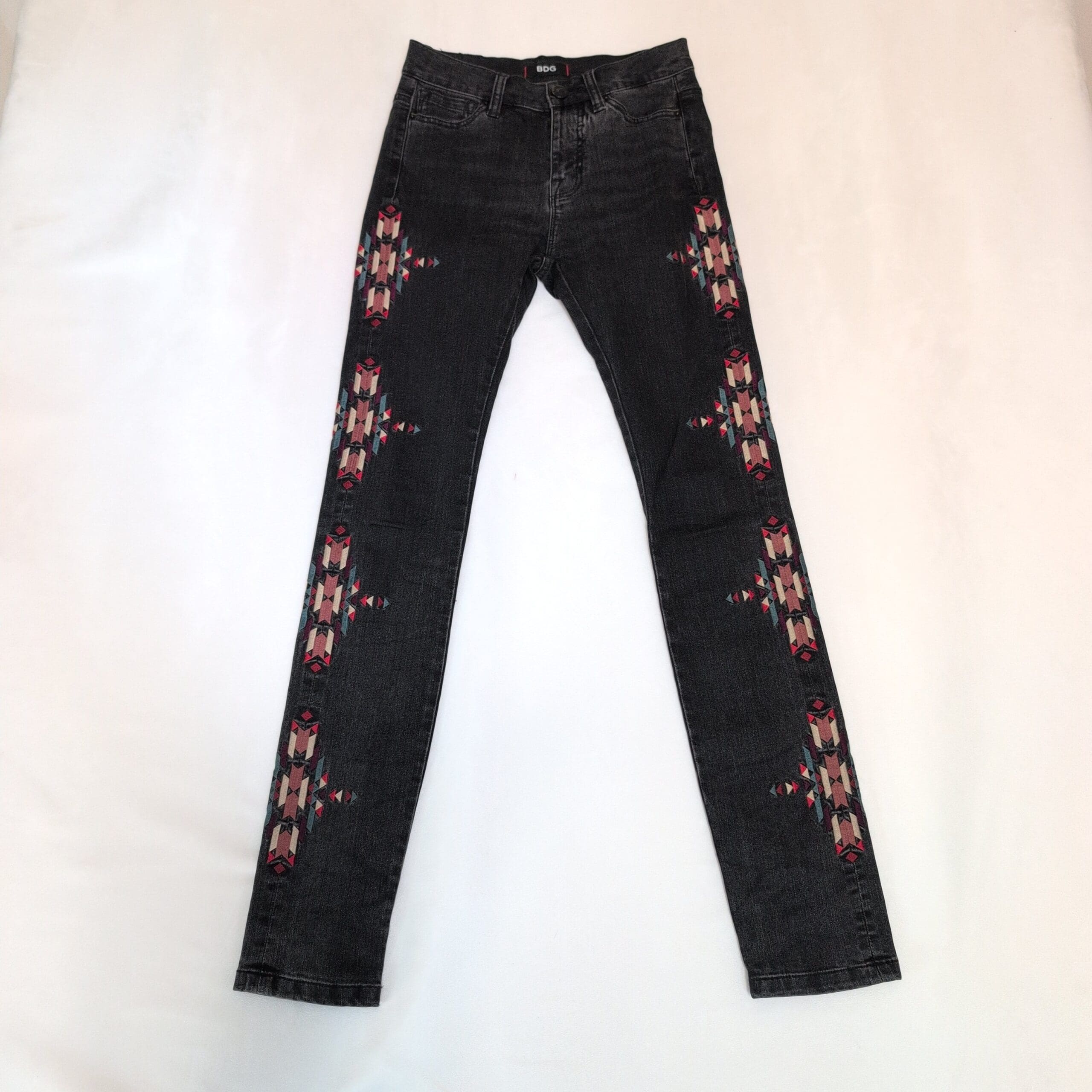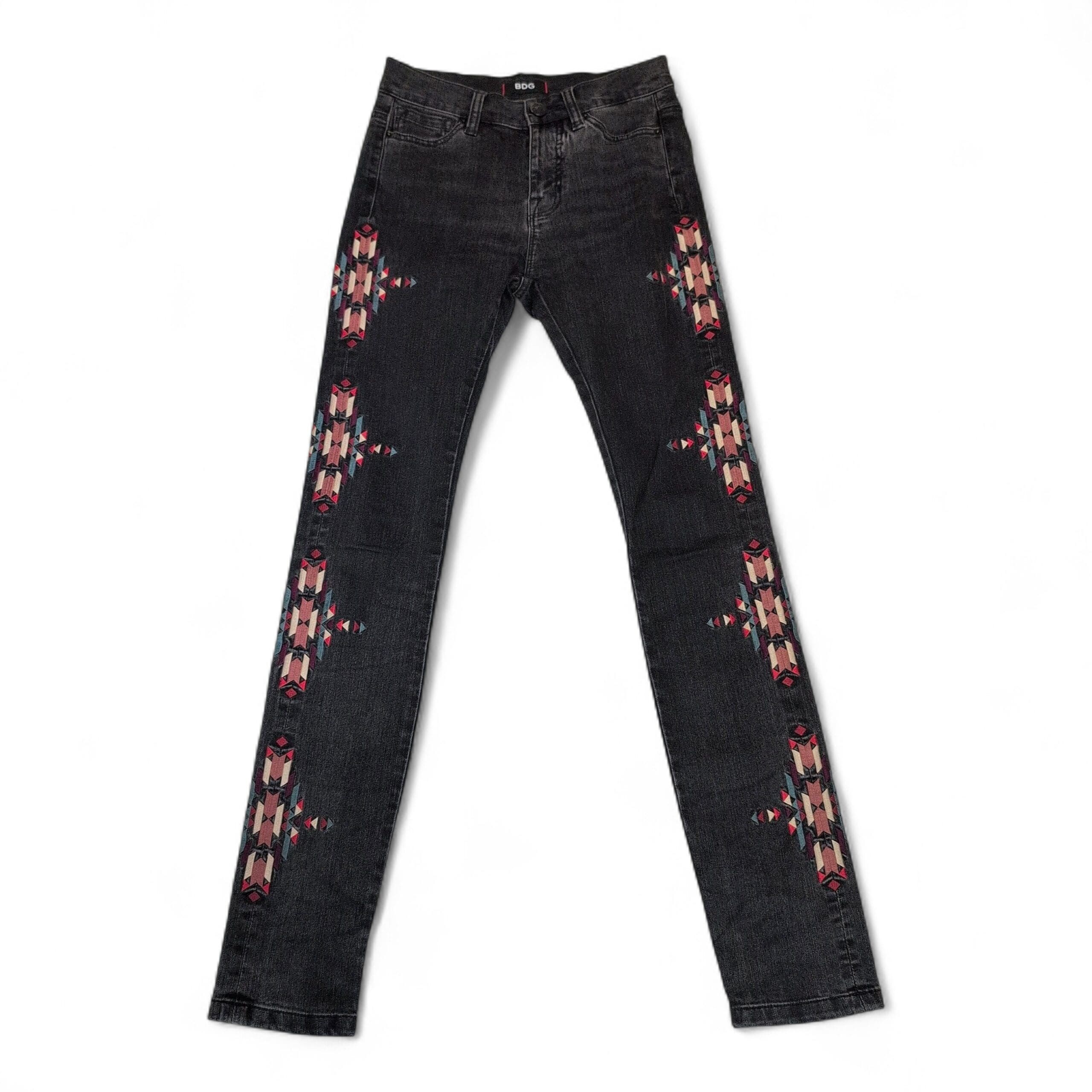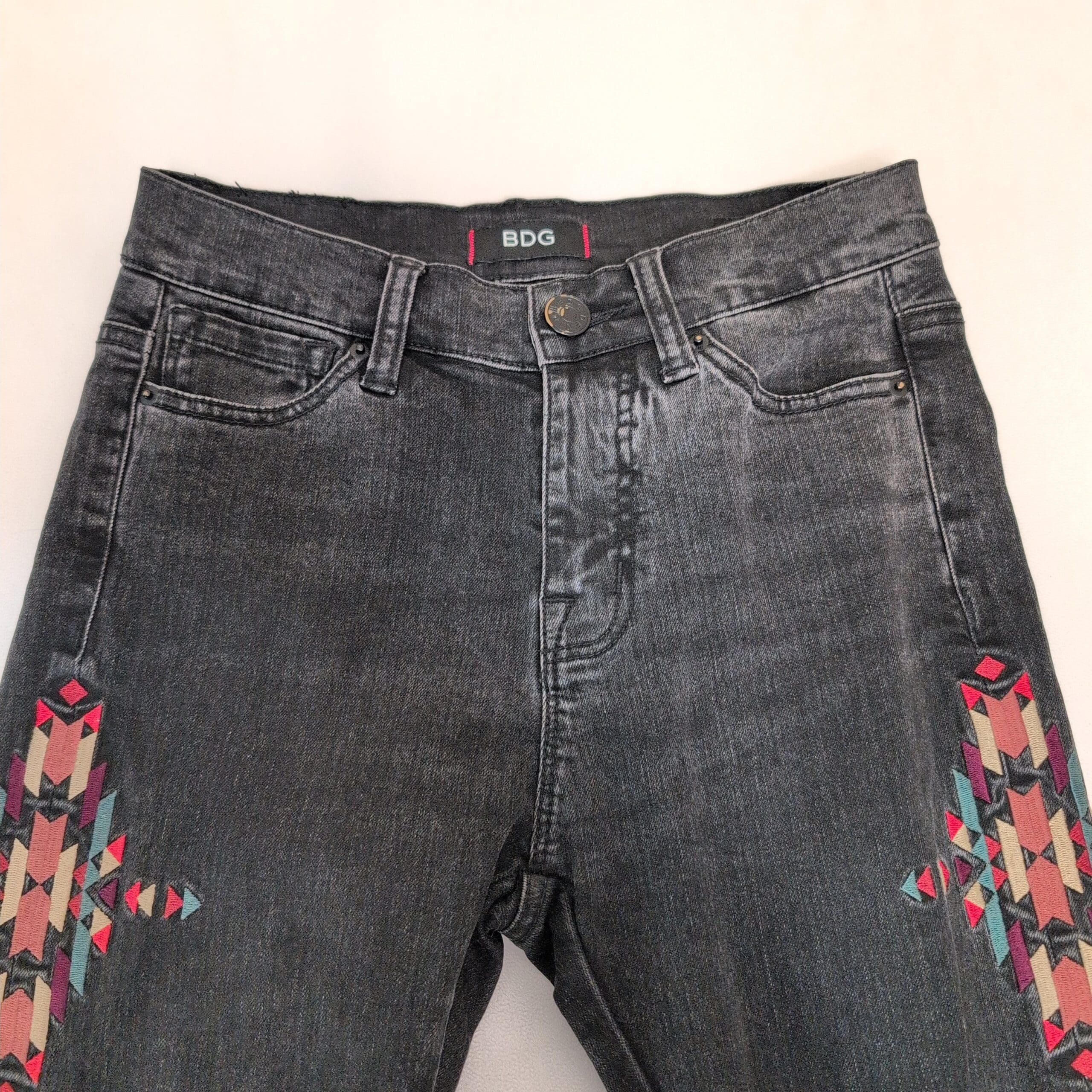 BDG high-rise cigarette jeans in a faded black wash, size 24. Slim, cigarette leg with a flattering high rise and colorful geometric embroidery running down both outer legs for a distinctive, boho-inspired look. Classic five-pocket styling and belt loops make these easy to wear with tees or blouses. Gently used and free of major rips, tears, stains, or flaws; typical light wear may be present consistent with previous use.