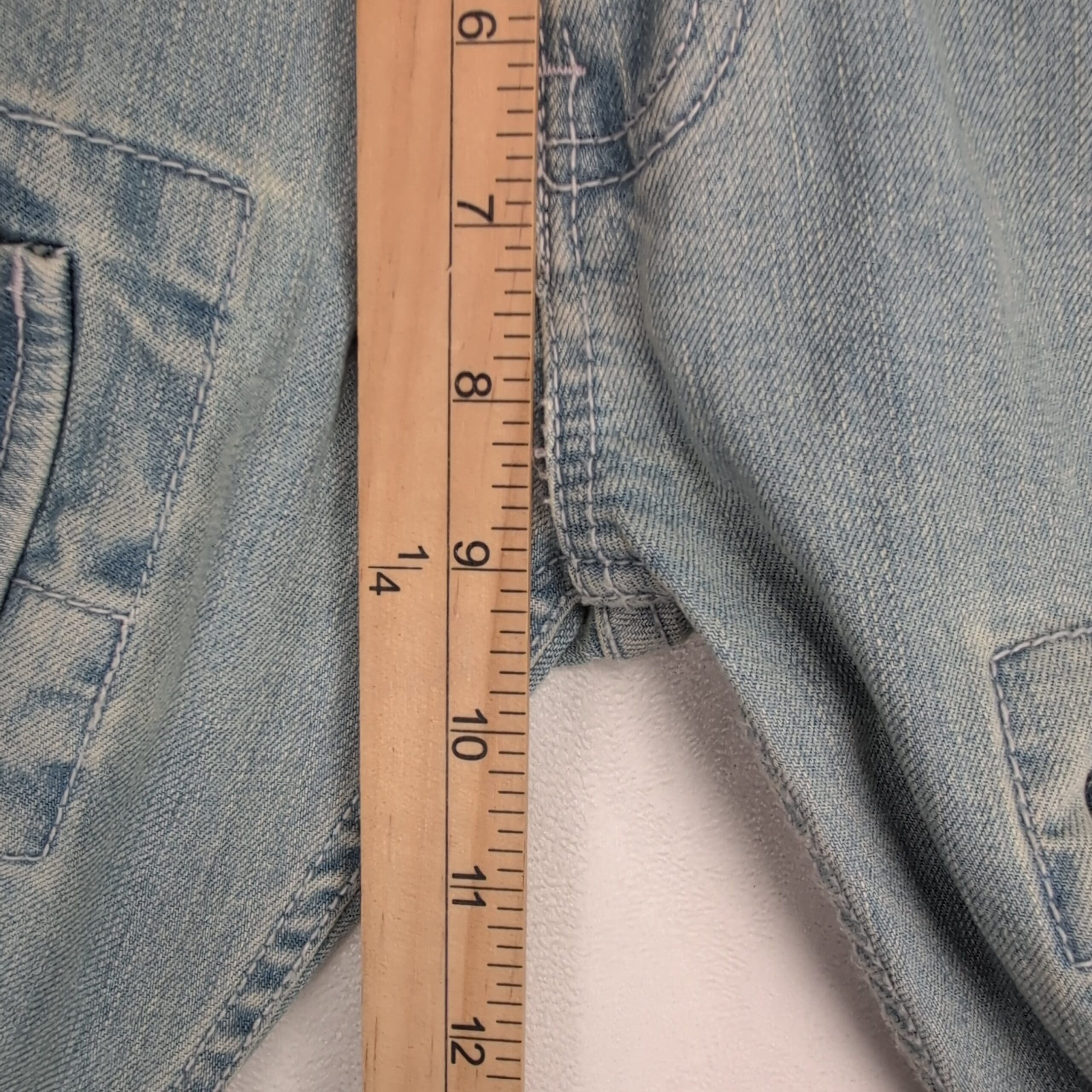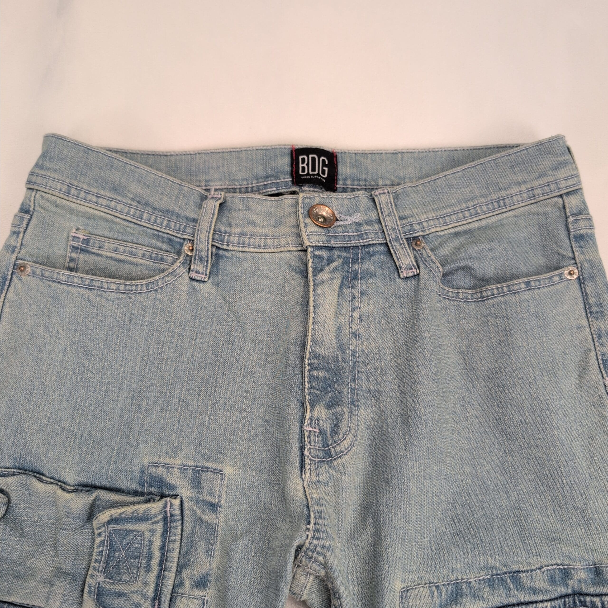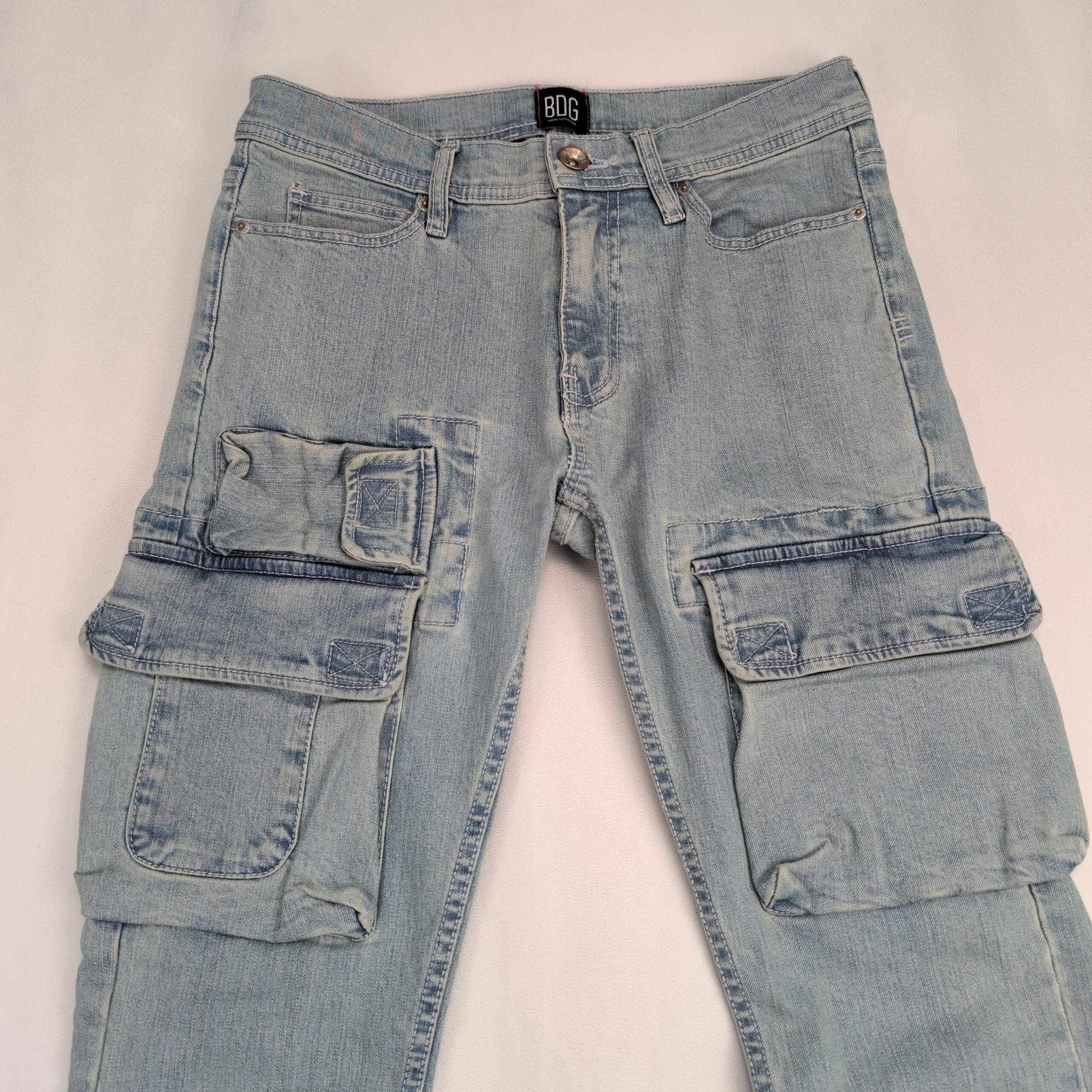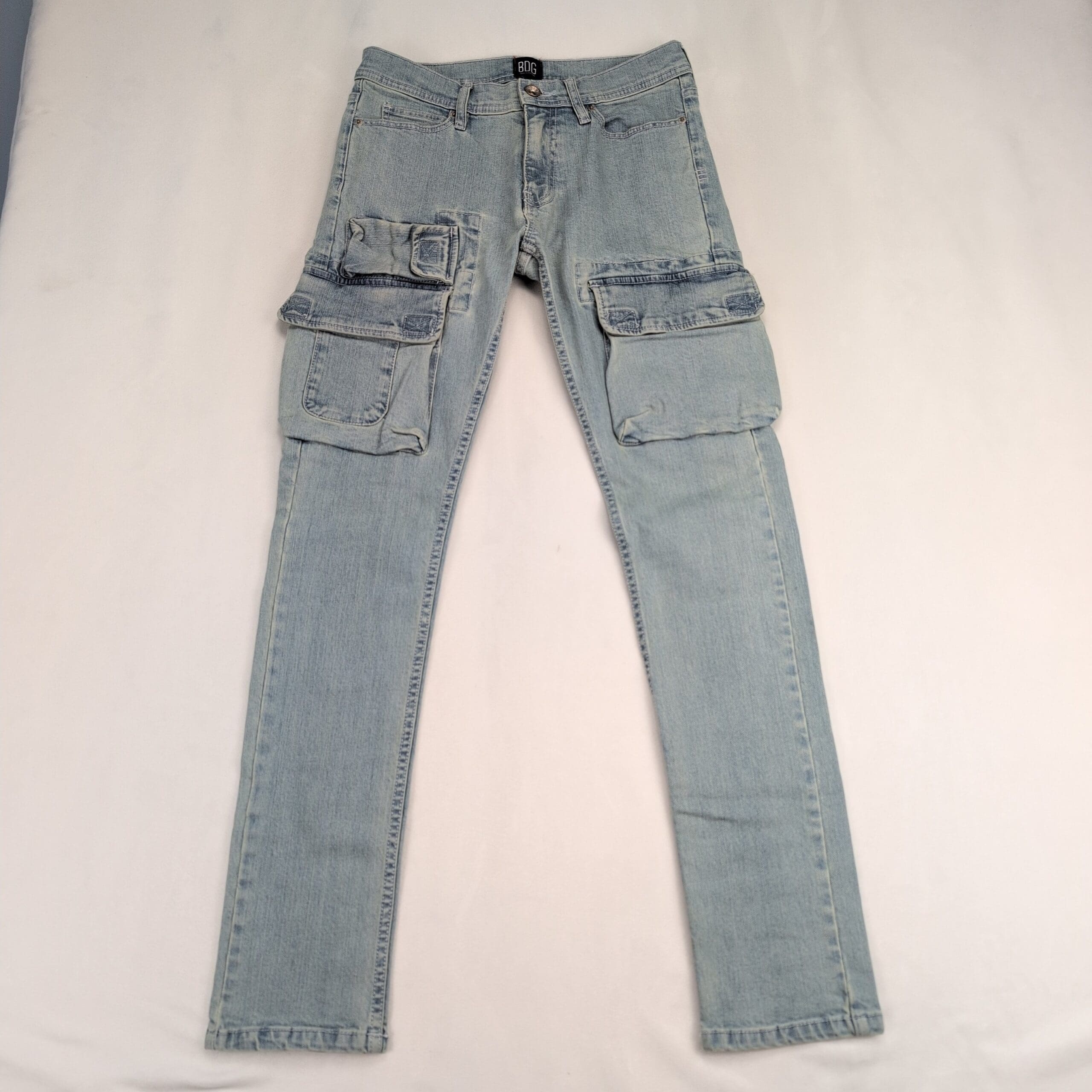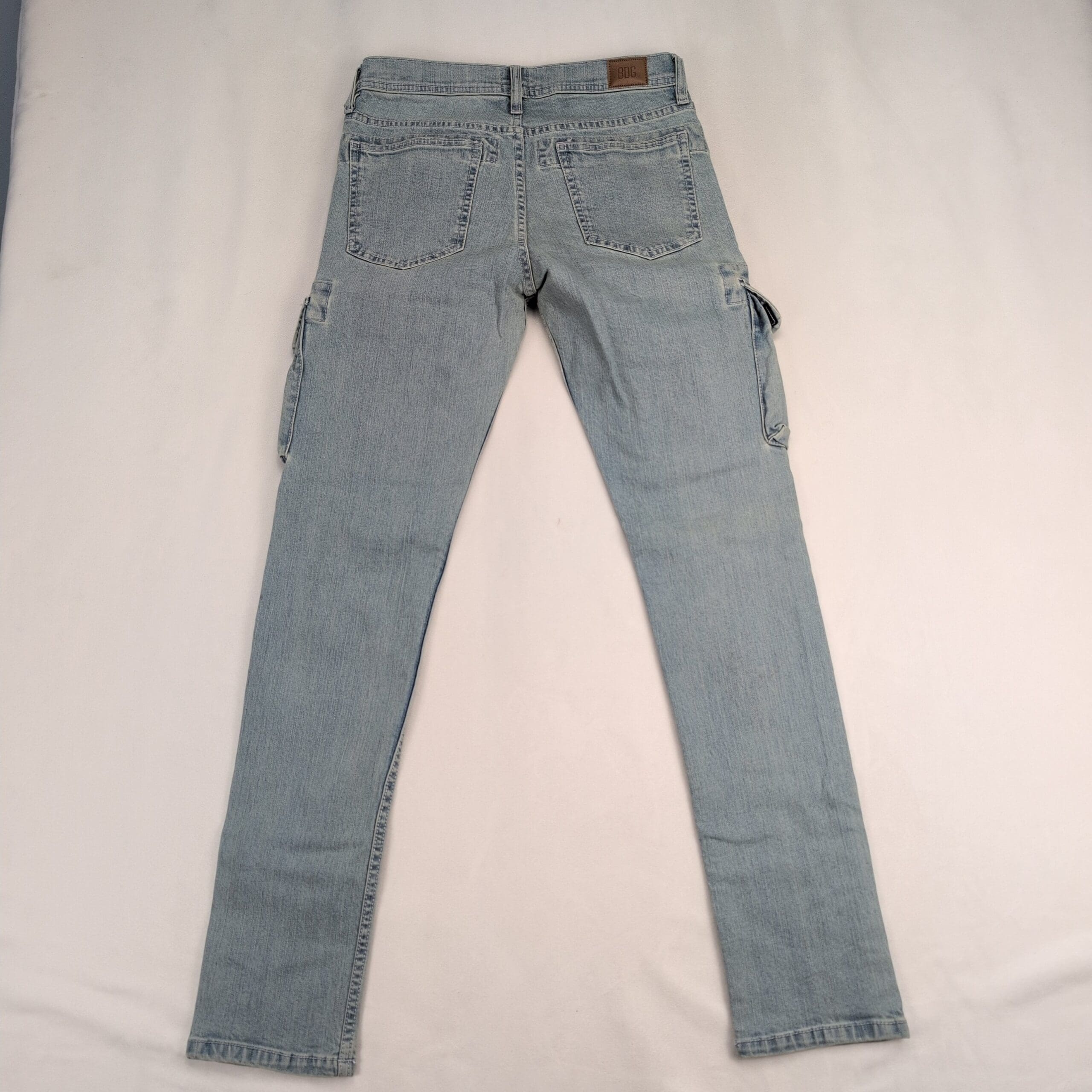 BDG women’s skinny cargo jeans in a light blue wash. Size 29 (standard). Slim/skinny leg with utility flap cargo pockets on both thighs, five-pocket styling, belt loops, and a button-front closure. Excellent used condition — free of major rips, tears, or stains. Light overall fading and gentle wear consistent with normal use.