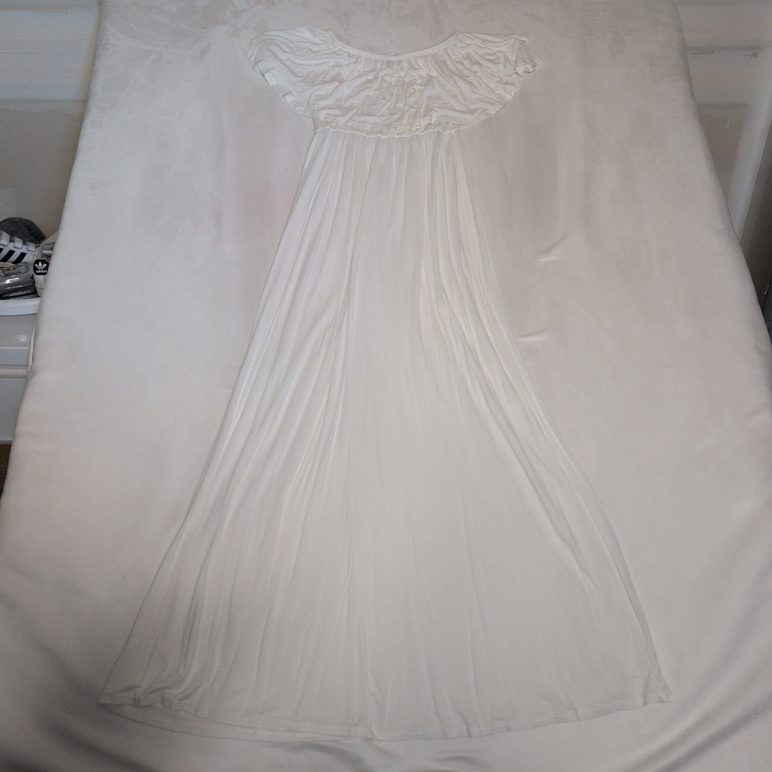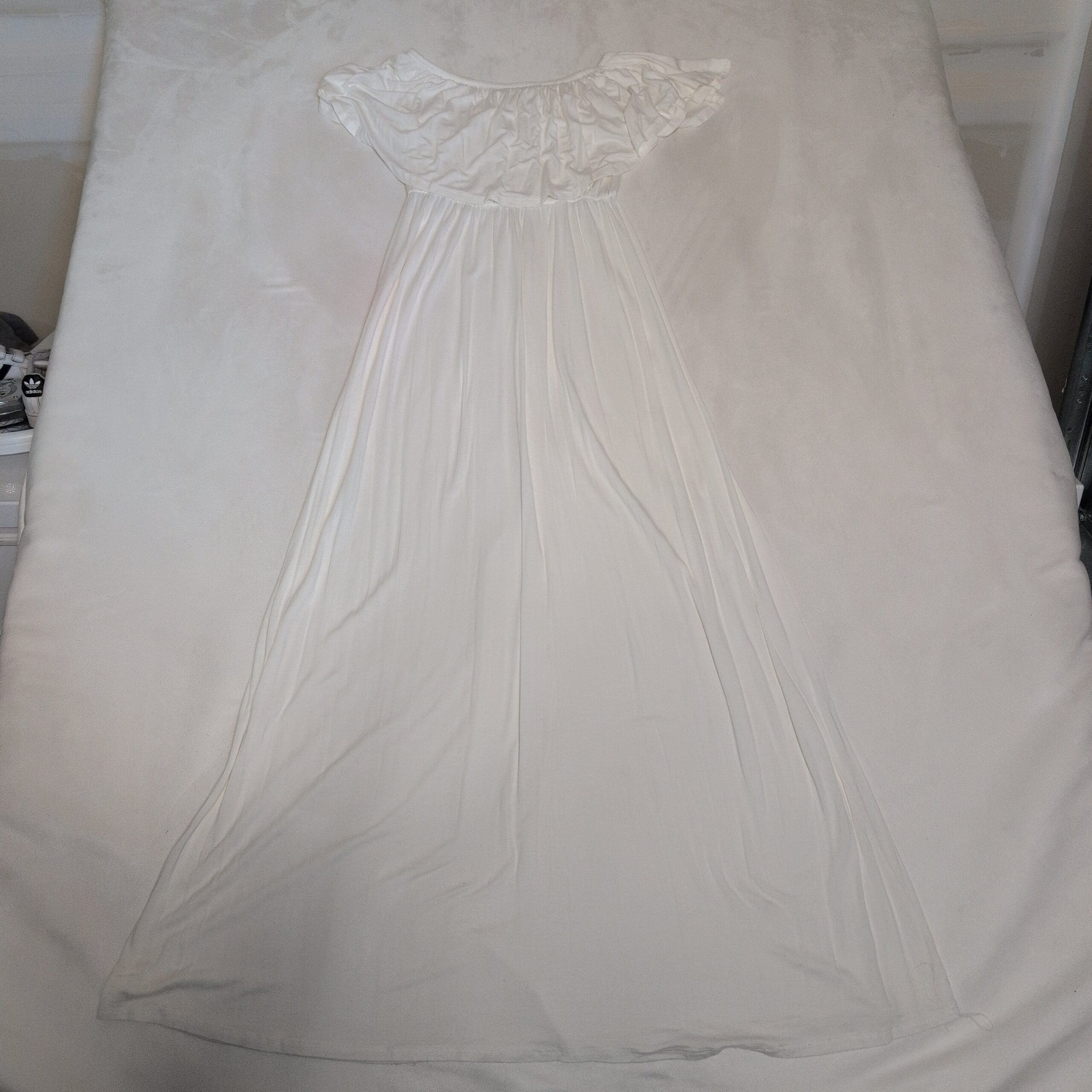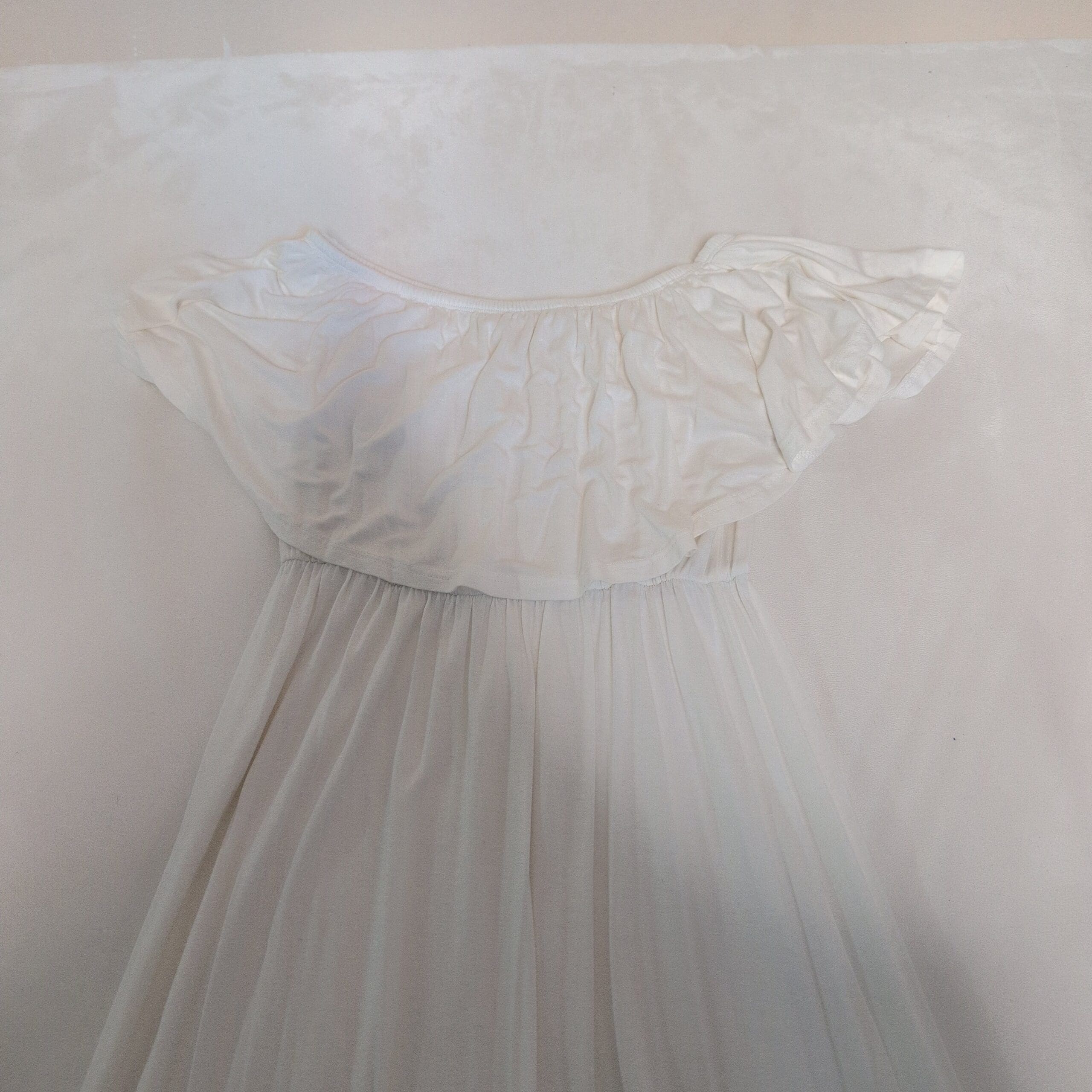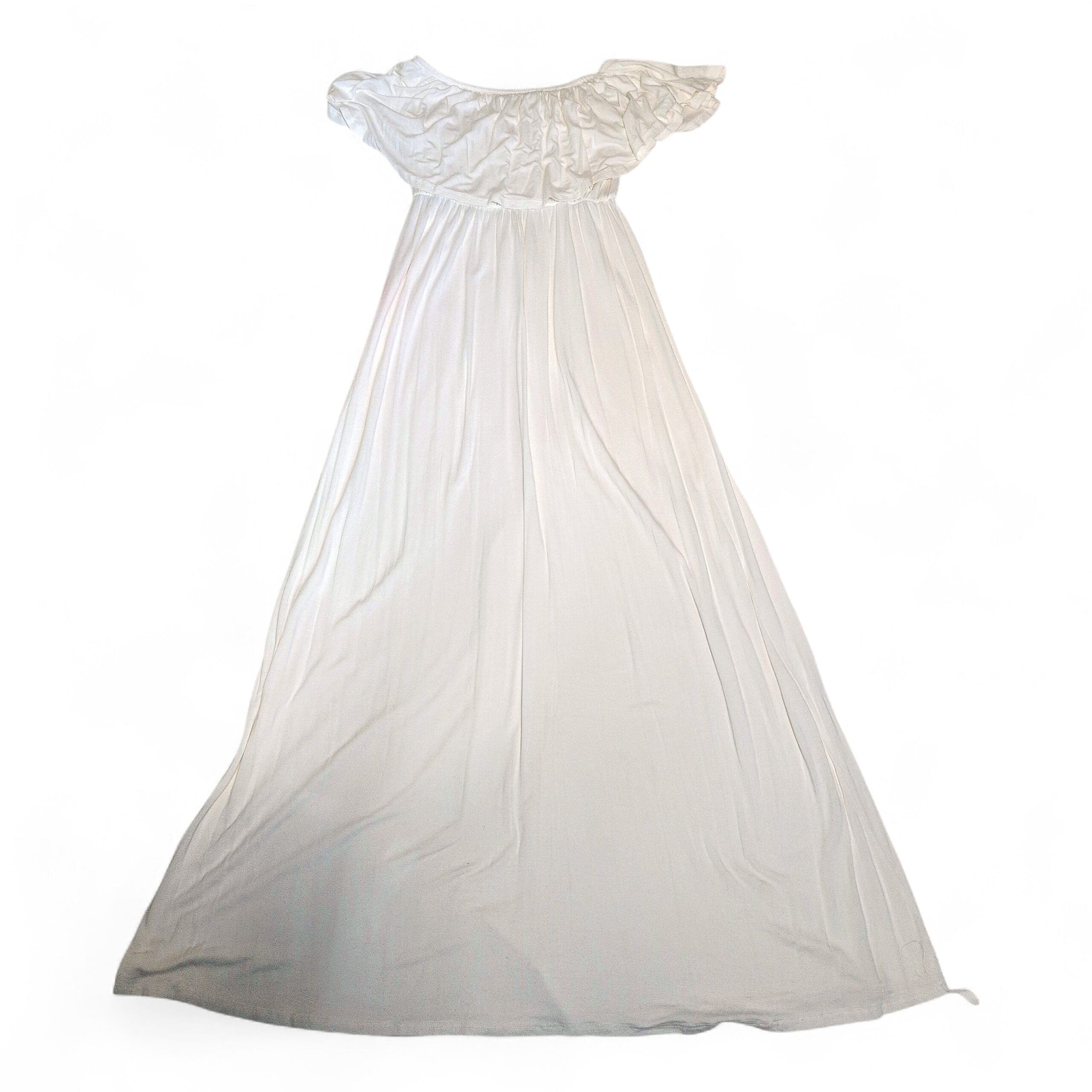 Beeson River white off-shoulder maxi dress featuring a ruffled neckline and flowing, floor-length skirt. Lightweight, drapey fabric with an elasticized empire waist for a flattering silhouette — great for summer events, beach days, or casual outings. Condition: gently used and free of major rips, tears, stains, or flaws; typical light wear may be present. No size tag; listed as Size S (assumed). Please refer to the pit-to-pit flat lay measurement provided for best fit accuracy.