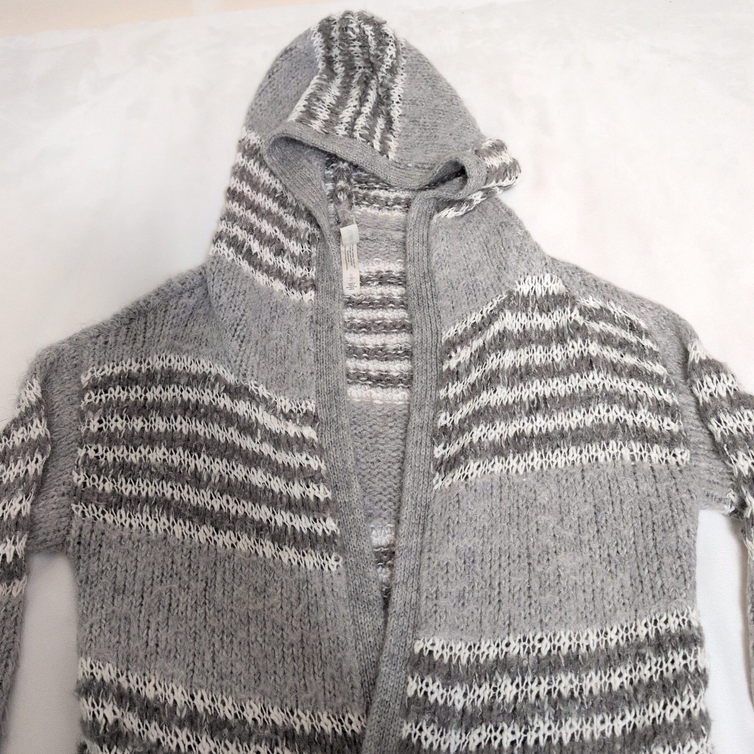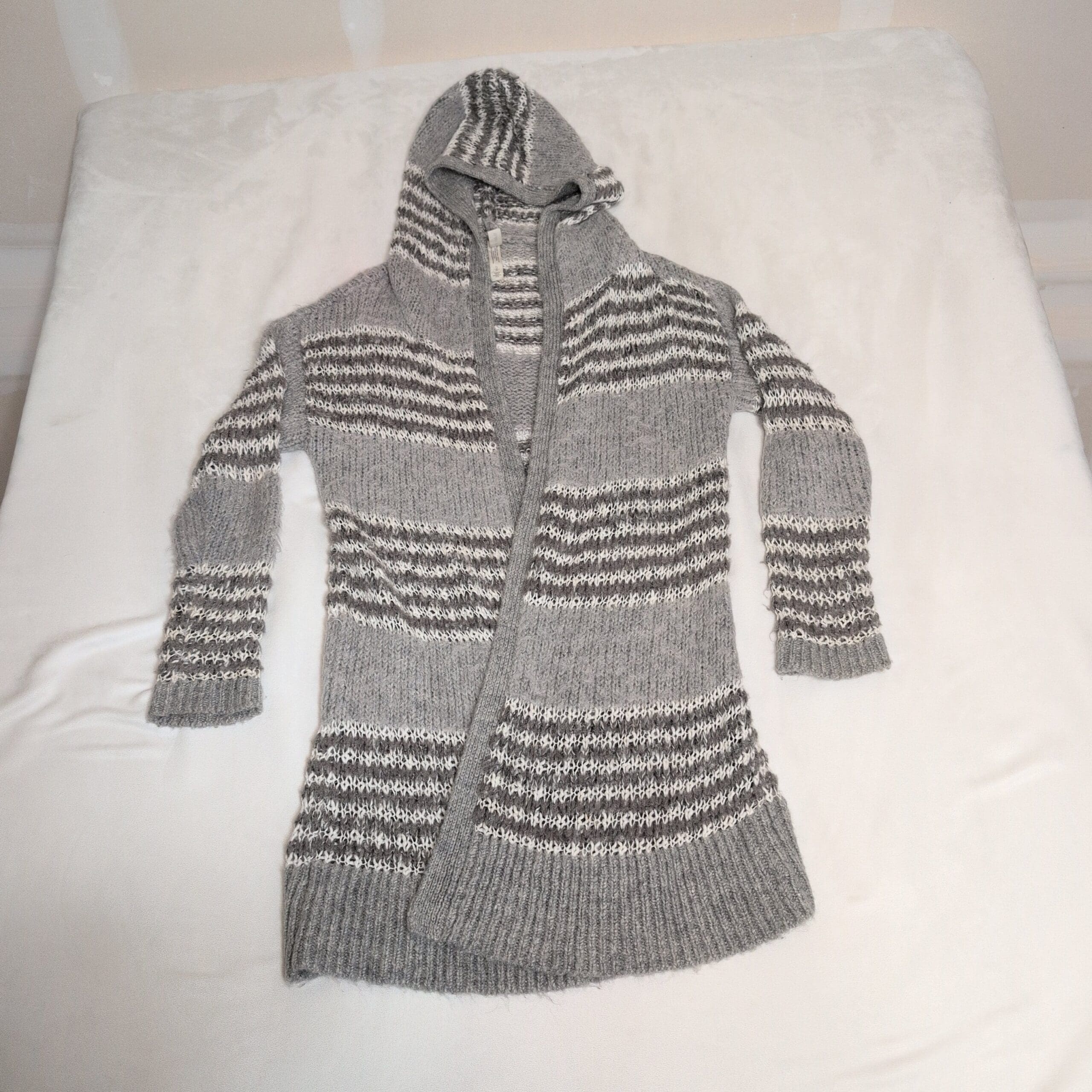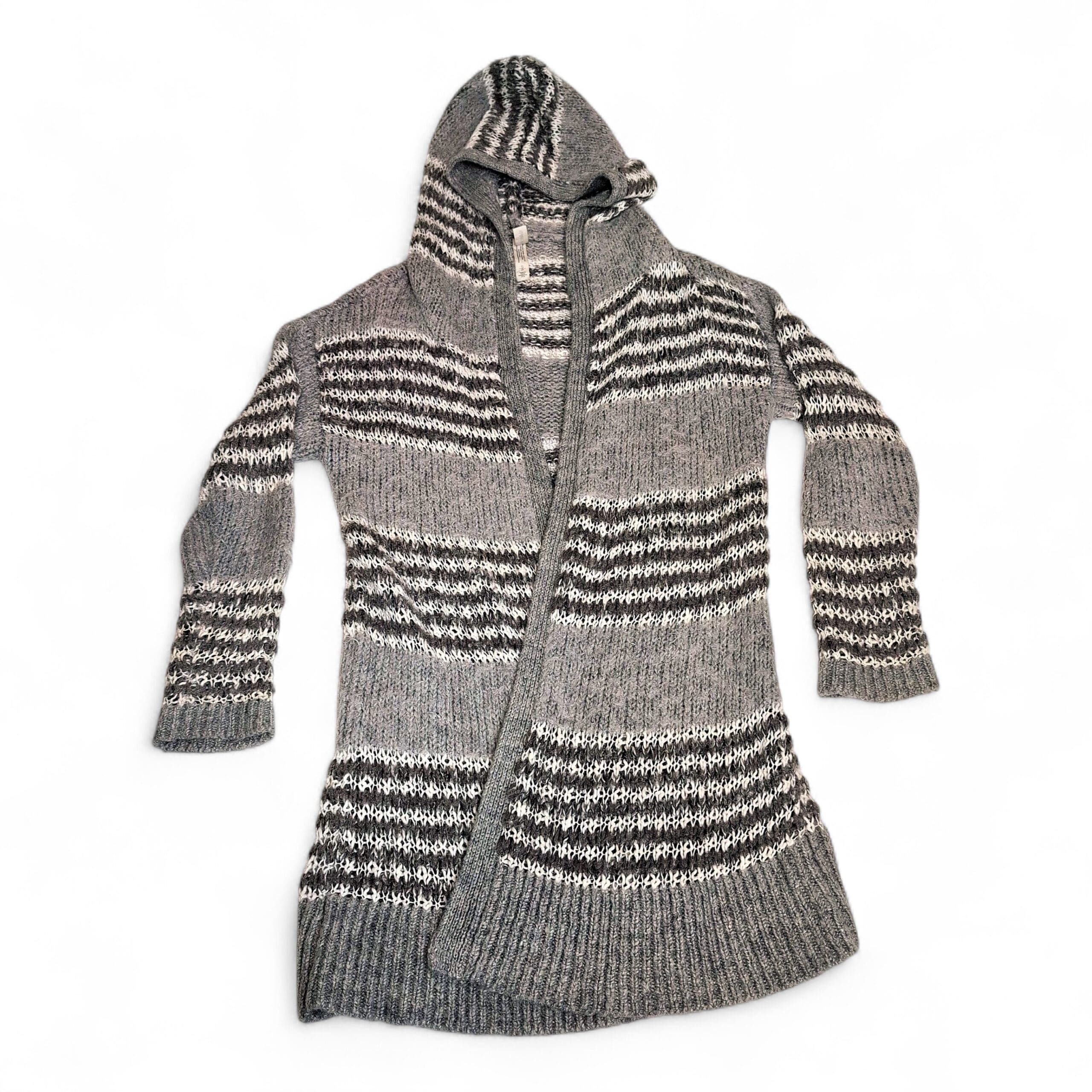 Soft gray knit Bethany Mota hooded open-front cardigan in women’s size S. Longline silhouette with alternating light and dark gray stripe detailing, ribbed cuffs and hem, and a cozy attached hood. Open-front design drapes easily for layering over tees and sweaters. Gently used; free of major rips, tears, stains, or flaws. Typical wear may be present.