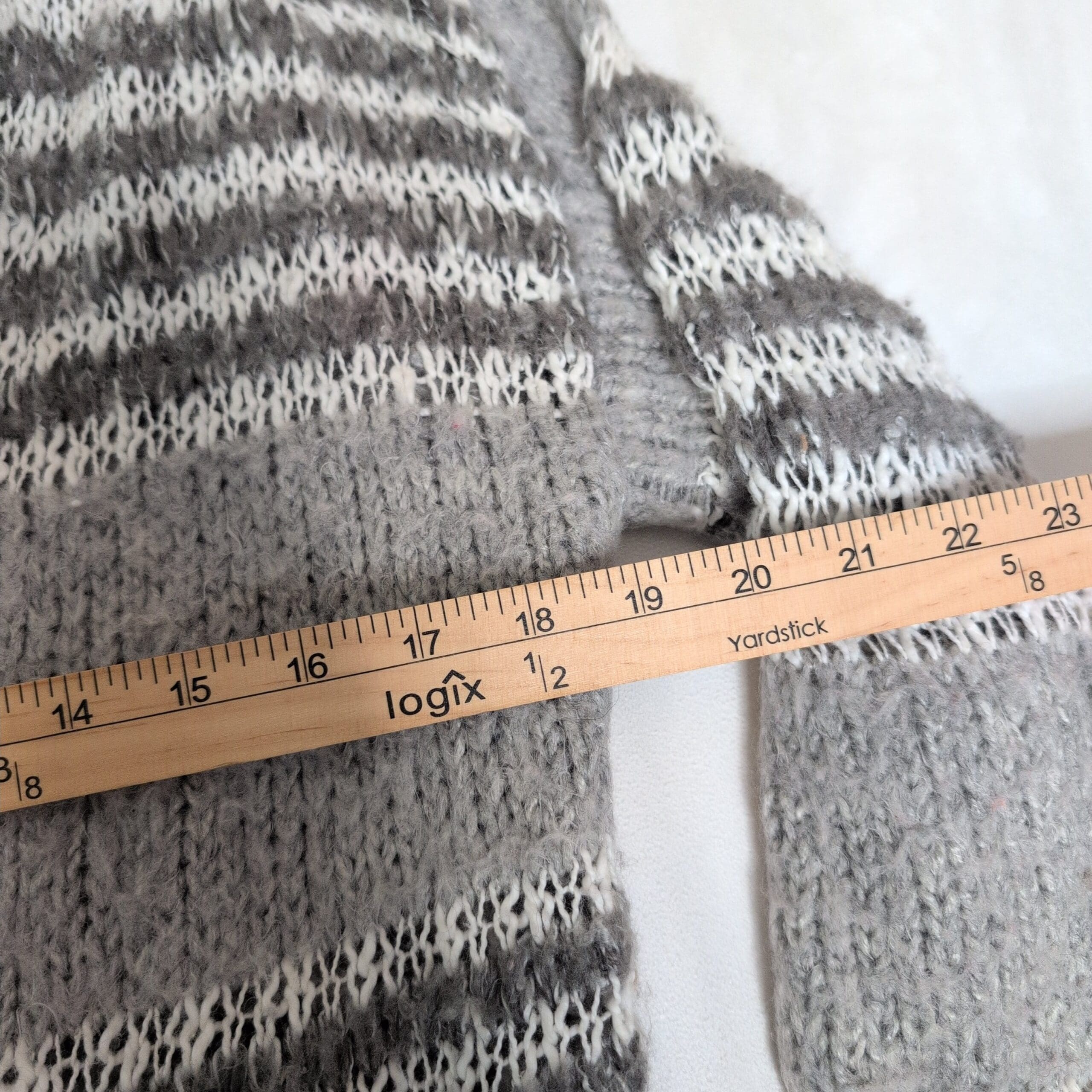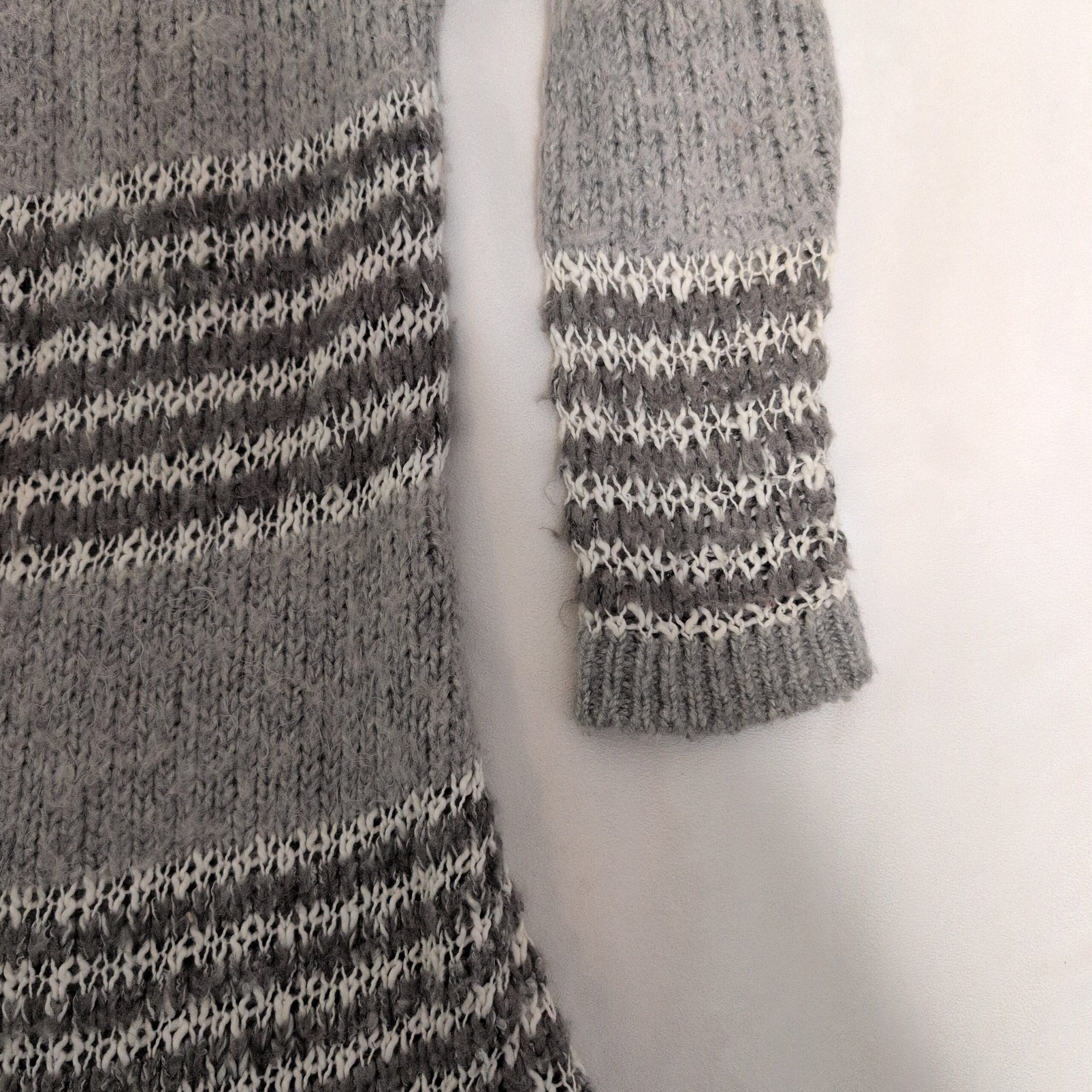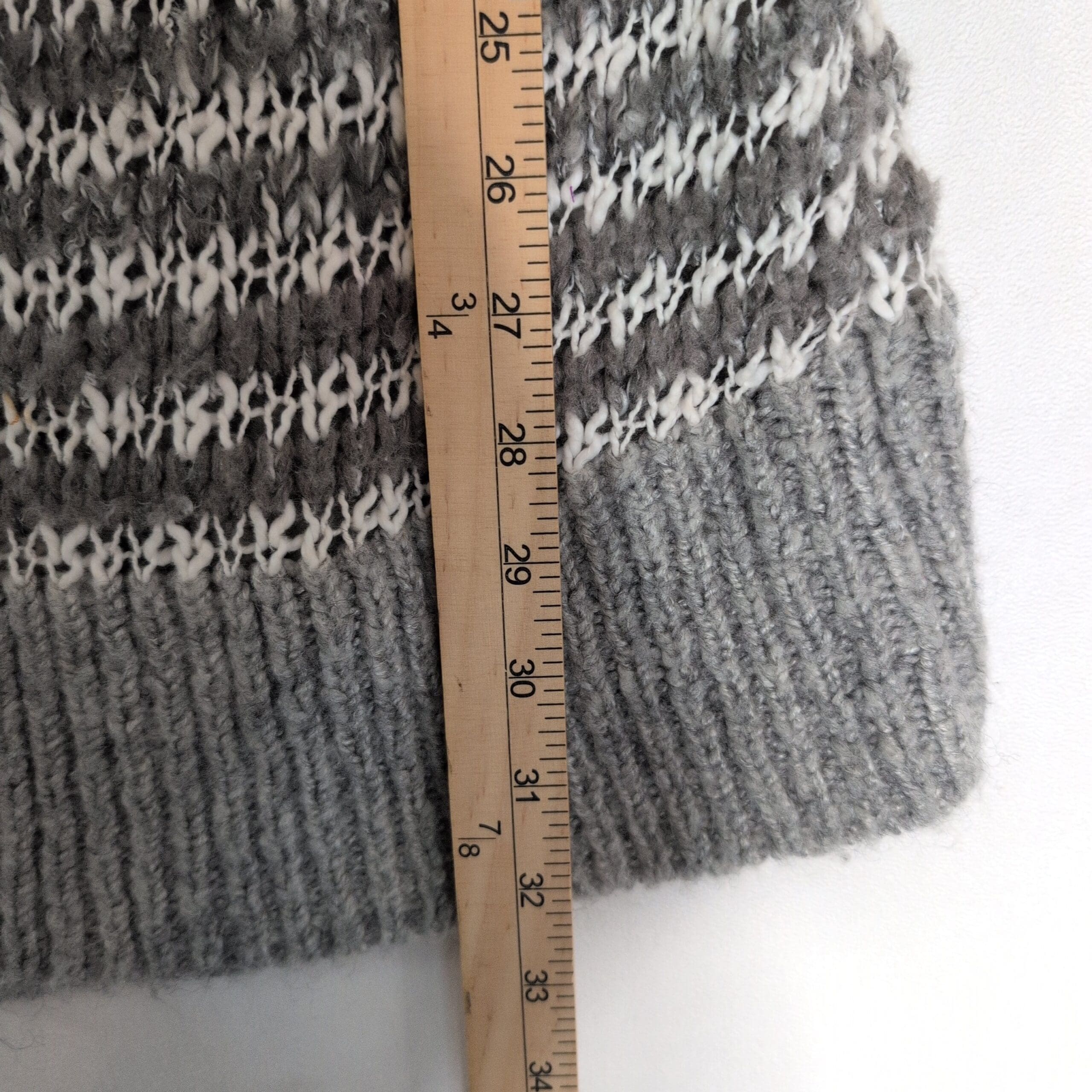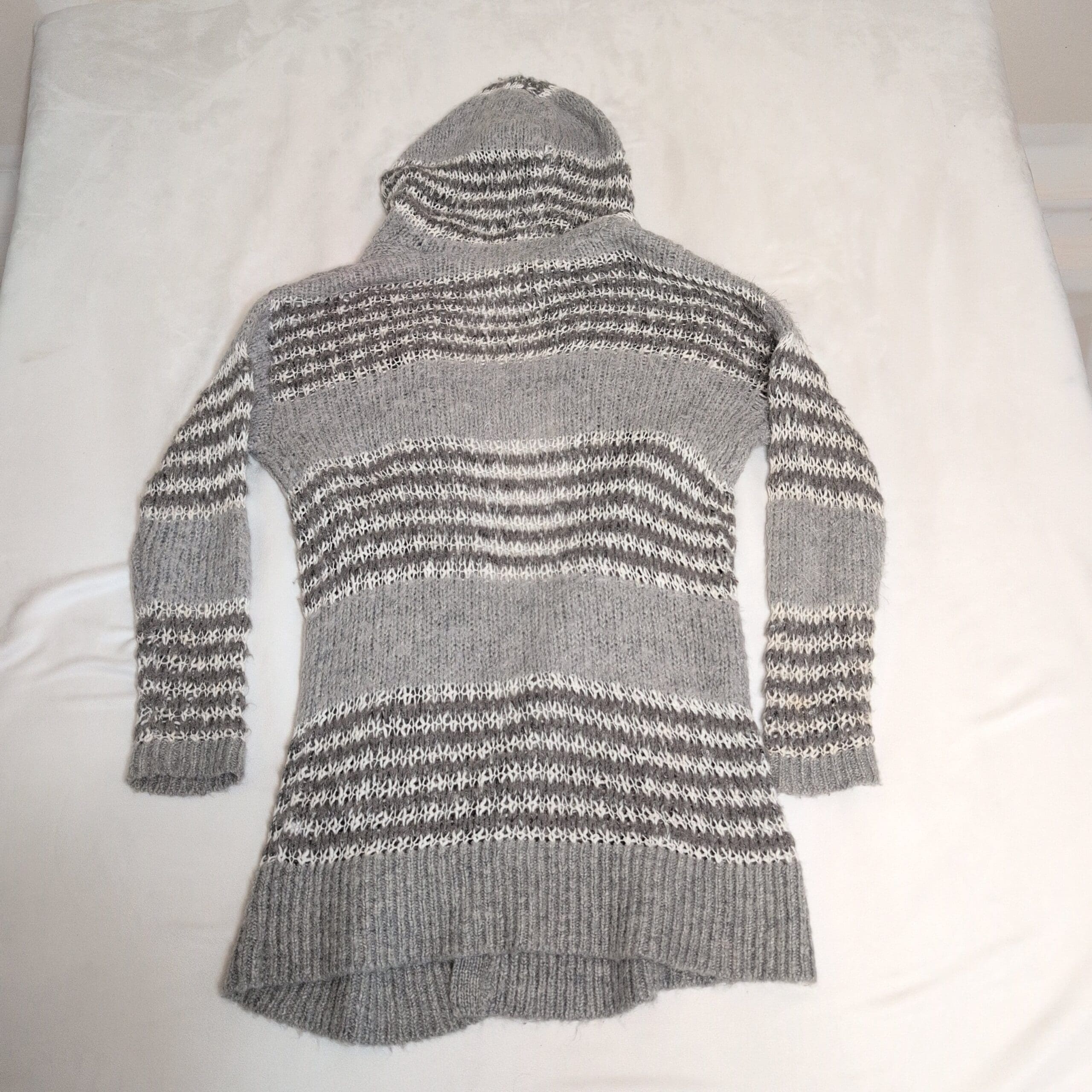 Soft gray knit Bethany Mota hooded open-front cardigan in women’s size S. Longline silhouette with alternating light and dark gray stripe detailing, ribbed cuffs and hem, and a cozy attached hood. Open-front design drapes easily for layering over tees and sweaters. Gently used; free of major rips, tears, stains, or flaws. Typical wear may be present.