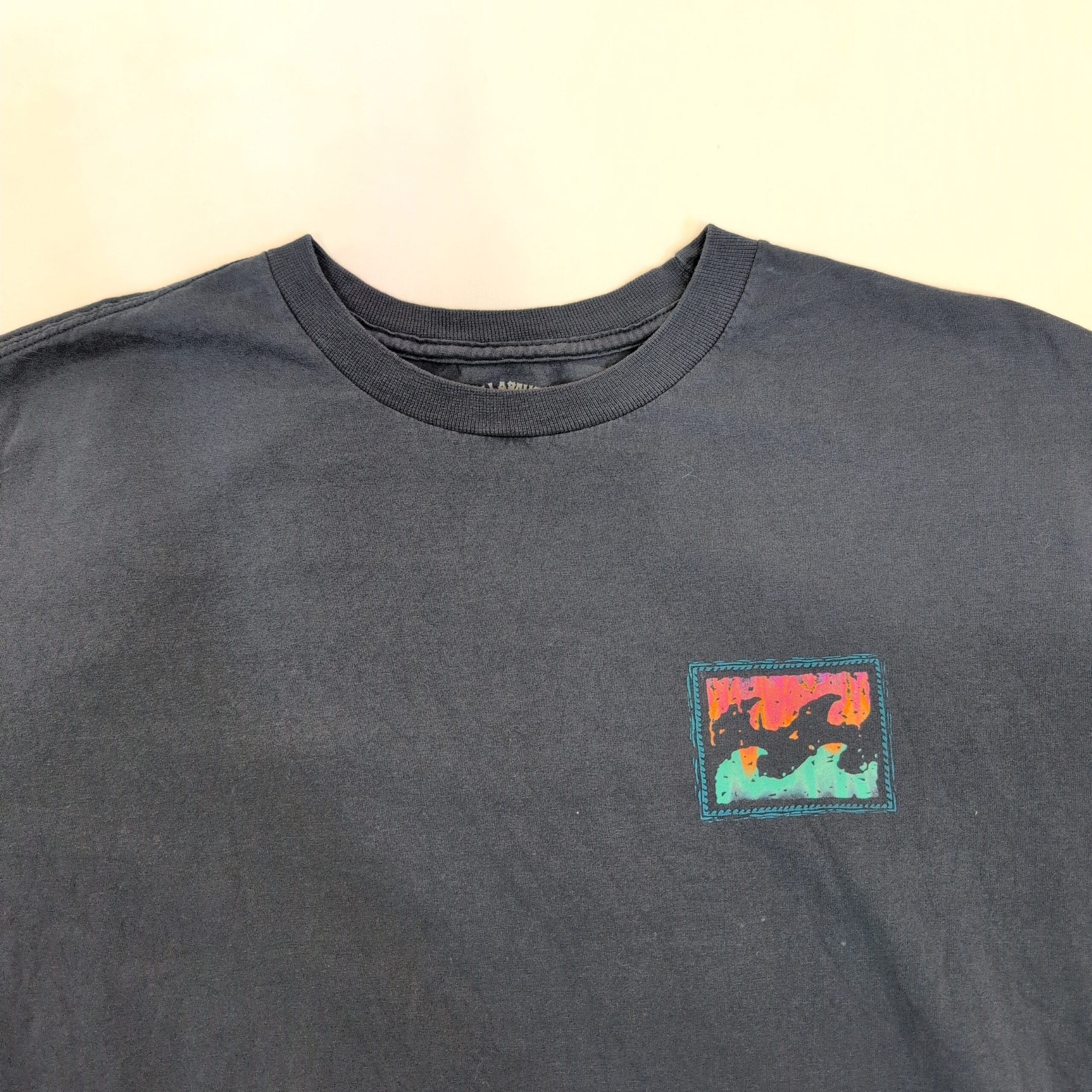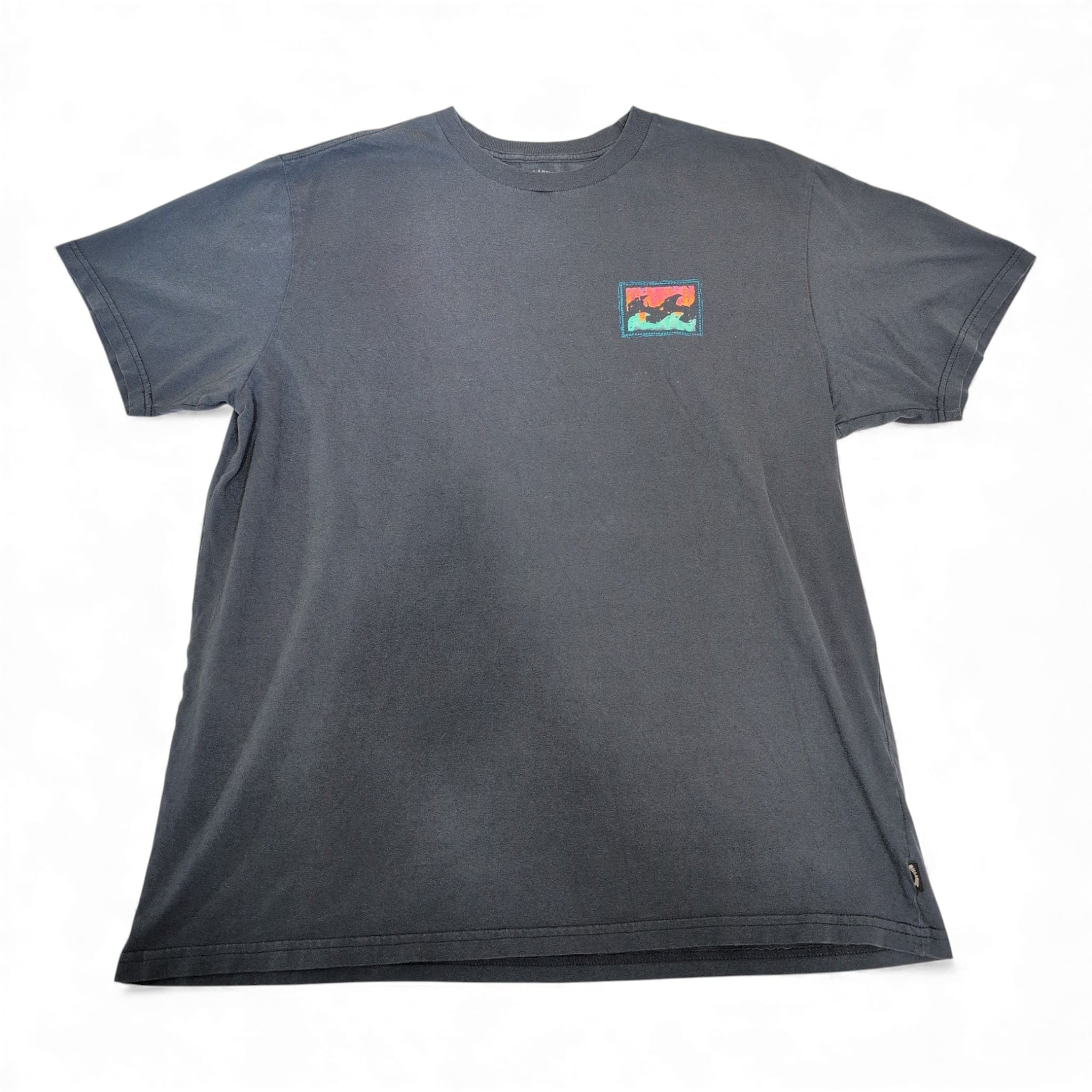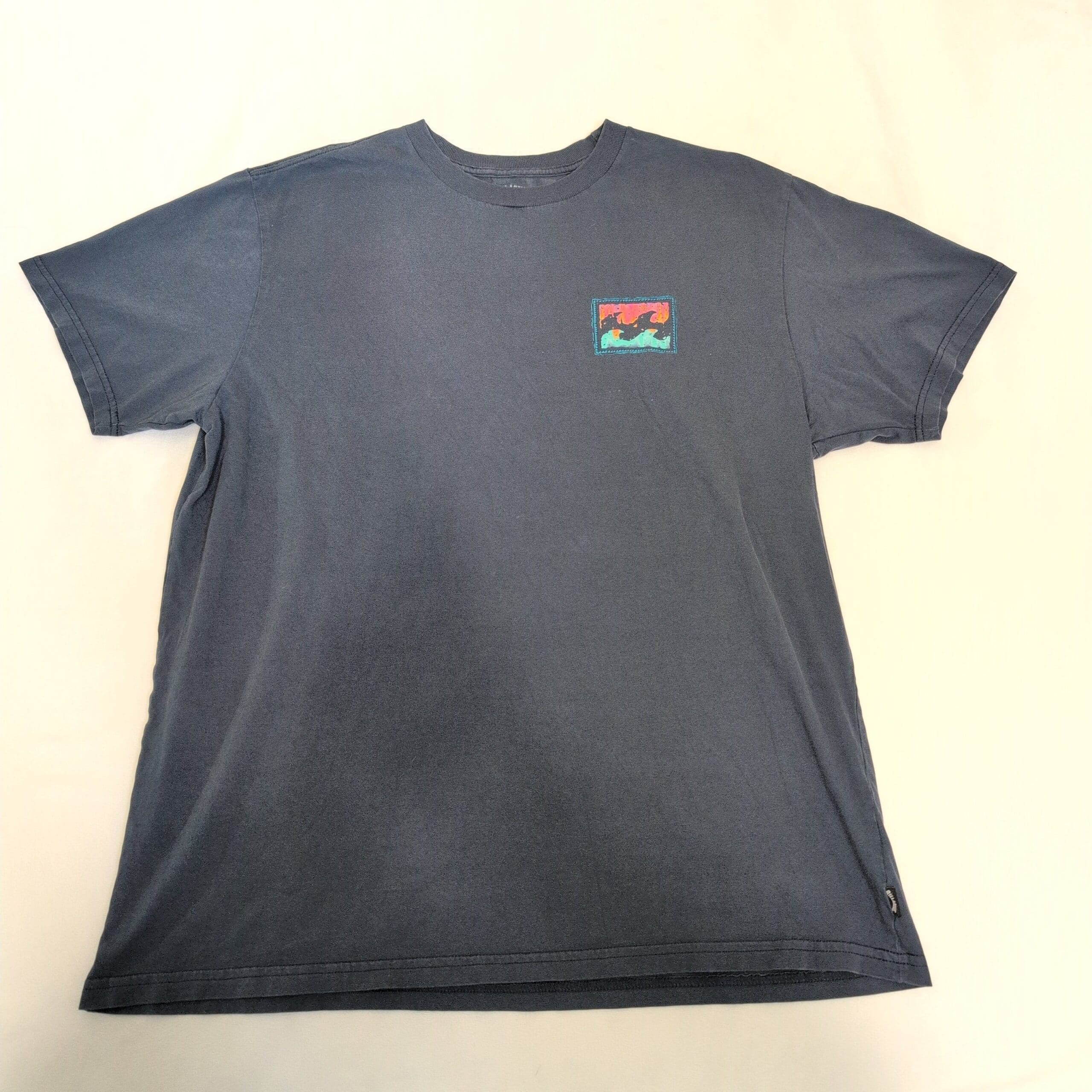 Billabong men’s short sleeve tee in blue, size XL. Classic crew neckline with a small multicolor rectangular logo patch on the left chest and a woven brand tab at the side hem. Pre-owned — good condition with light, even fading from wear; no visible stains, holes, or major flaws. Relaxed casual fit perfect for everyday wear or layering.